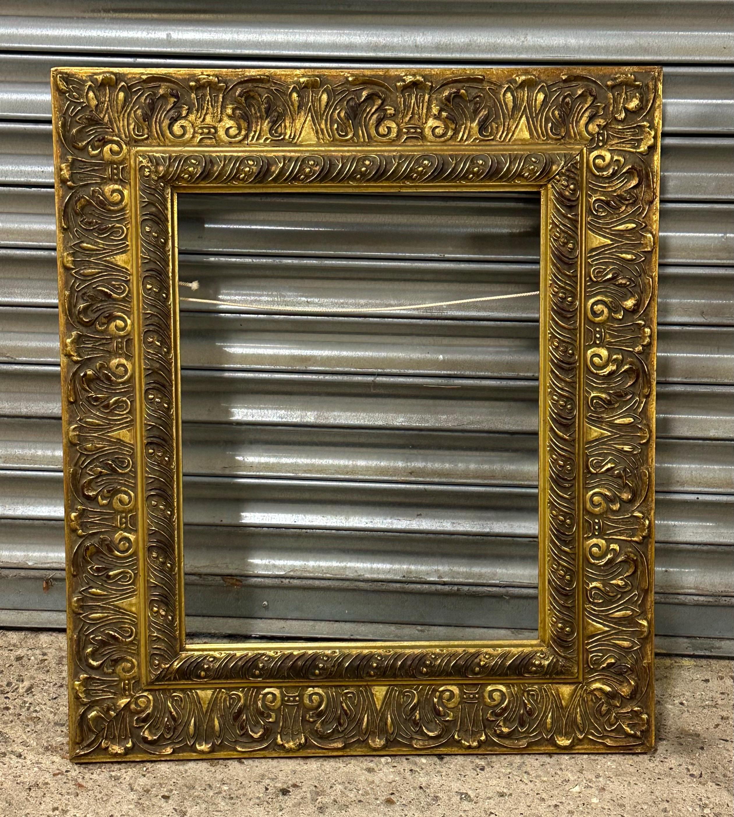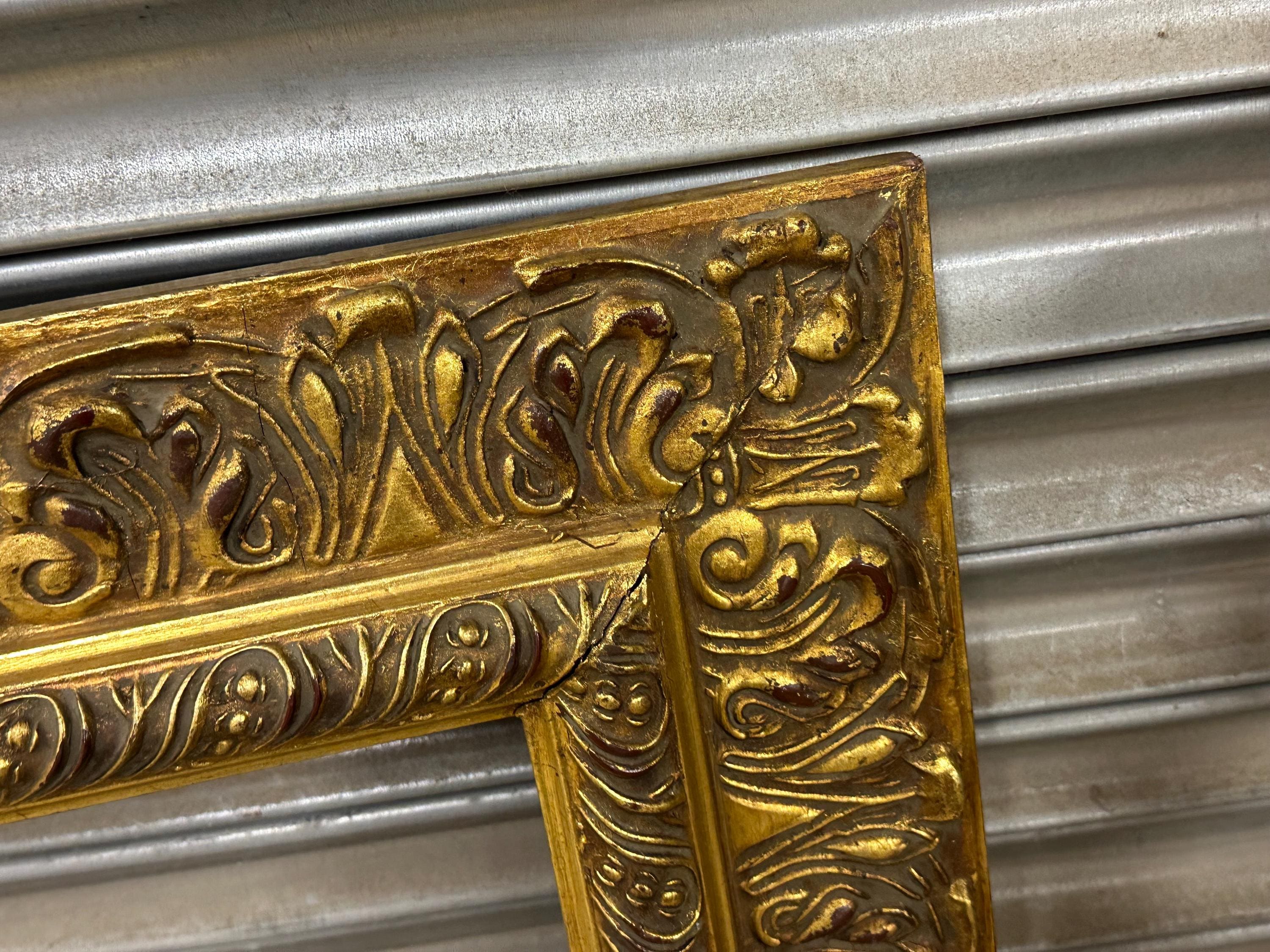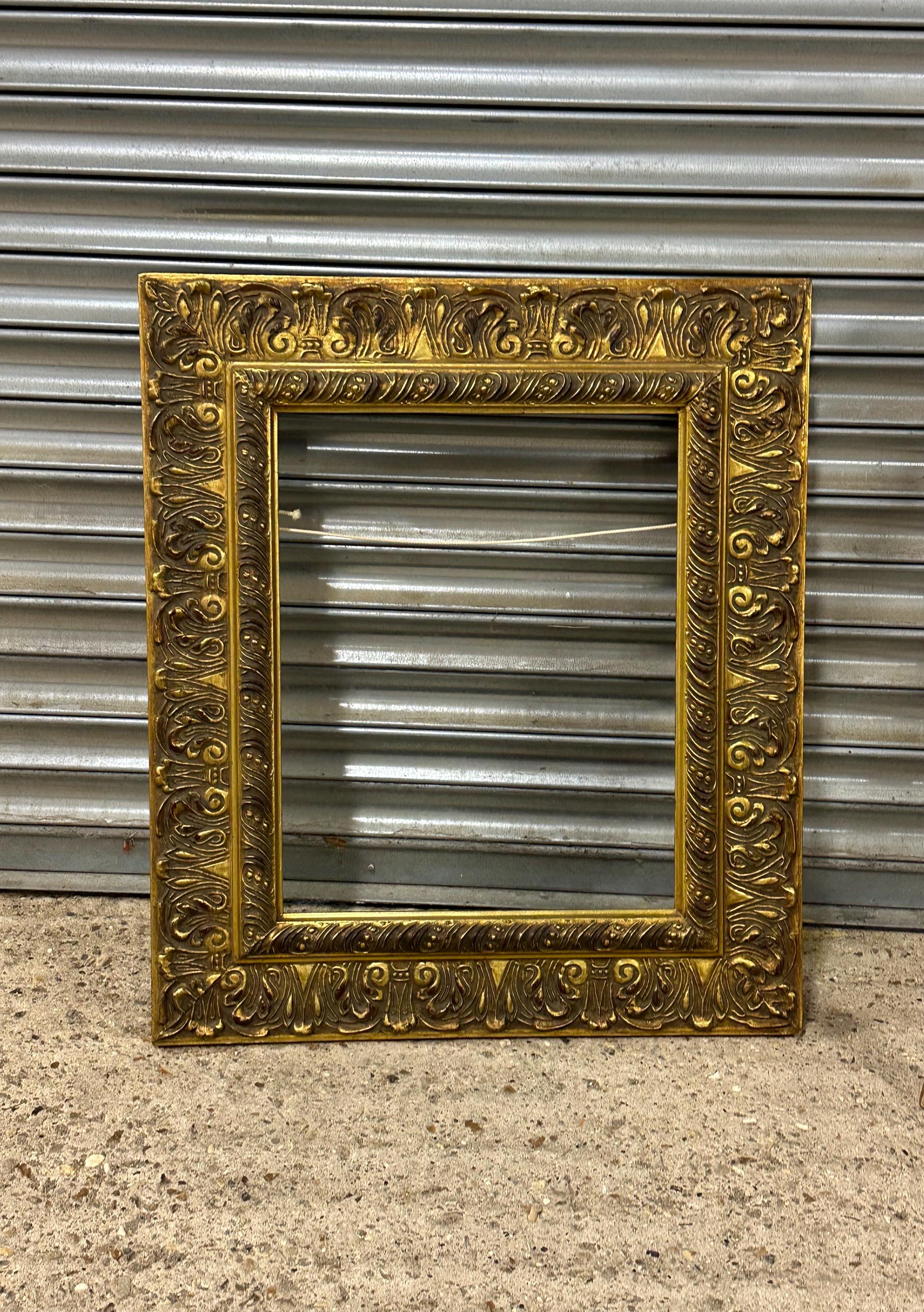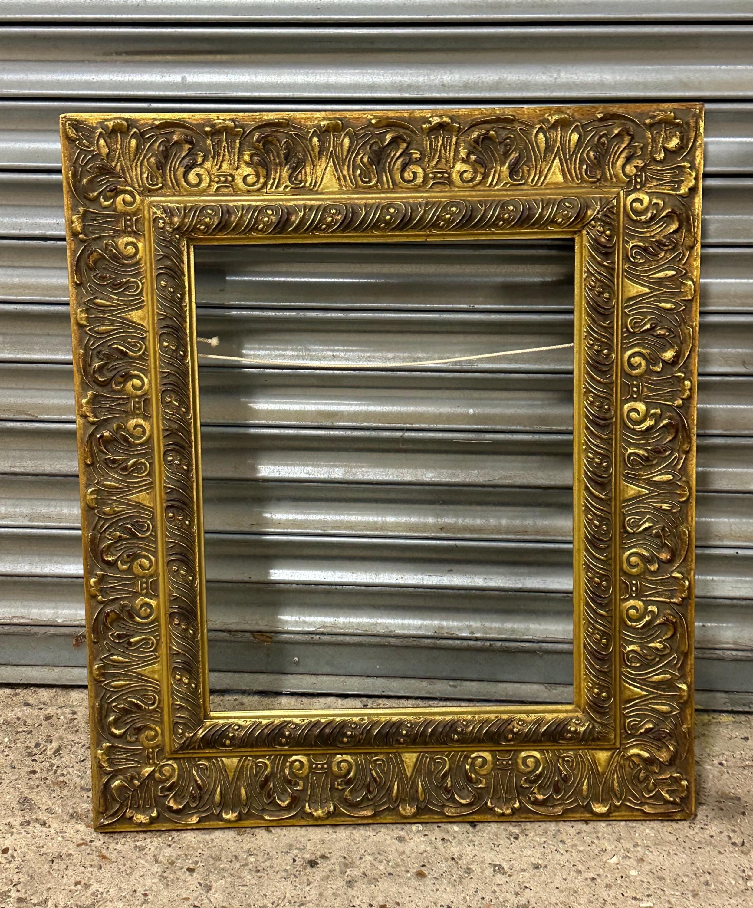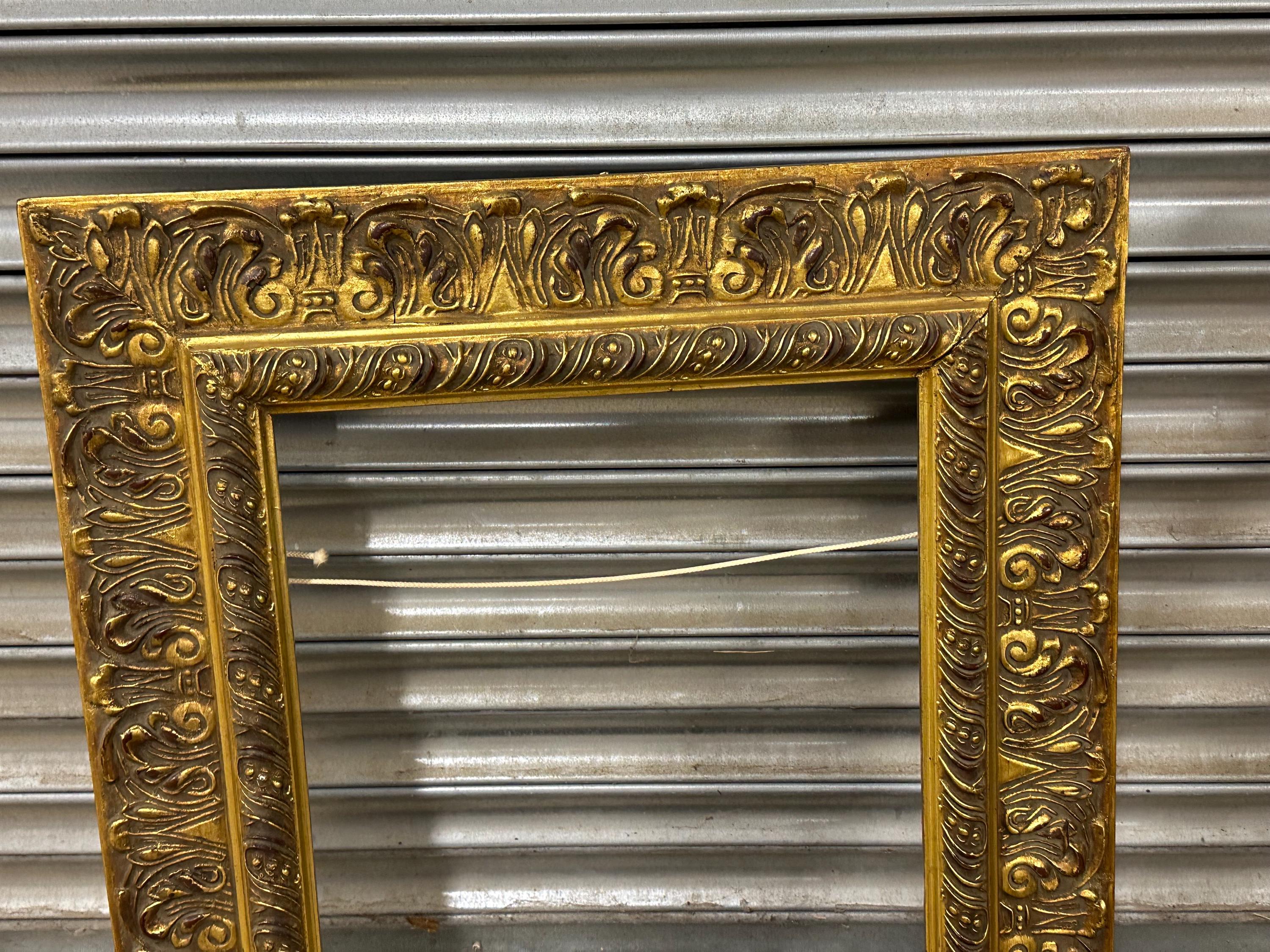 A beautiful and richly detailed gilt frame featuring ornate scrolling and acanthus leaf decoration throughout. The frame has a classic antique look with an aged patina that adds warmth and depth to the gold finish. Ideal for displaying oil paintings, prints, or mirrors, or simply as a decorative interior accent.