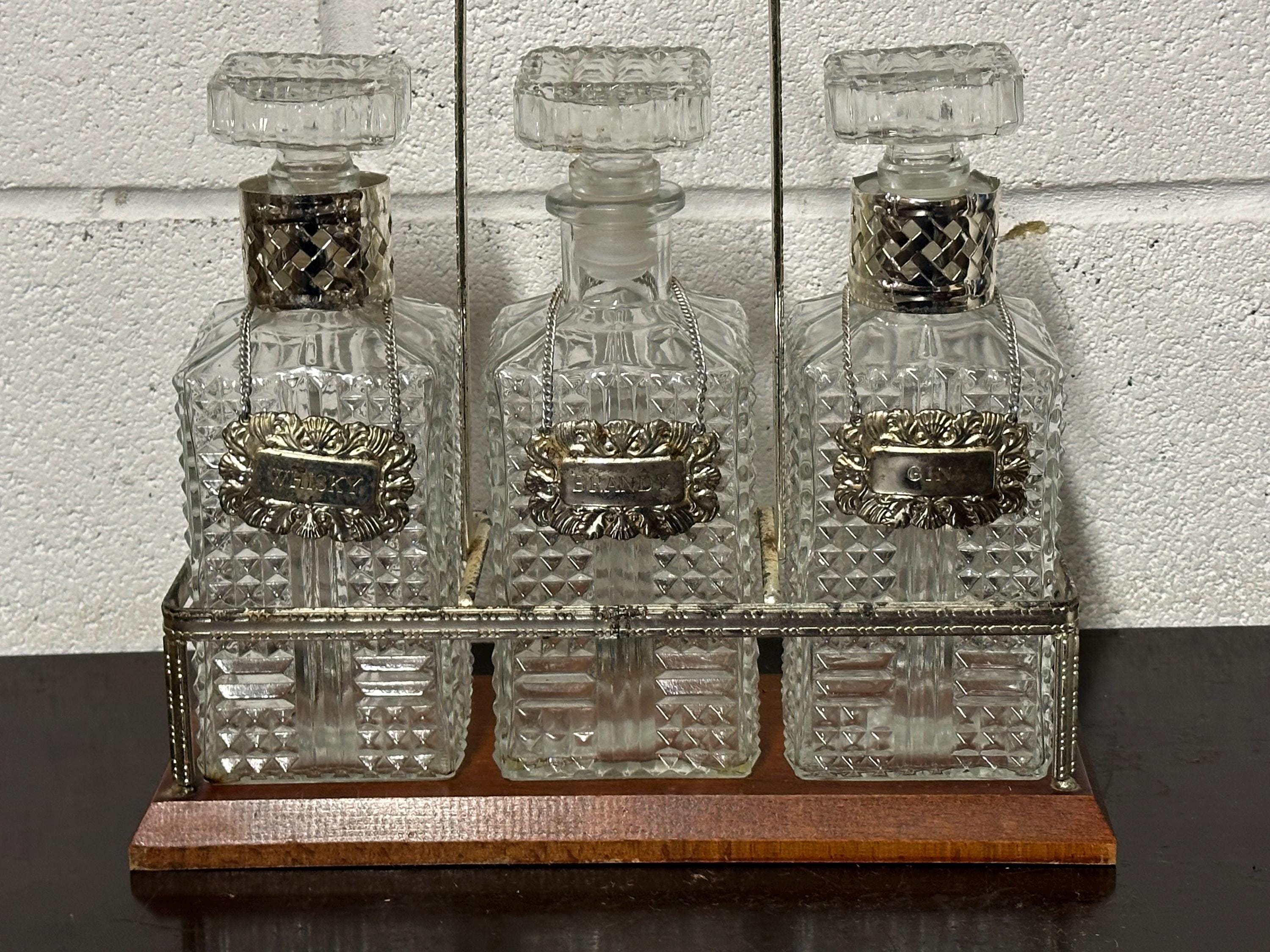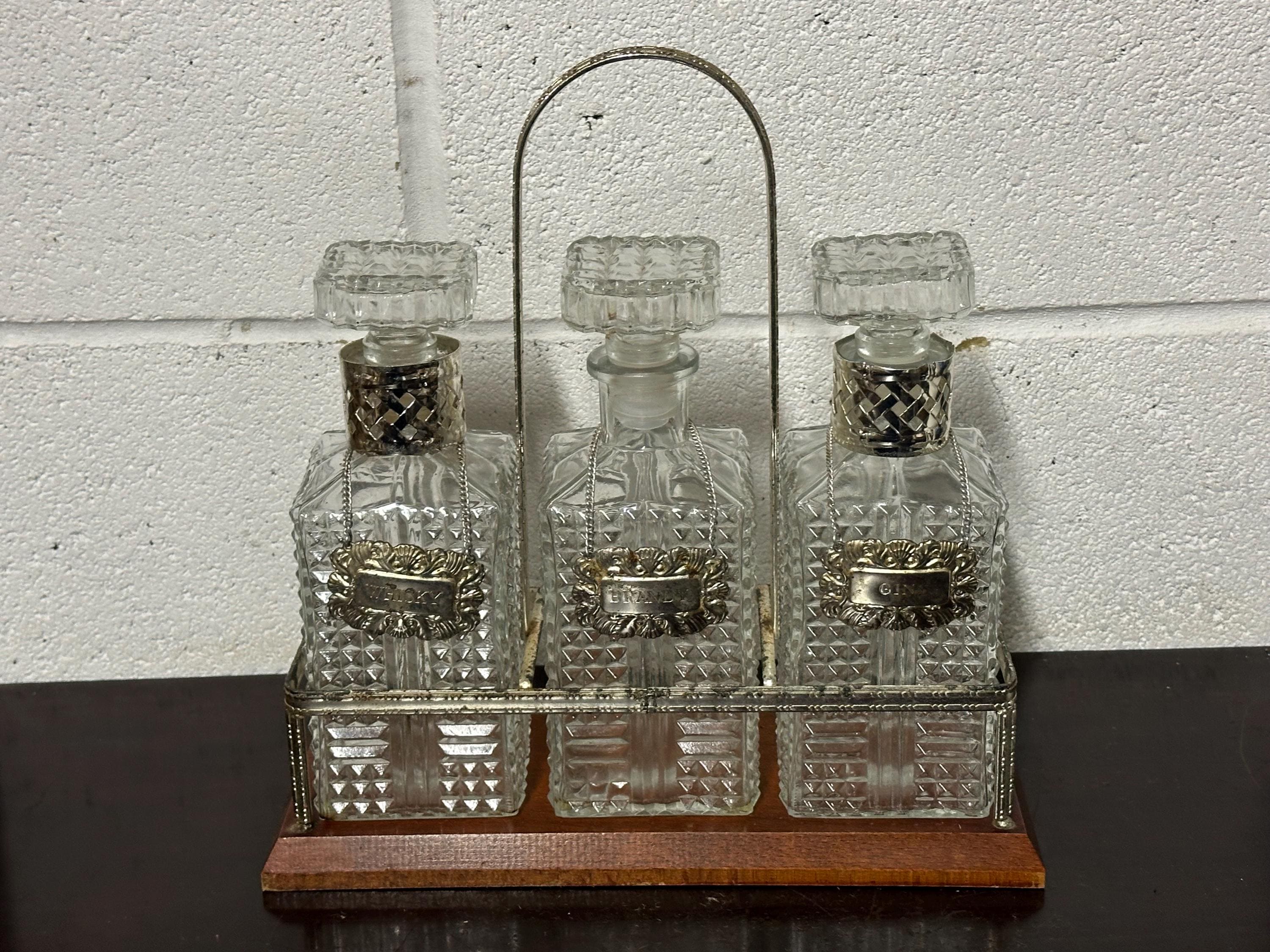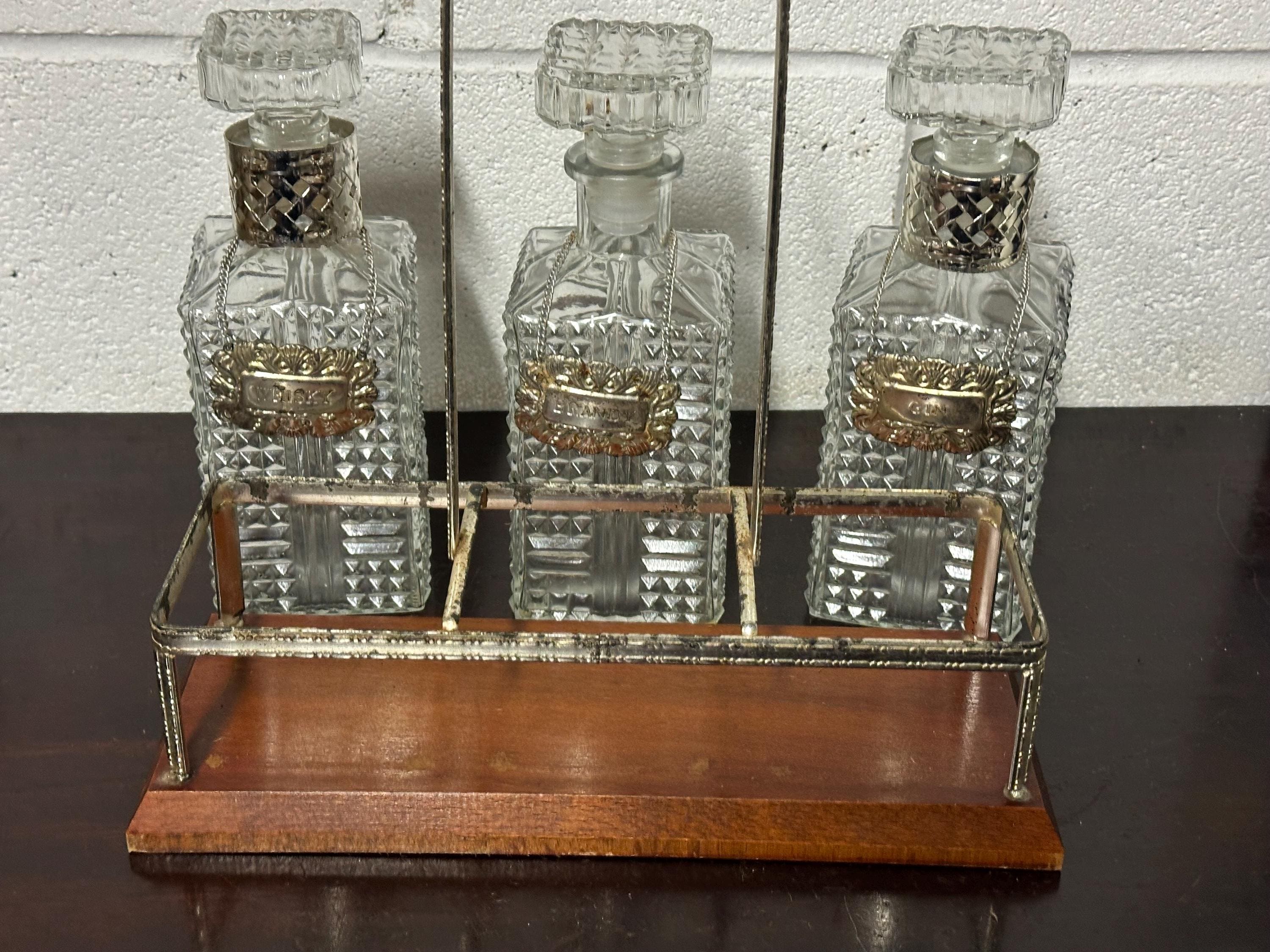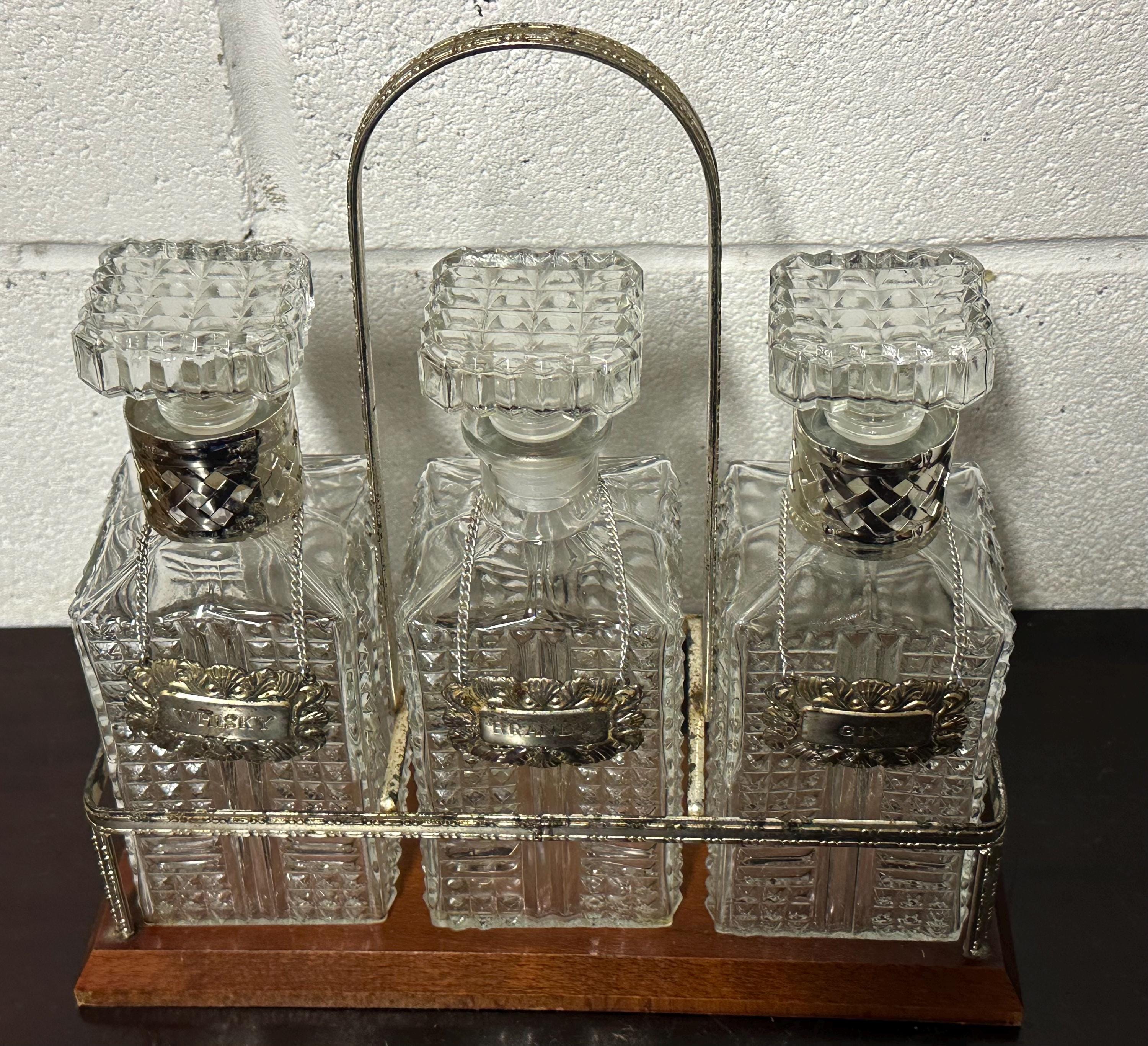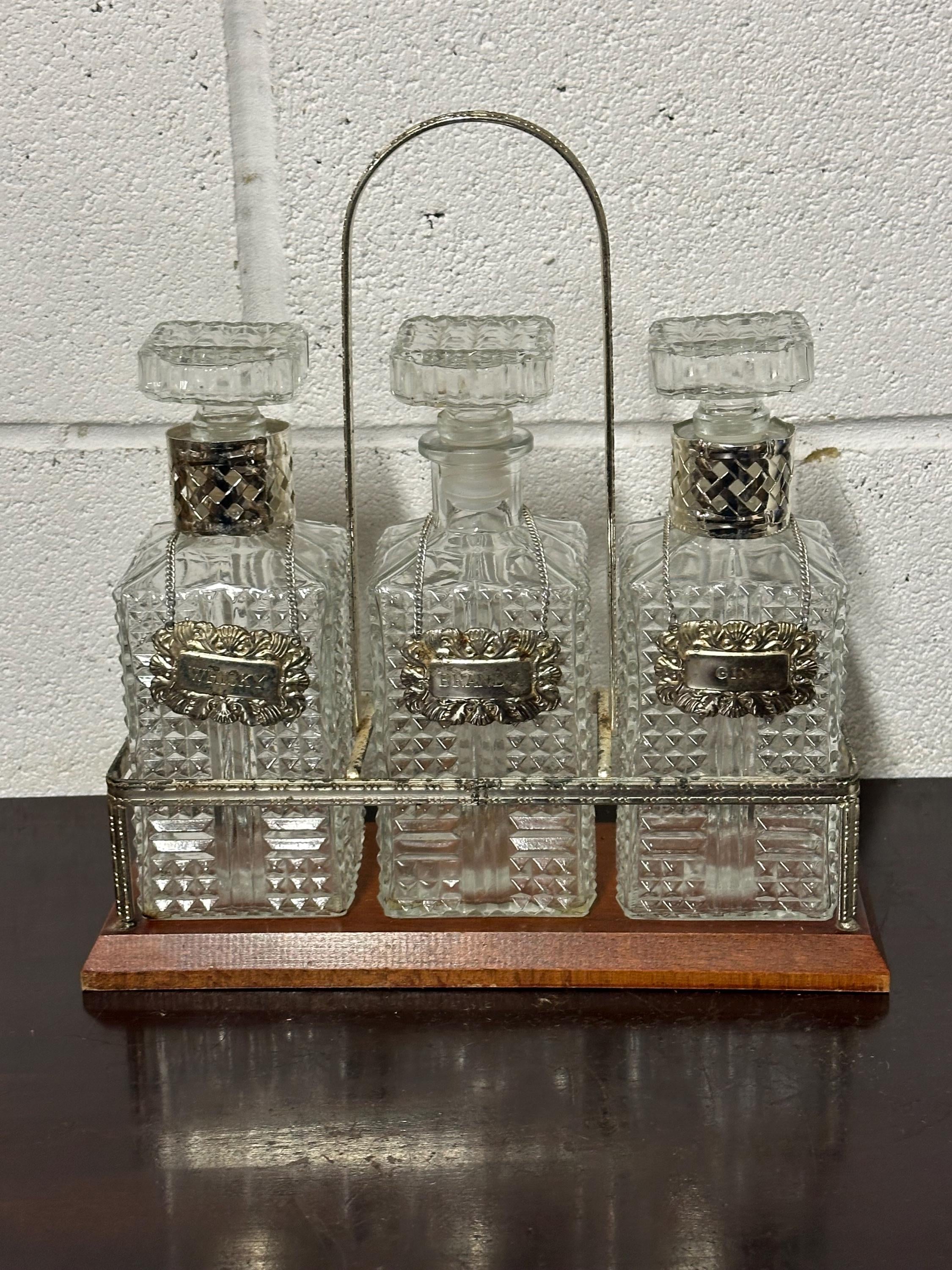 Vintage Cut Glass Tantalus Decanter Set with Silver Plated Carrier