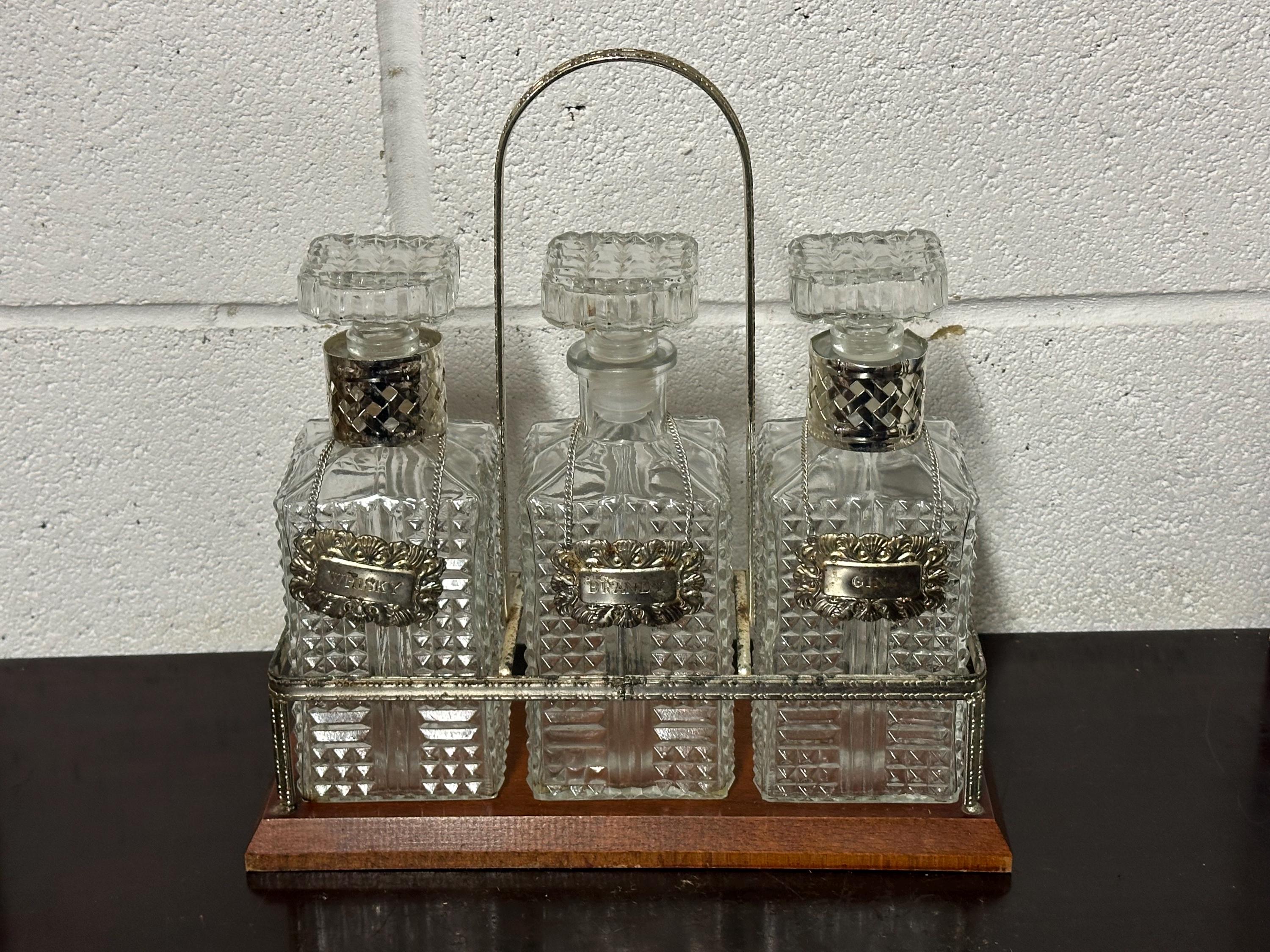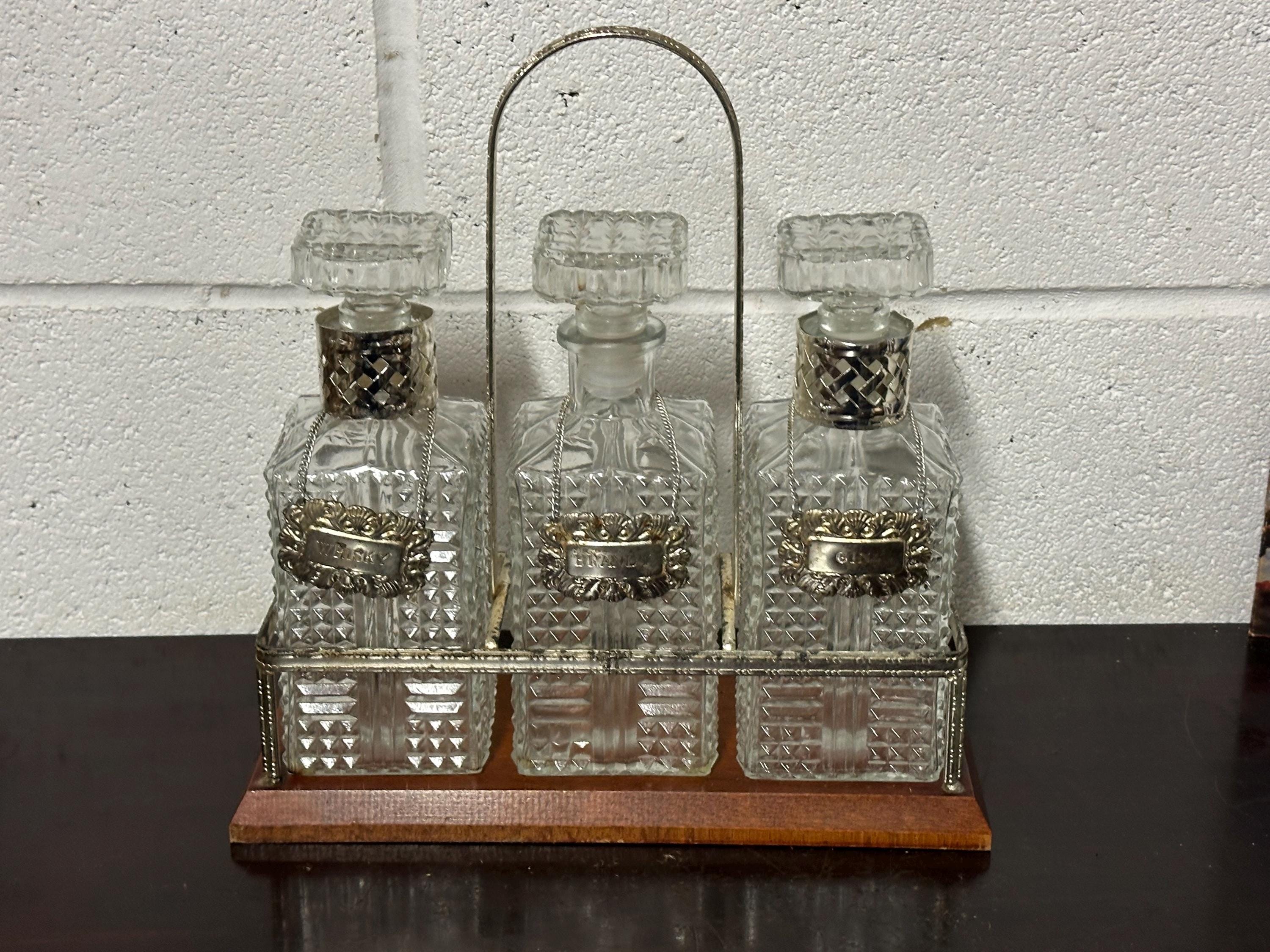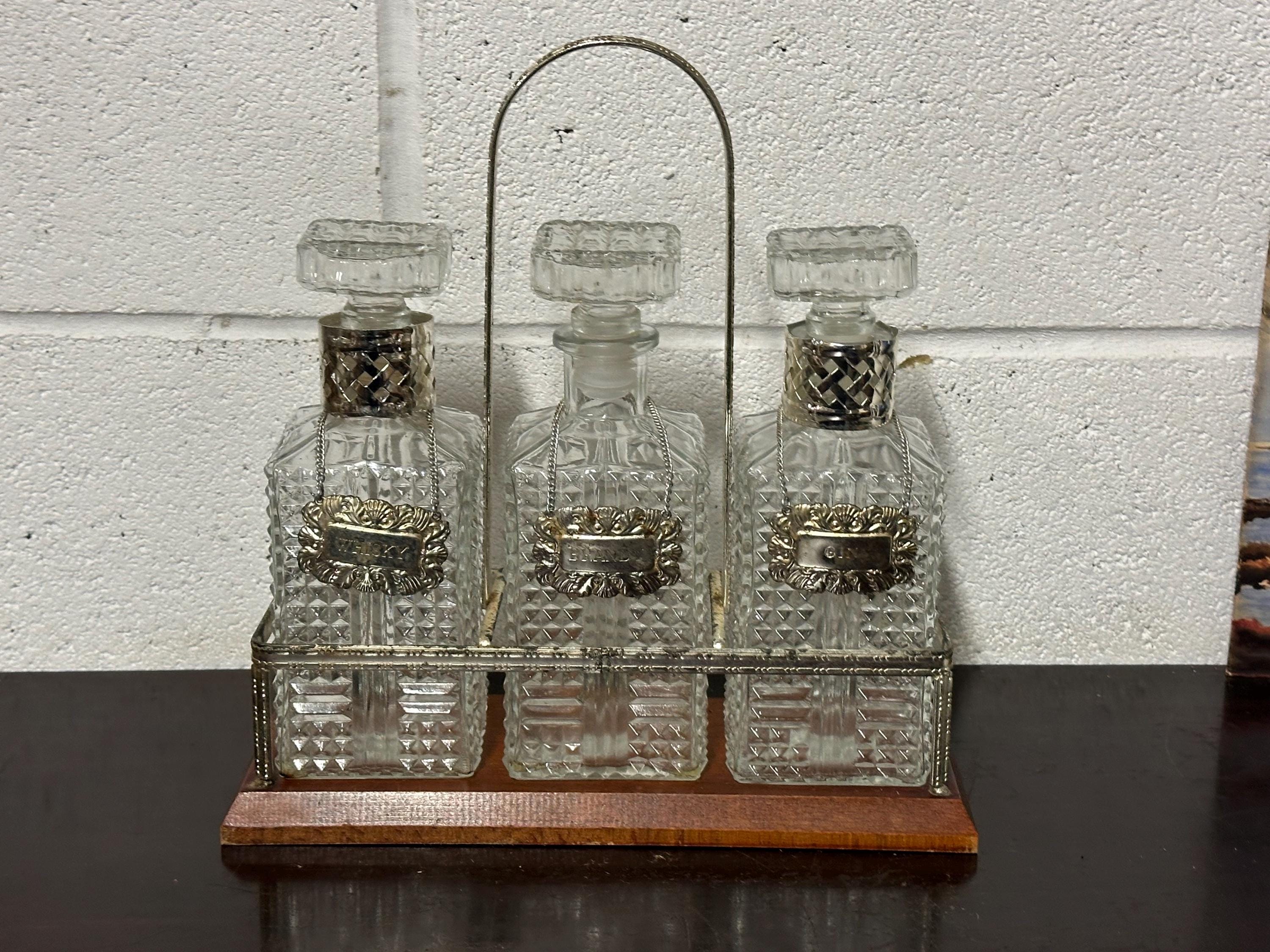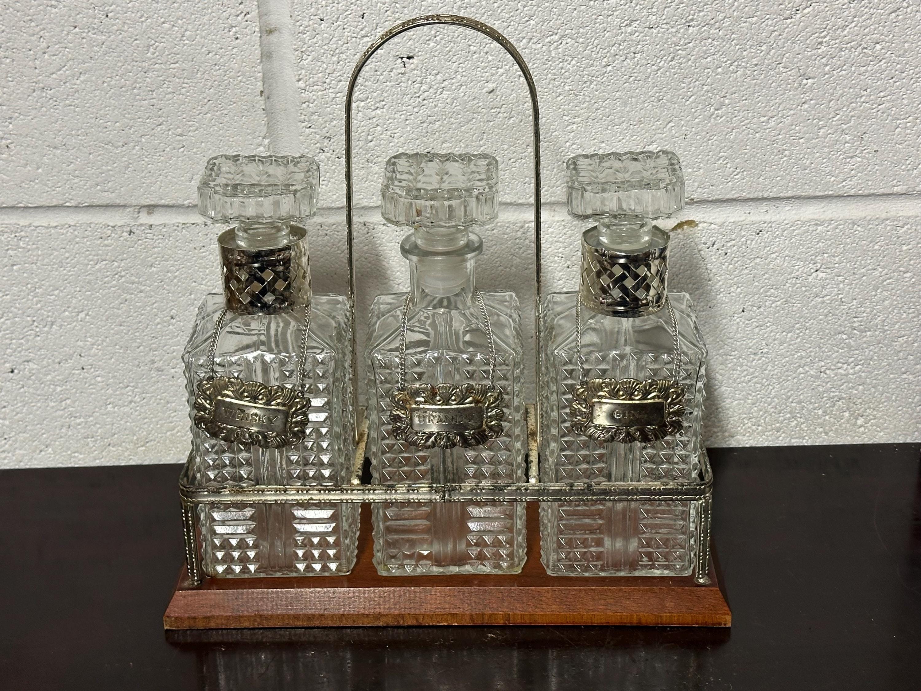 Vintage Cut Glass Tantalus Decanter Set with Silver Plated Carrier