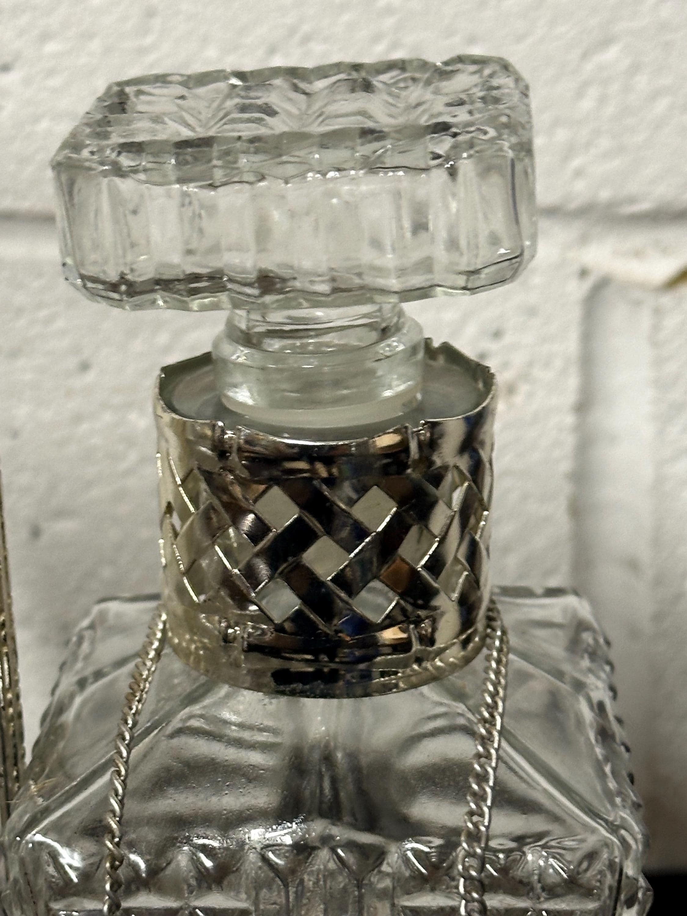 Has stain / marks to silver plate so will need a good clean and one collar missing to central decanter but decanters have never been used so in great condition