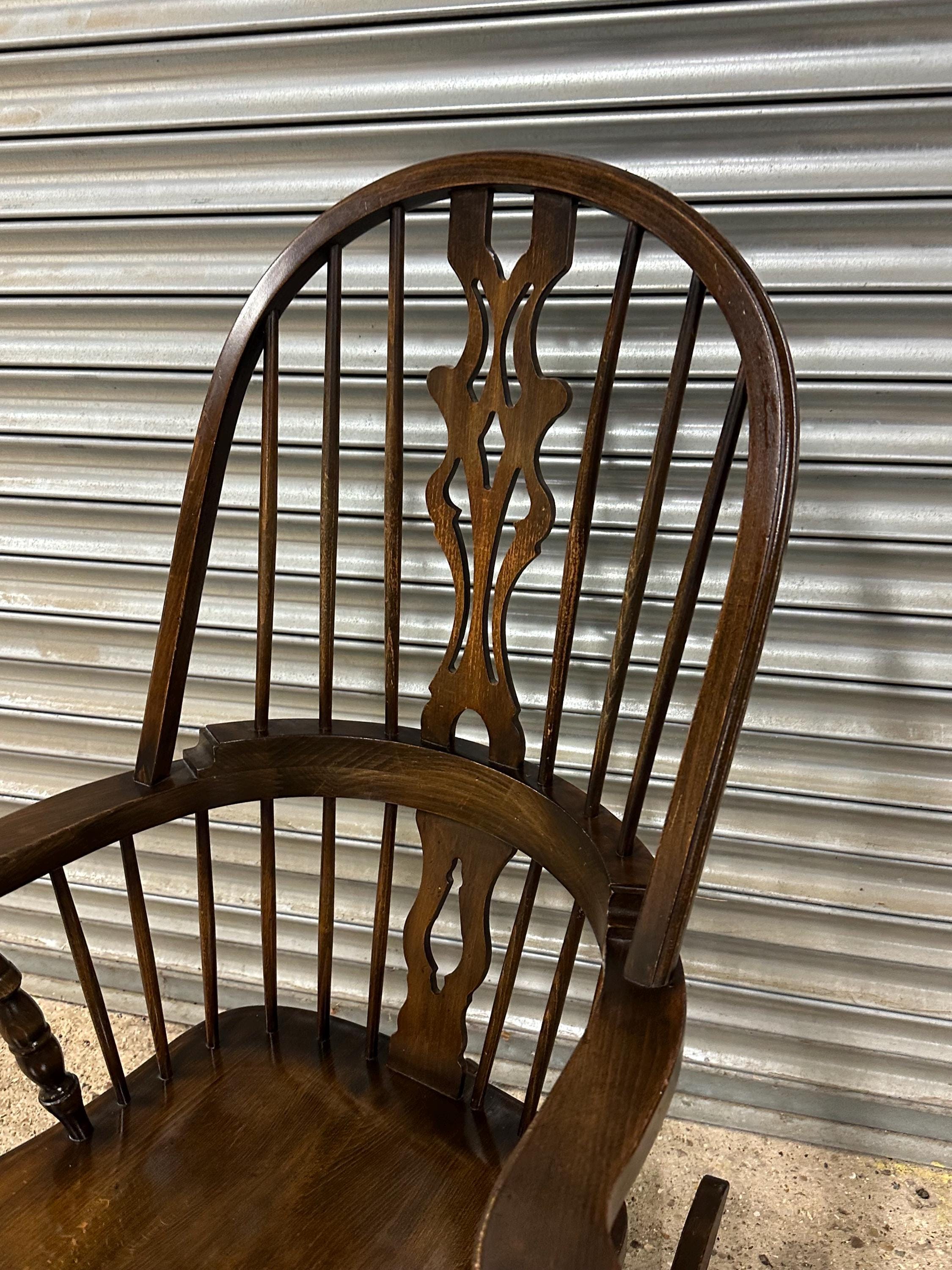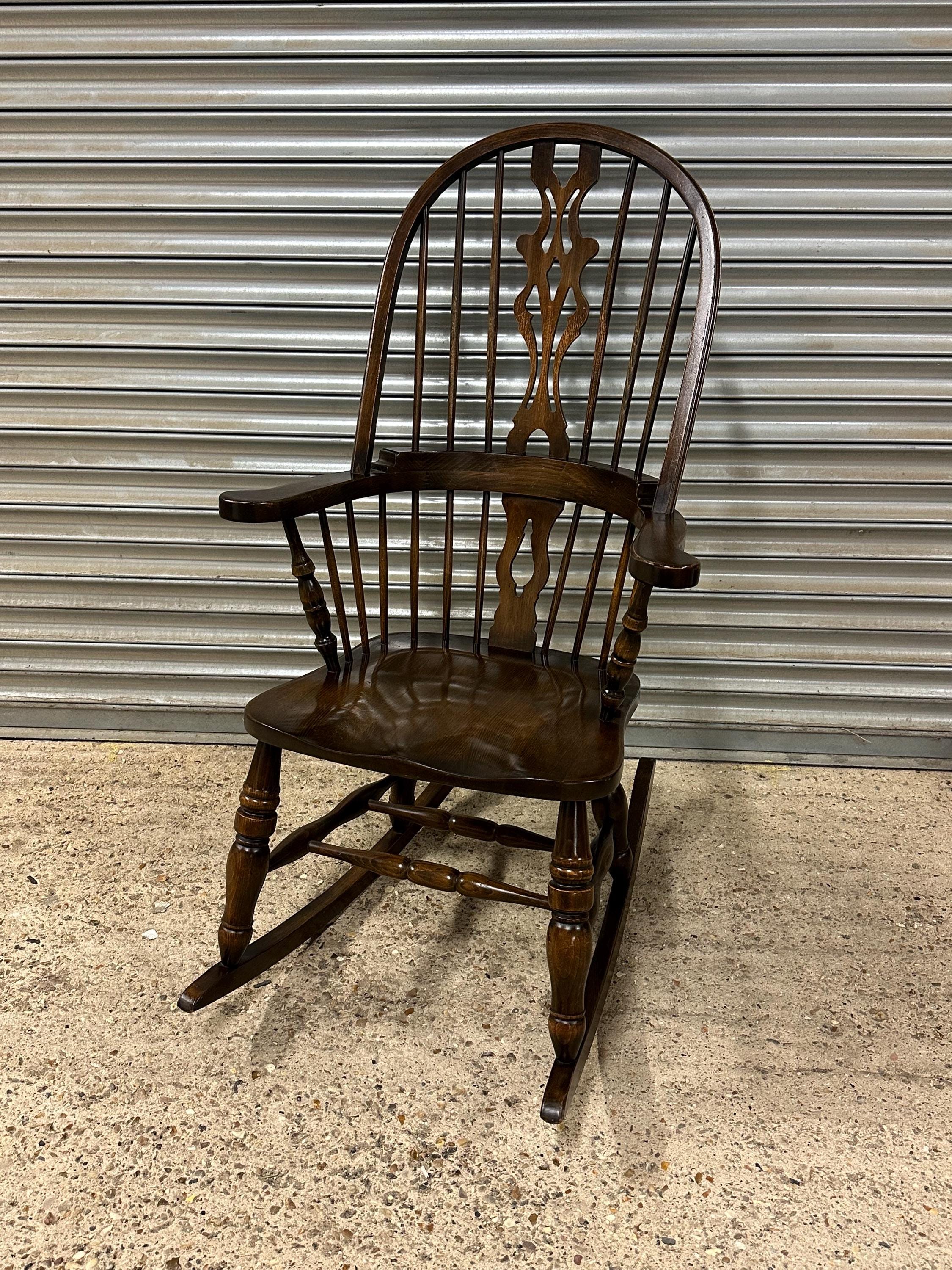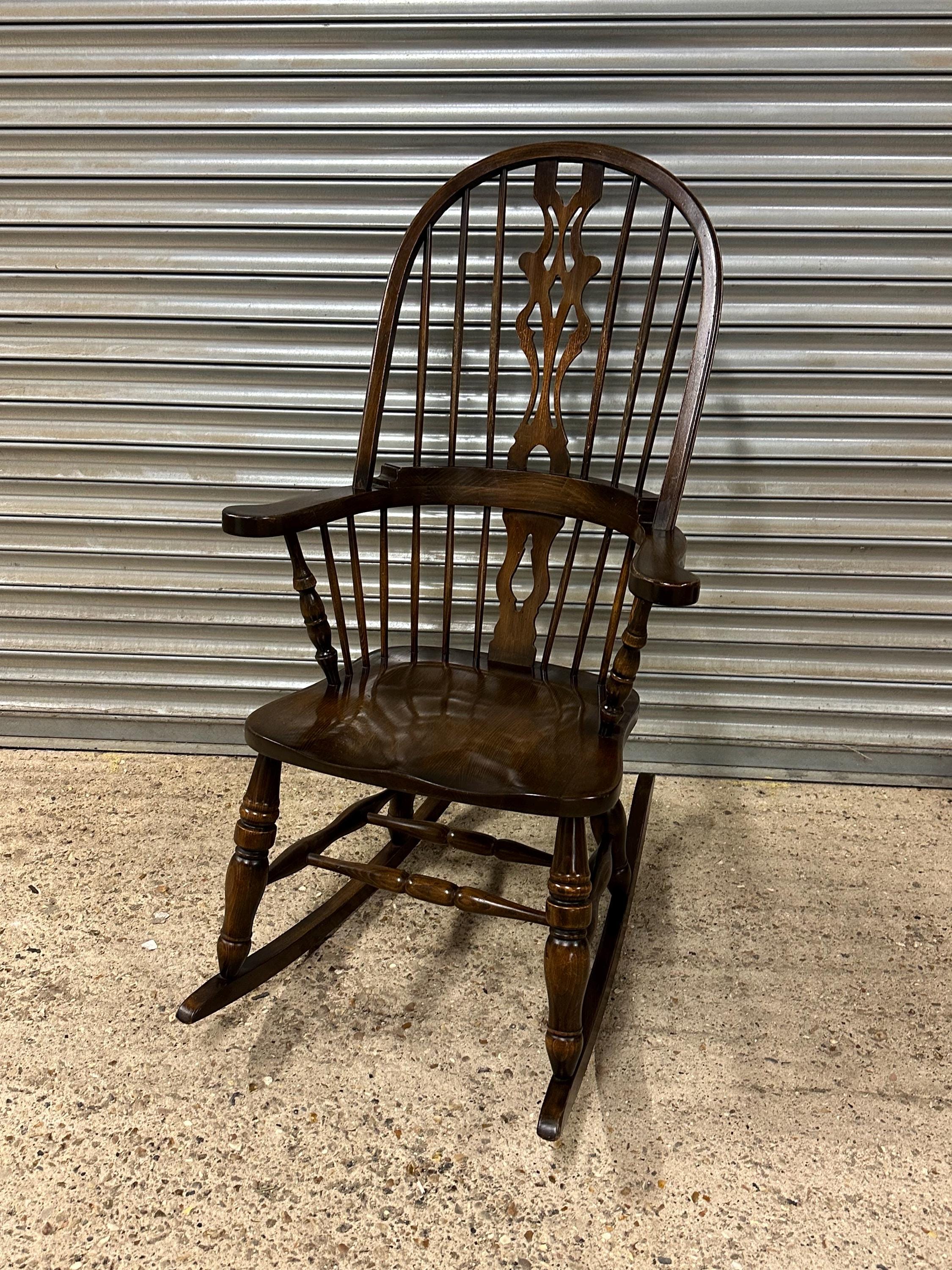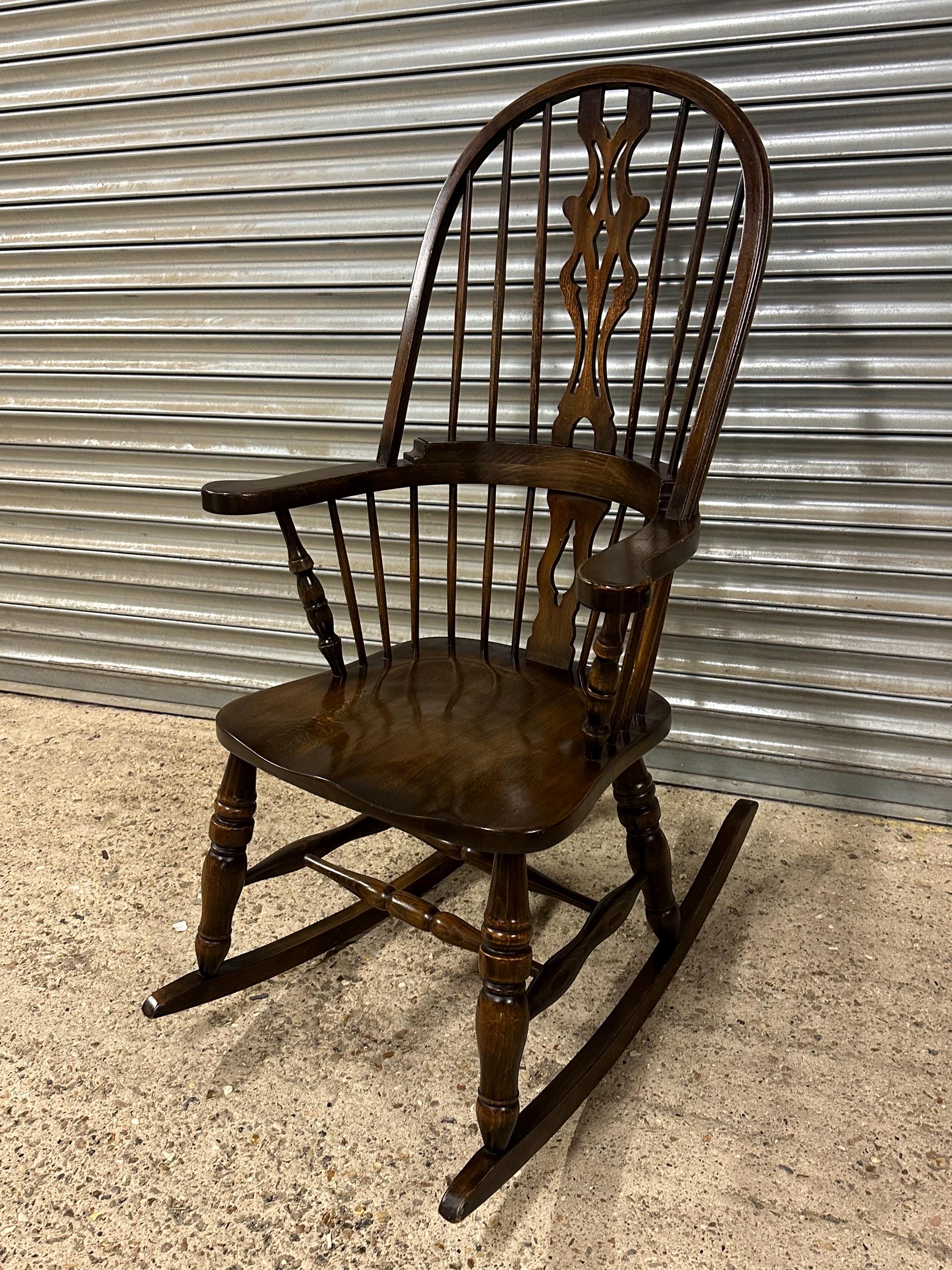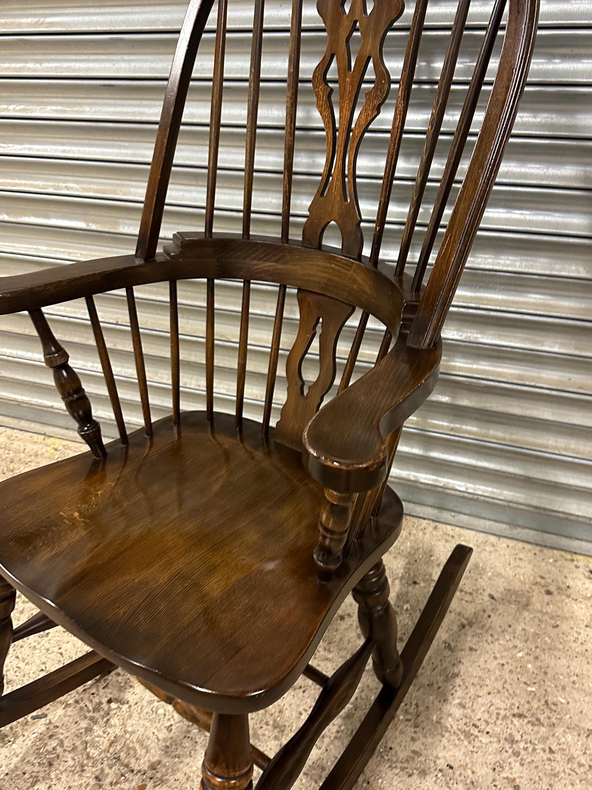 A beautifully crafted vintage Windsor-style rocking chair featuring a high arched back with pierced splats, turned supports, and elegantly shaped armrests. Made from solid elm and beech with a rich dark polished finish, this chair offers classic country charm and superb craftsmanship.