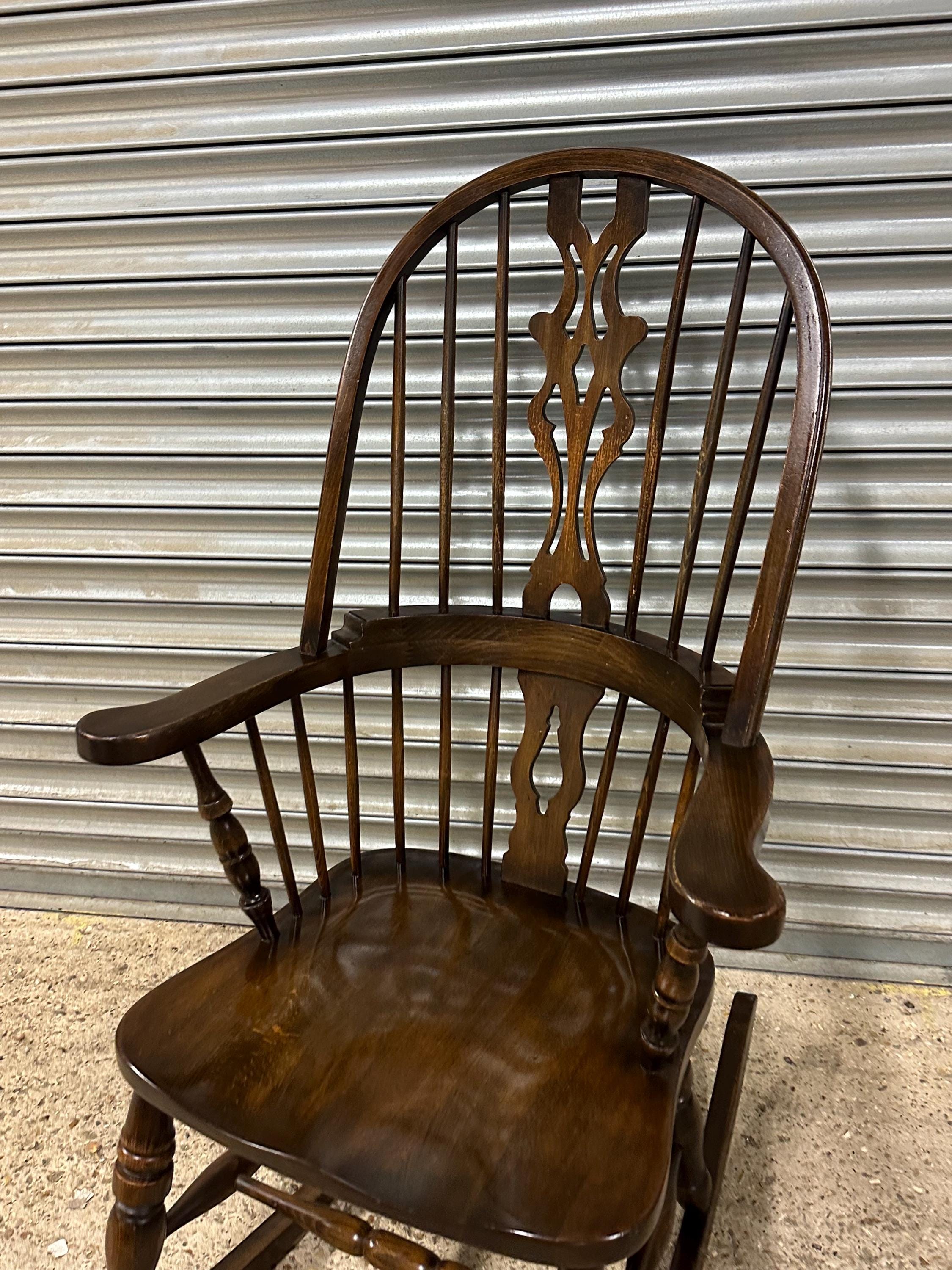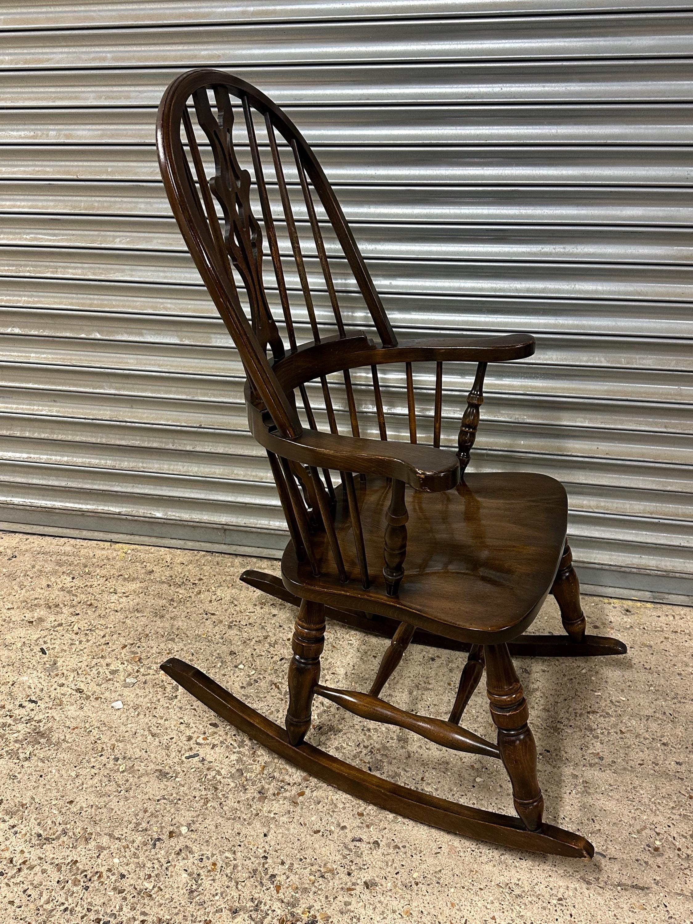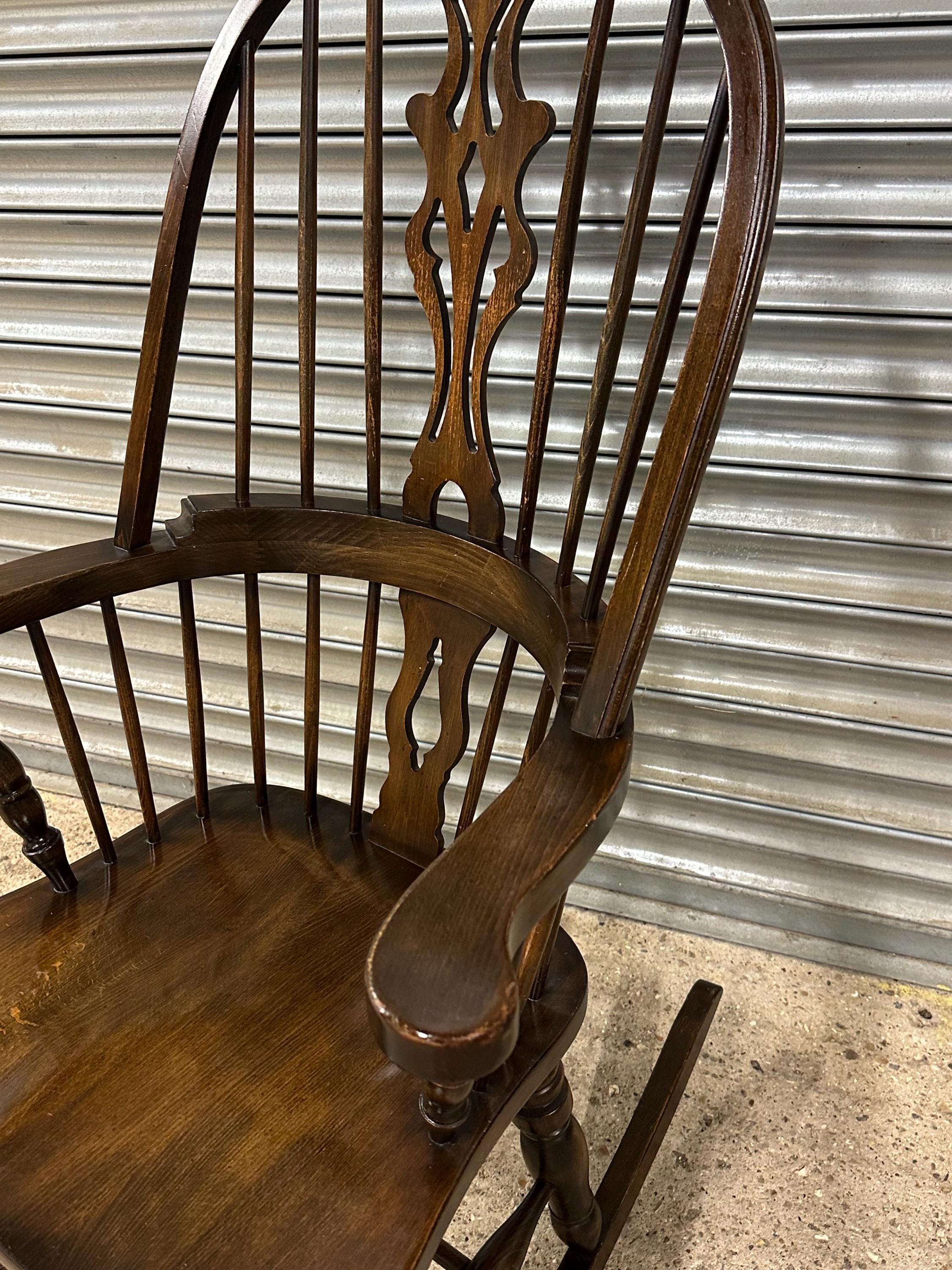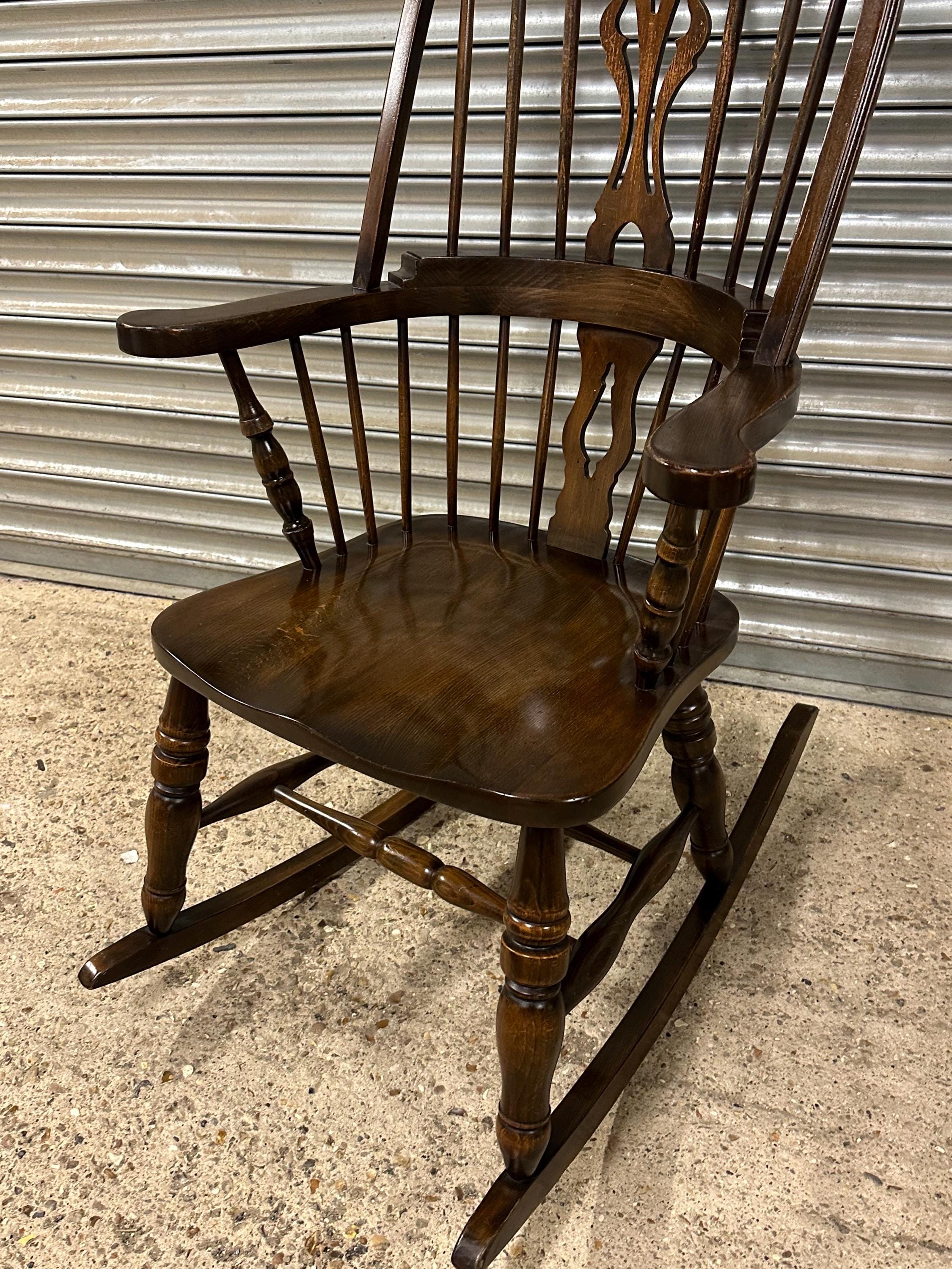 A beautifully crafted vintage Windsor-style rocking chair featuring a high arched back with pierced splats, turned supports, and elegantly shaped armrests. Made from solid elm and beech with a rich dark polished finish, this chair offers classic country charm and superb craftsmanship.