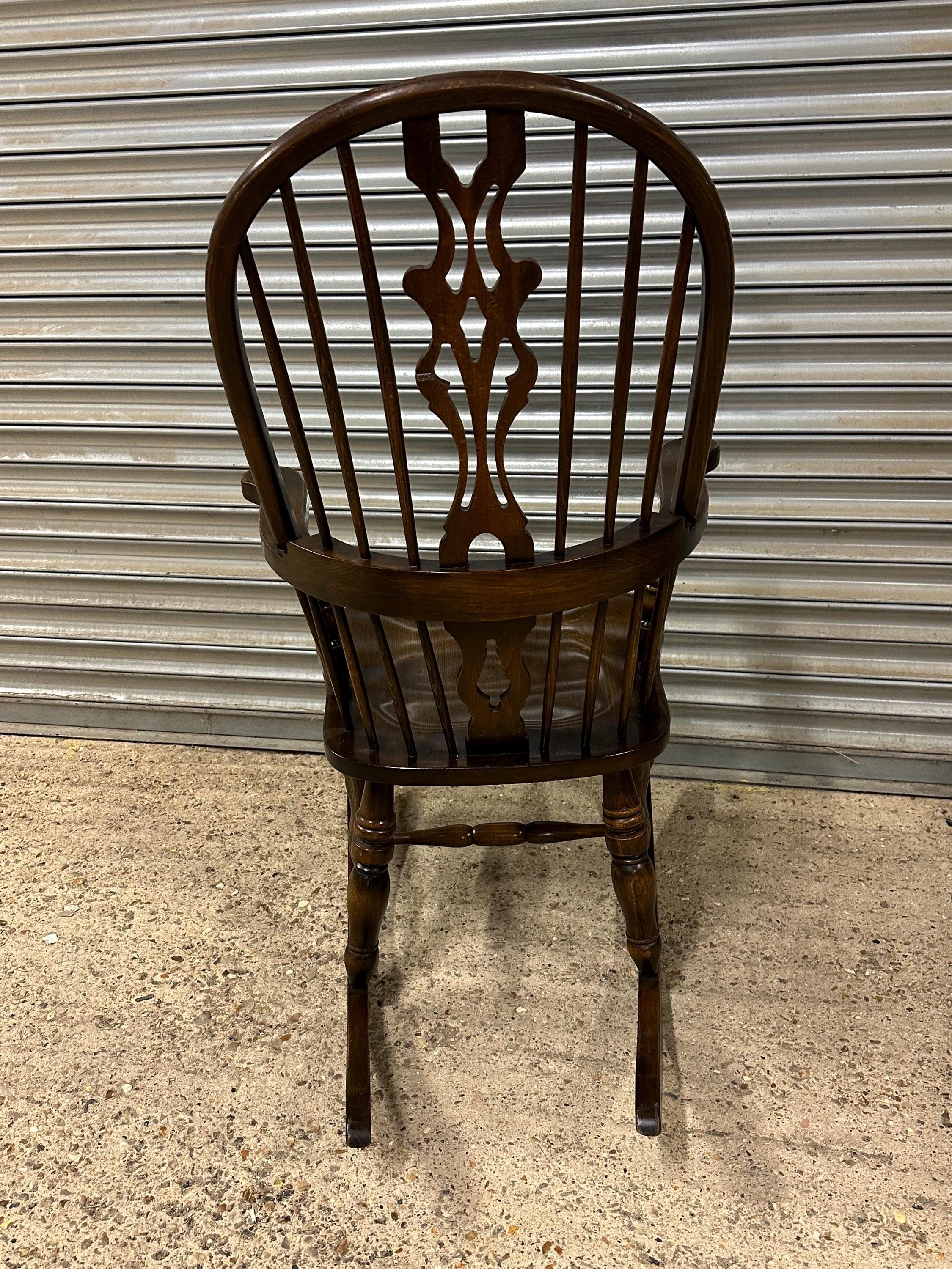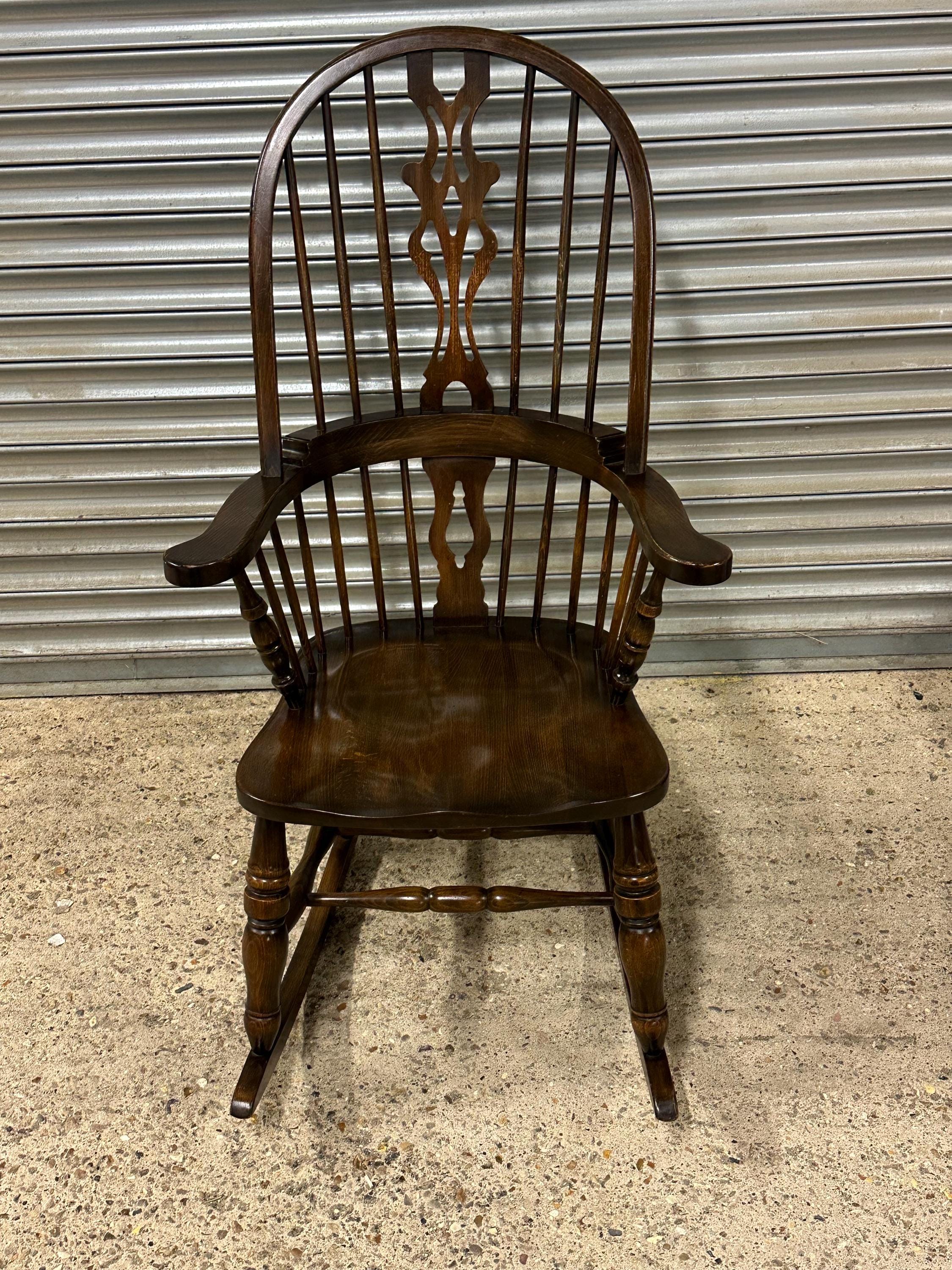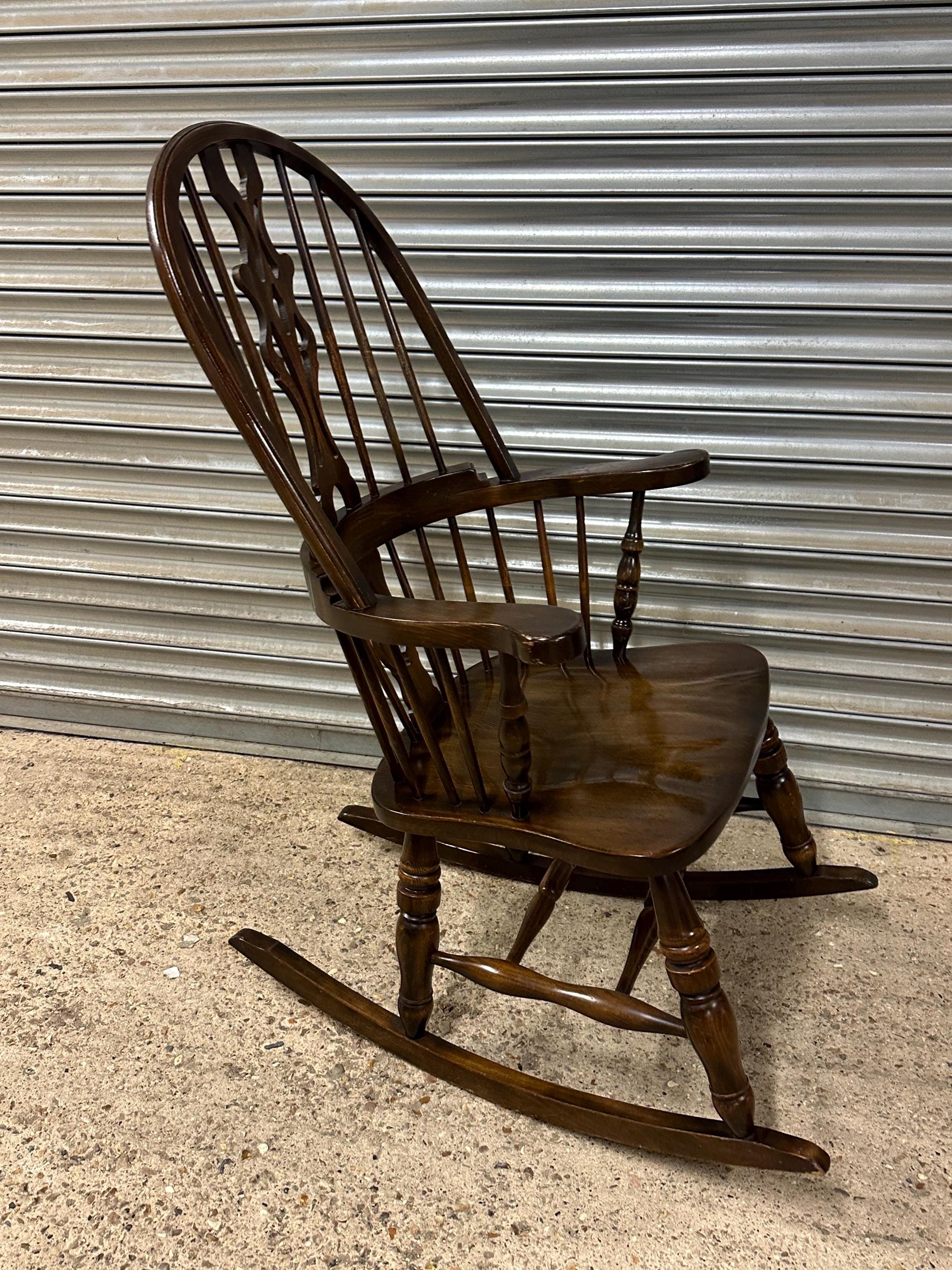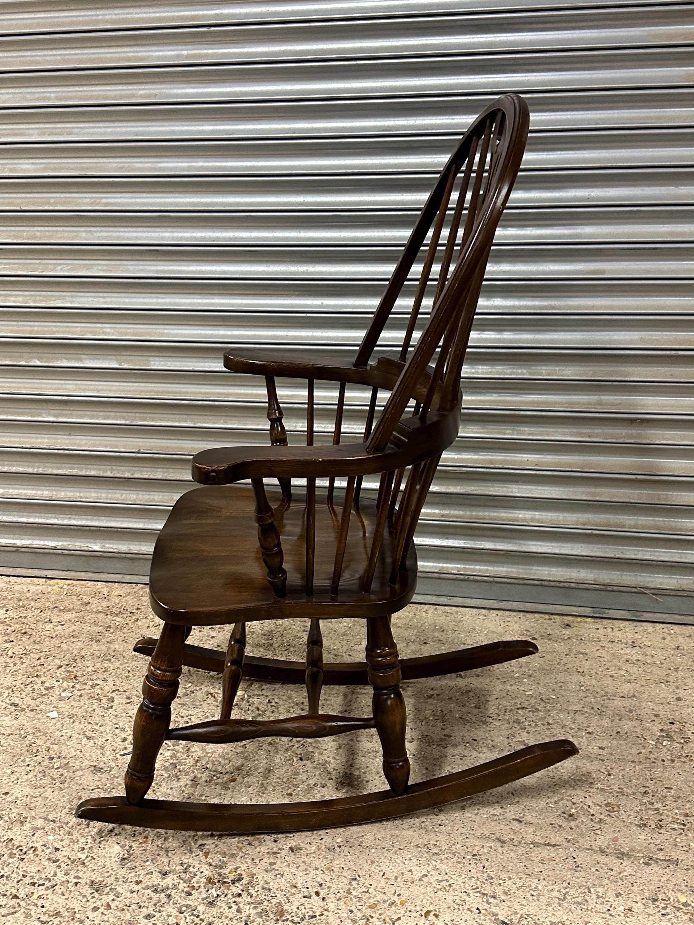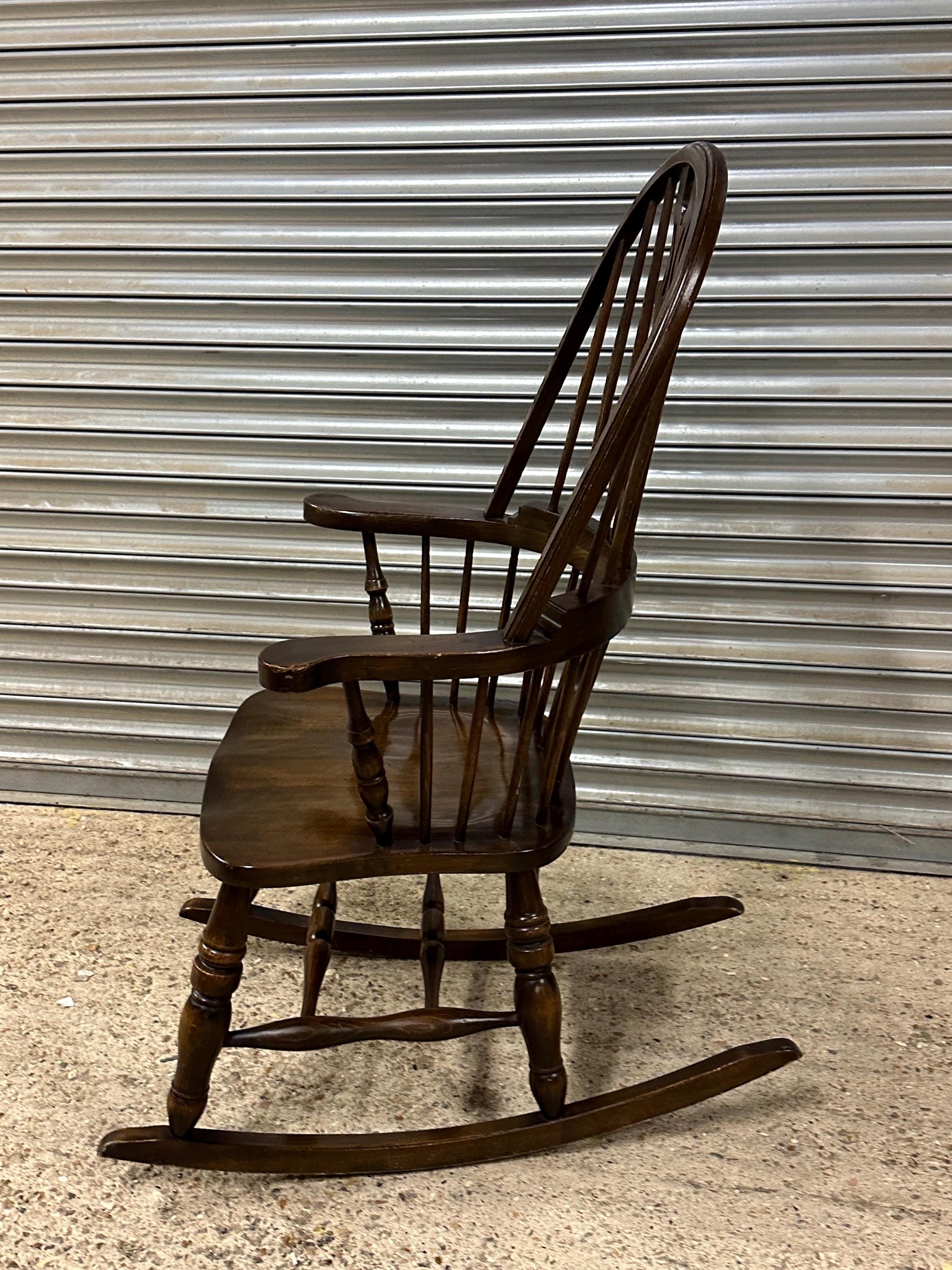 A beautifully crafted vintage Windsor-style rocking chair featuring a high arched back with pierced splats, turned supports, and elegantly shaped armrests. Made from solid elm and beech with a rich dark polished finish, this chair offers classic country charm and superb craftsmanship.