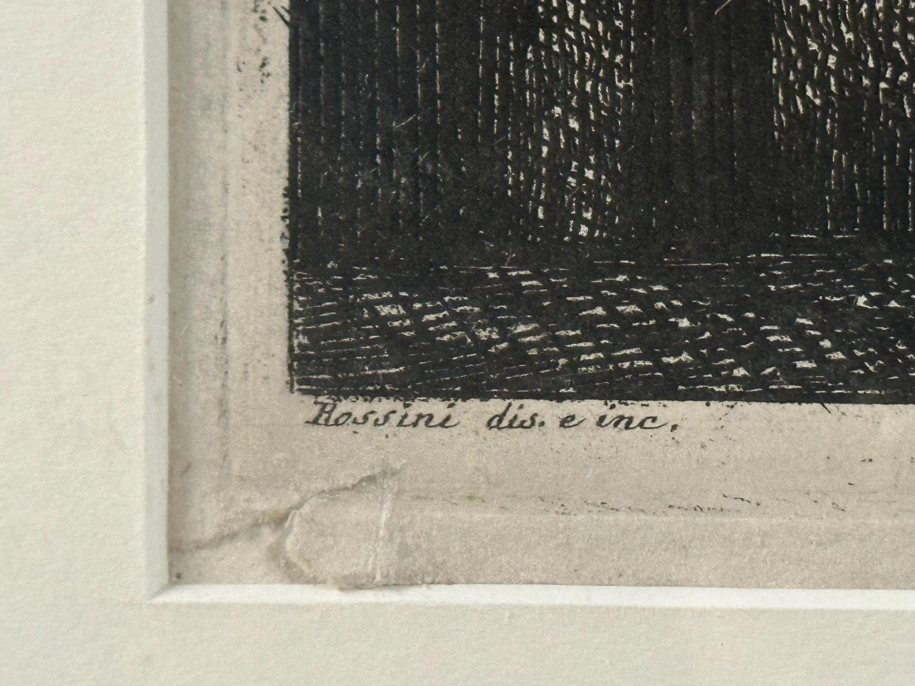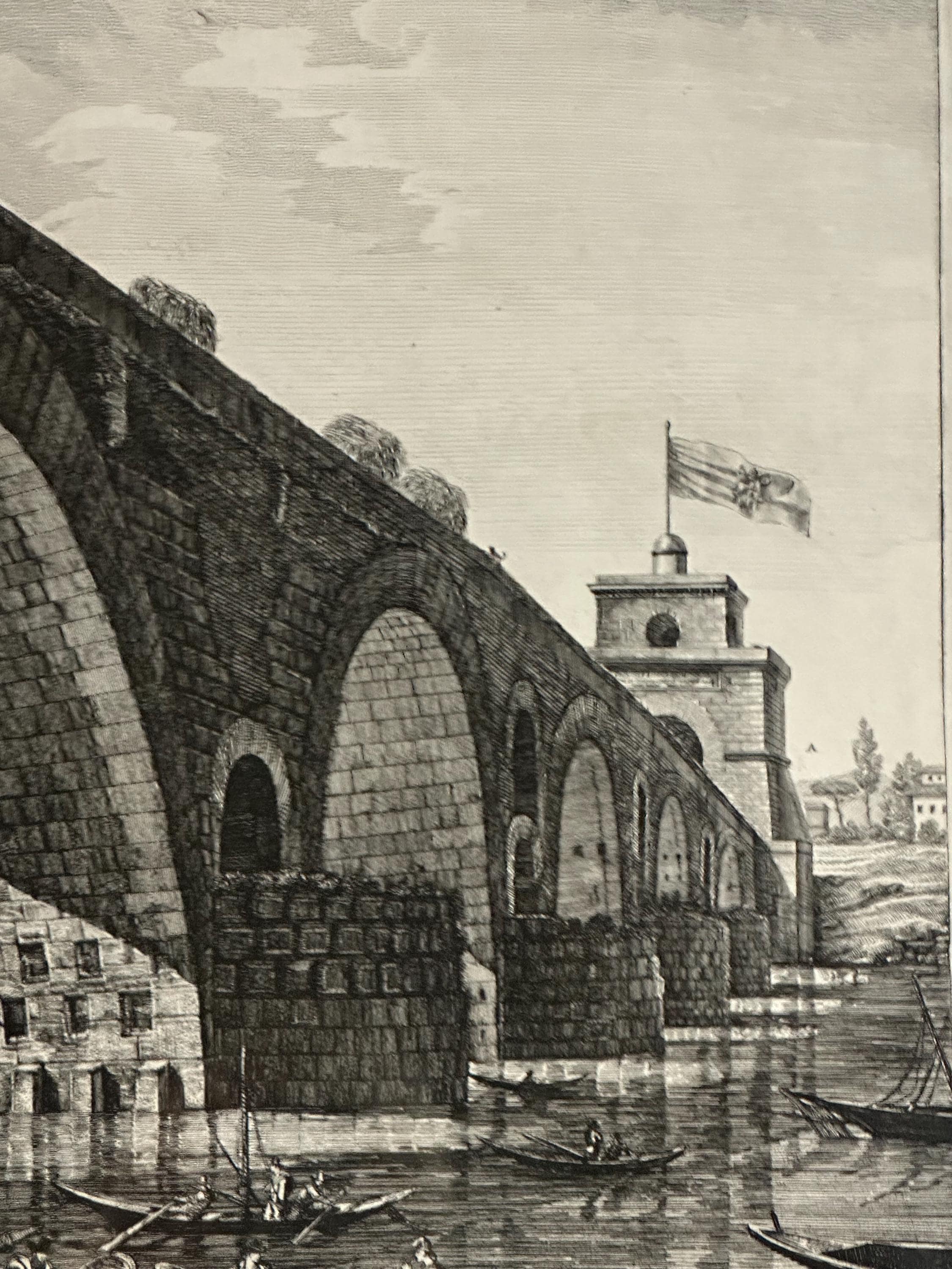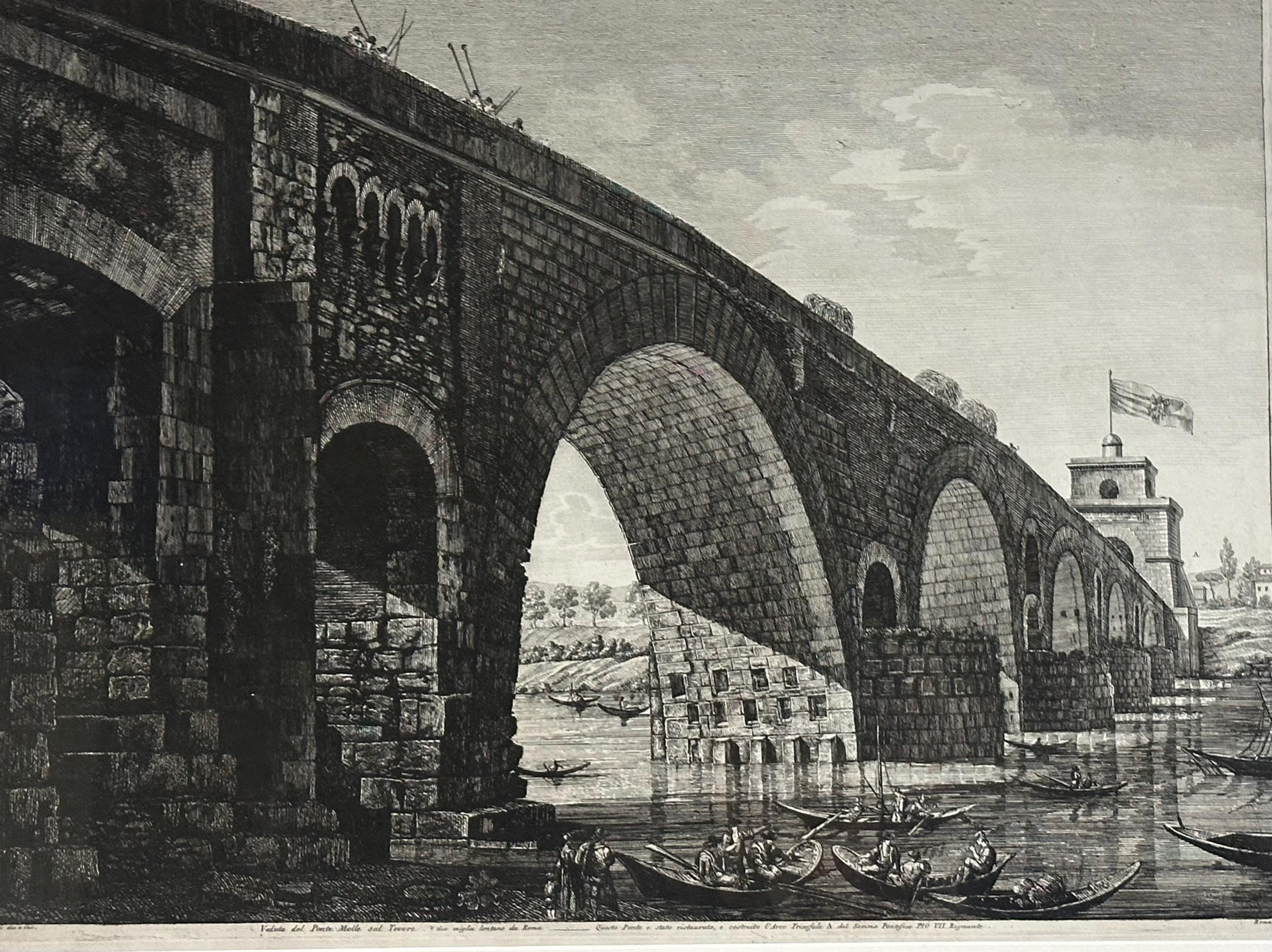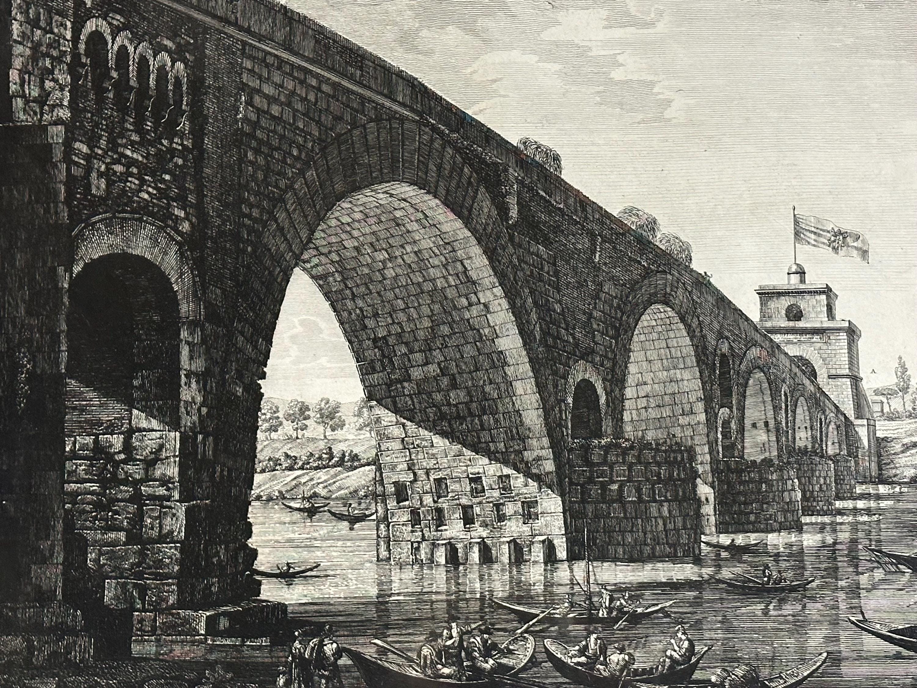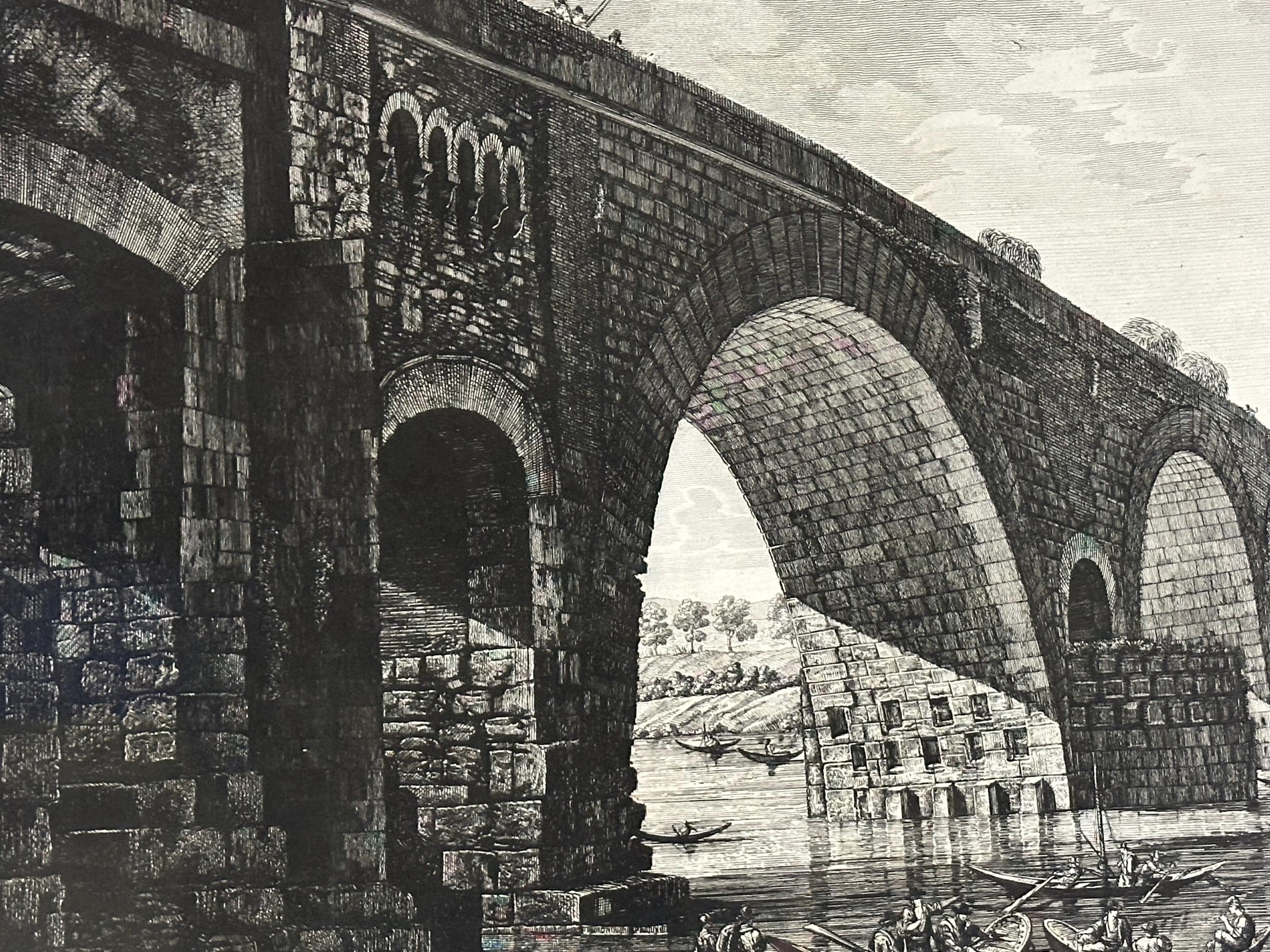 Powerful copper engraving of the Mulvian (or Milvian) Bridge over the Tiber River in northern Rome, looking up at the ancient structure from the riverside. Luigi Rossini (1790 - 1857) is noted for his stunning engravings such as this one, which render classical Roman architecture in exquisite detail. During the Roman Empire, the Bridge was economically and strategically important, and was the site of a famous battle between Roman Emperors Constantine and Maxentius. Title continues, "due miglia lontano da Roma. Questo Ponte e stato ristaurato, e costruito l'Arco Trionfale A.dal Sommo Pontefice PIO VII. Regnante" (two miles from Rome, this bridge was restored and a triumphal arch was constructed during the reign of Pope Pius VII)