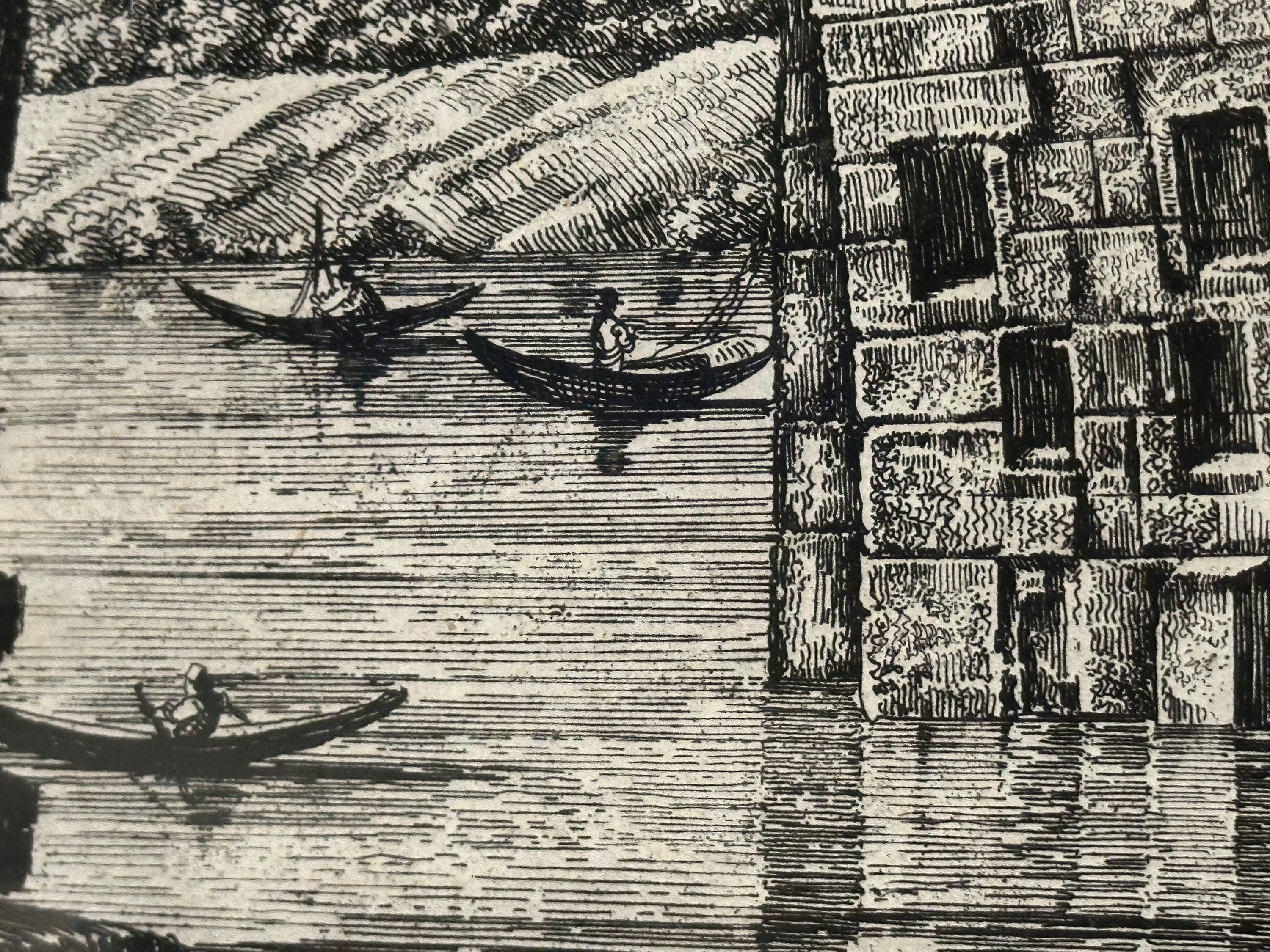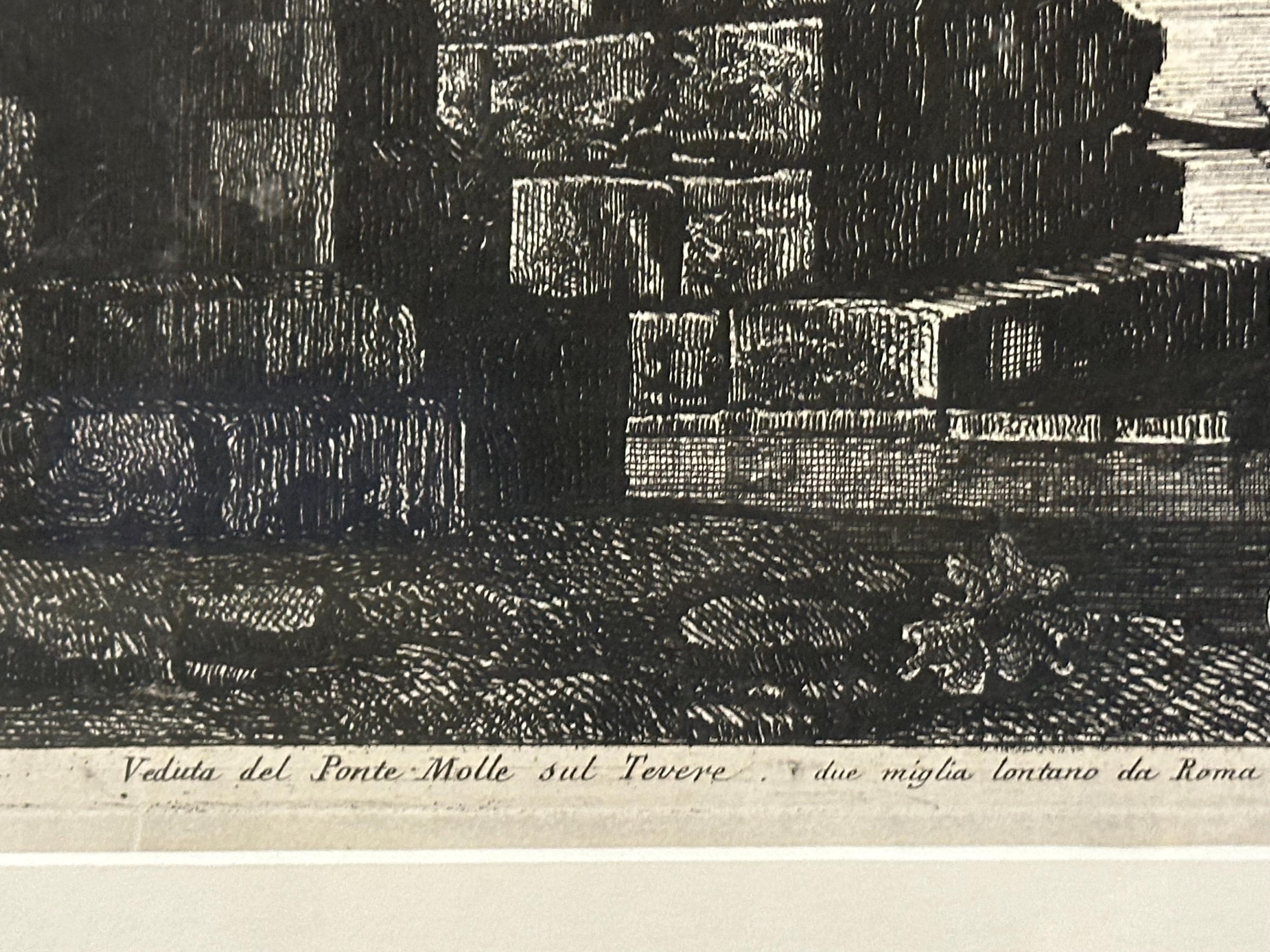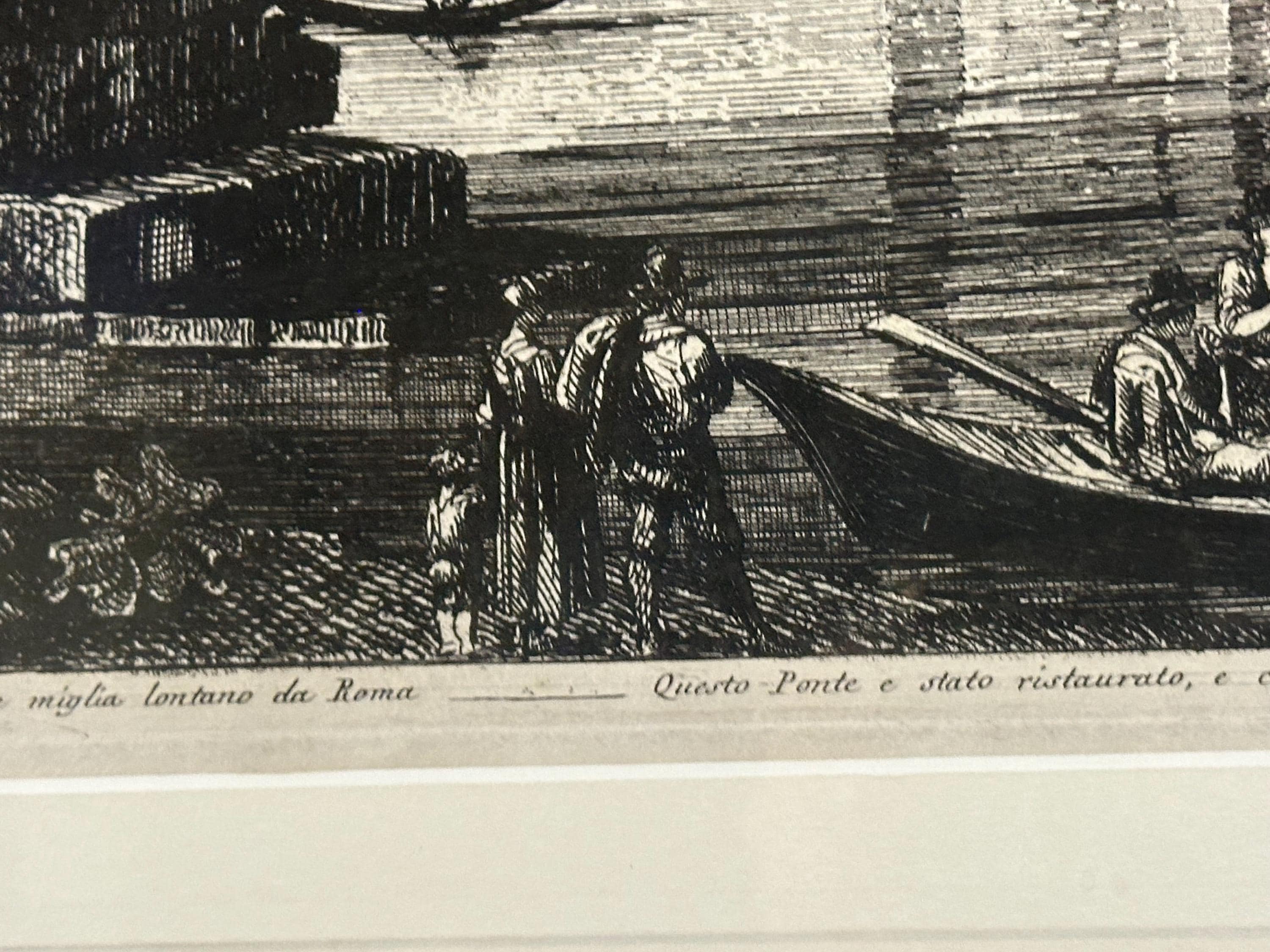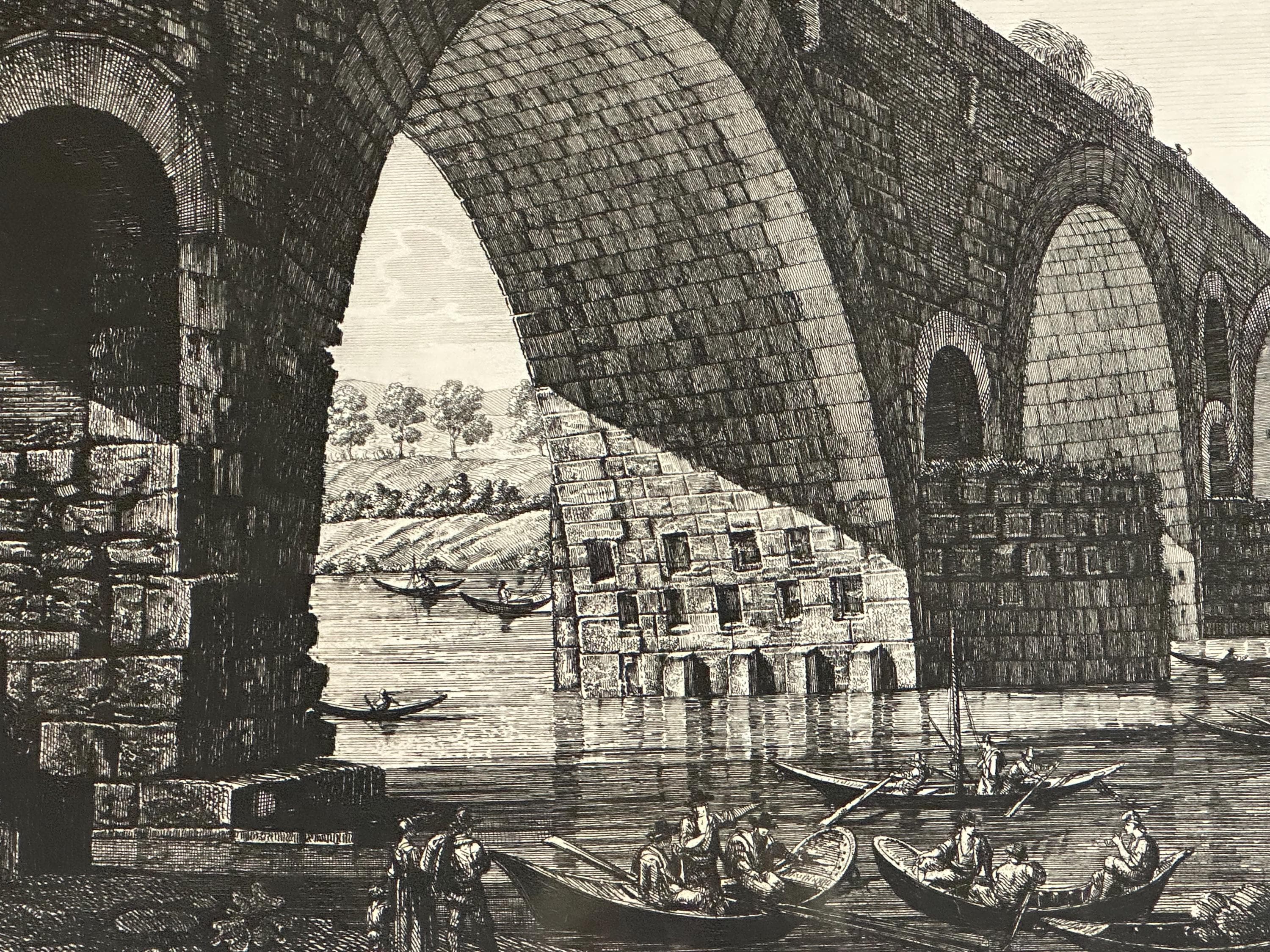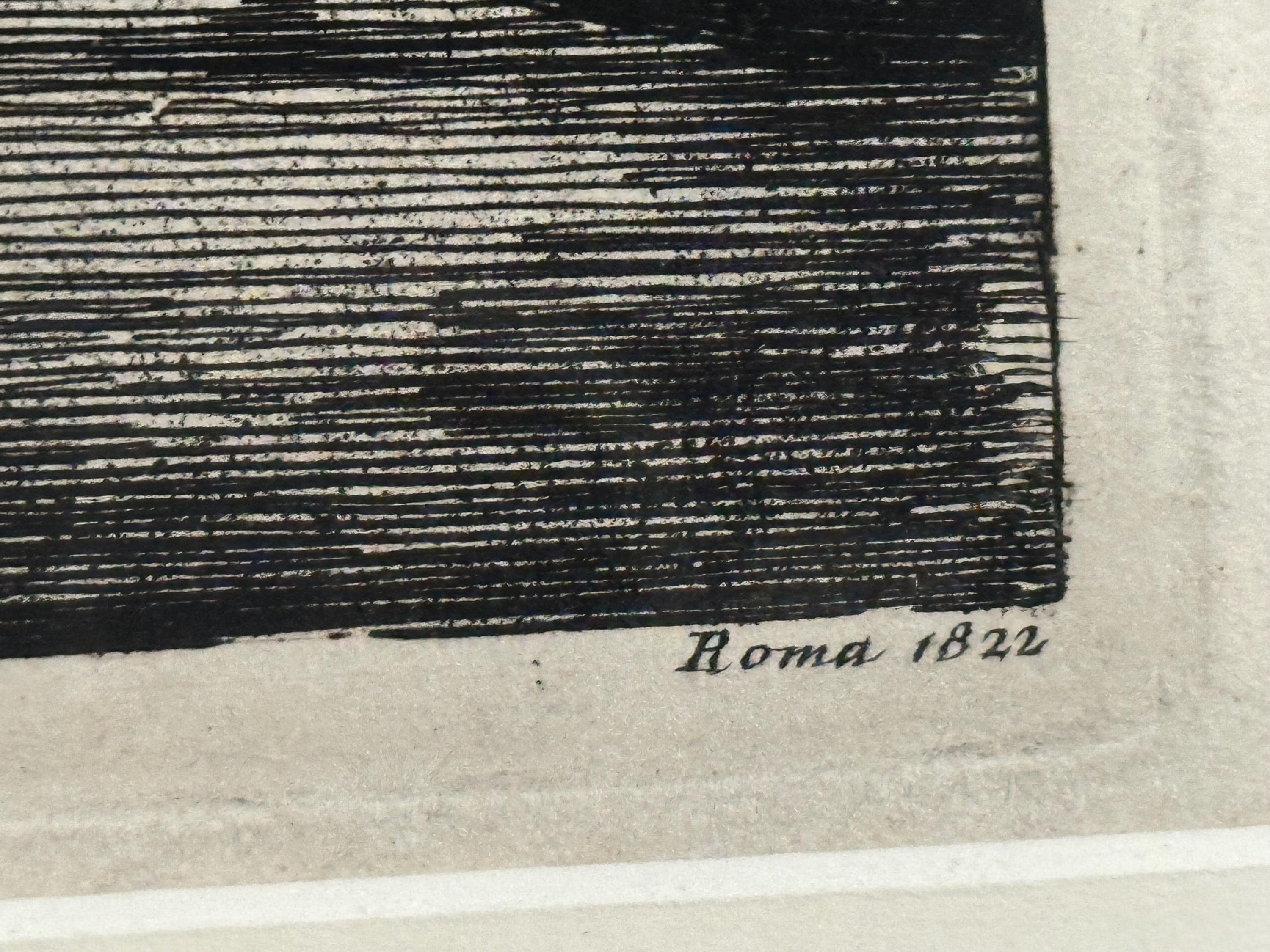 Powerful copper engraving of the Mulvian (or Milvian) Bridge over the Tiber River in northern Rome, looking up at the ancient structure from the riverside. Luigi Rossini (1790 - 1857) is noted for his stunning engravings such as this one, which render classical Roman architecture in exquisite detail. During the Roman Empire, the Bridge was economically and strategically important, and was the site of a famous battle between Roman Emperors Constantine and Maxentius. Title continues, "due miglia lontano da Roma. Questo Ponte e stato ristaurato, e costruito l'Arco Trionfale A.dal Sommo Pontefice PIO VII. Regnante" (two miles from Rome, this bridge was restored and a triumphal arch was constructed during the reign of Pope Pius VII)
