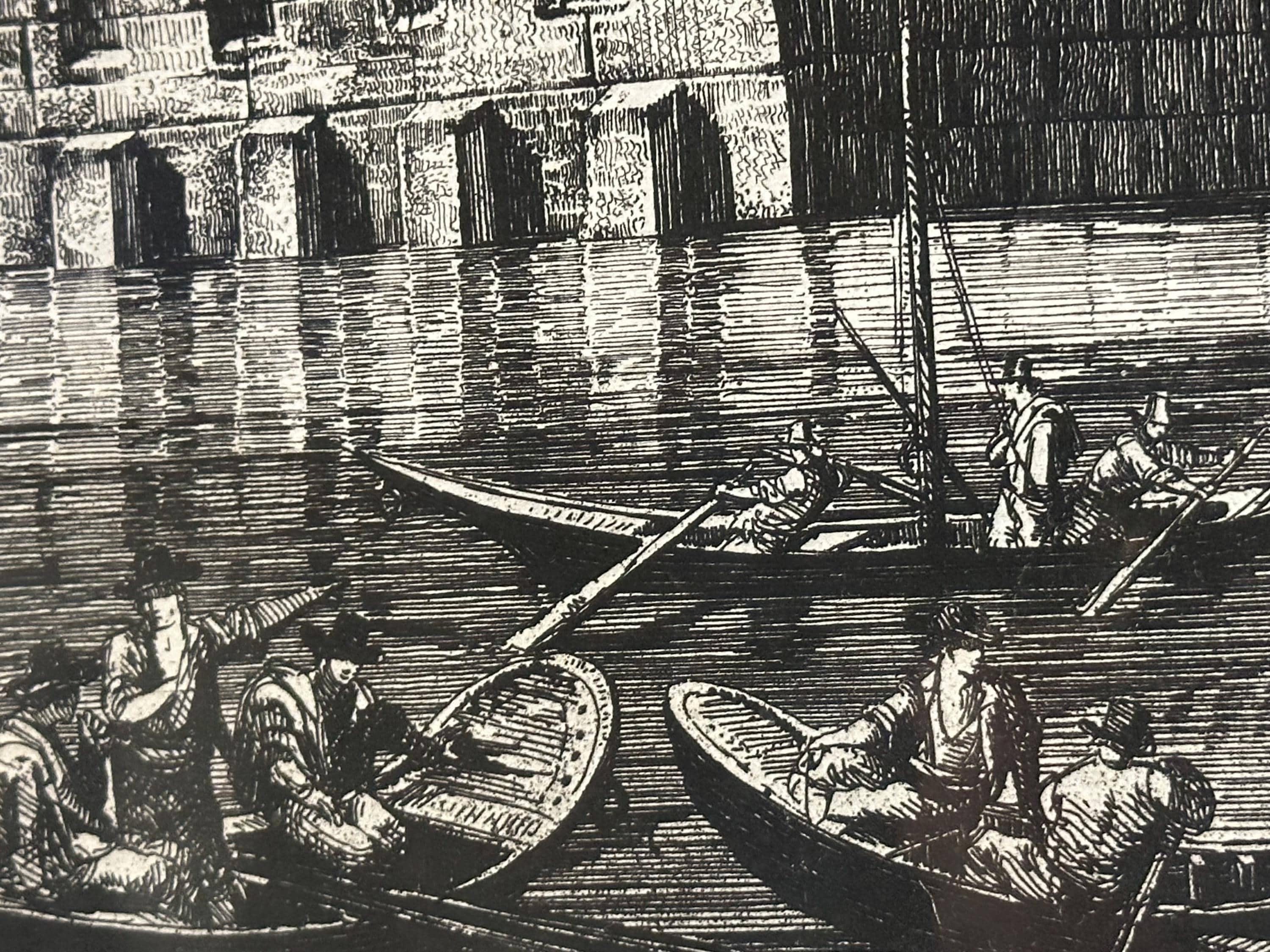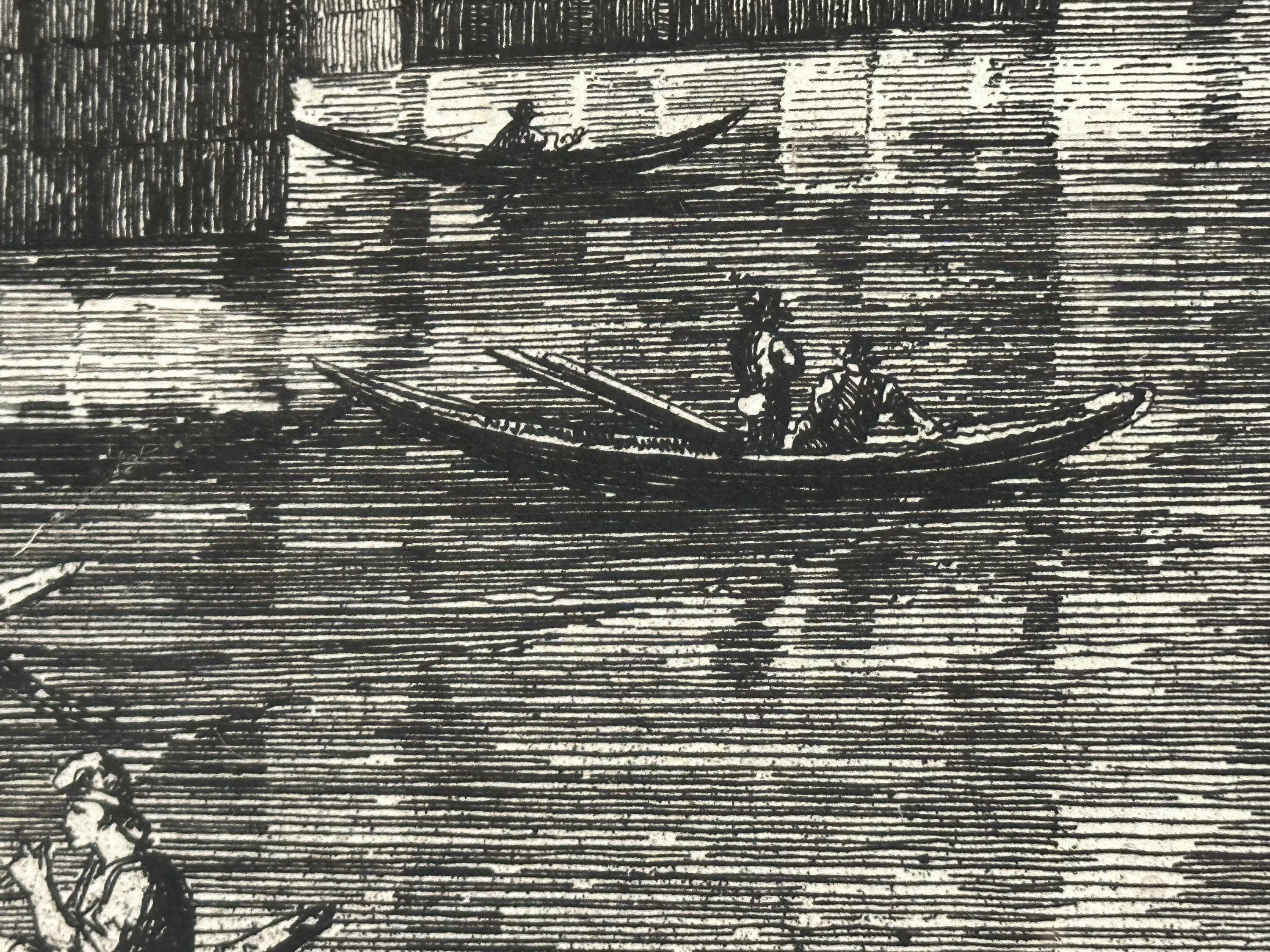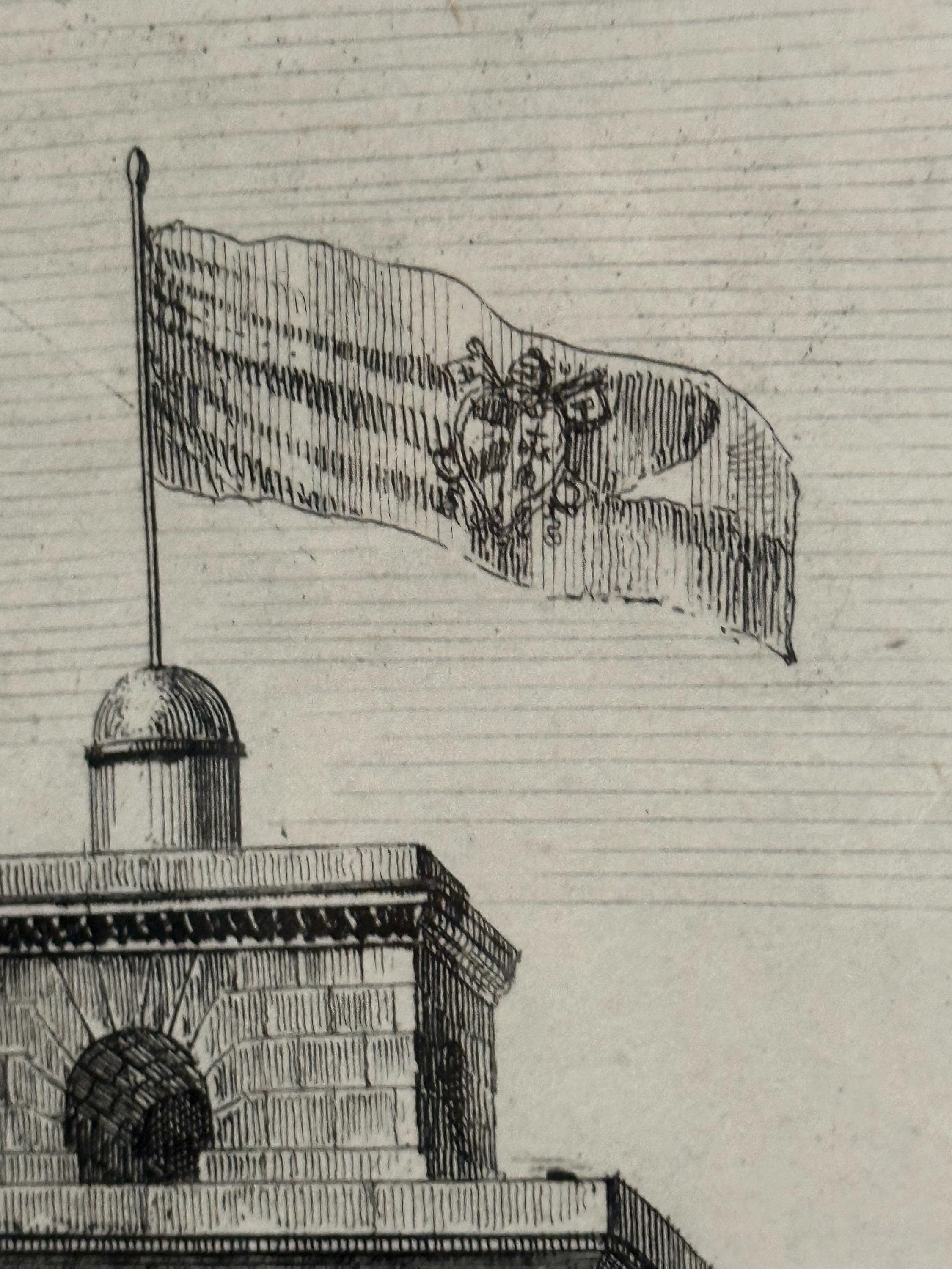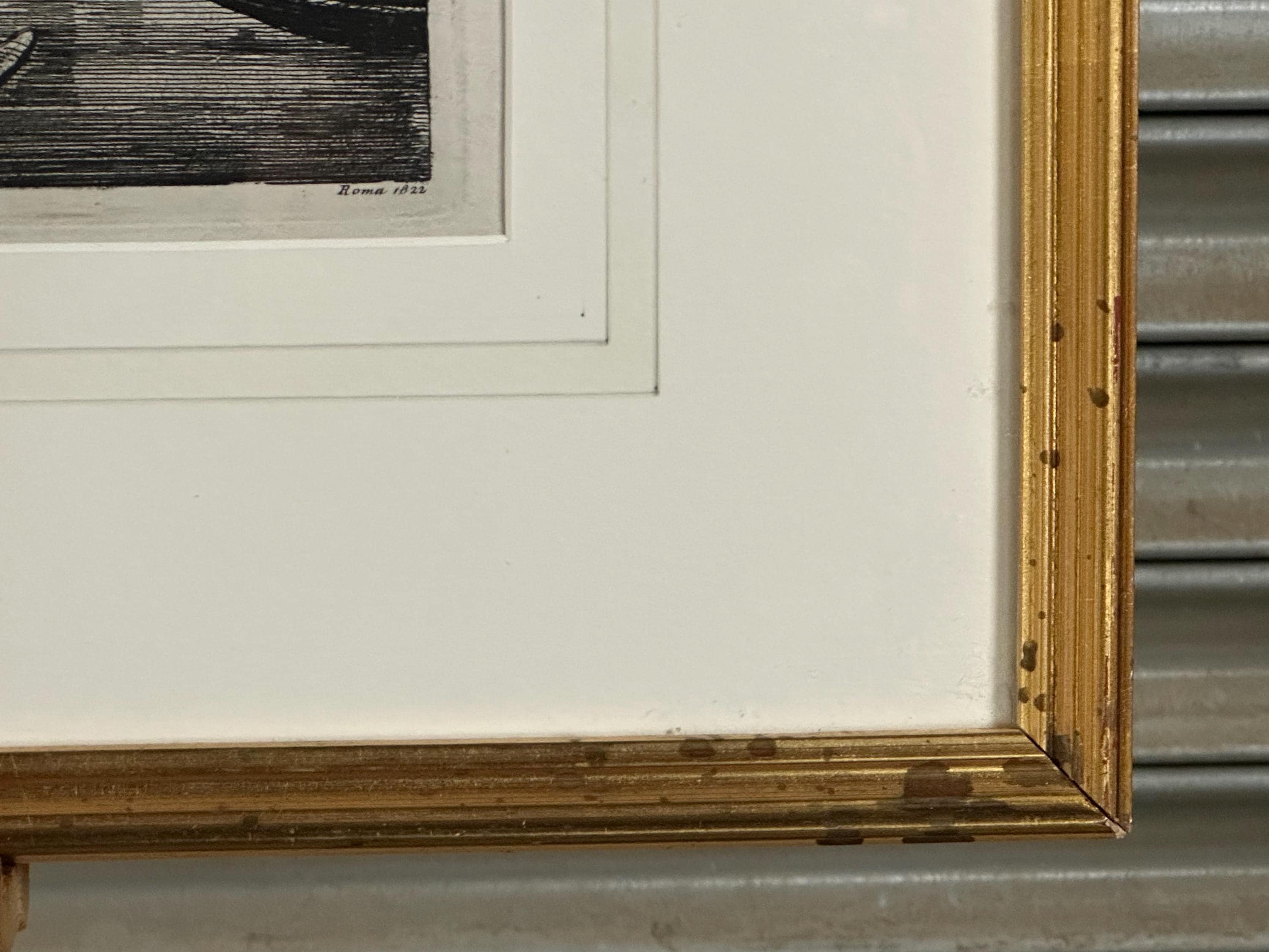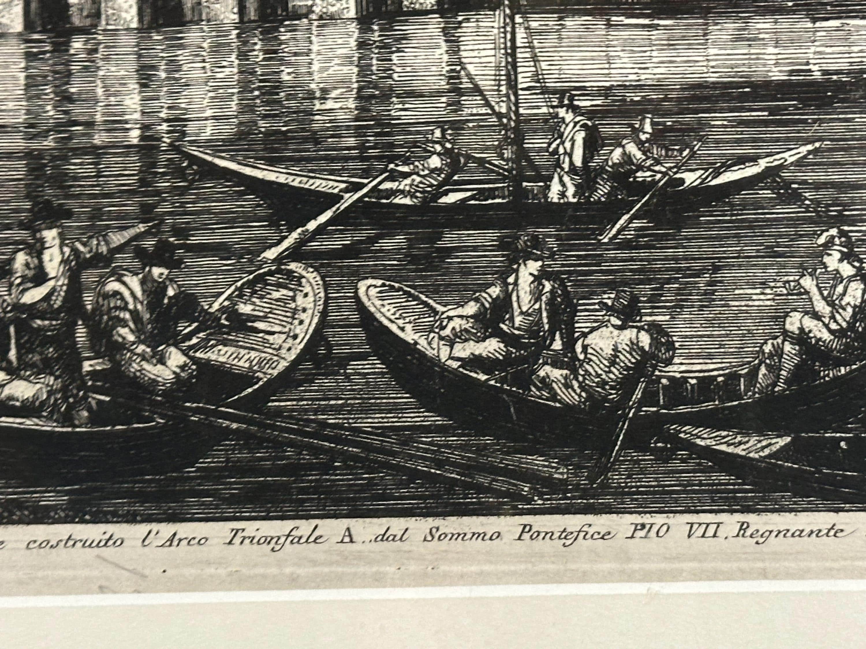 Powerful copper engraving of the Mulvian (or Milvian) Bridge over the Tiber River in northern Rome, looking up at the ancient structure from the riverside. Luigi Rossini (1790 - 1857) is noted for his stunning engravings such as this one, which render classical Roman architecture in exquisite detail. During the Roman Empire, the Bridge was economically and strategically important, and was the site of a famous battle between Roman Emperors Constantine and Maxentius. Title continues, "due miglia lontano da Roma. Questo Ponte e stato ristaurato, e costruito l'Arco Trionfale A.dal Sommo Pontefice PIO VII. Regnante" (two miles from Rome, this bridge was restored and a triumphal arch was constructed during the reign of Pope Pius VII)