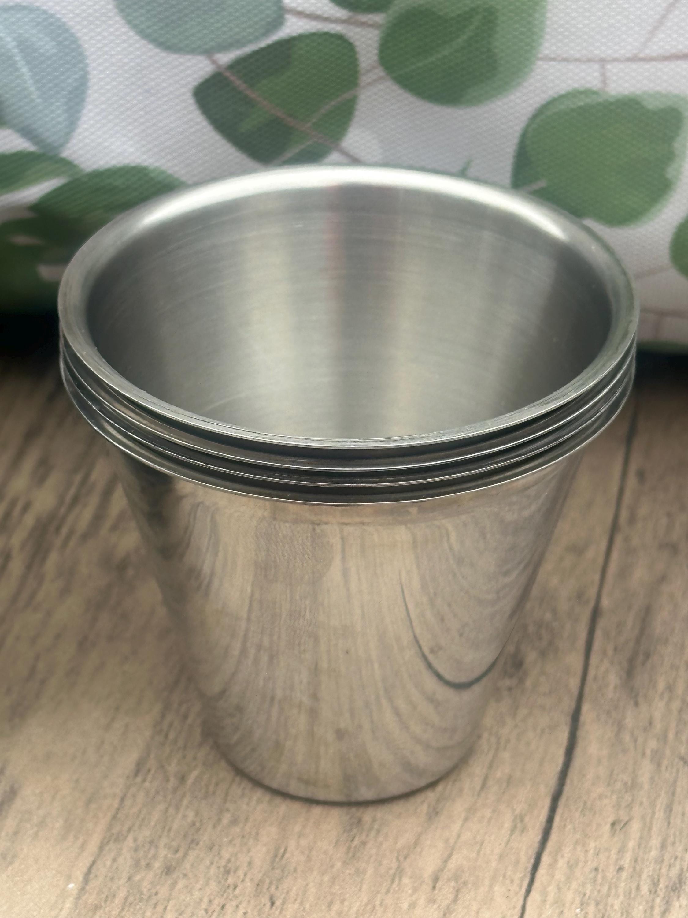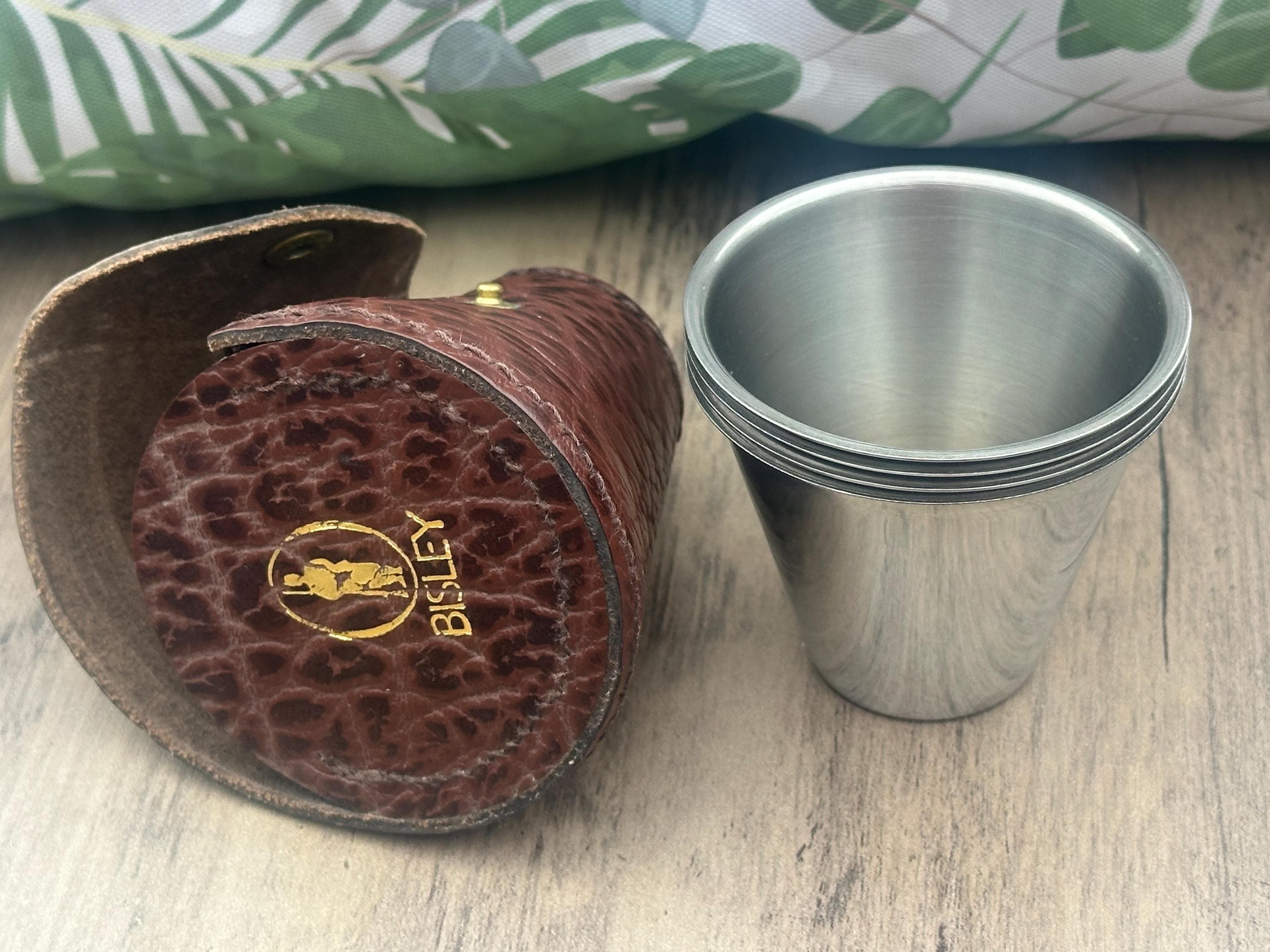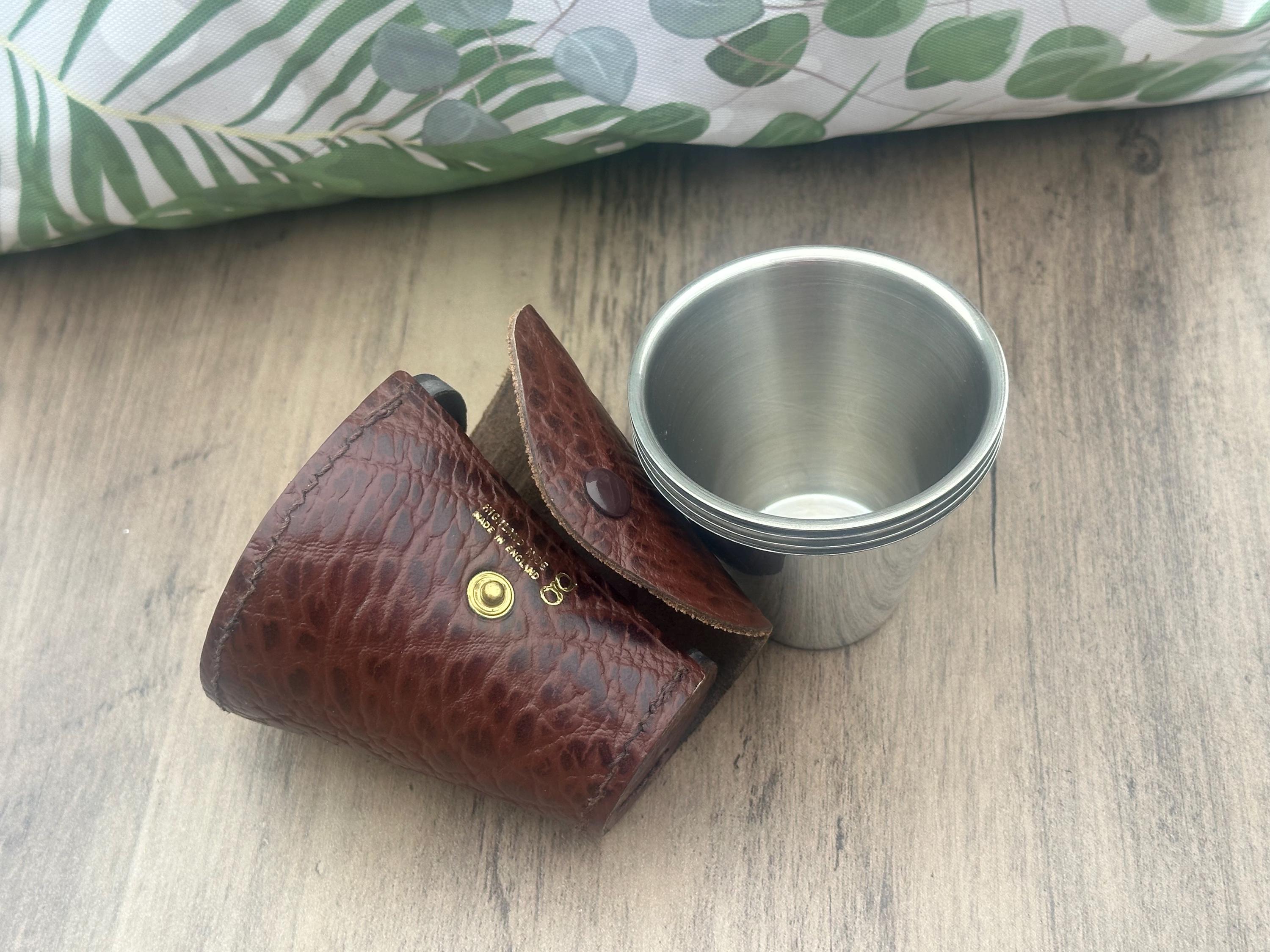 • Material: Stainless steel cups with brown leather case. Made in England