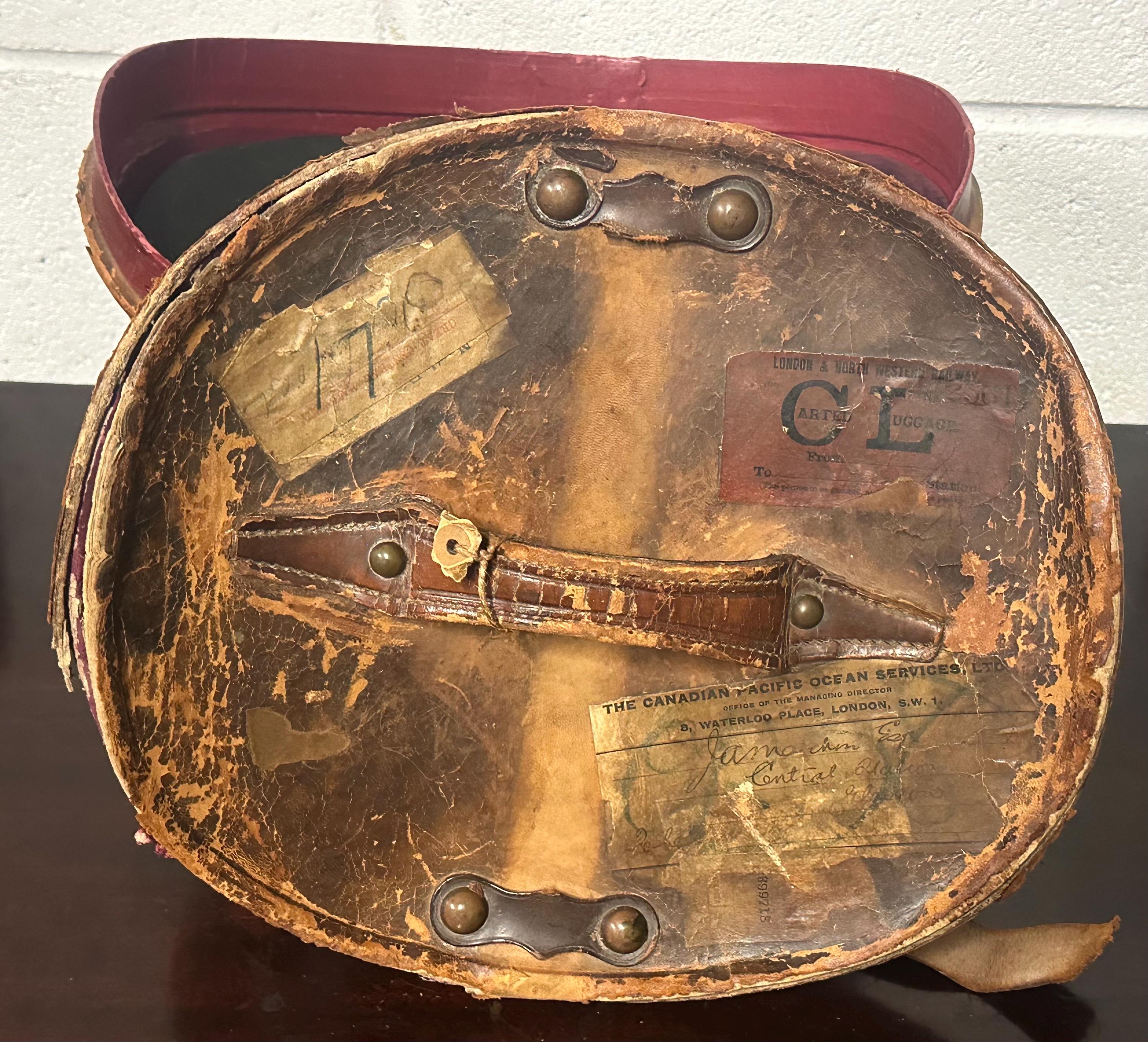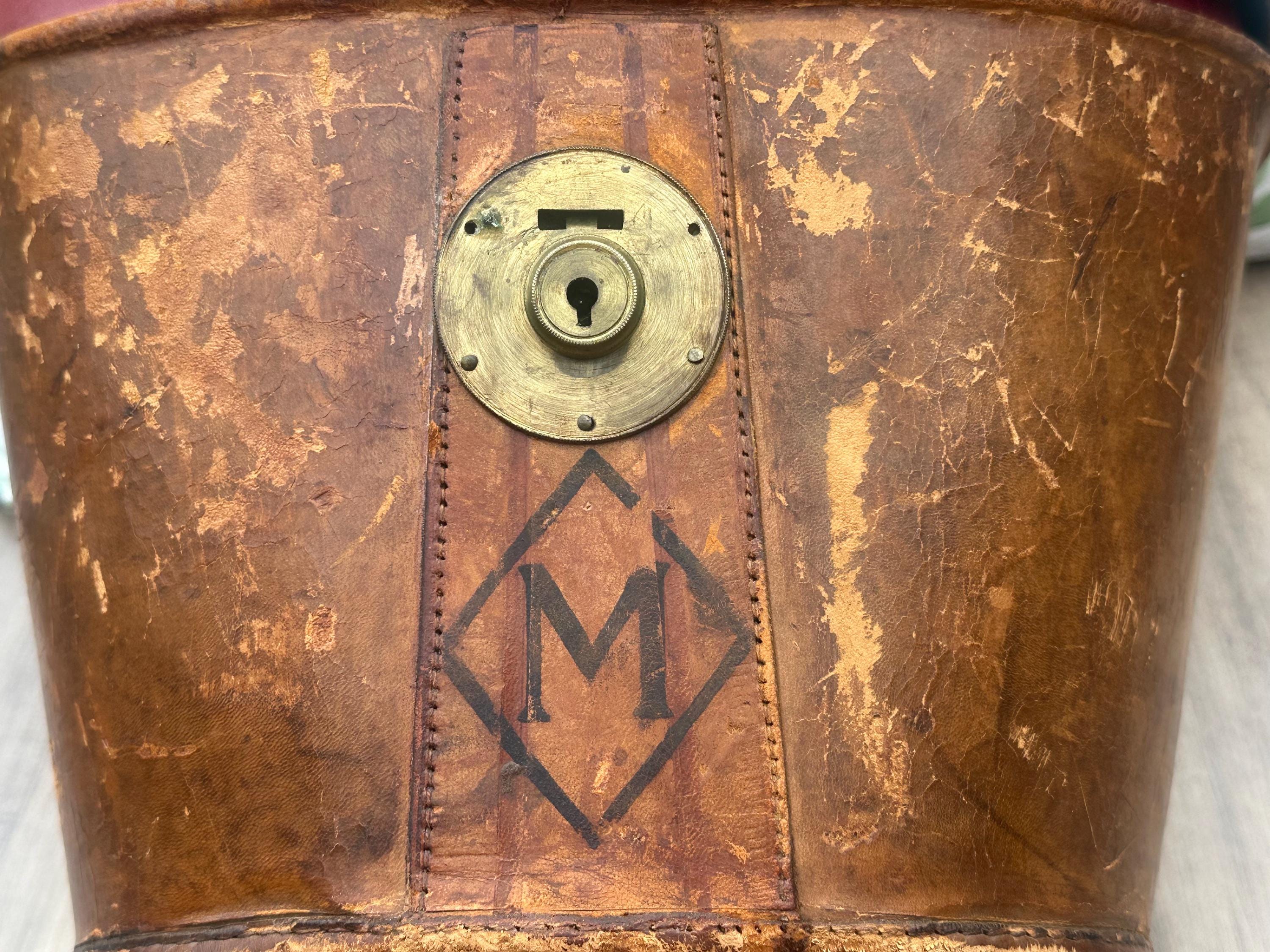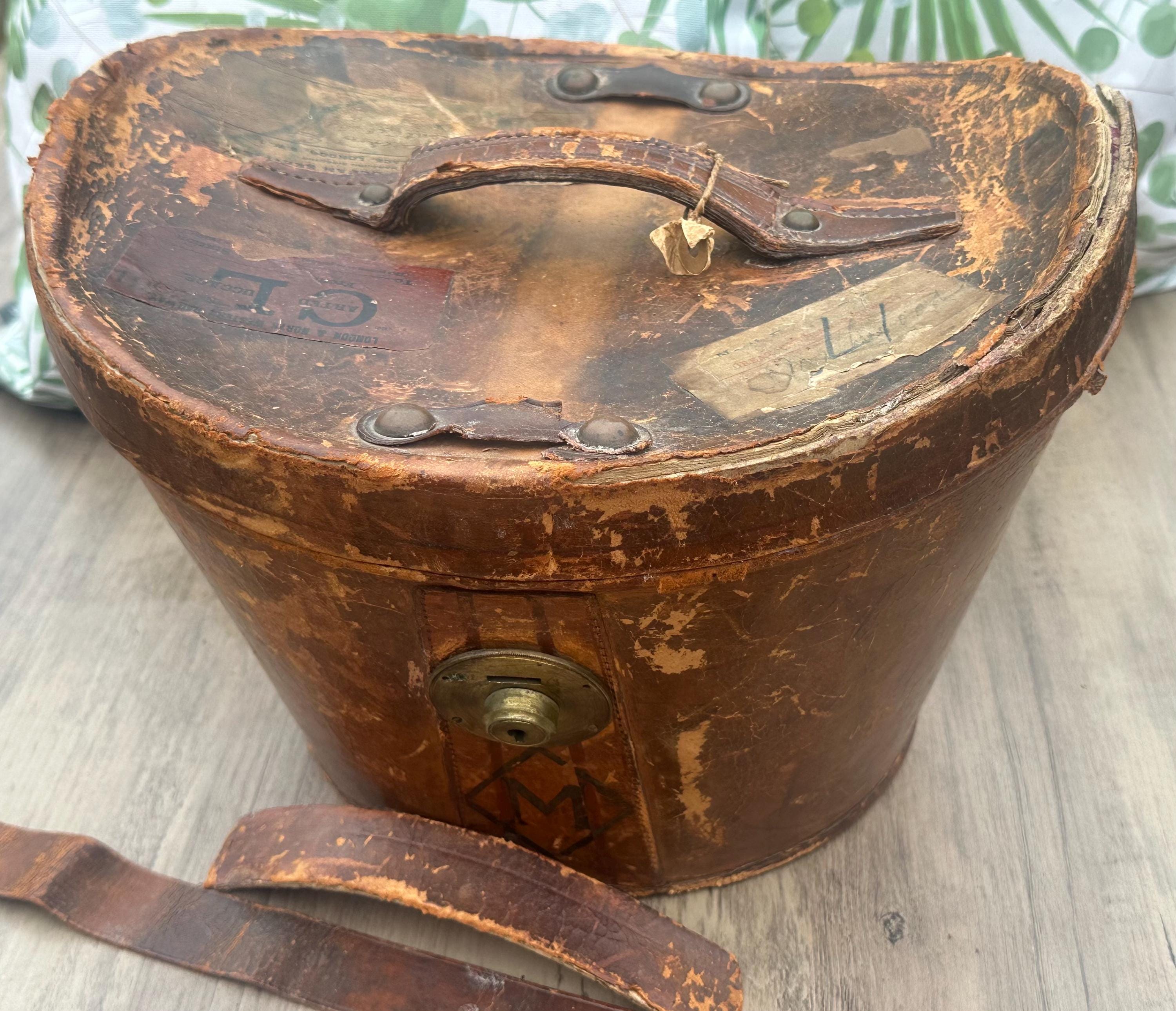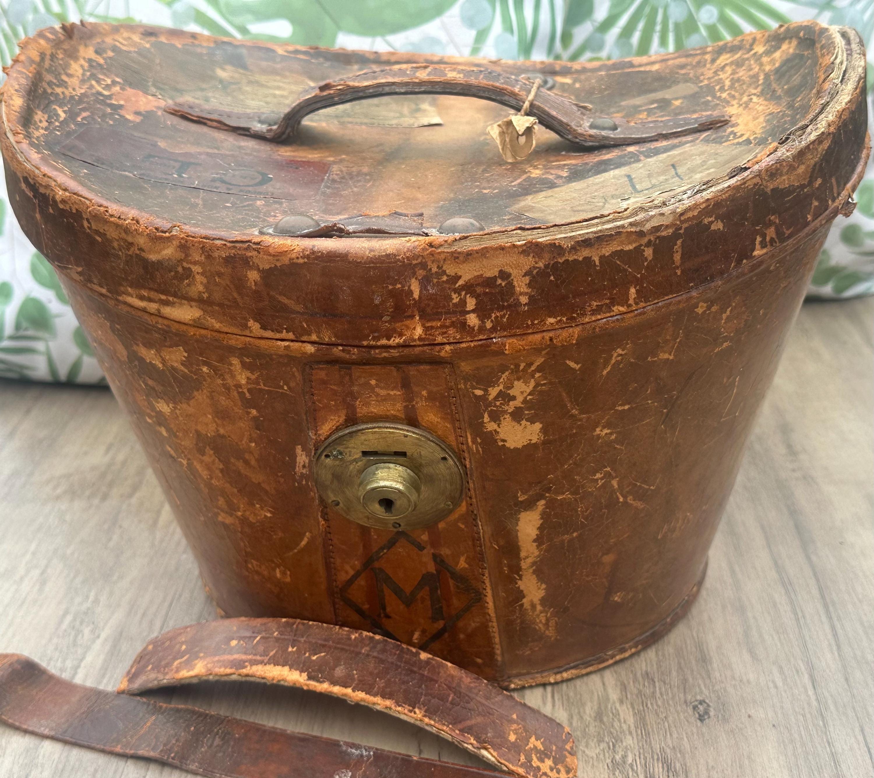 • Comes with the original brown leather hat box, embossed with initials and featuring a brass lock (no key). Broken leather strap and part of leather rim has broken away. See photos
