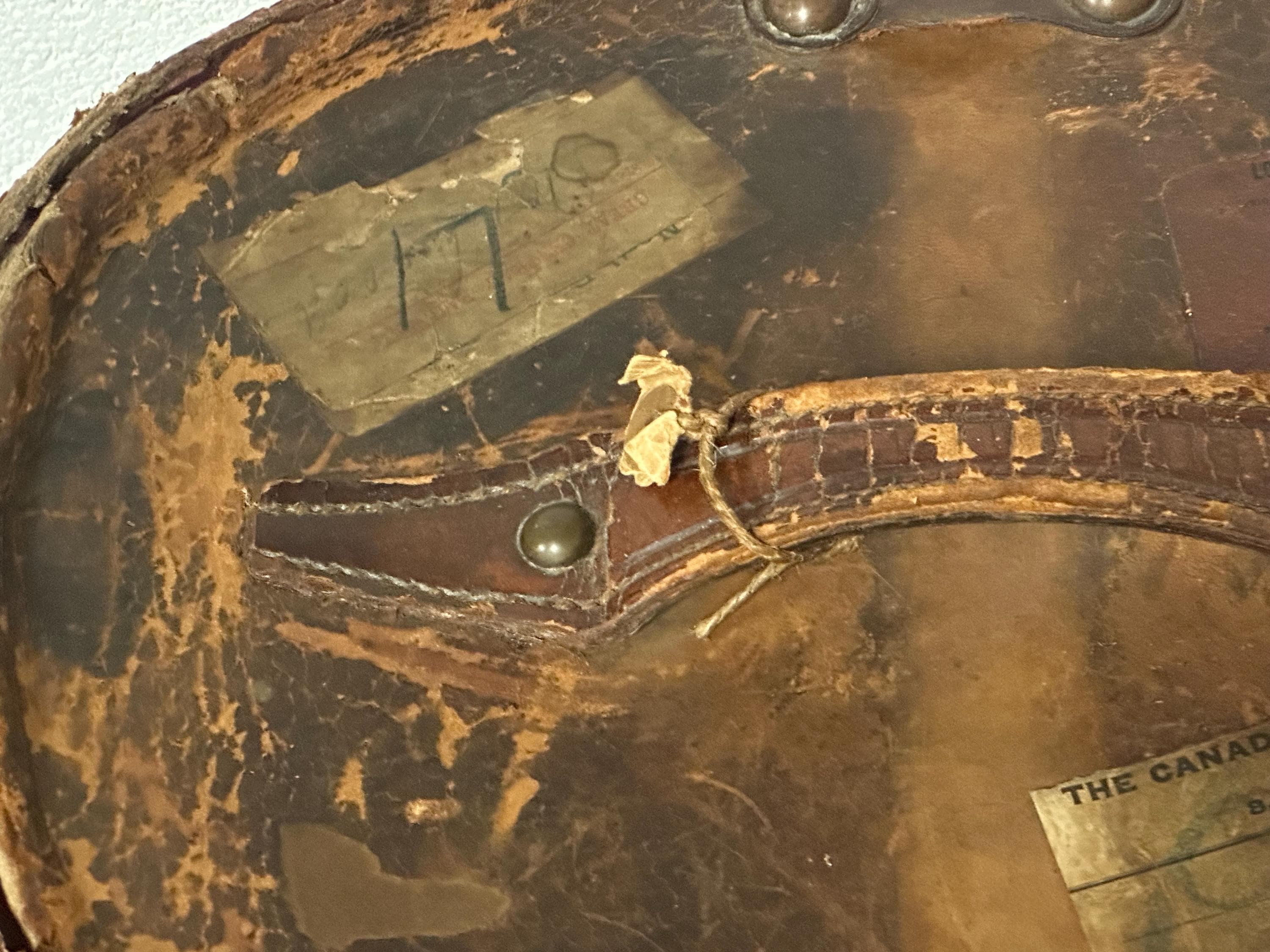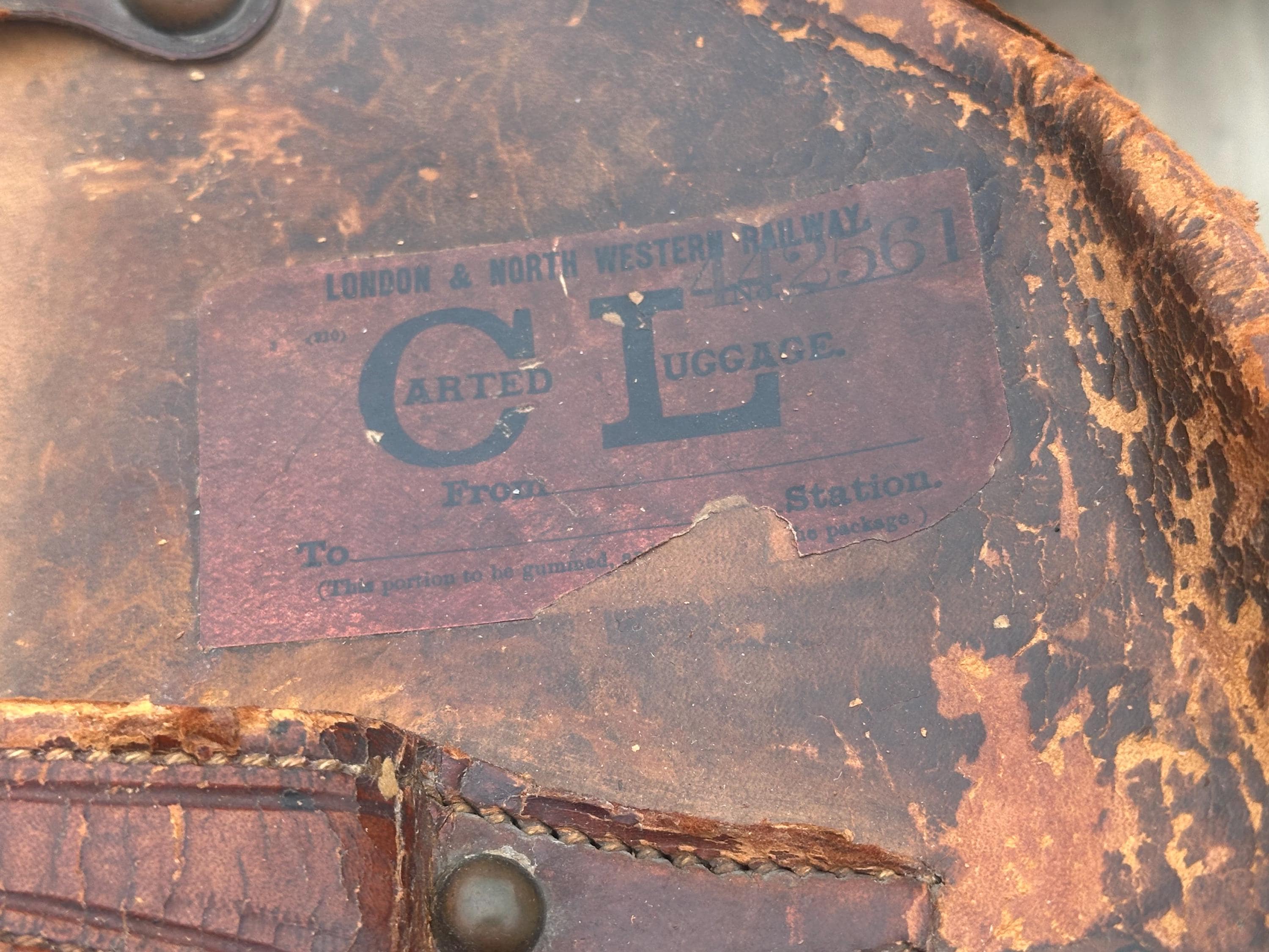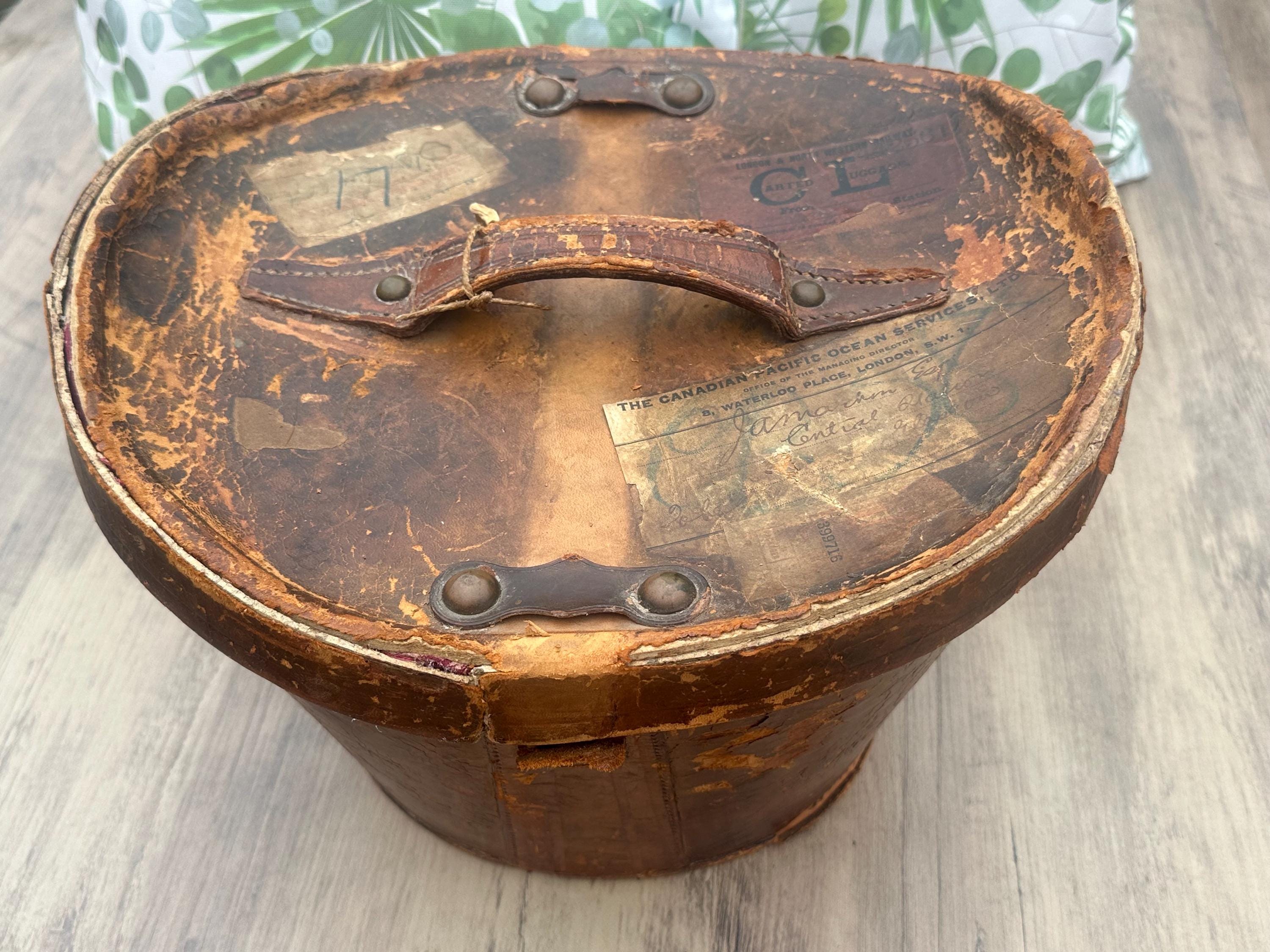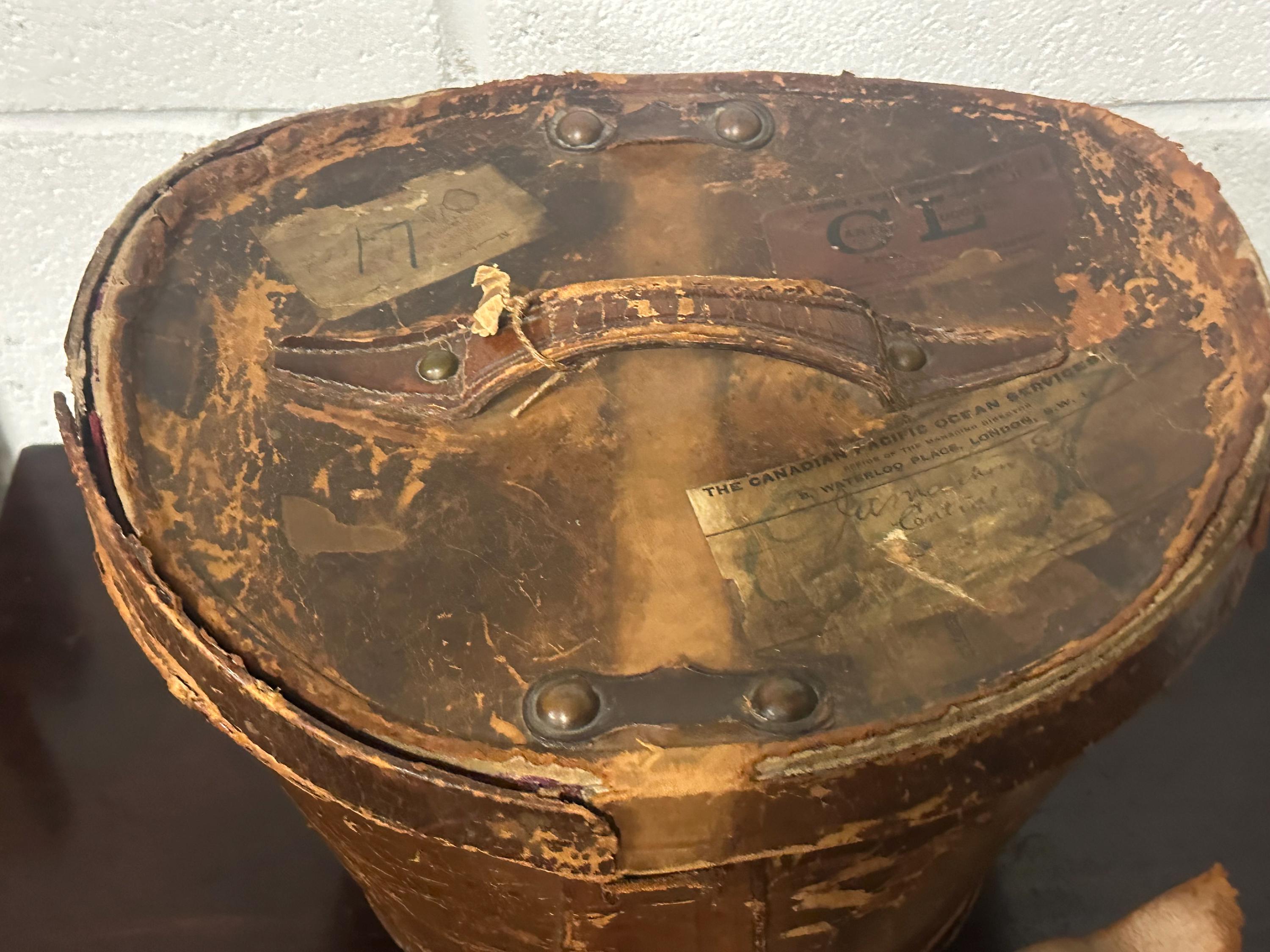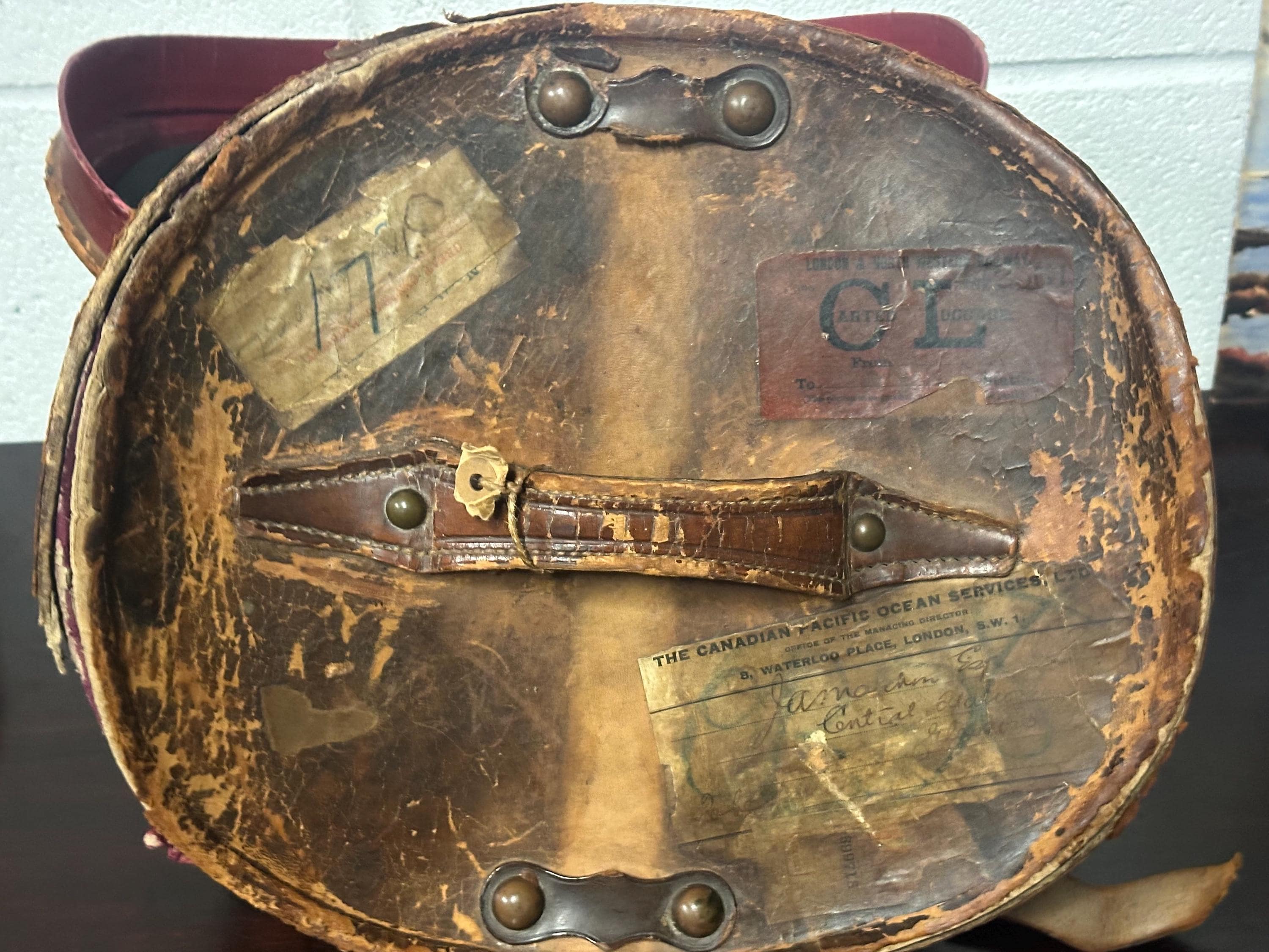 • Comes with the original brown leather hat box, embossed with initials and featuring a brass lock (no key). Broken leather strap and part of leather rim has broken away. See photos