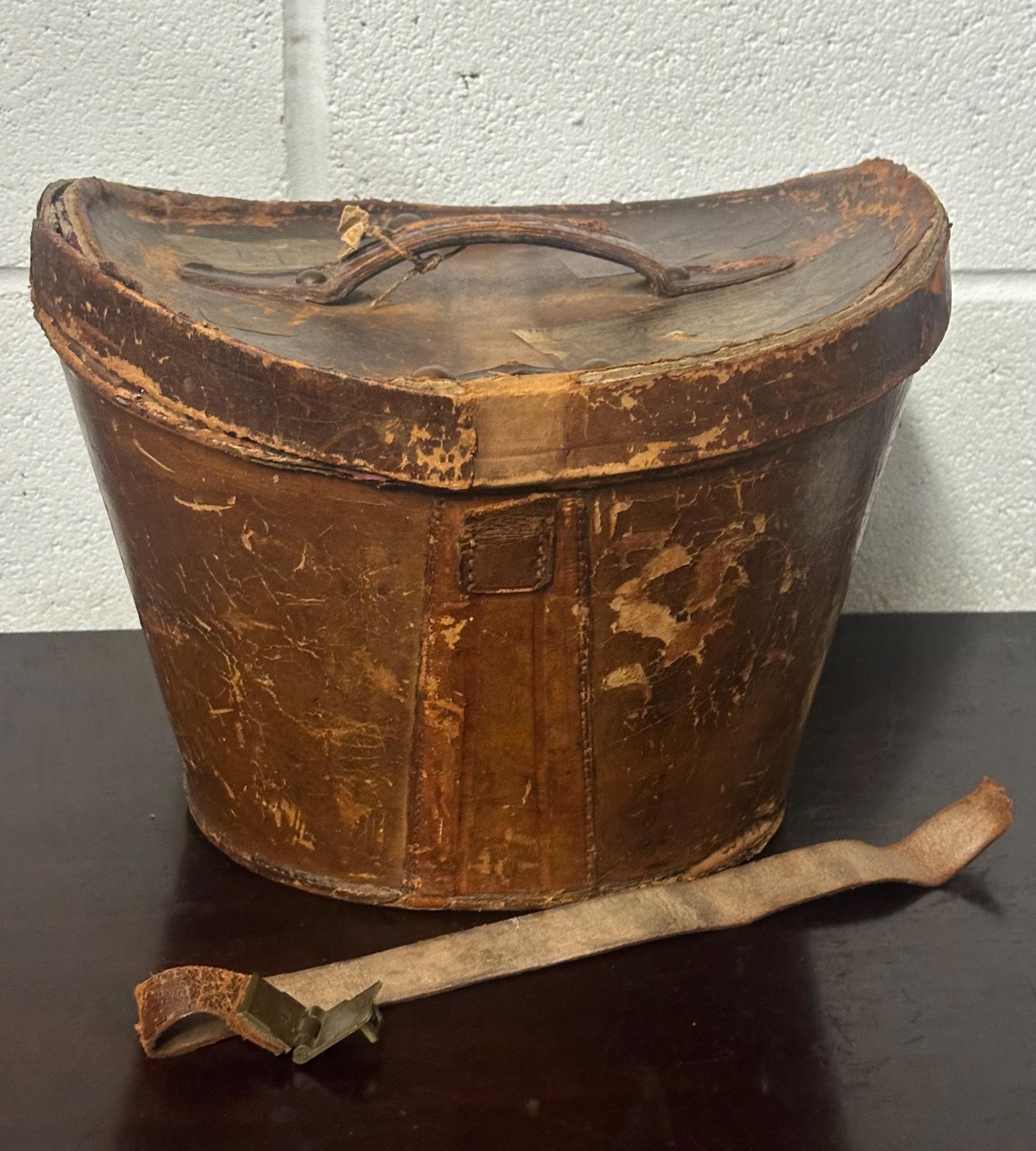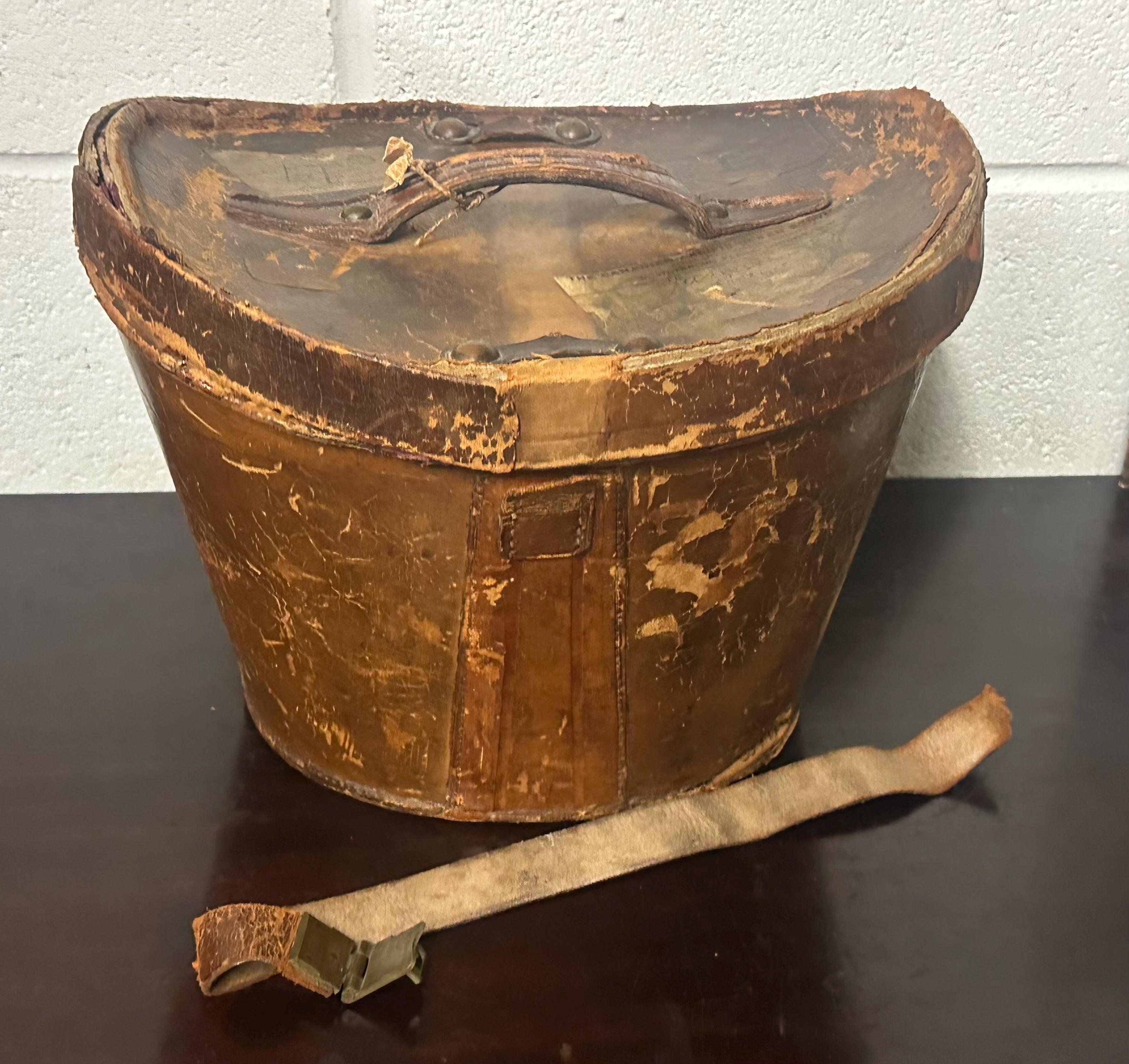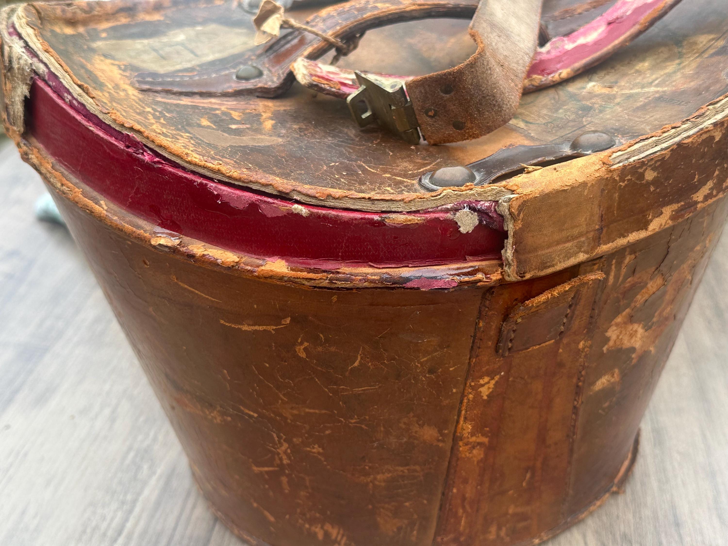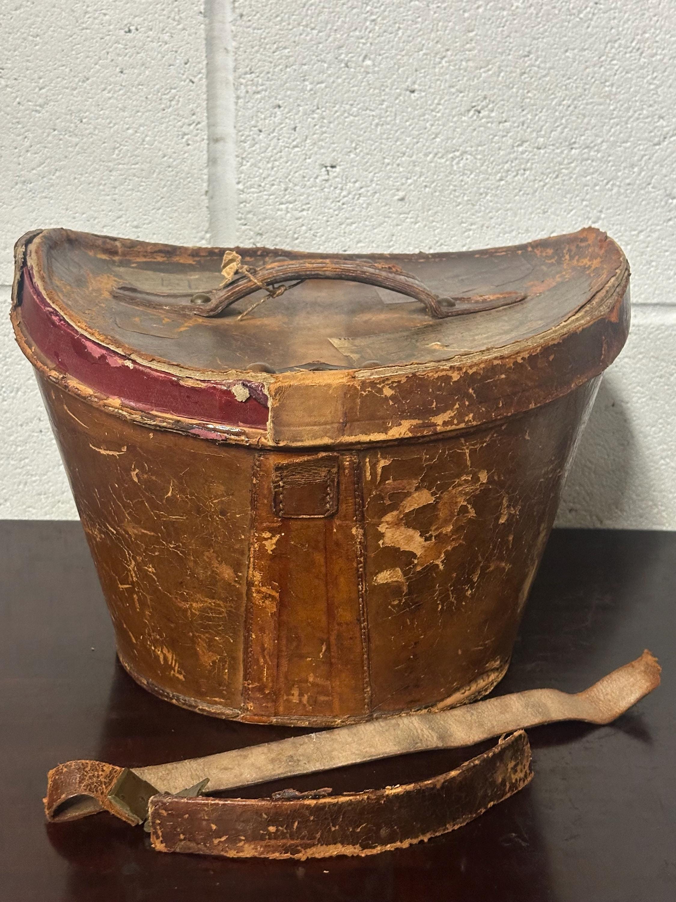 • The hat itself is in good vintage condition, showing light age-related wear inside; the leather case has a well-aged patina and some surface cracking, consistent with its age and travels.