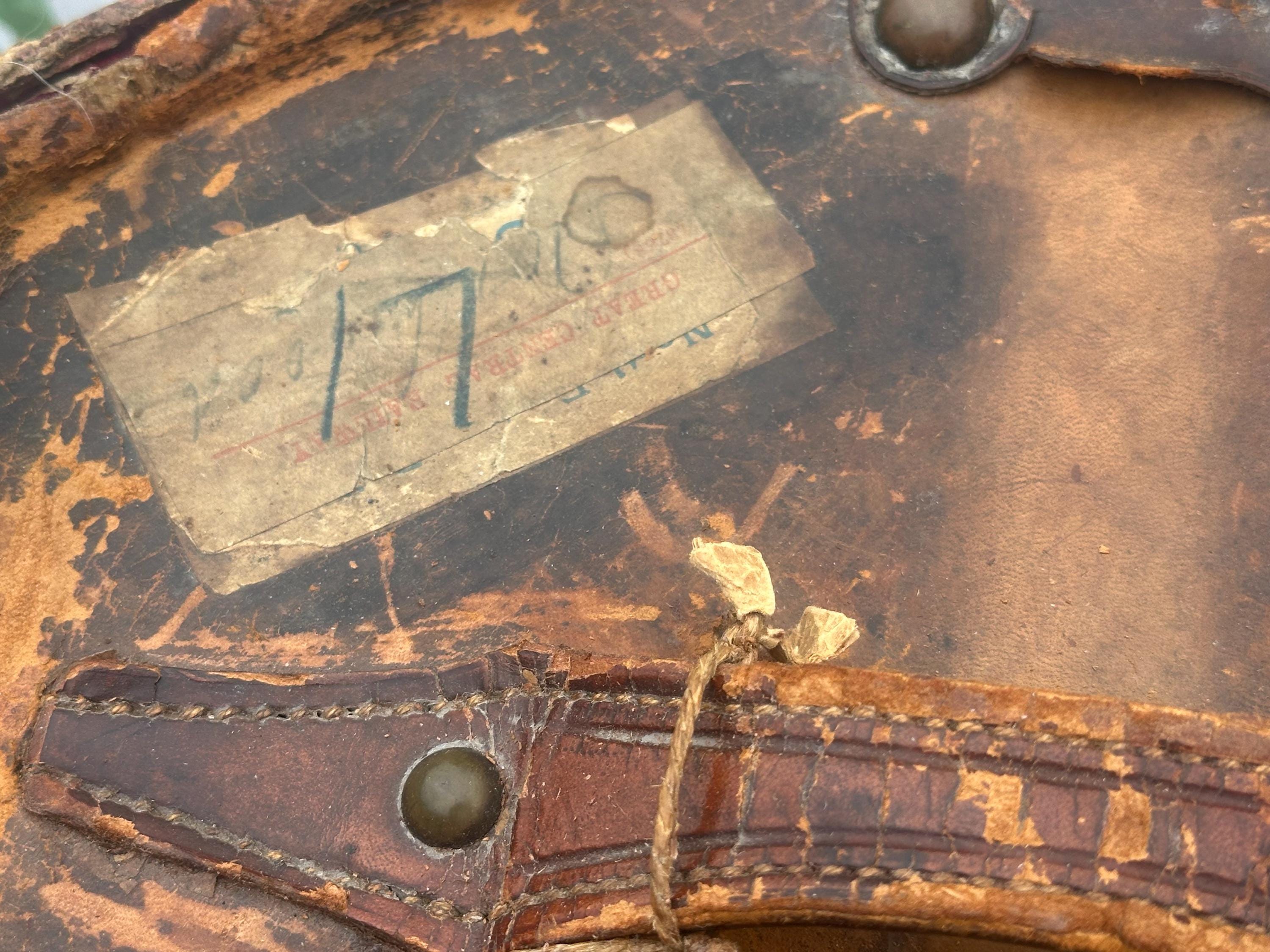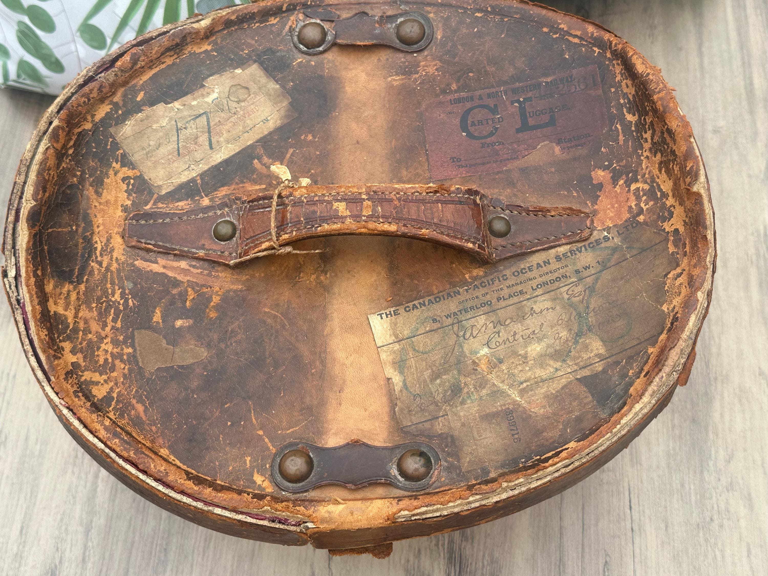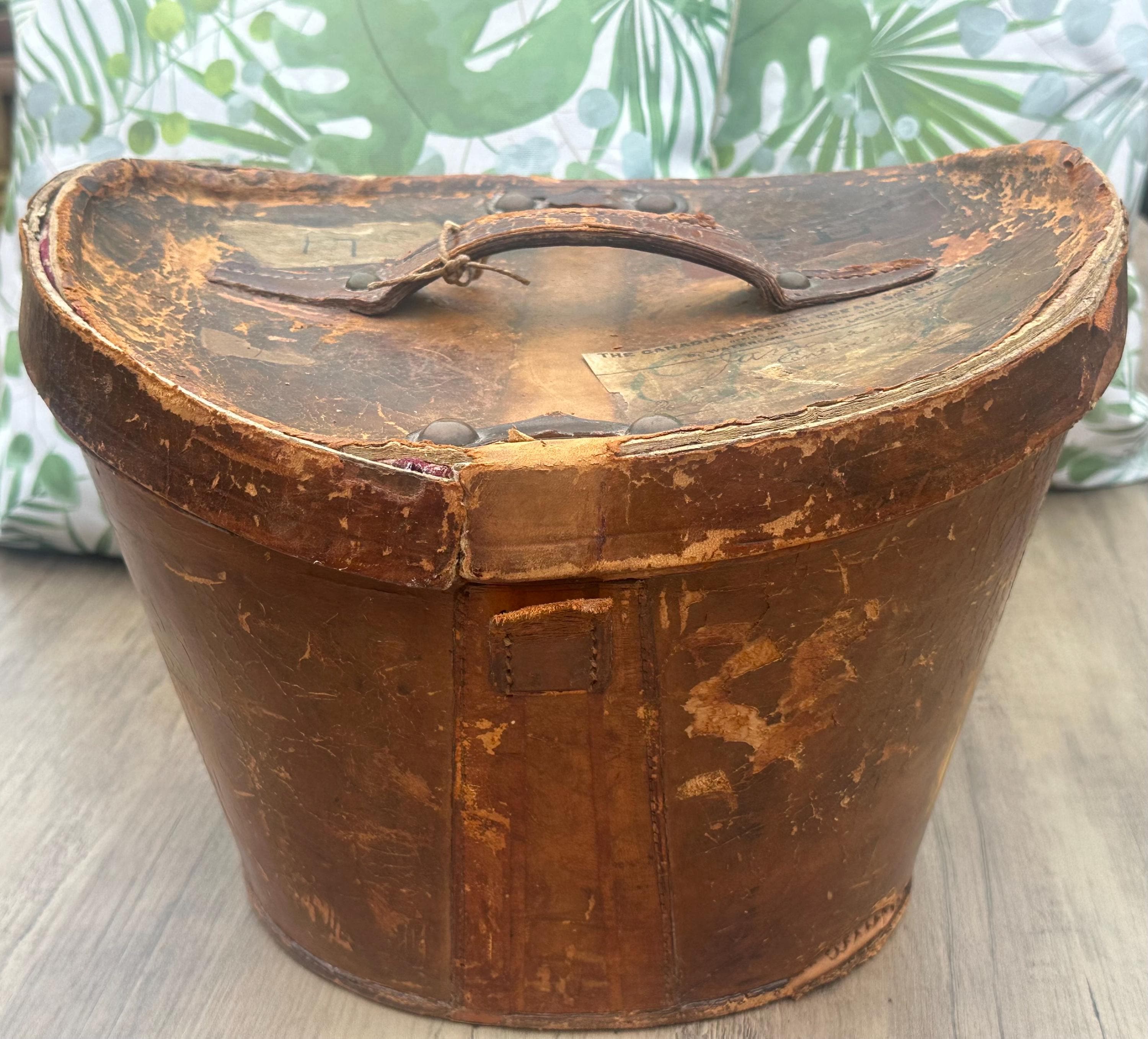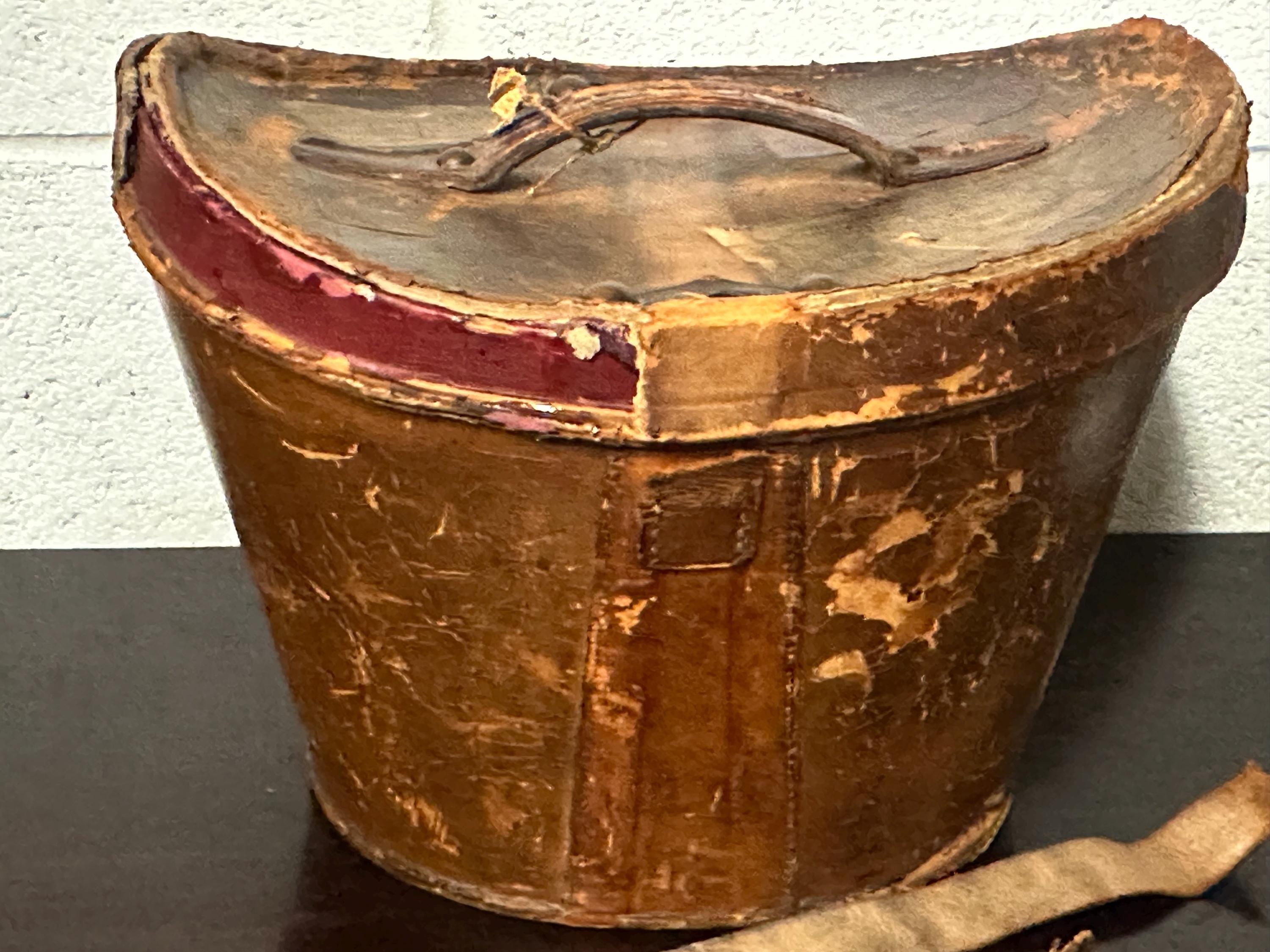 • The hat itself is in good vintage condition, showing light age-related wear inside; the leather case has a well-aged patina and some surface cracking, consistent with its age and travels.
