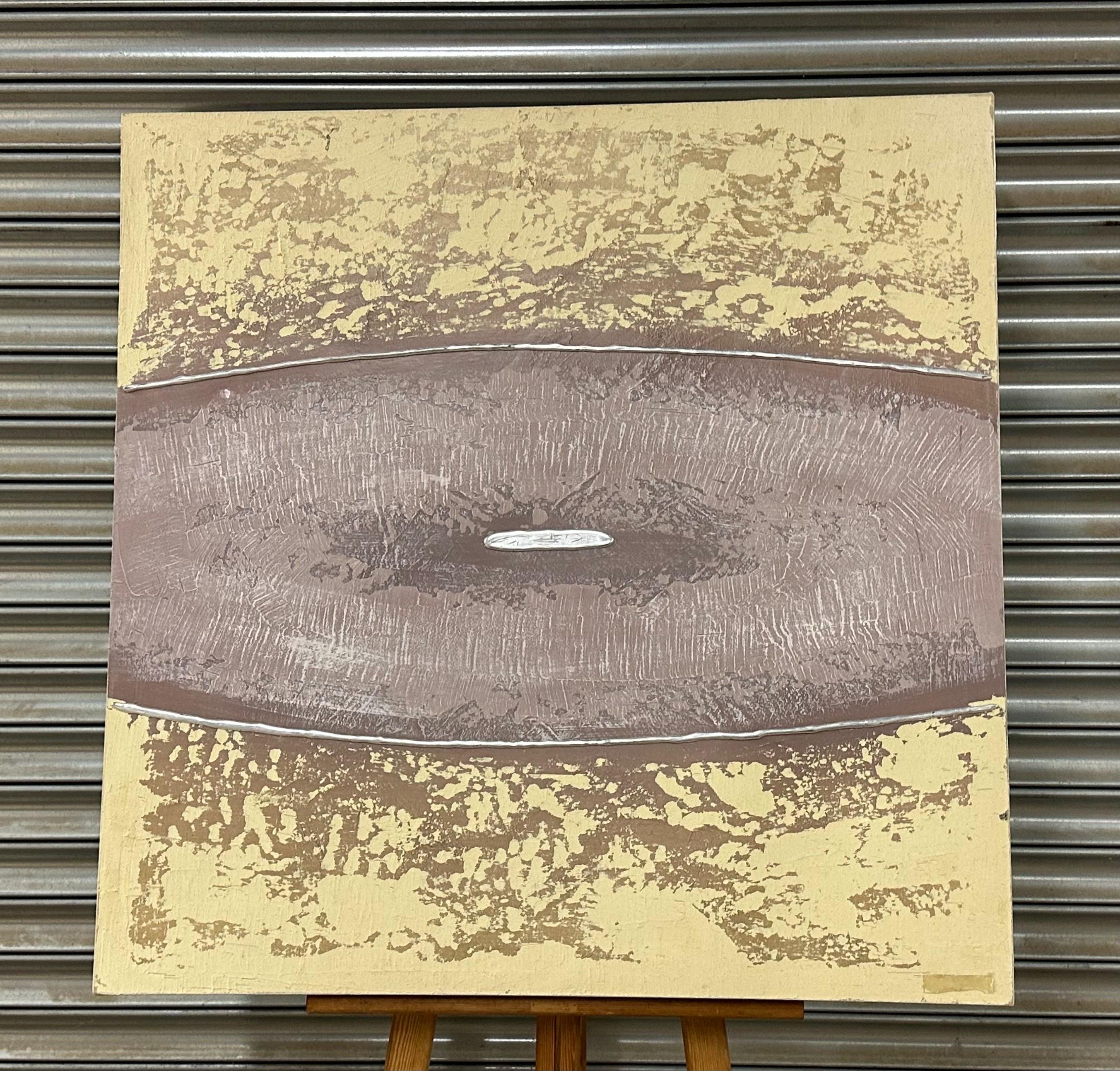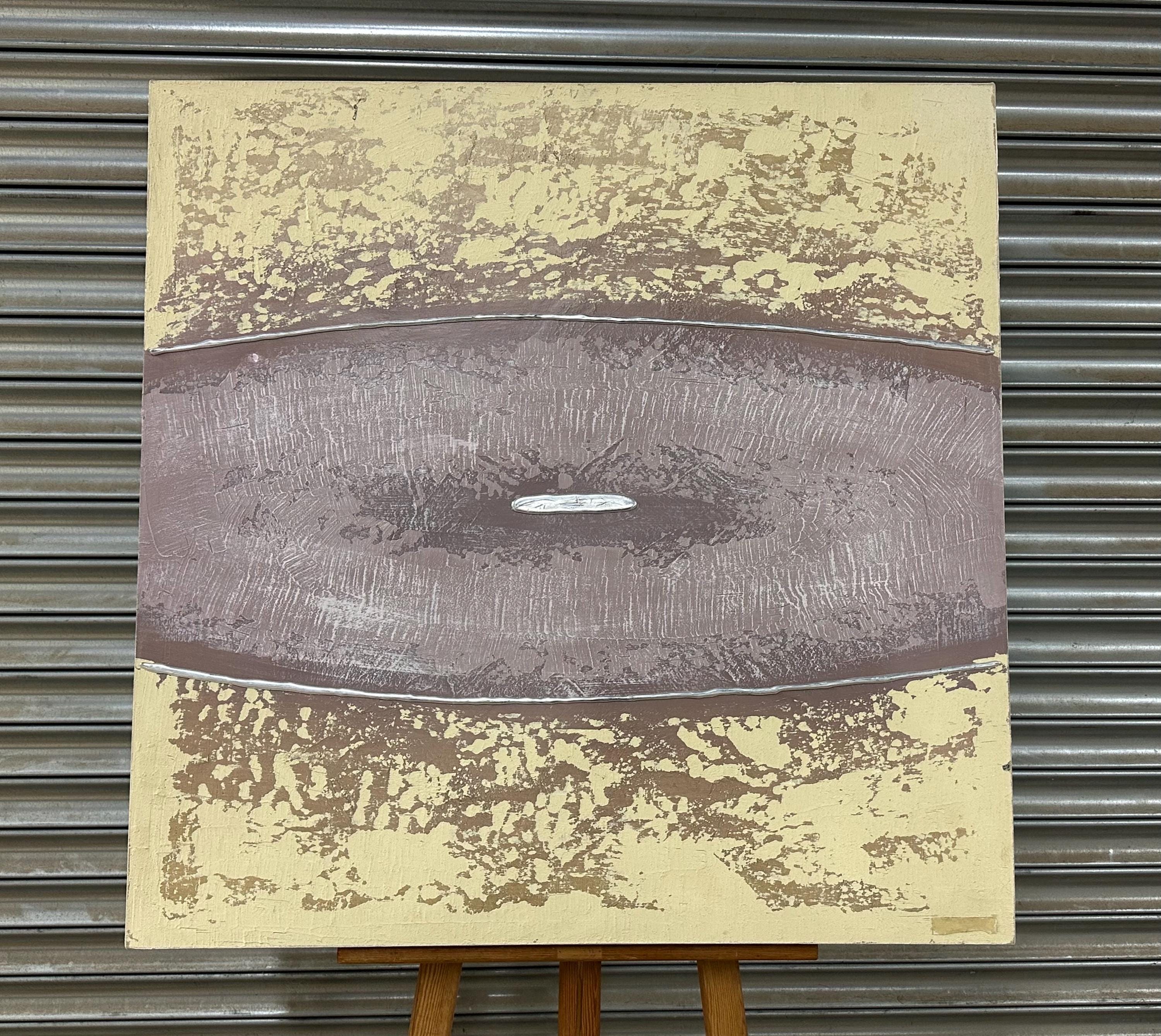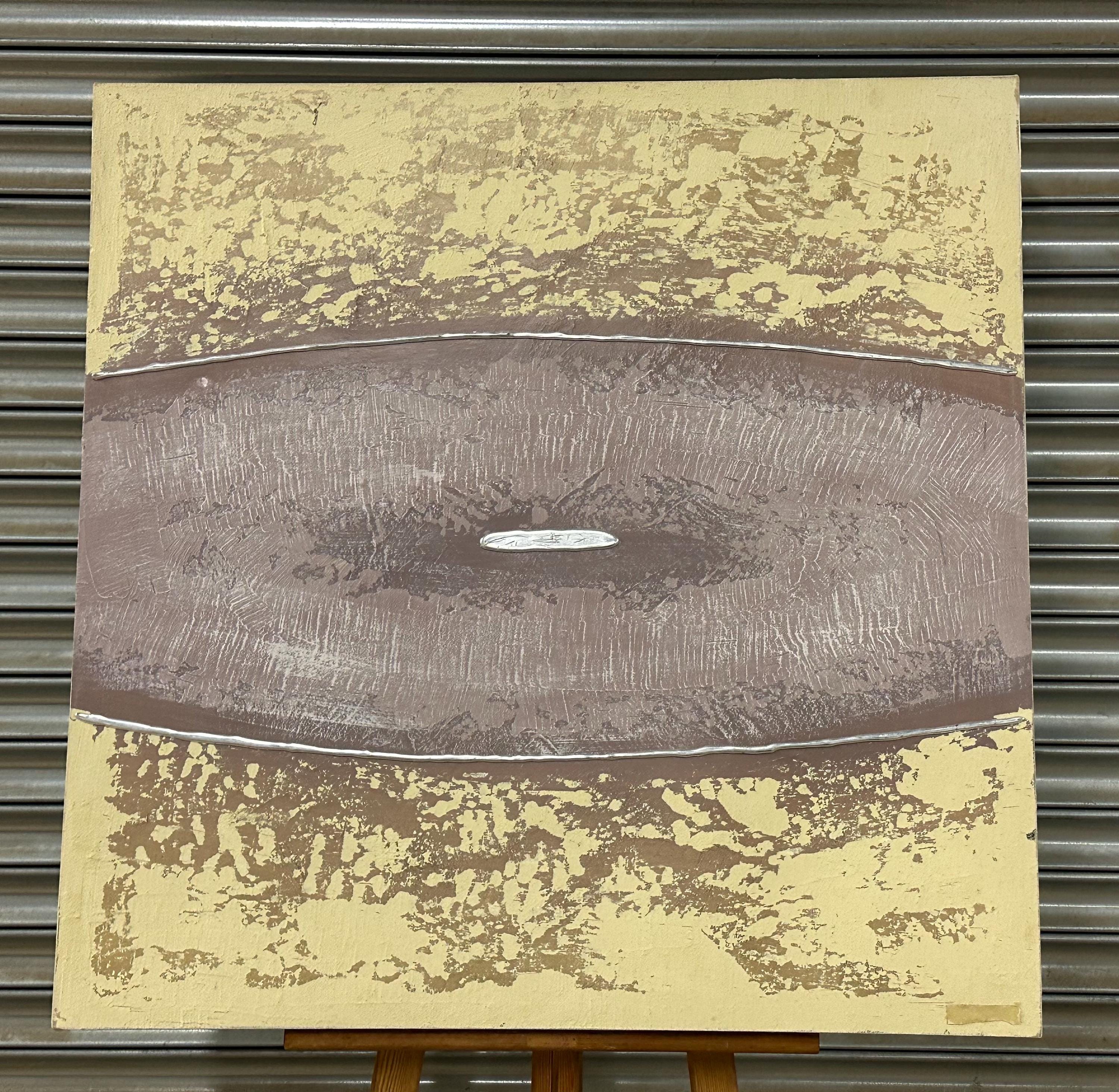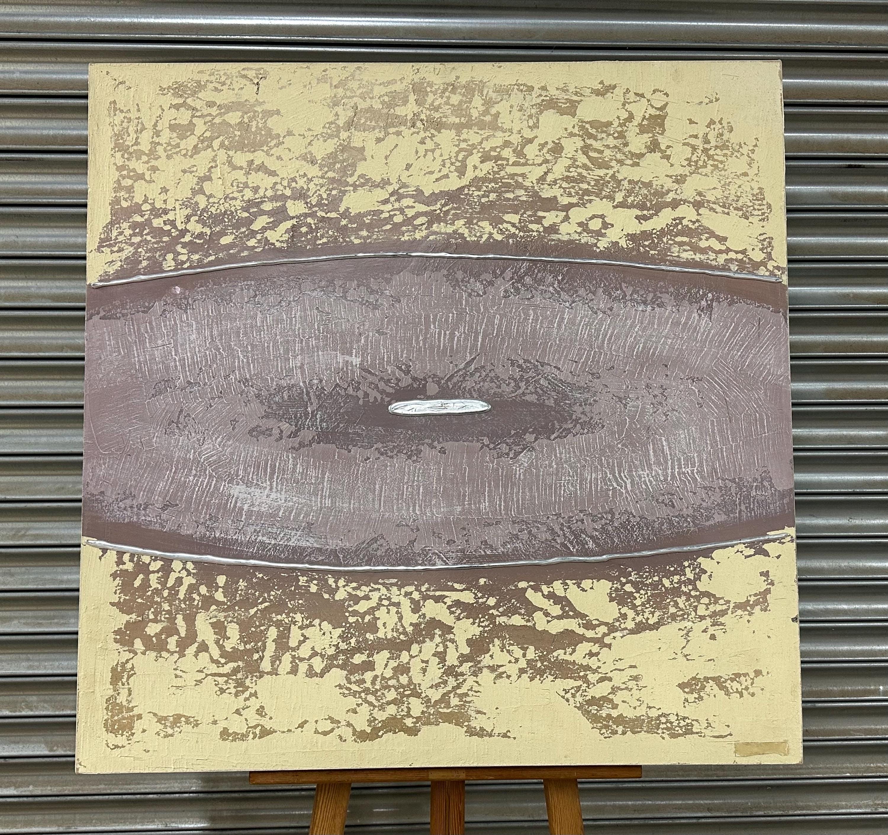 This large oil painting on canvas by Barty Bailey is a striking piece of modern abstract art featuring a serene, earthy colour palette. The composition is formed of horizontal bands in textured layers of taupe, cream, ochre, beige, and muted mauve tones, creating a calm and balanced visual rhythm. The central section, painted in a soft mauve with hints of grey and lilac, draws the viewer’s attention and adds depth and contrast to the otherwise neutral hues.