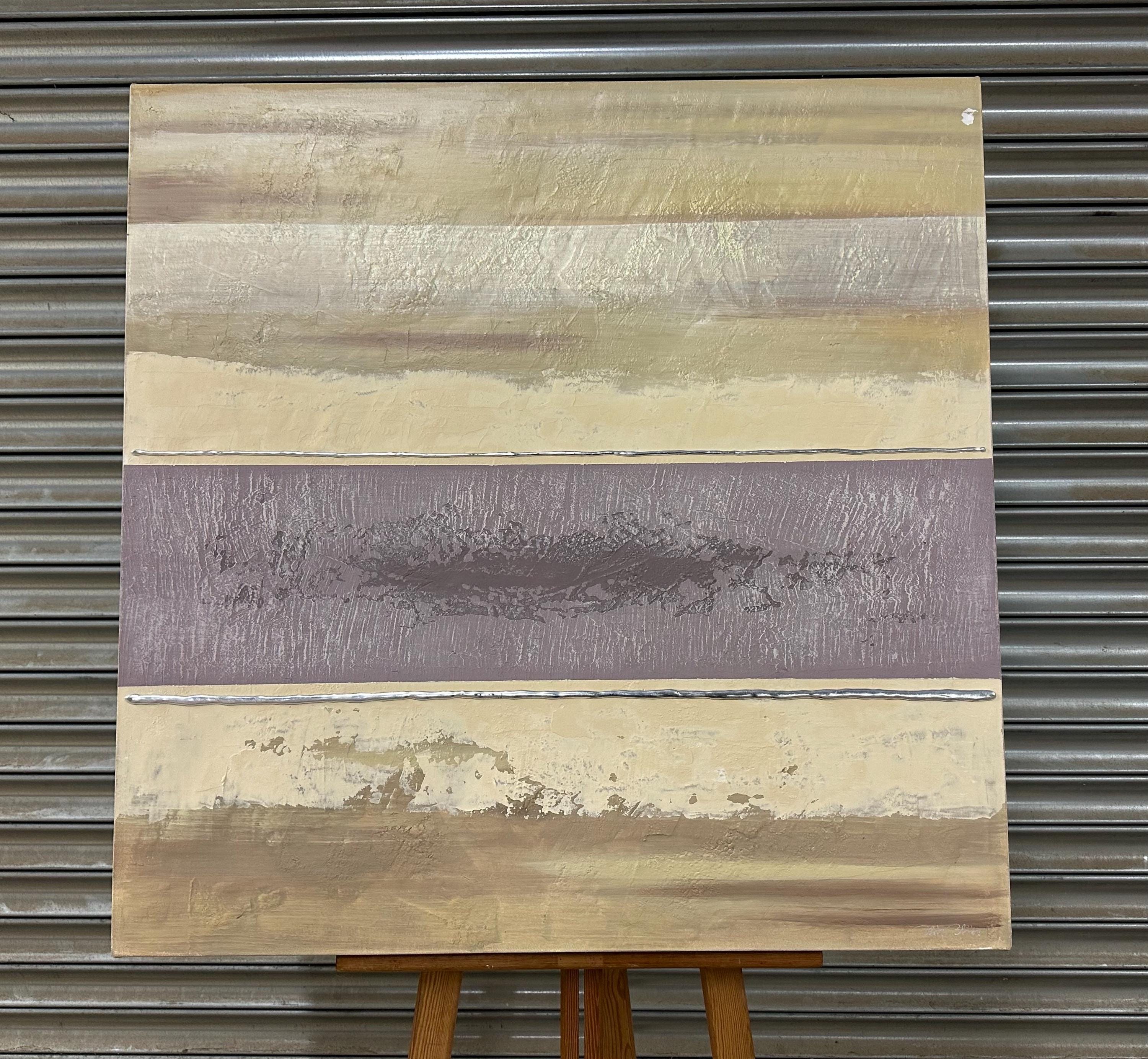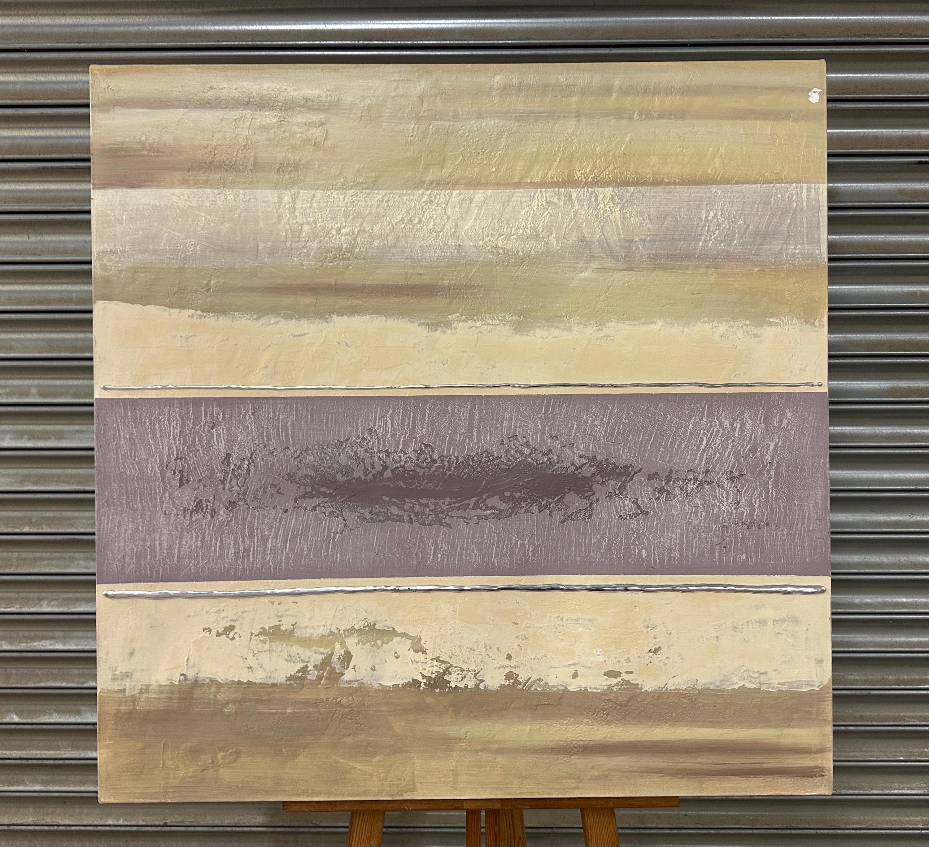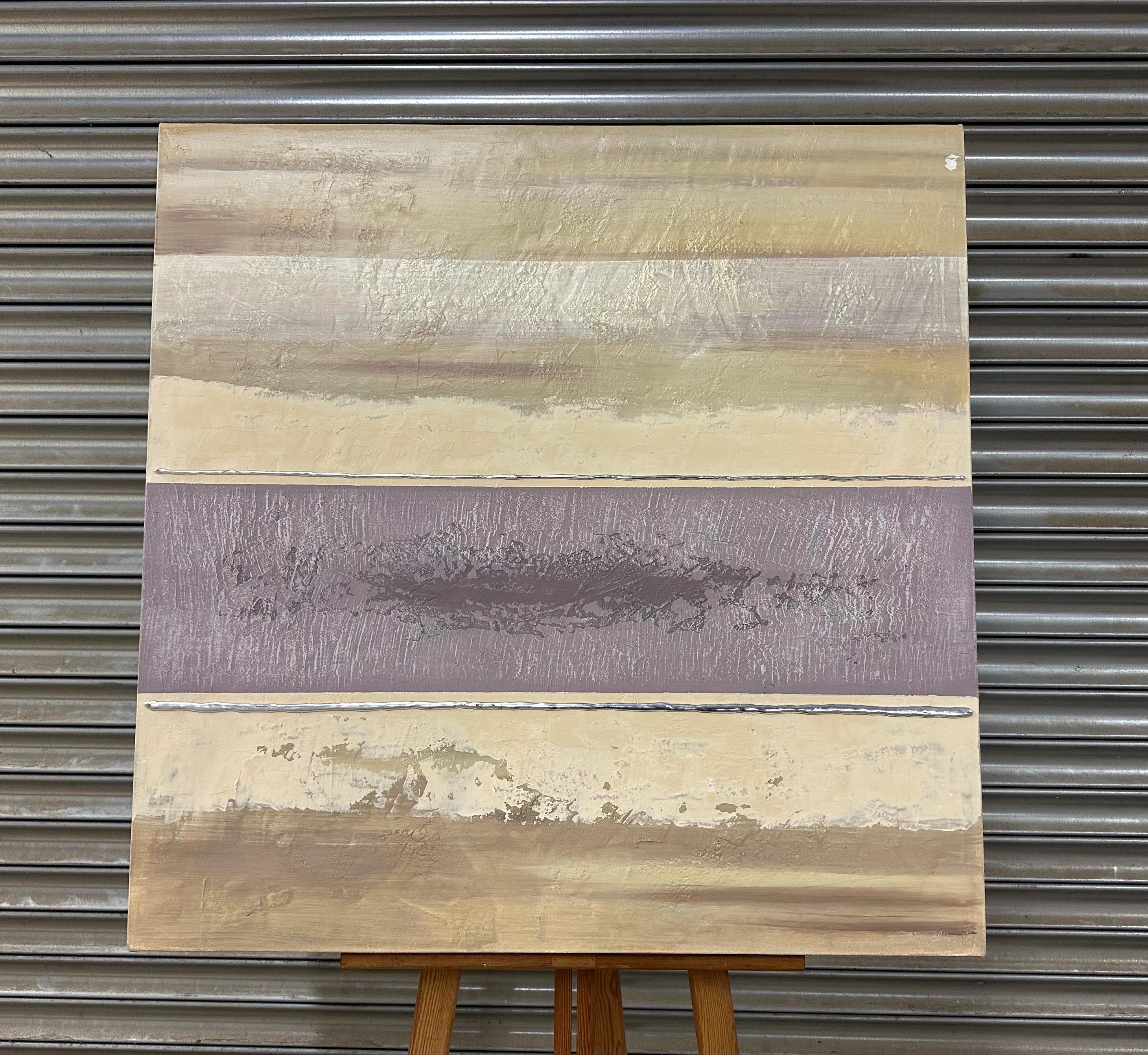 This large oil painting on canvas by Barty Bailey is a striking piece of modern abstract art featuring a serene, earthy colour palette. The composition is formed of horizontal bands in textured layers of taupe, cream, ochre, beige, and muted mauve tones, creating a calm and balanced visual rhythm. The central section, painted in a soft mauve with hints of grey and lilac, draws the viewer’s attention and adds depth and contrast to the otherwise neutral hues.