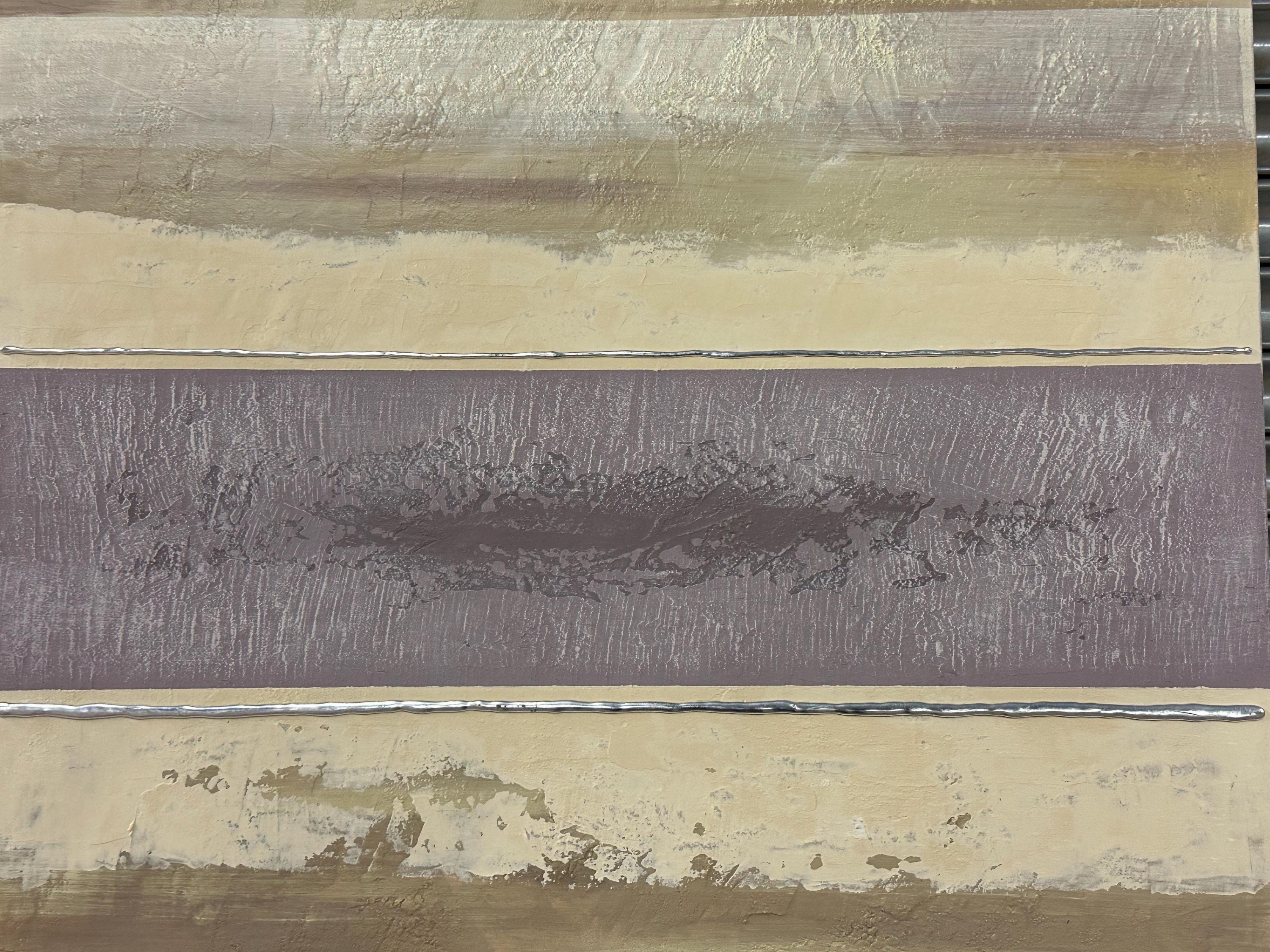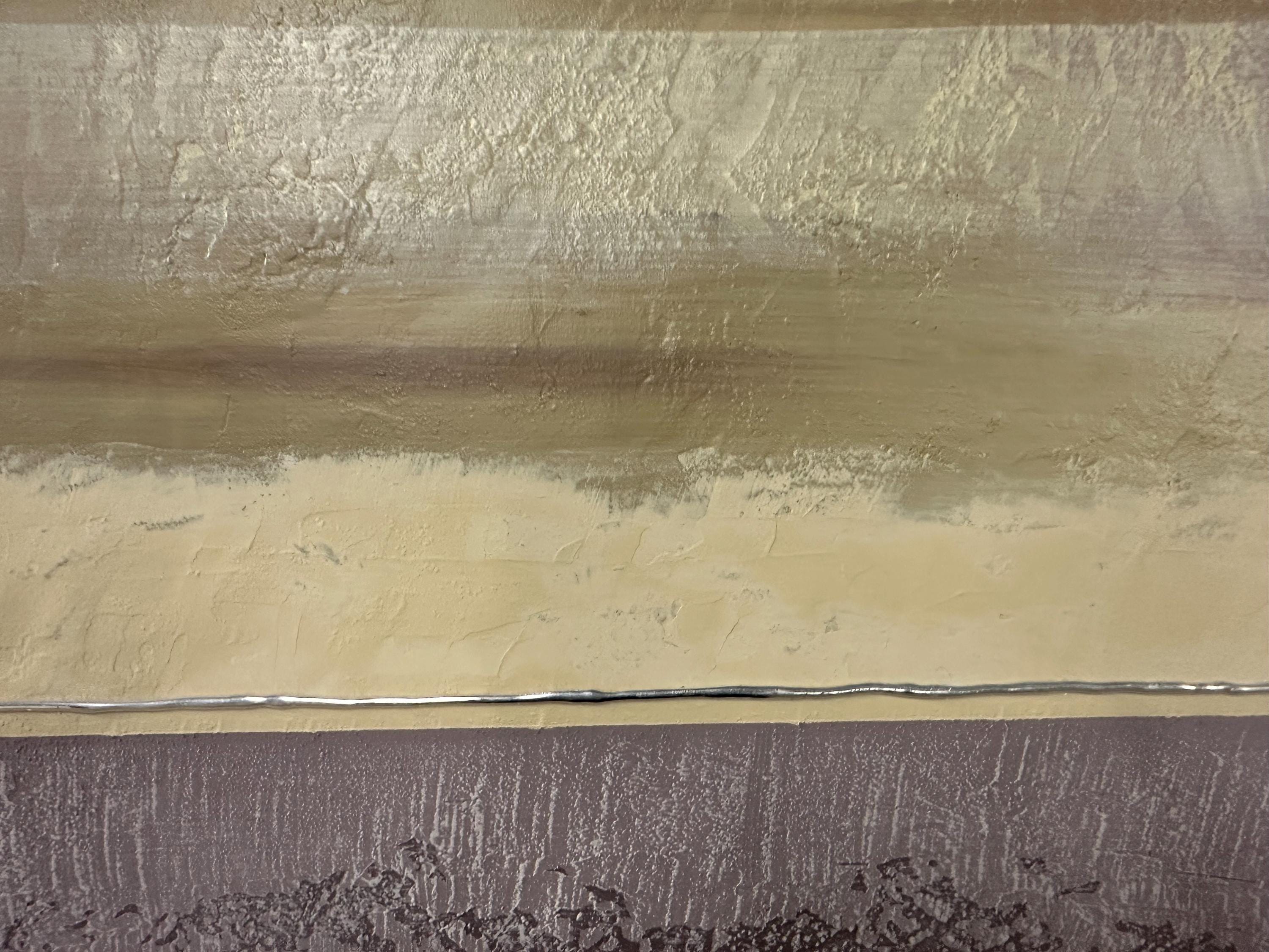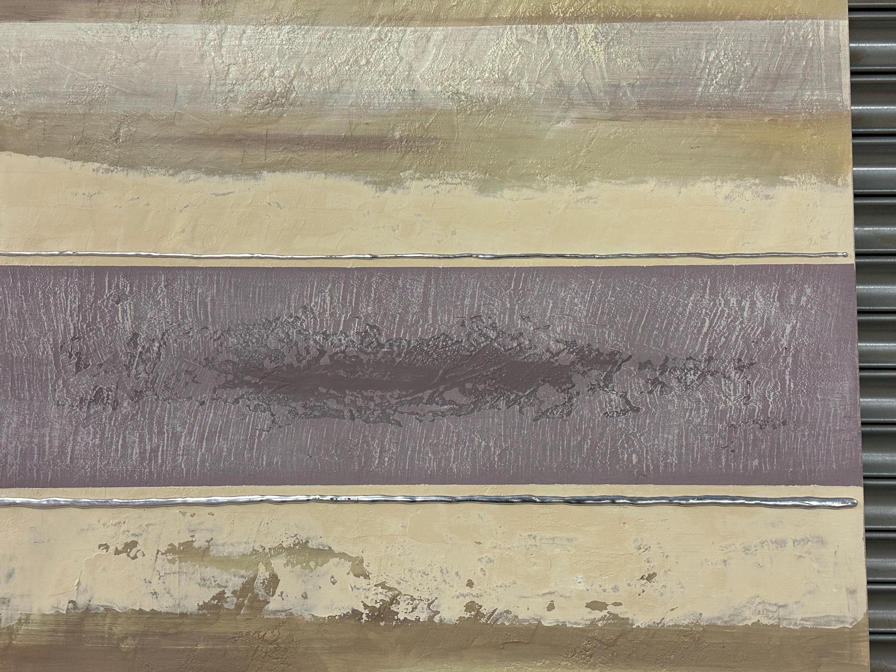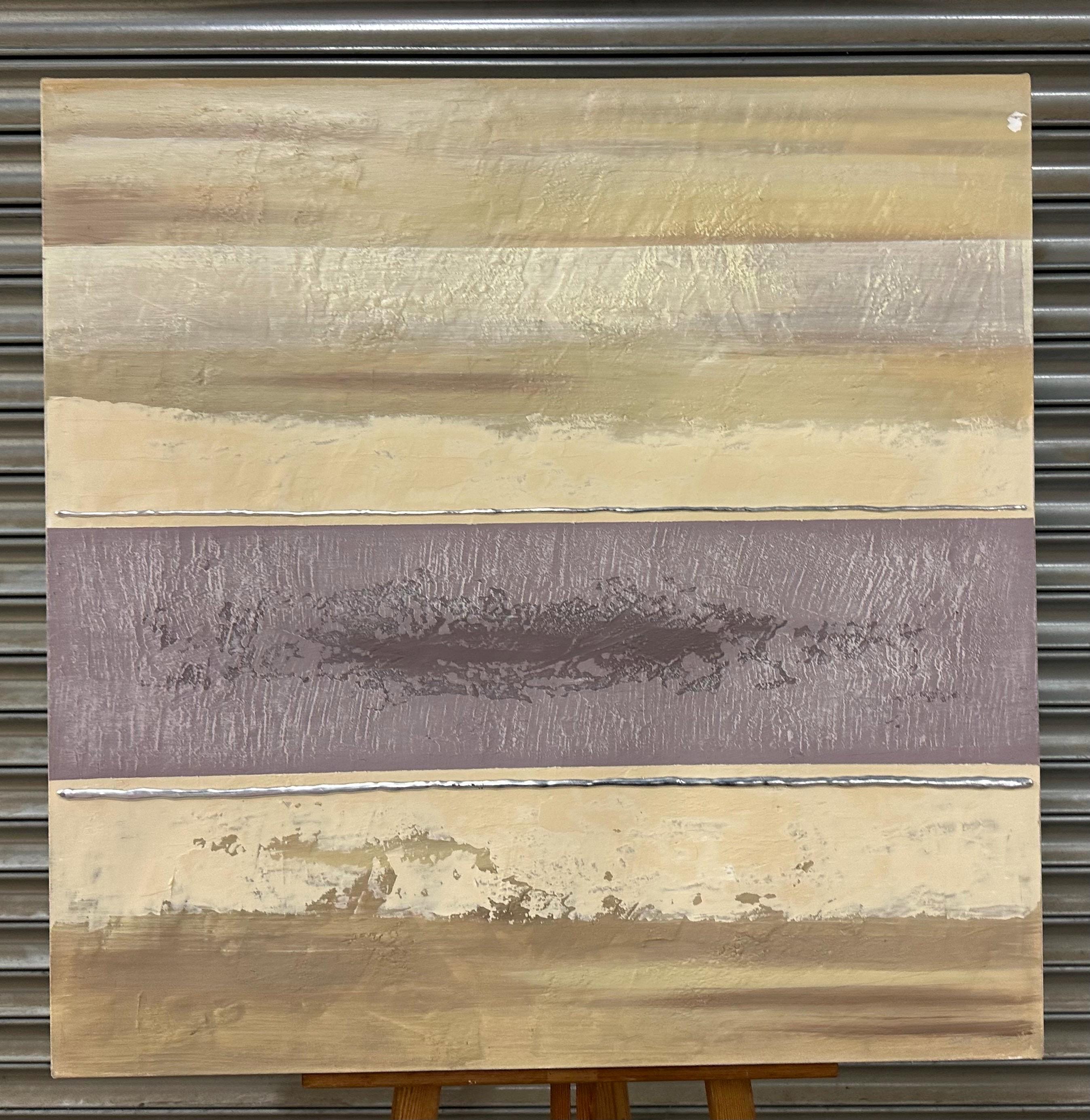 This large oil painting on canvas by Barty Bailey is a striking piece of modern abstract art featuring a serene, earthy colour palette. The composition is formed of horizontal bands in textured layers of taupe, cream, ochre, beige, and muted mauve tones, creating a calm and balanced visual rhythm. The central section, painted in a soft mauve with hints of grey and lilac, draws the viewer’s attention and adds depth and contrast to the otherwise neutral hues.