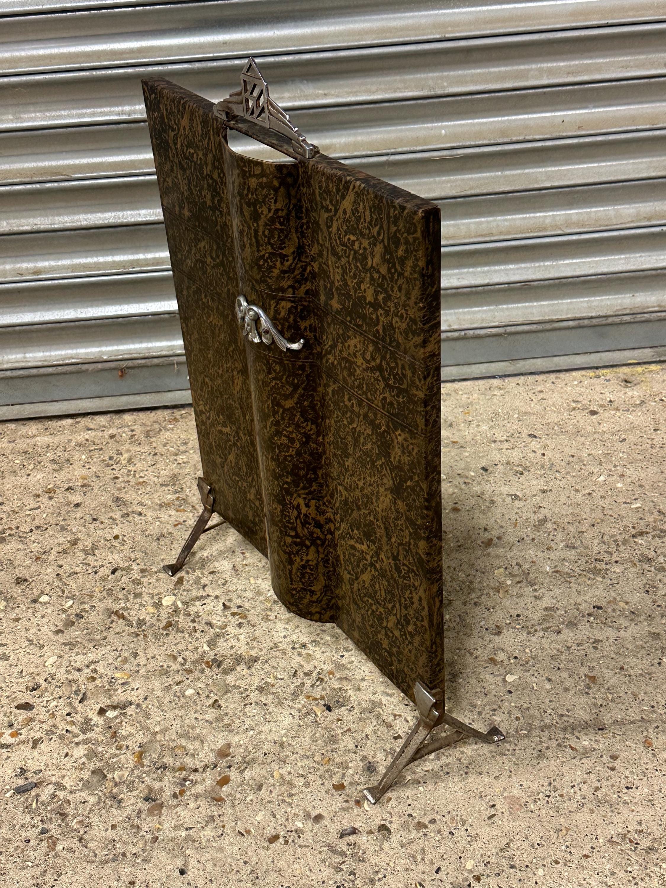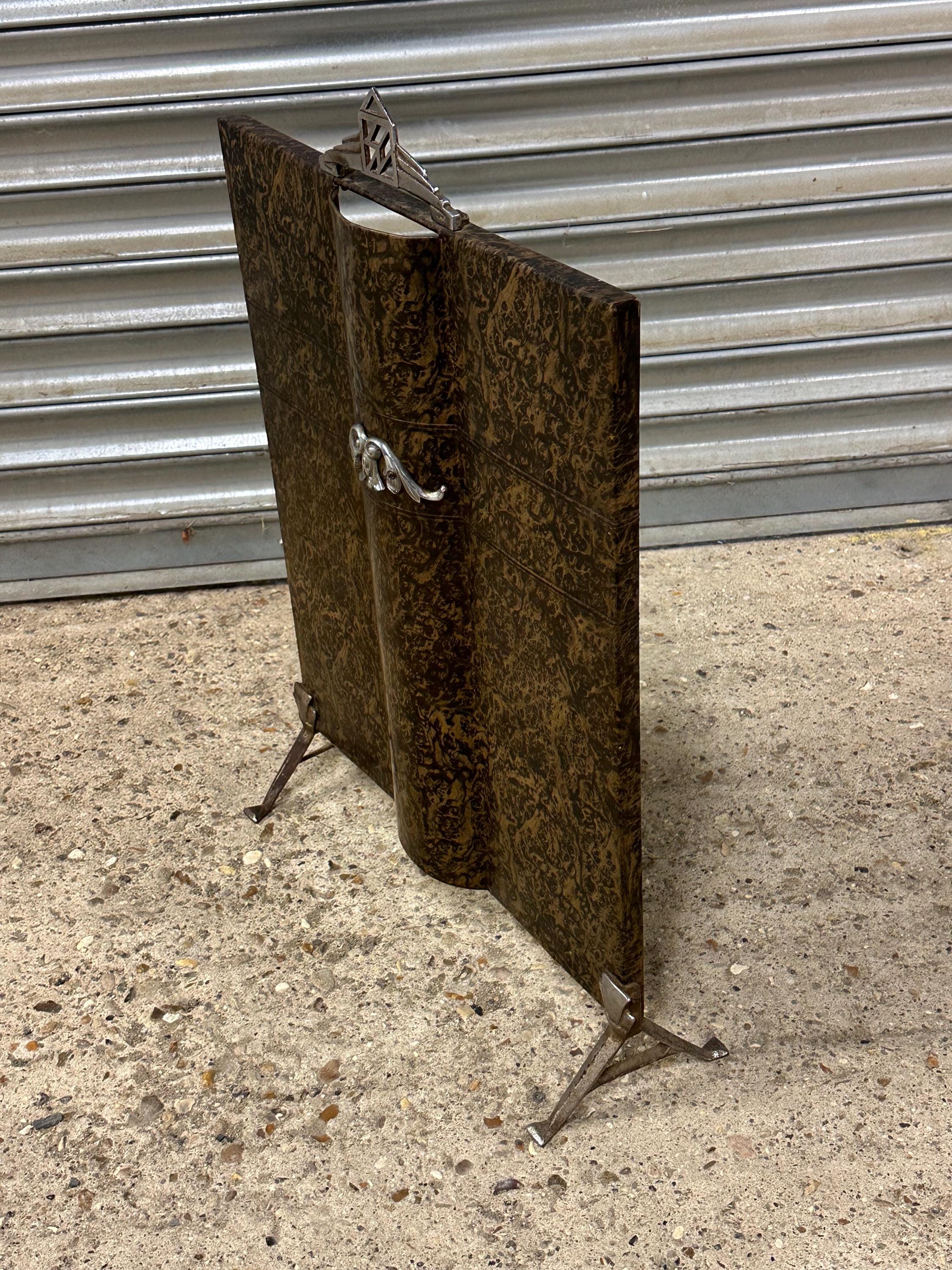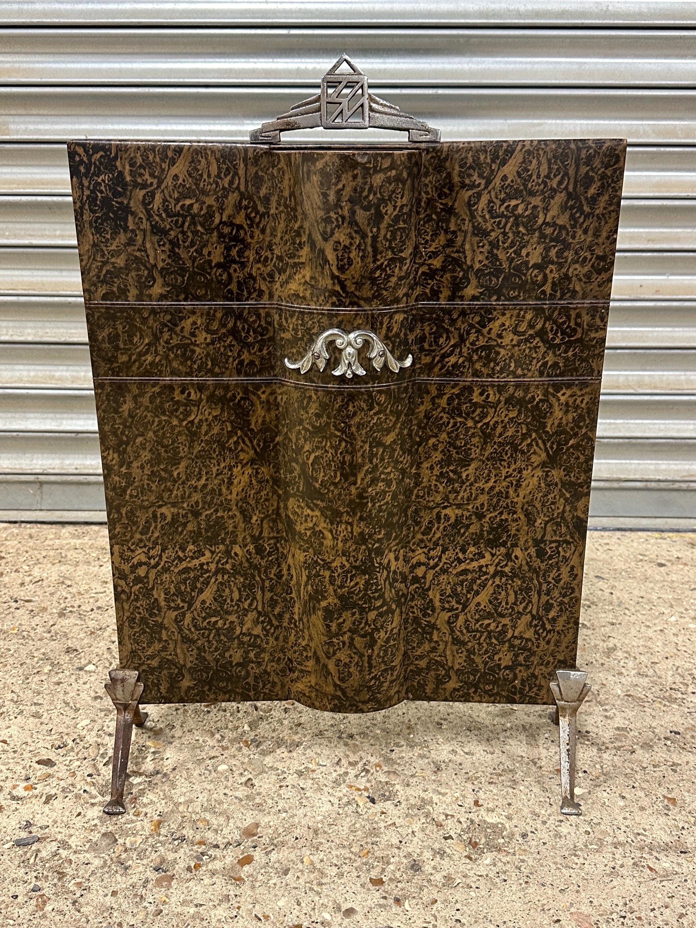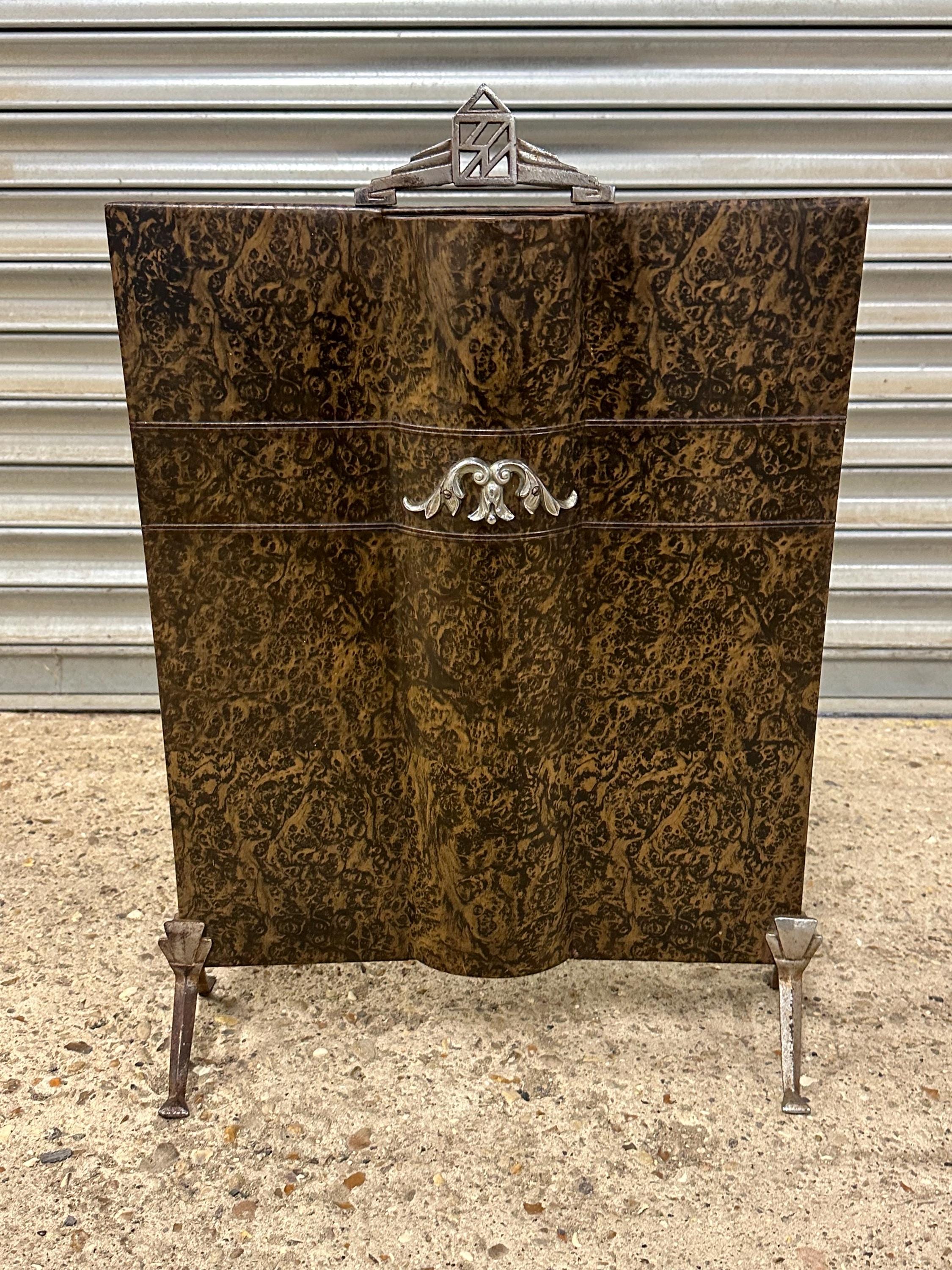 A striking vintage fireguard featuring a richly patterned burl-effect panel with beautiful swirling grain and depth of tone. The elegant design is complemented by classic Art Deco chrome details, including a geometric handle and decorative central motif.