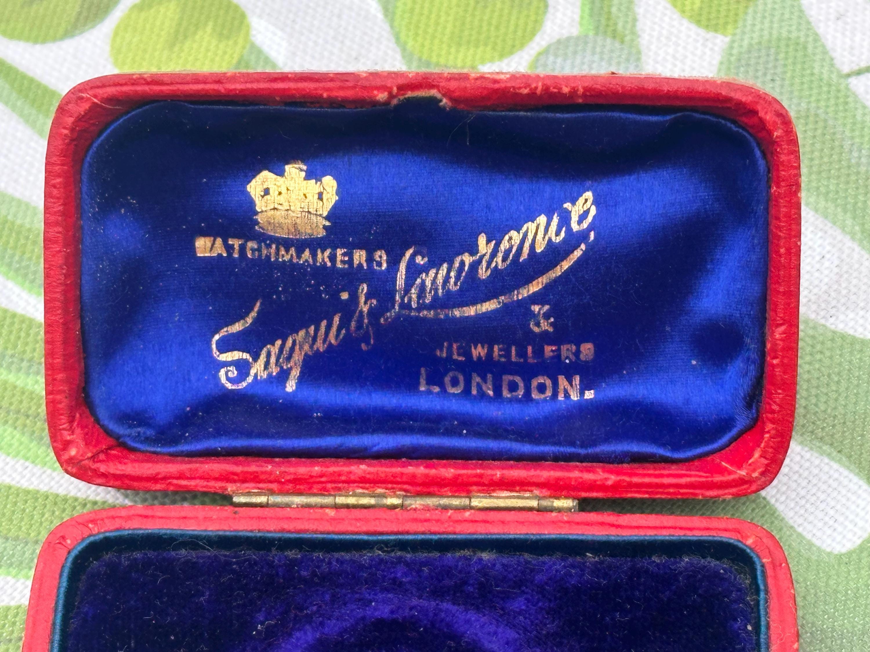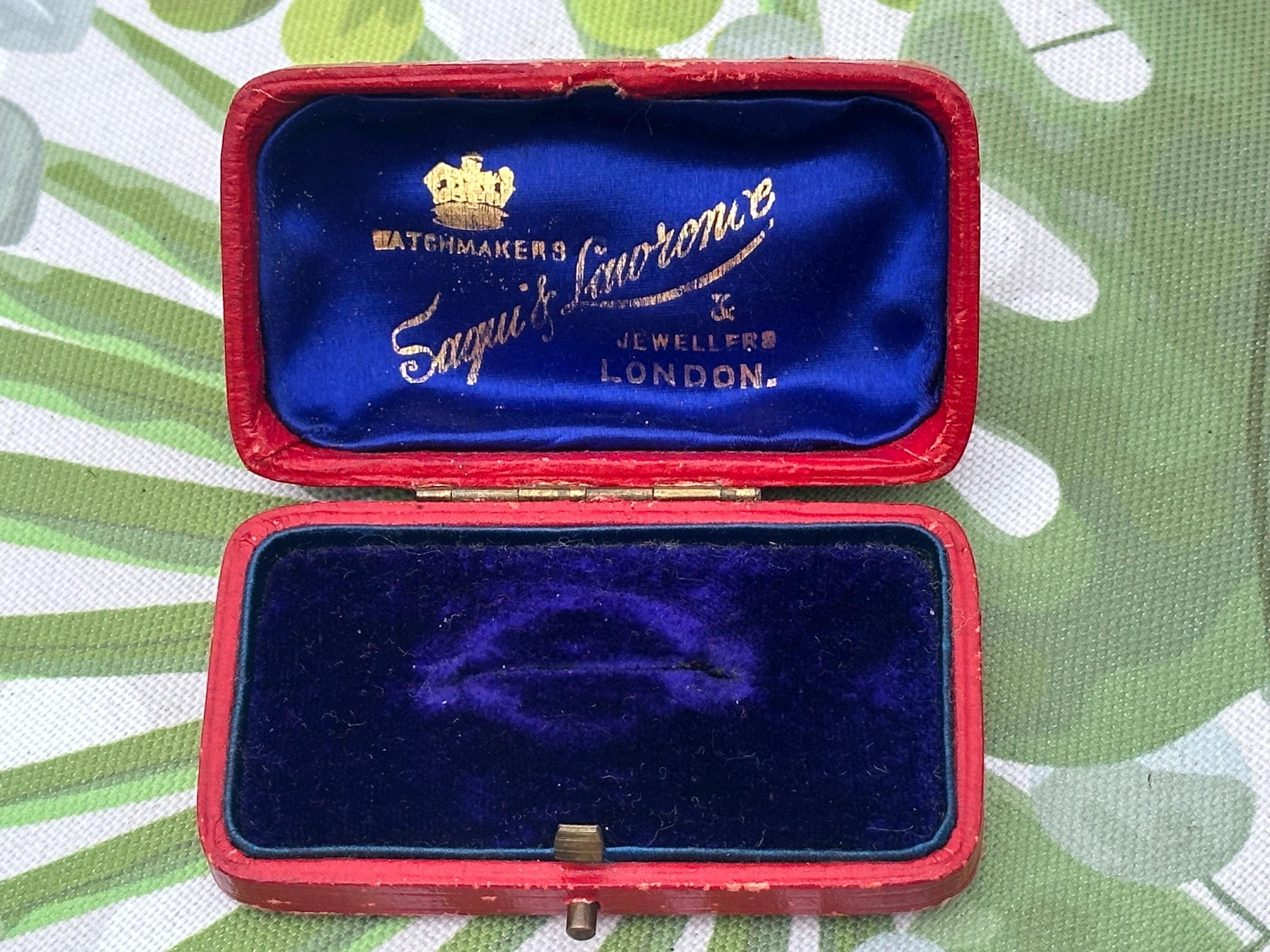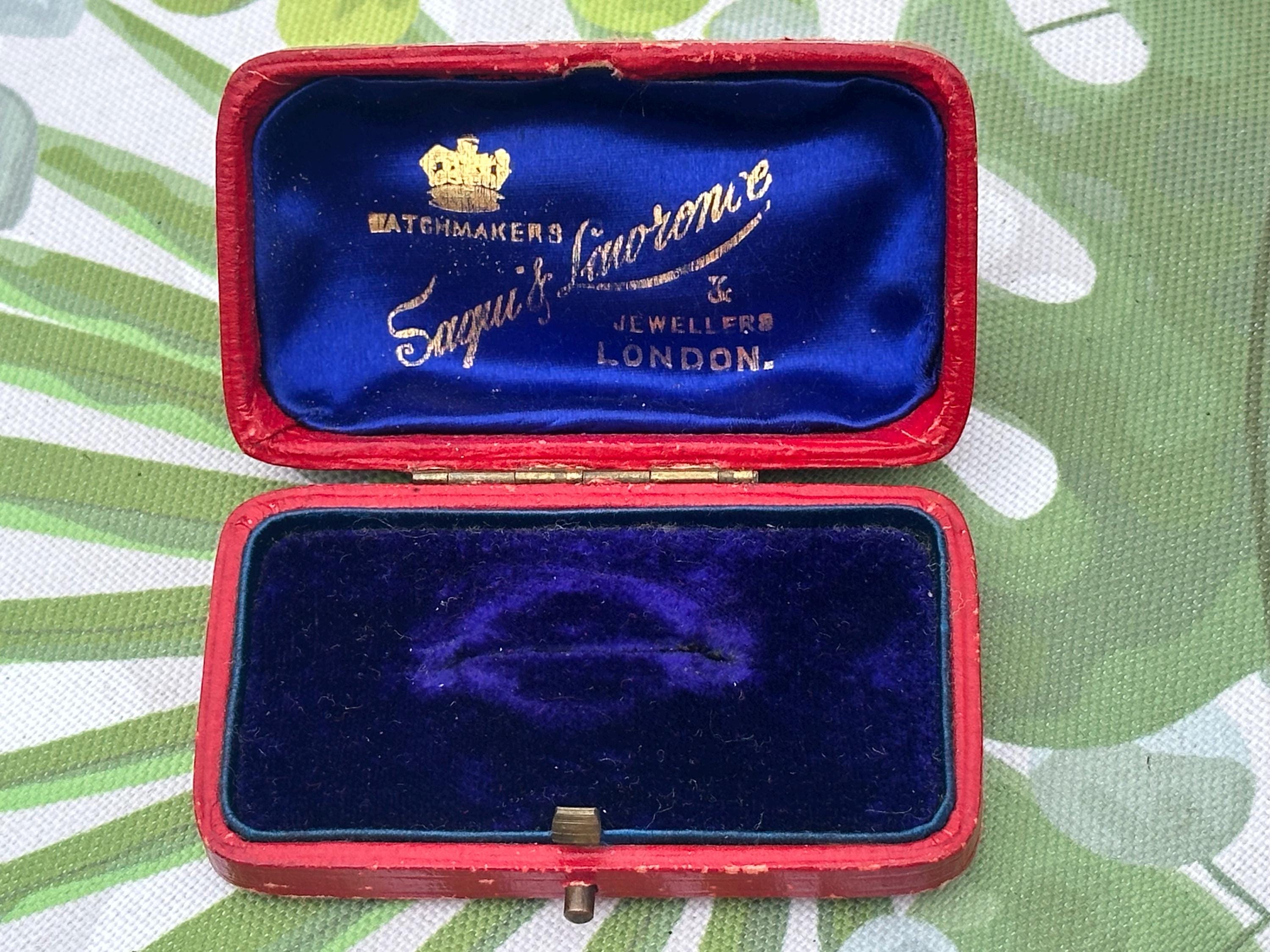 A charming antique presentation box from Saqui & Lawrence, Watchmakers & Jewellers, London. This elegant small case is finished in red leather with a brass clasp, lined with rich royal blue silk and velvet interiors featuring the maker’s gilt logo and crown emblem.
