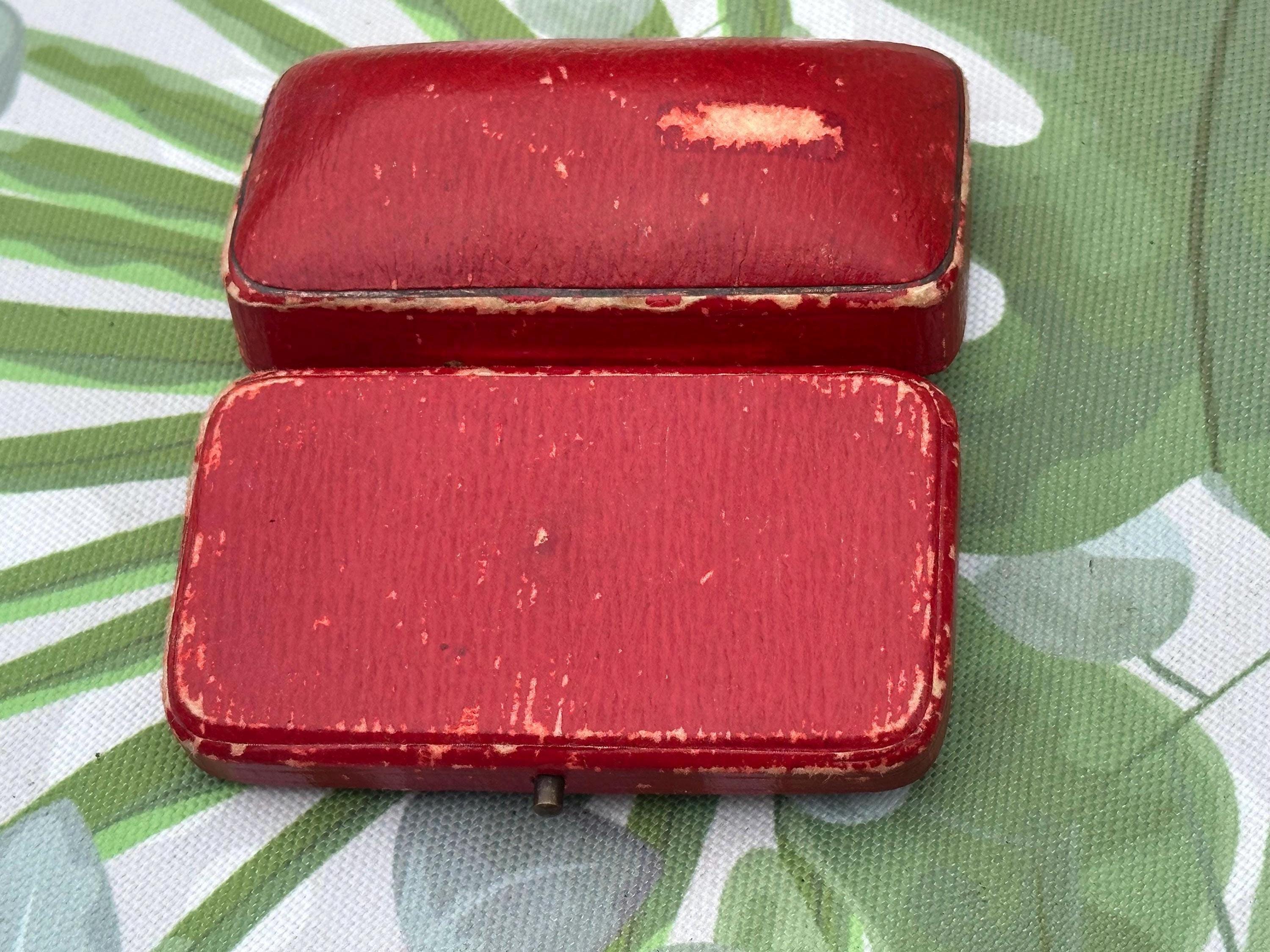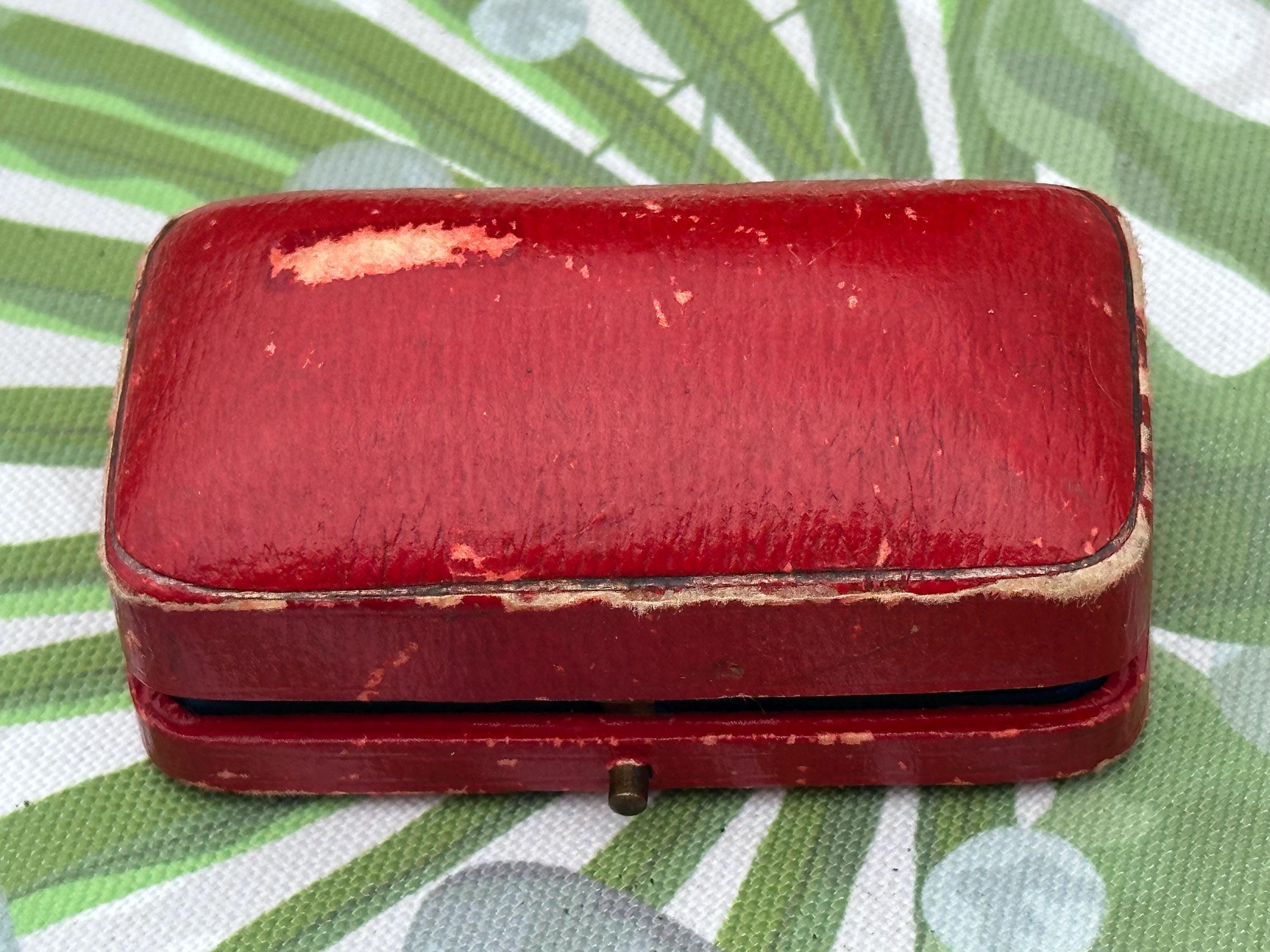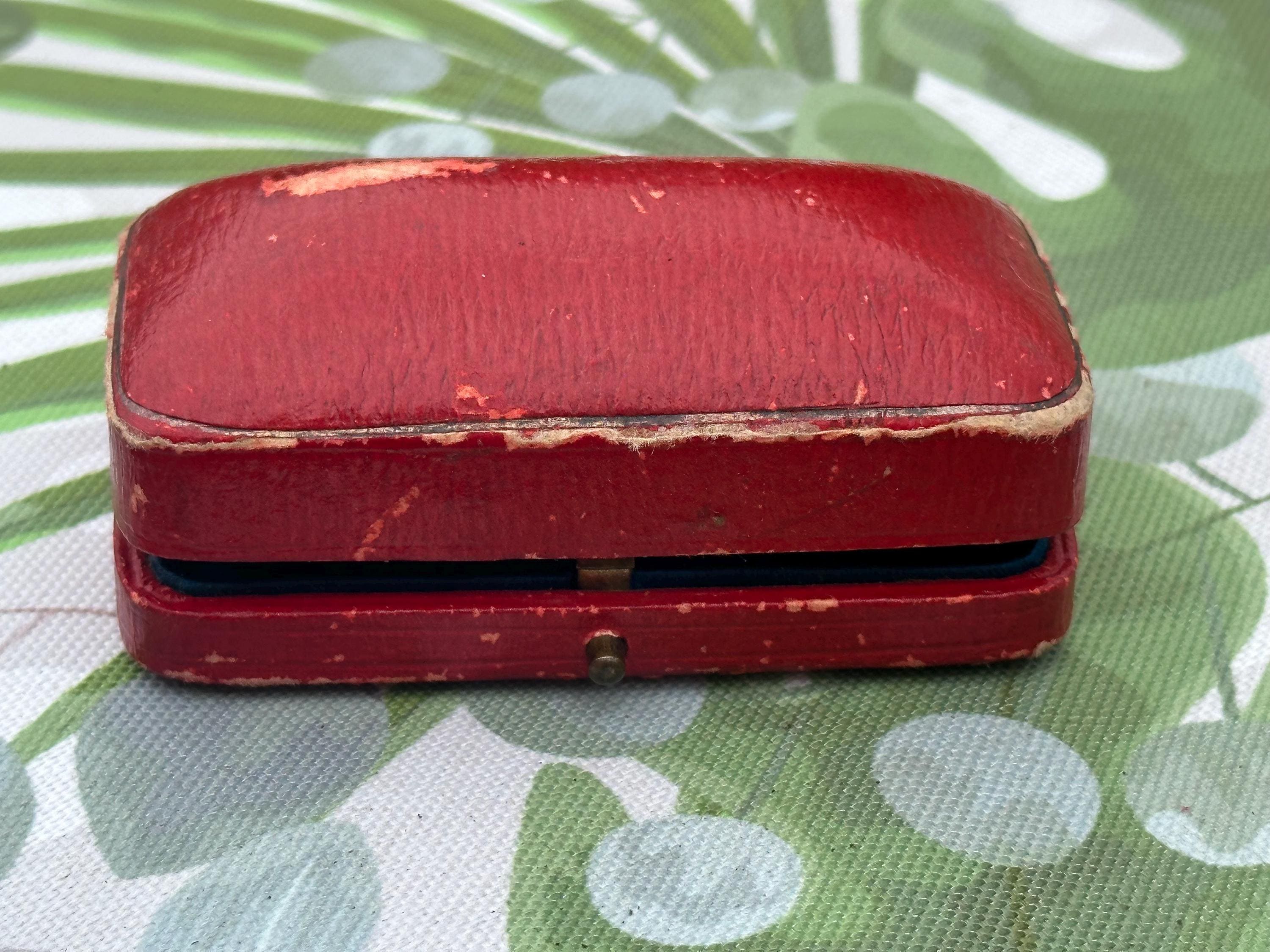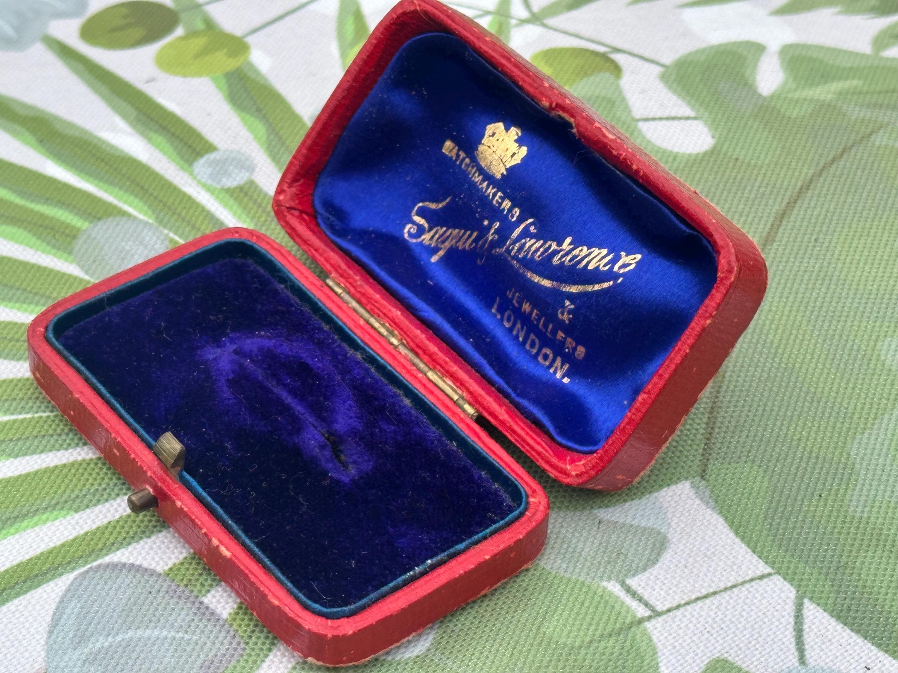 A charming antique presentation box from Saqui & Lawrence, Watchmakers & Jewellers, London. This elegant small case is finished in red leather with a brass clasp, lined with rich royal blue silk and velvet interiors featuring the maker’s gilt logo and crown emblem.