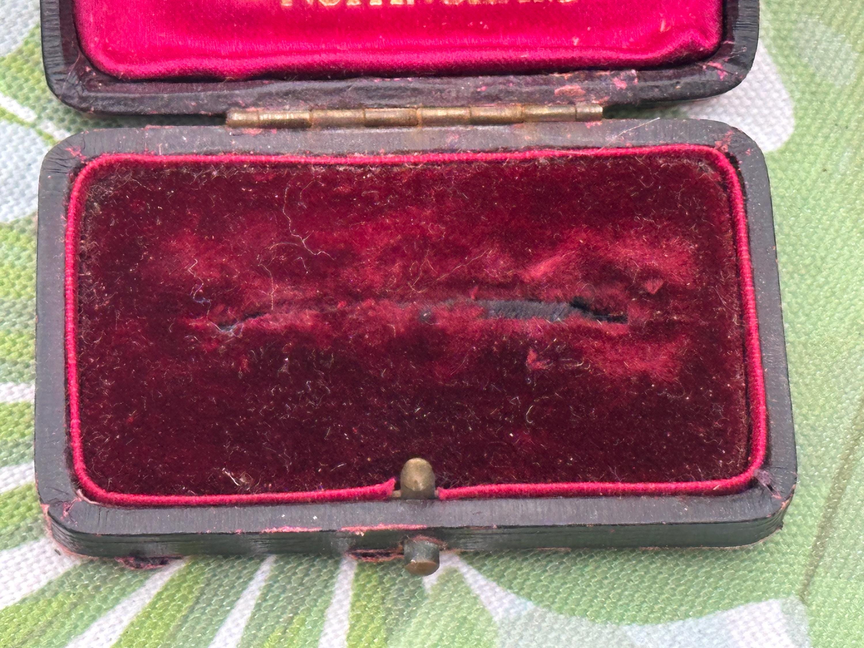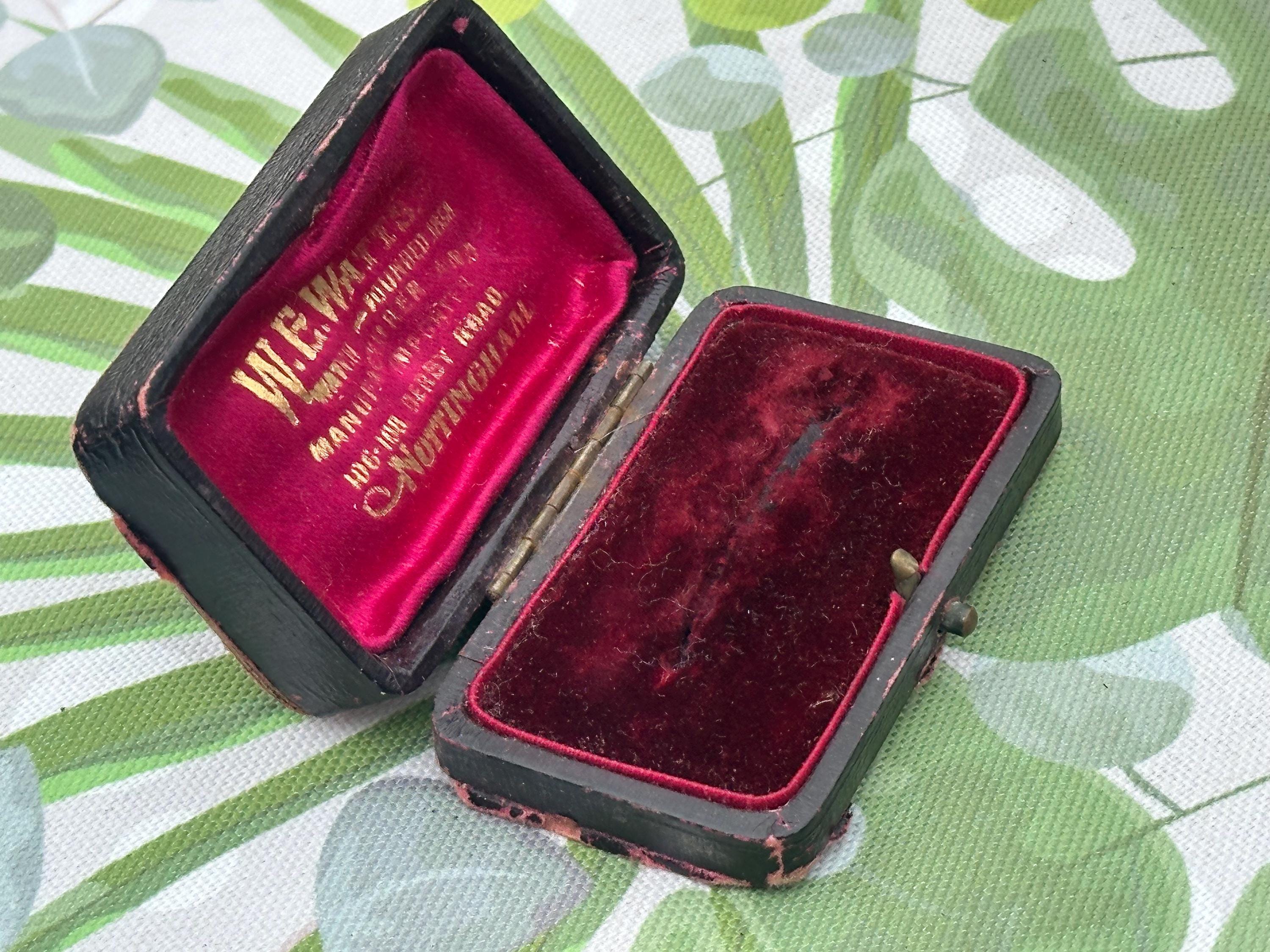 The box is lined with red velvet and has the company's name and address—106-108 Derby Road, Nottingham—printed in gold on the inside of the lid.
