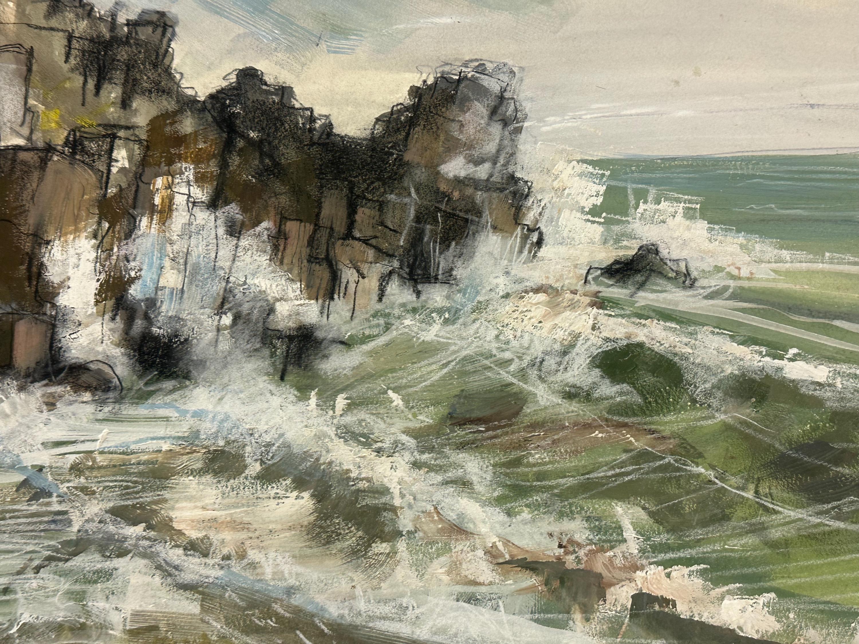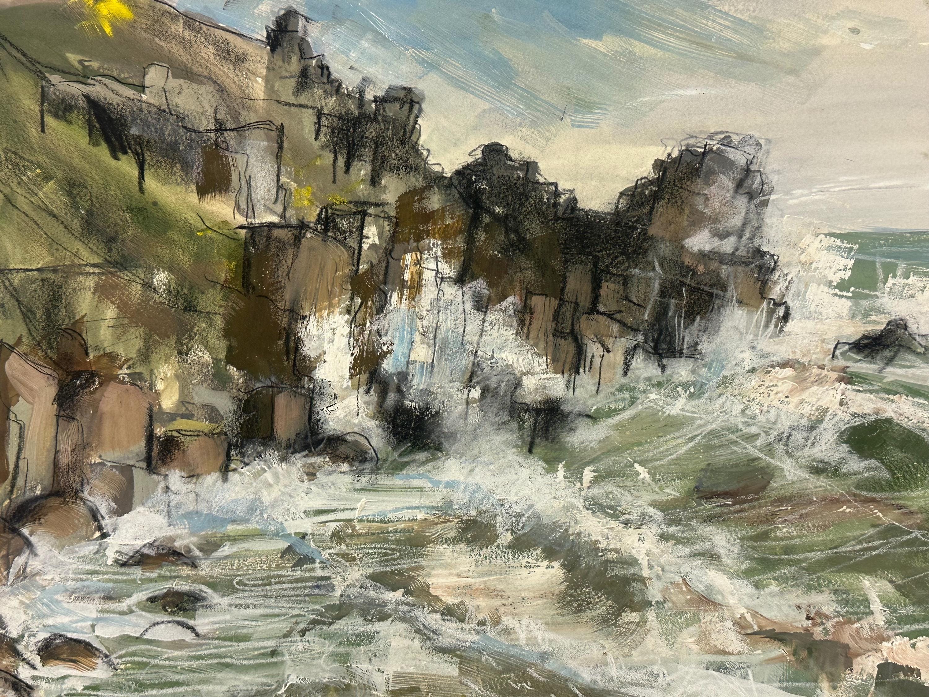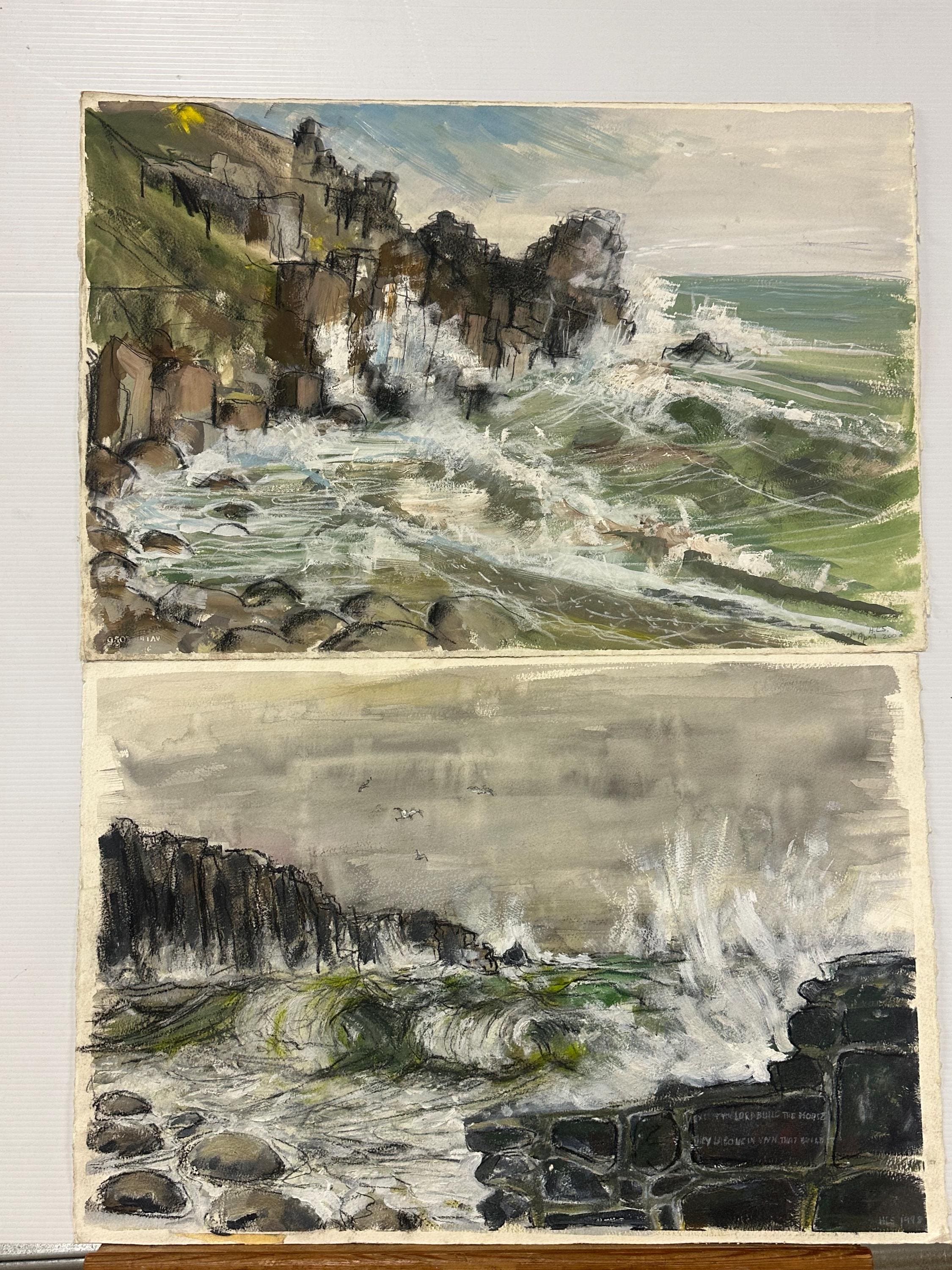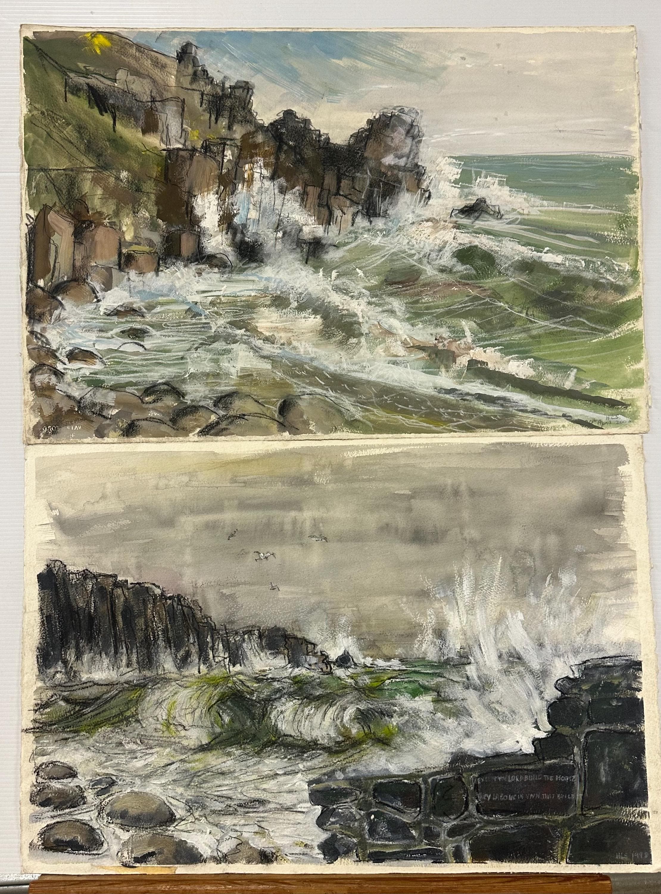 Rendered in a bold mixed media style — likely watercolour and gouache with touches of ink or pastel — the artist captures the raw energy of the sea crashing against rugged cliffs and rocks. The upper work shows towering cliff faces under a breezy sky, with foamy surf swirling around rounded coastal stones. The lower piece presents a more moody and atmospheric scene, with dark basalt cliffs, grey skies, and waves pounding a stone wall in the foreground, echoing the wild, untamed beauty of the Cornish coastline.