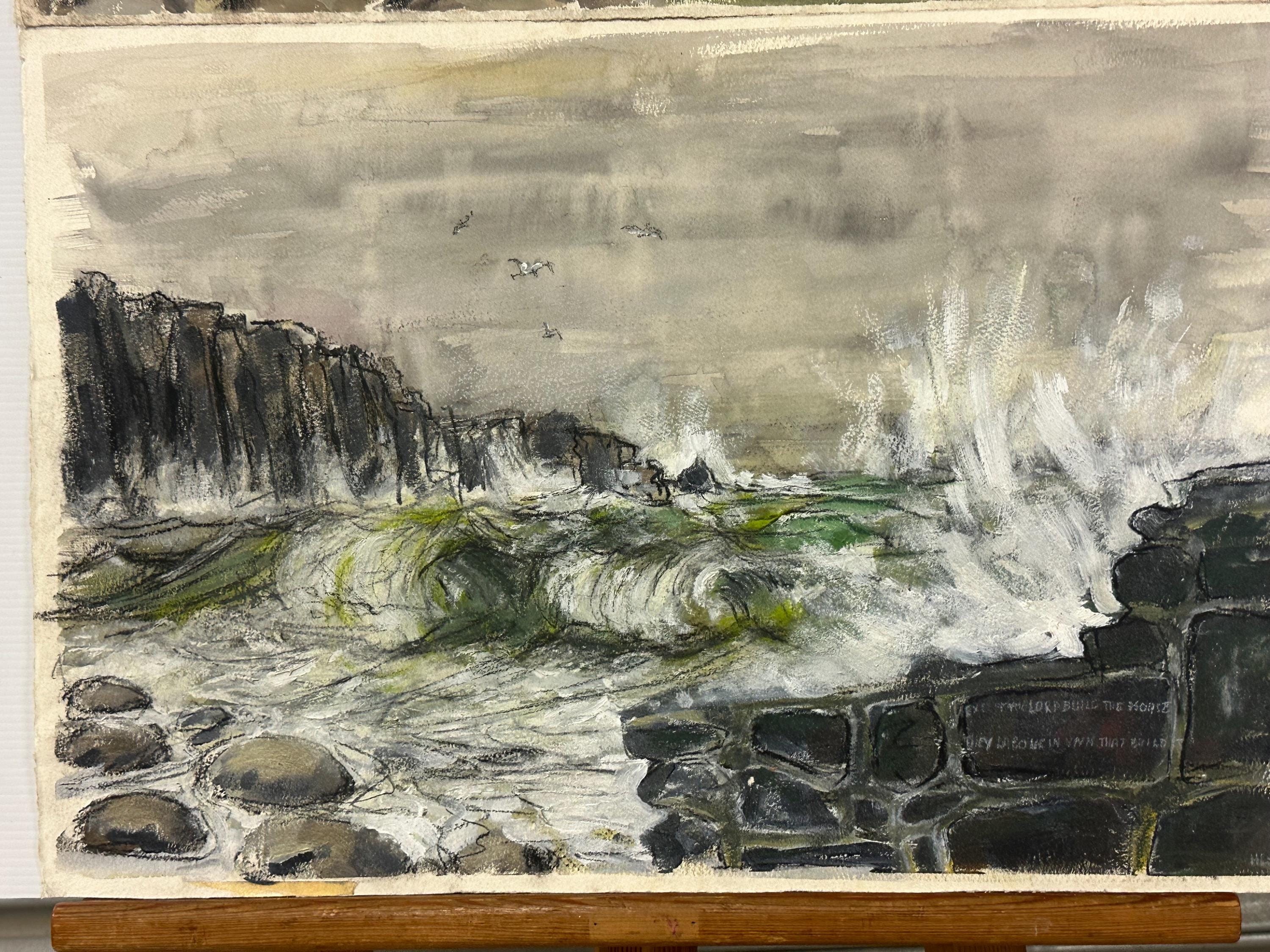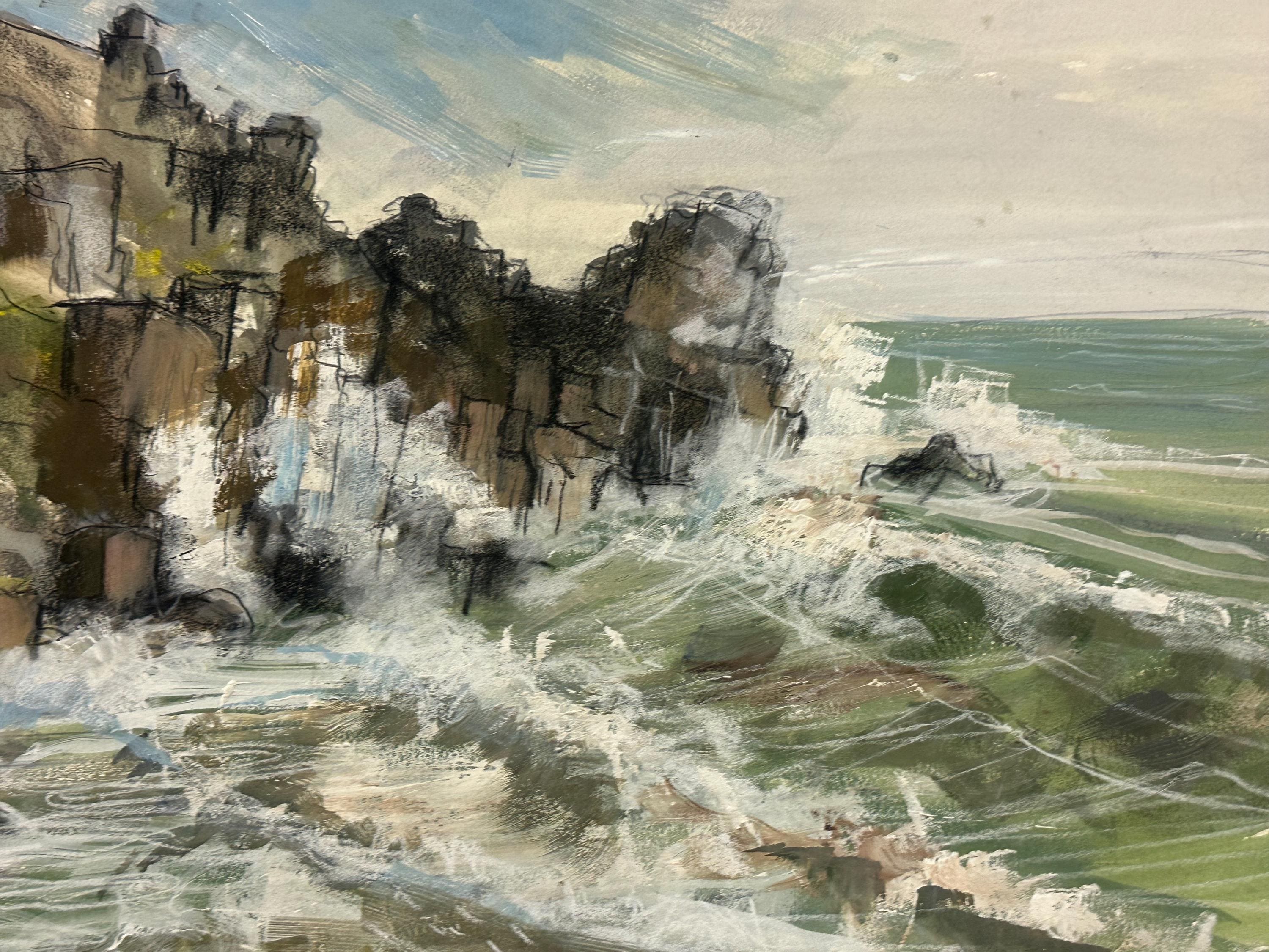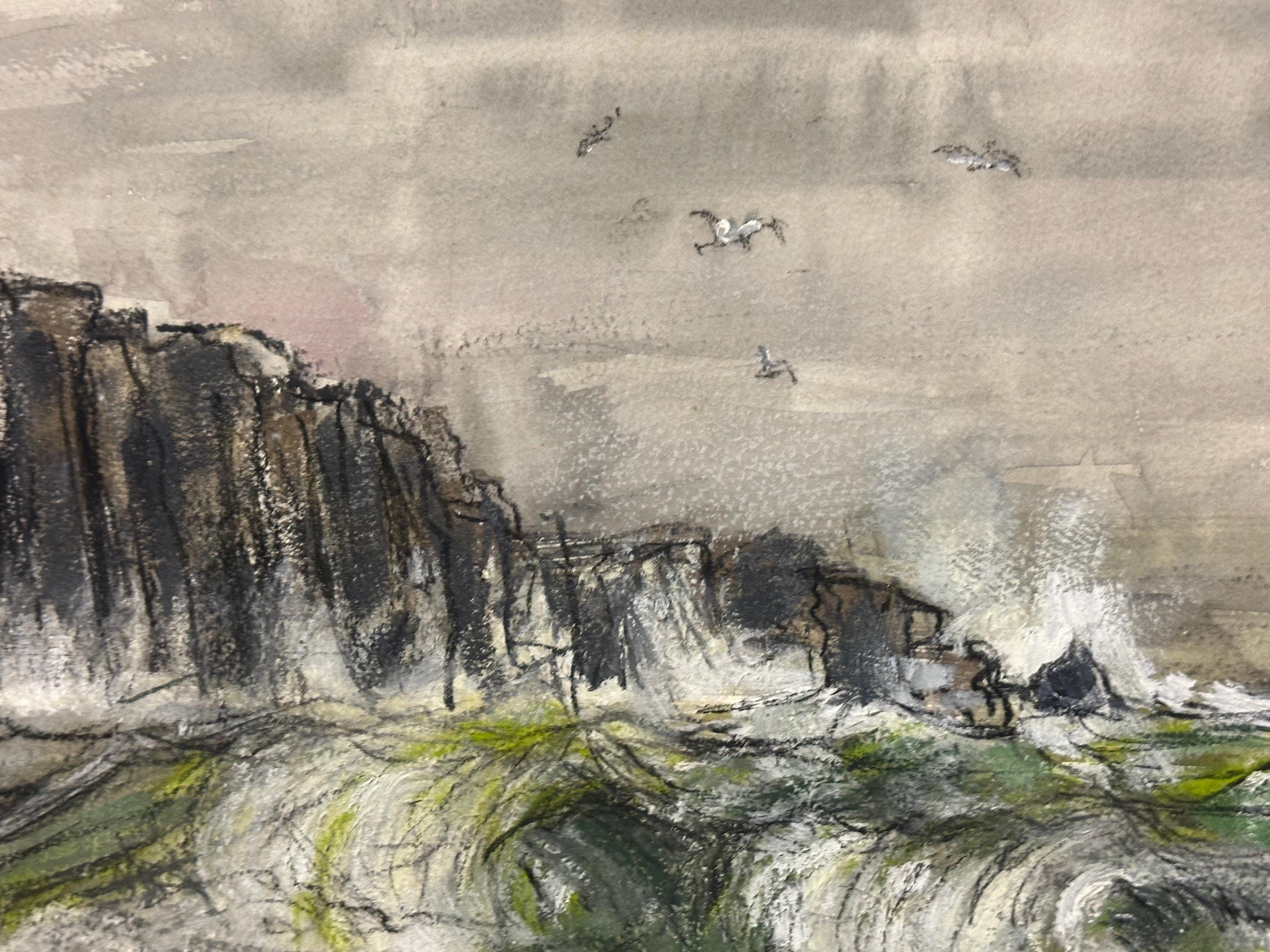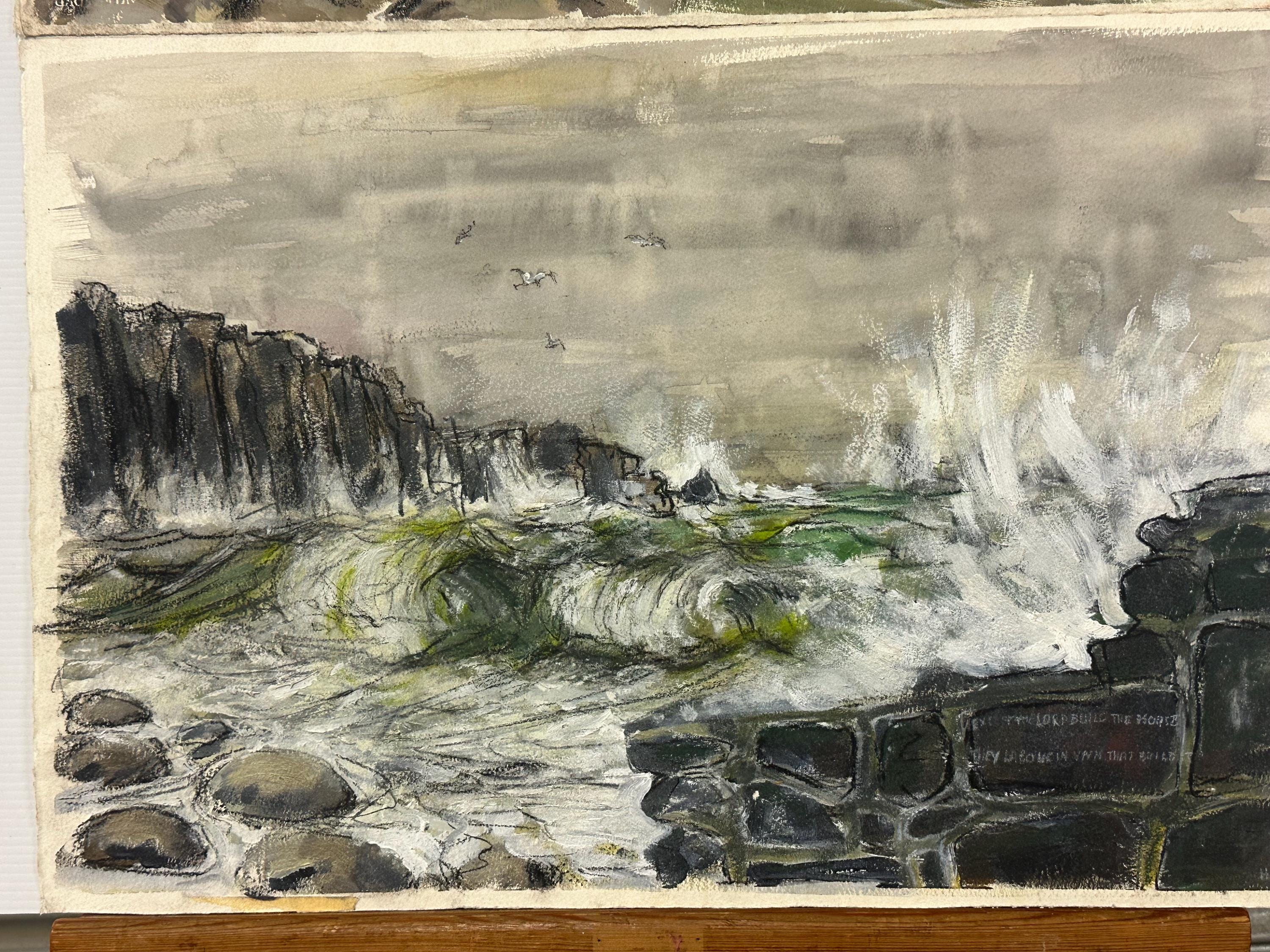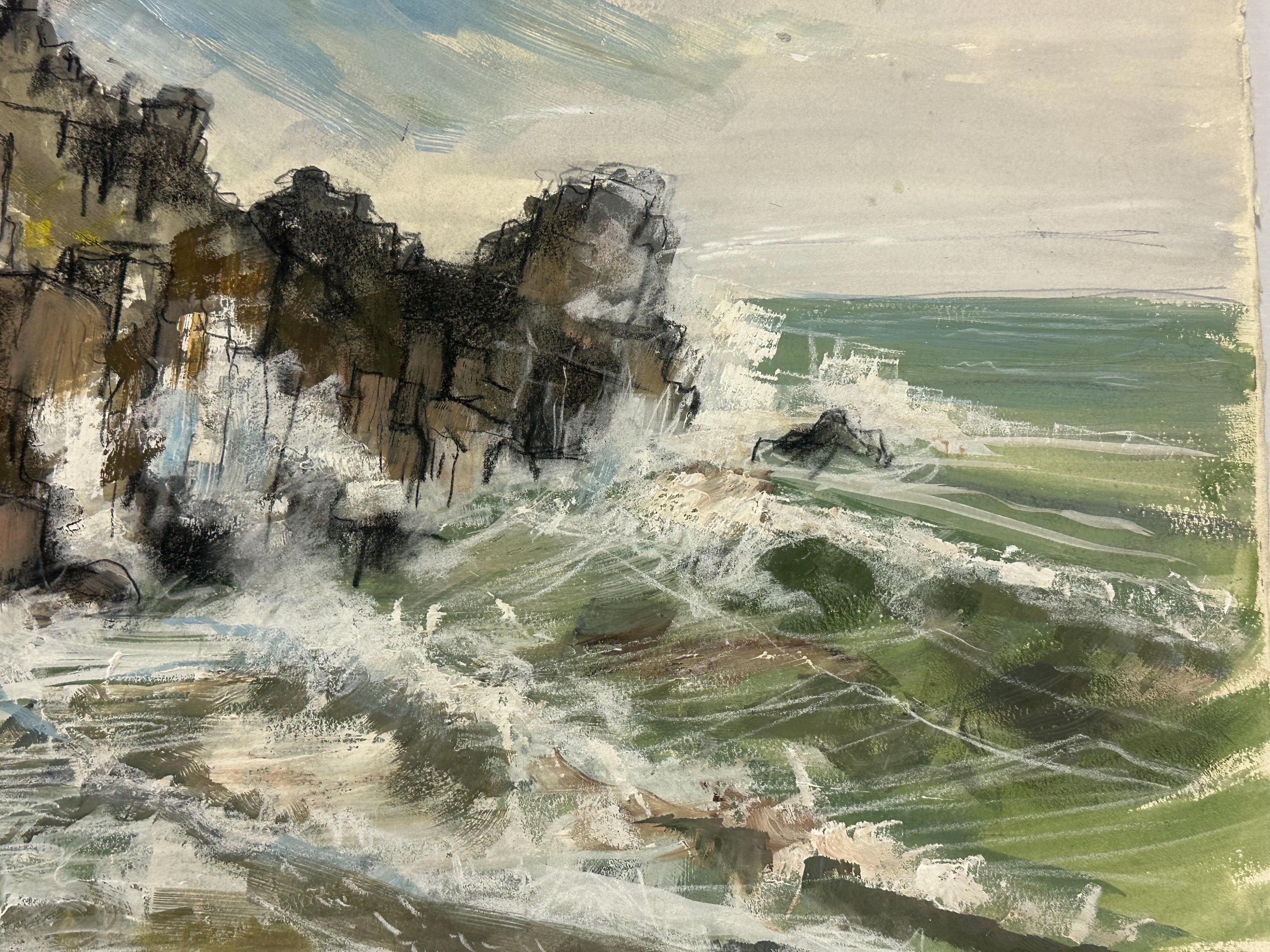 Rendered in a bold mixed media style — likely watercolour and gouache with touches of ink or pastel — the artist captures the raw energy of the sea crashing against rugged cliffs and rocks. The upper work shows towering cliff faces under a breezy sky, with foamy surf swirling around rounded coastal stones. The lower piece presents a more moody and atmospheric scene, with dark basalt cliffs, grey skies, and waves pounding a stone wall in the foreground, echoing the wild, untamed beauty of the Cornish coastline.