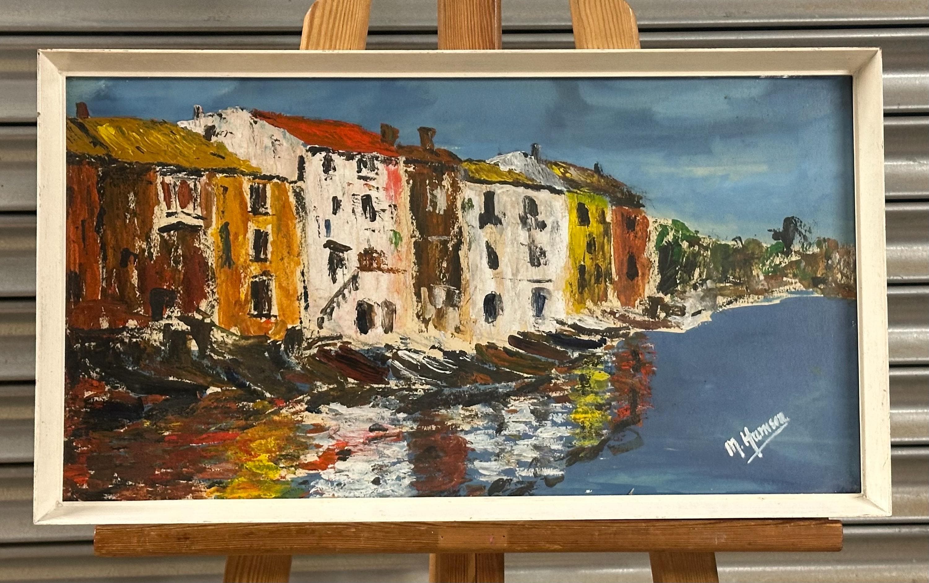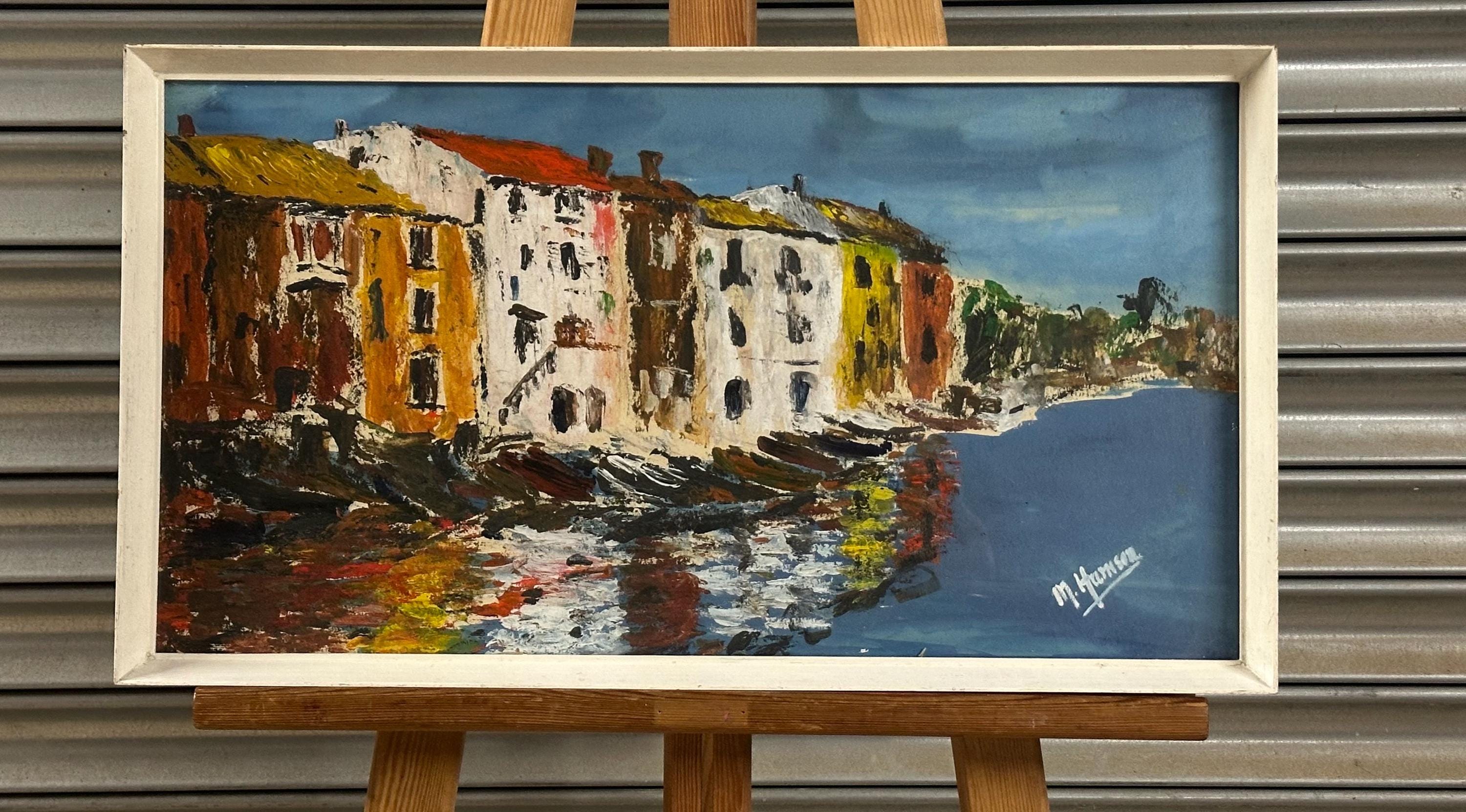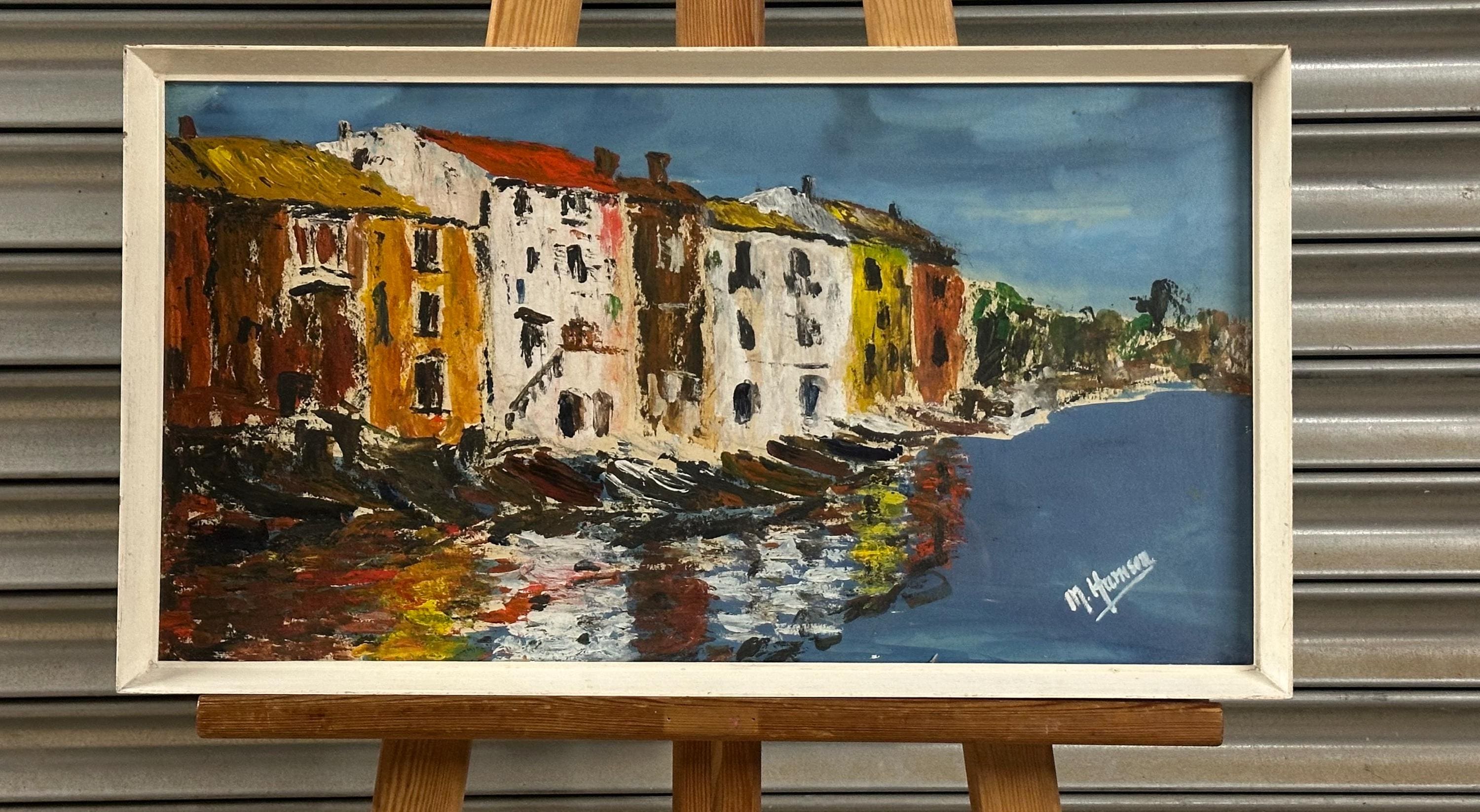 A striking mid-century original oil painting signed M. Harrison, depicting a colourful Mediterranean harbour scene. The artist’s confident brushwork and bold use of colour bring the coastal buildings and reflections on the water to life — rich ochres, warm reds, and bright yellows contrast beautifully with the deep blue sea and sky.