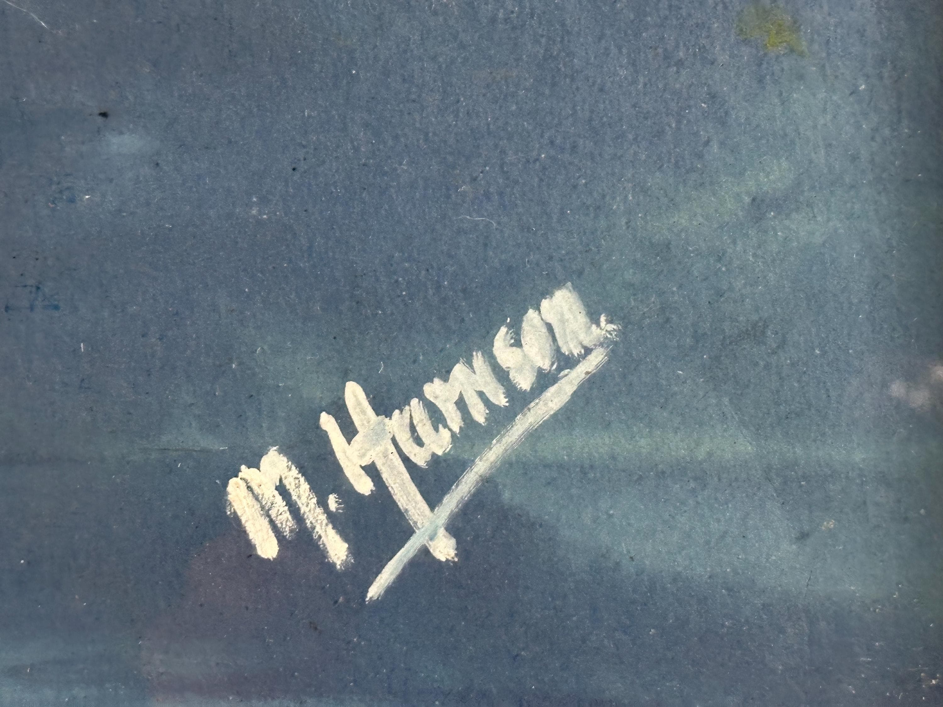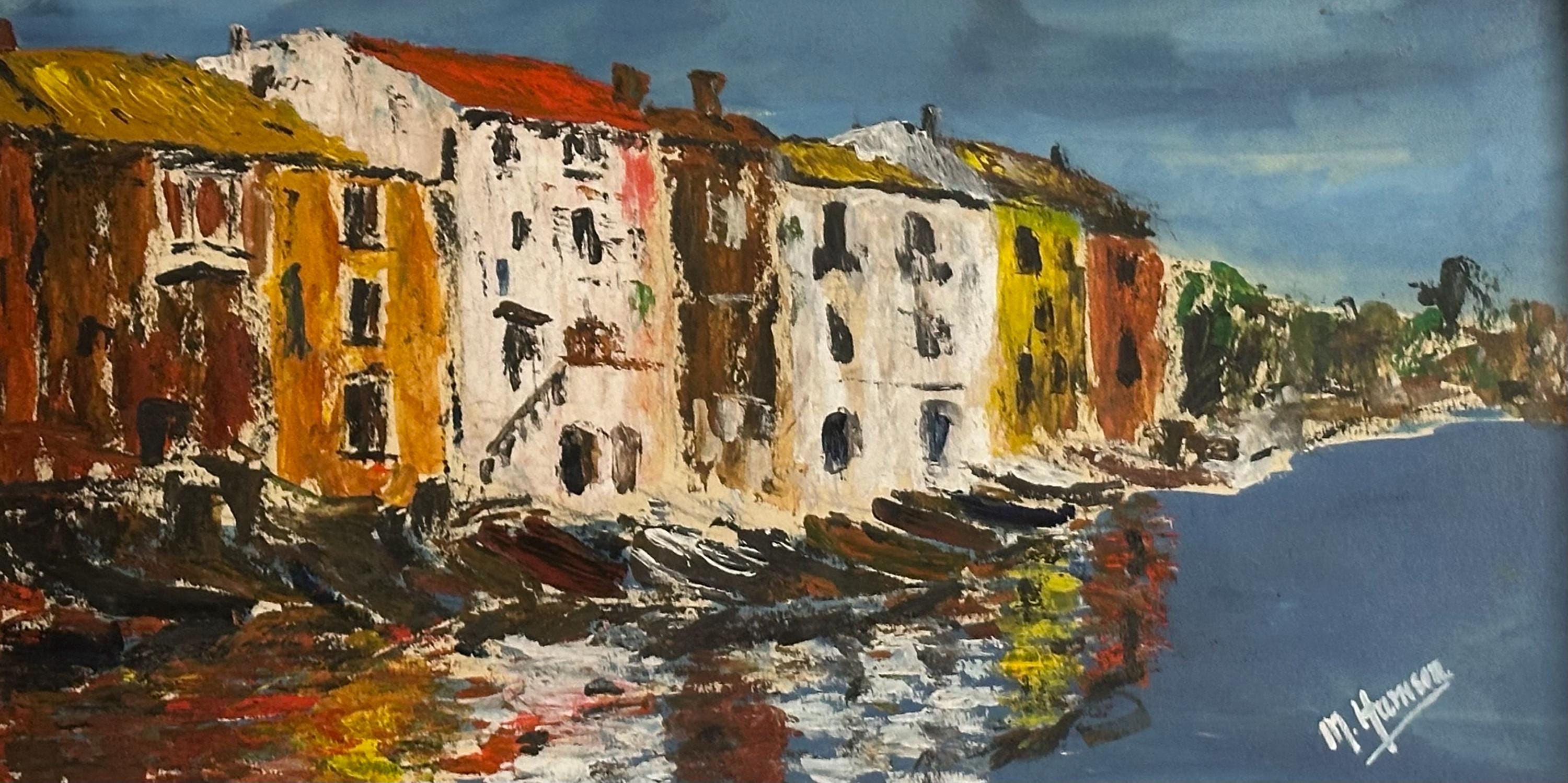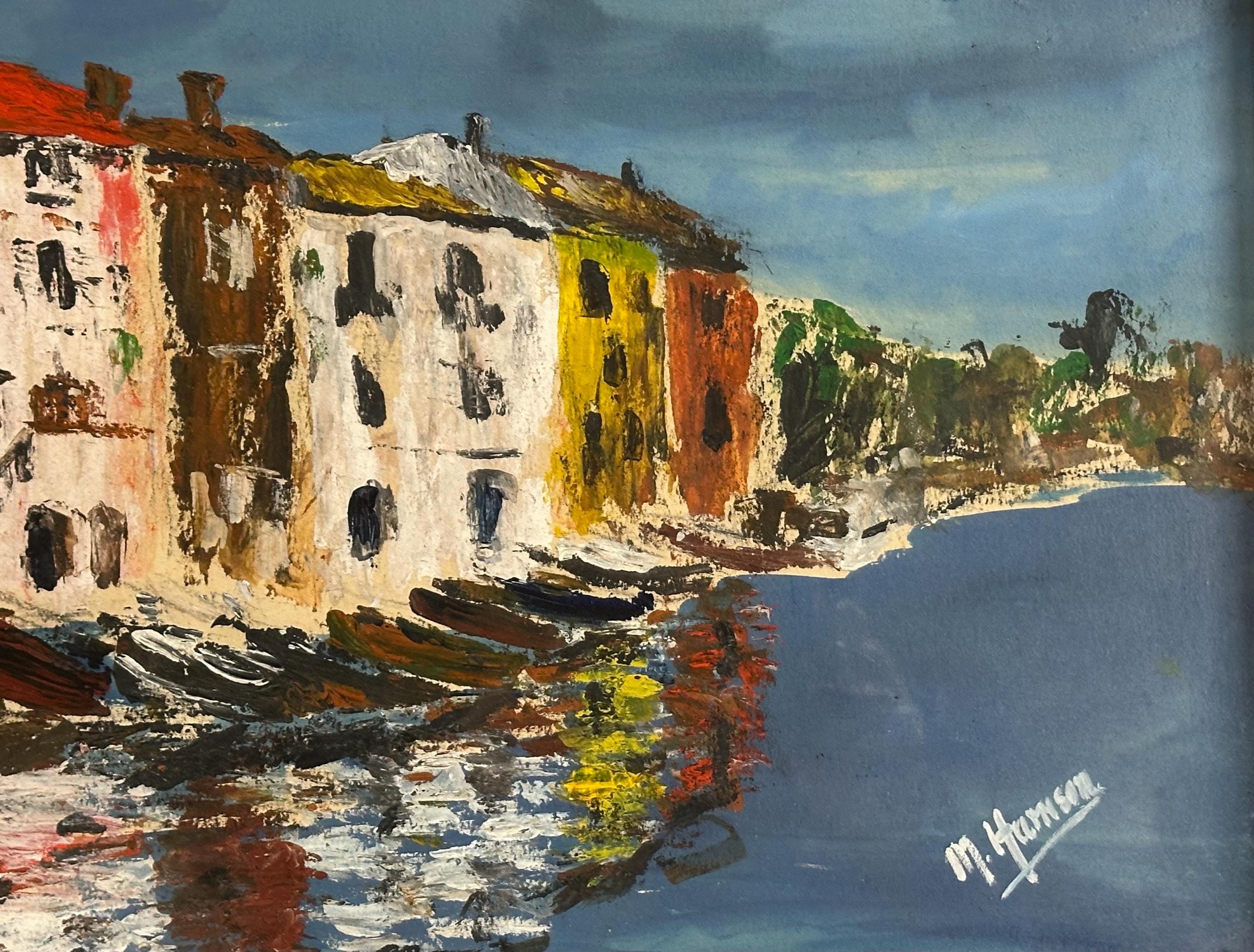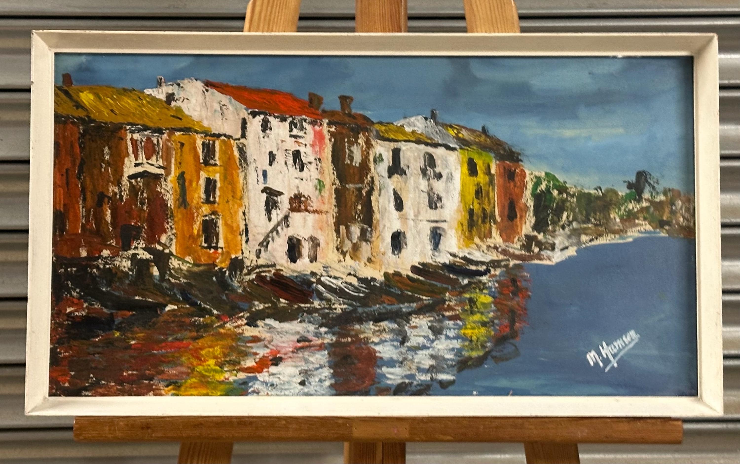 A striking mid-century original oil painting signed M. Harrison, depicting a colourful Mediterranean harbour scene. The artist’s confident brushwork and bold use of colour bring the coastal buildings and reflections on the water to life — rich ochres, warm reds, and bright yellows contrast beautifully with the deep blue sea and sky.