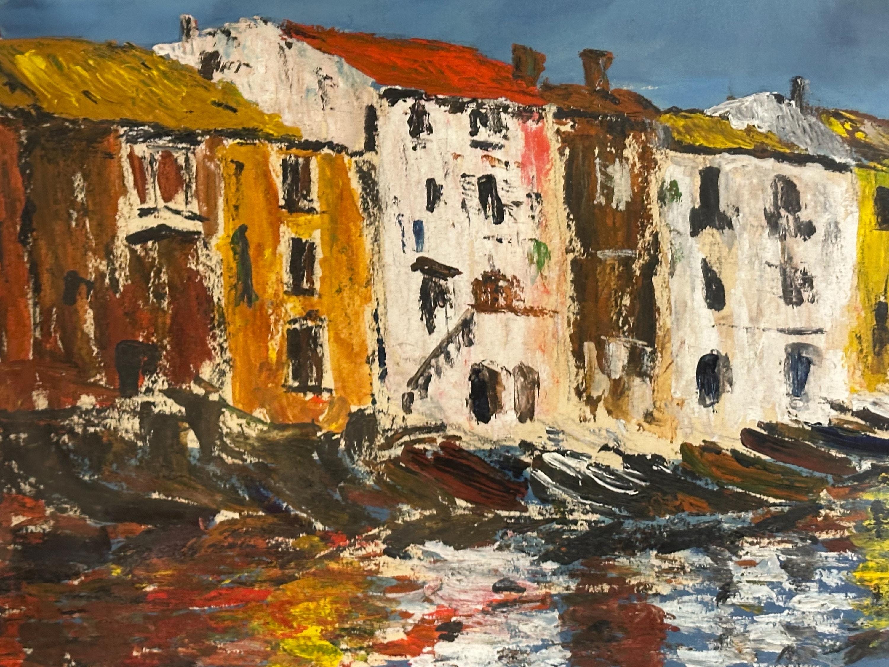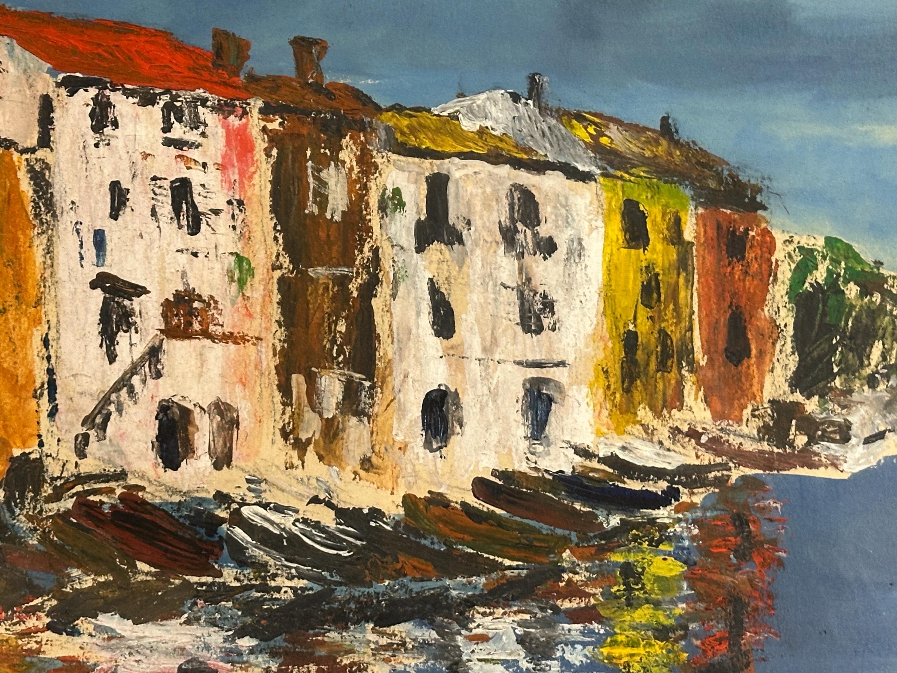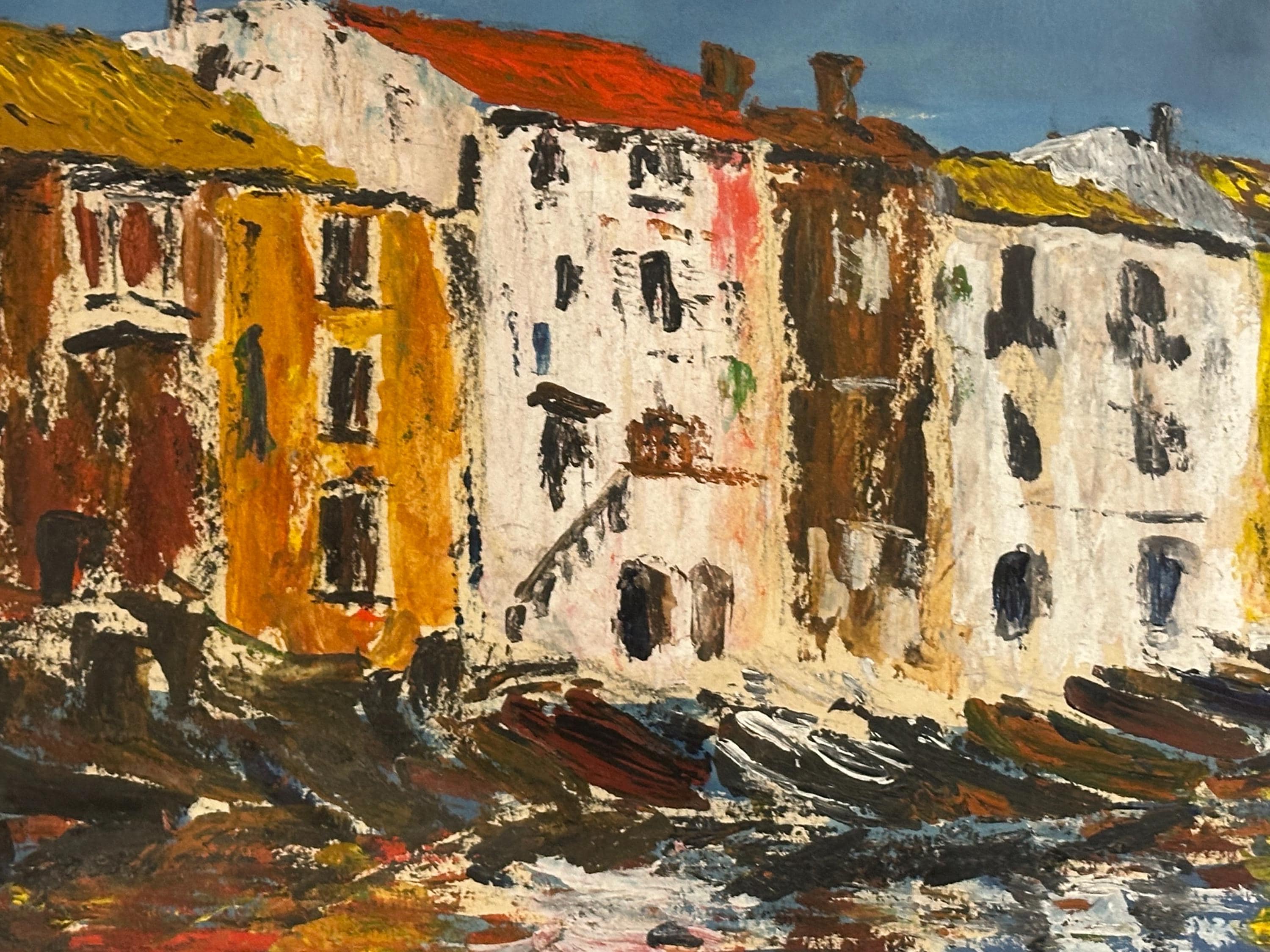 Painted in a wonderfully expressive, textured impasto style, typical of the 1950s–60s modernist movement, this work captures the vibrancy and sun-drenched atmosphere of southern Europe — possibly Italy or the South of France.