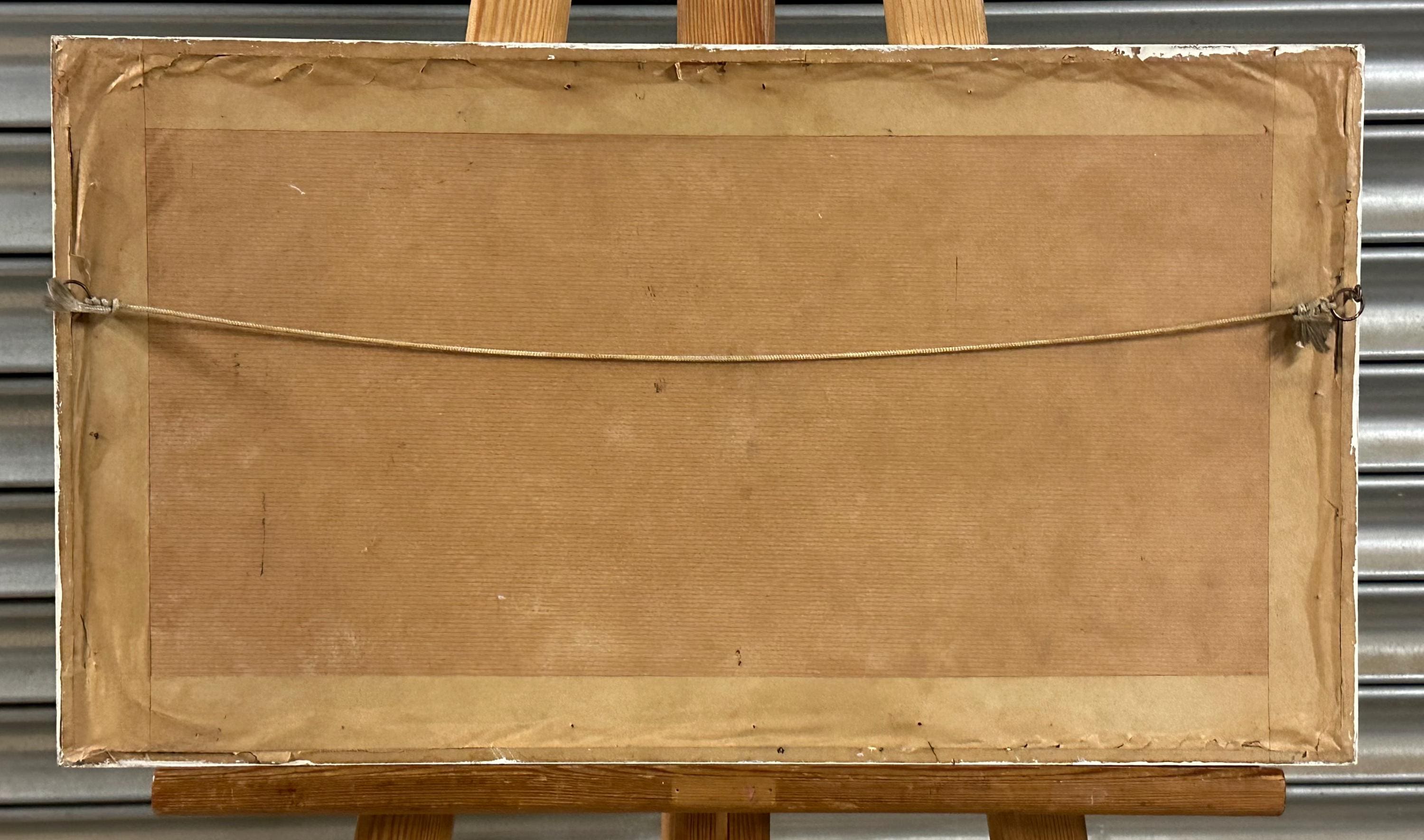 Presented in its original off-white wooden frame, the painting has an authentic mid-century charm that makes it perfect for both vintage interiors and contemporary spaces looking for a pop of colour and character.