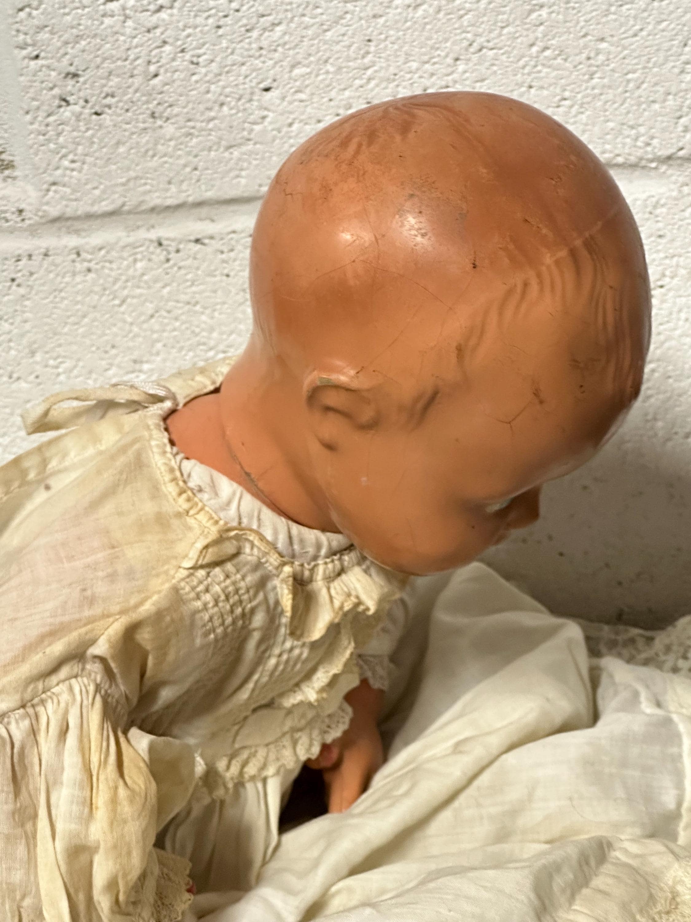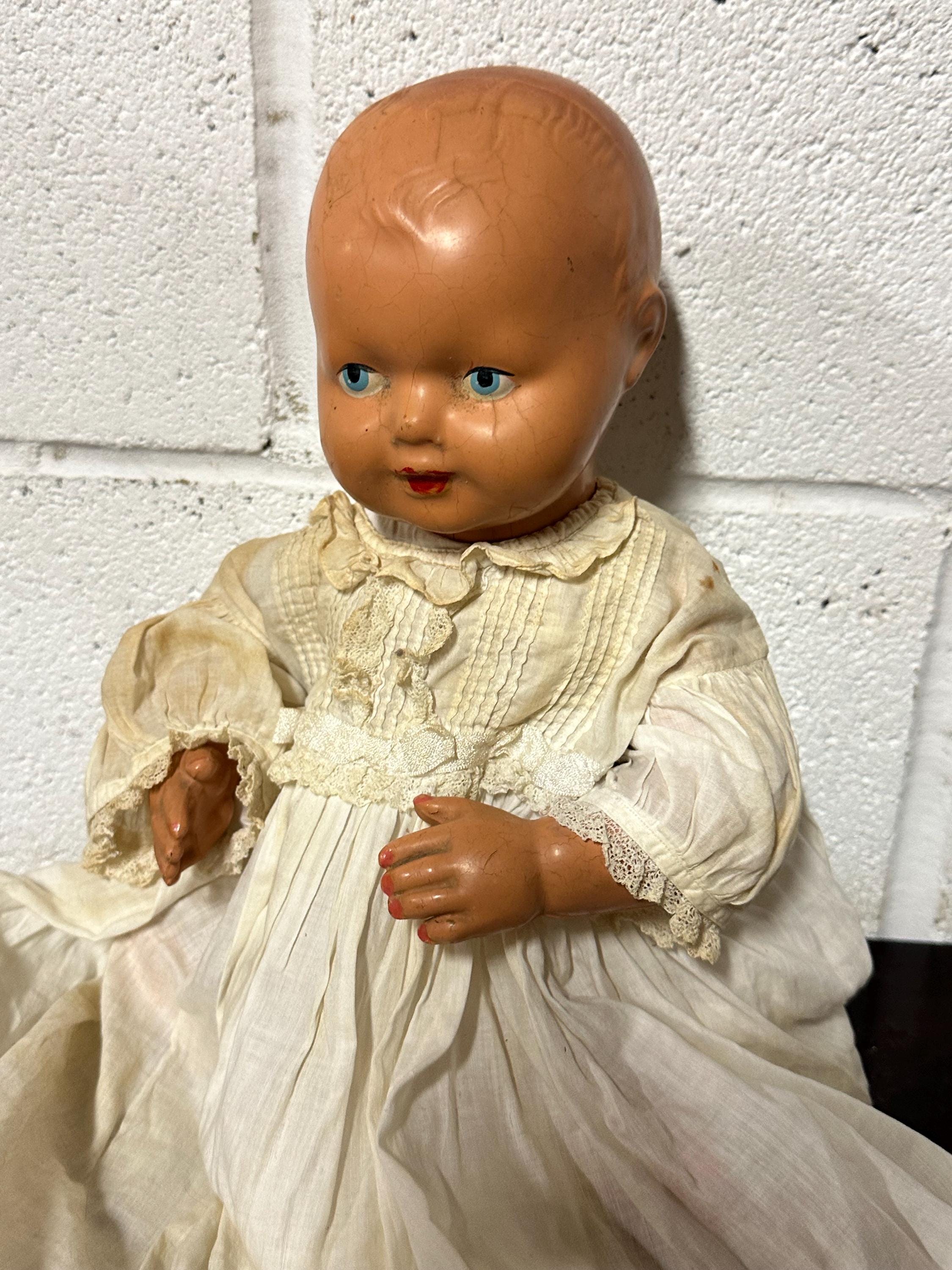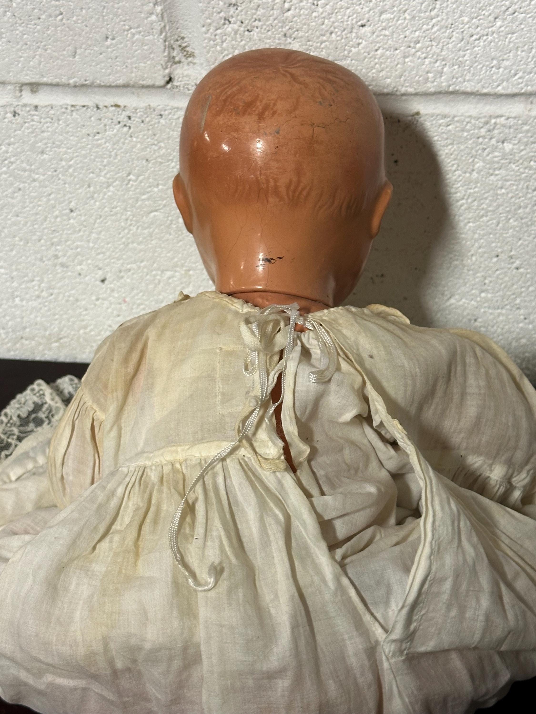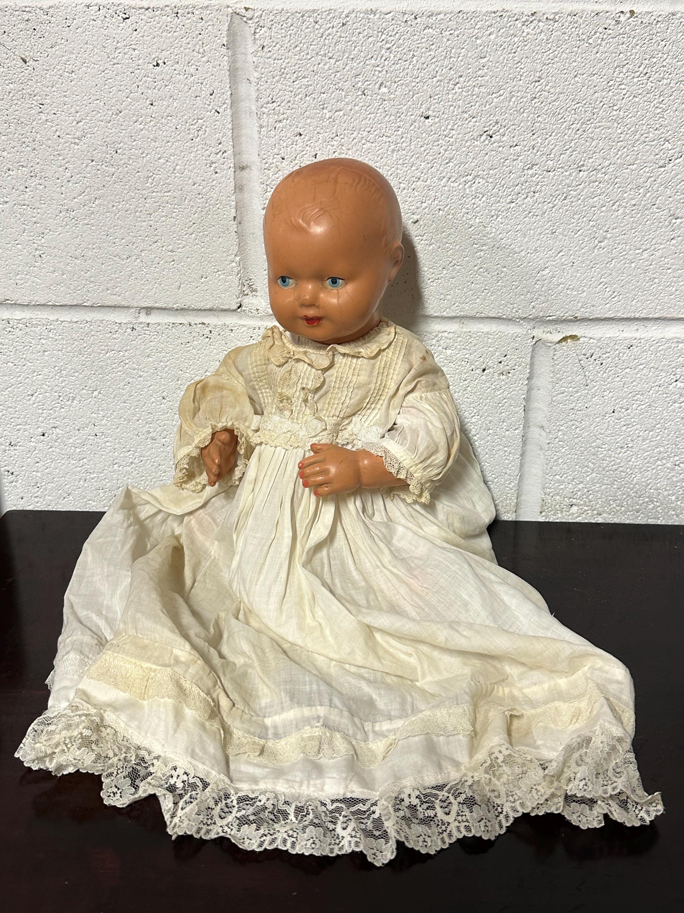 A charming vintage composition baby doll, dressed in a beautiful long antique christening gown with delicate lace and embroidered detail. The doll has painted features and a softly modelled face typical of early 20th-century design.