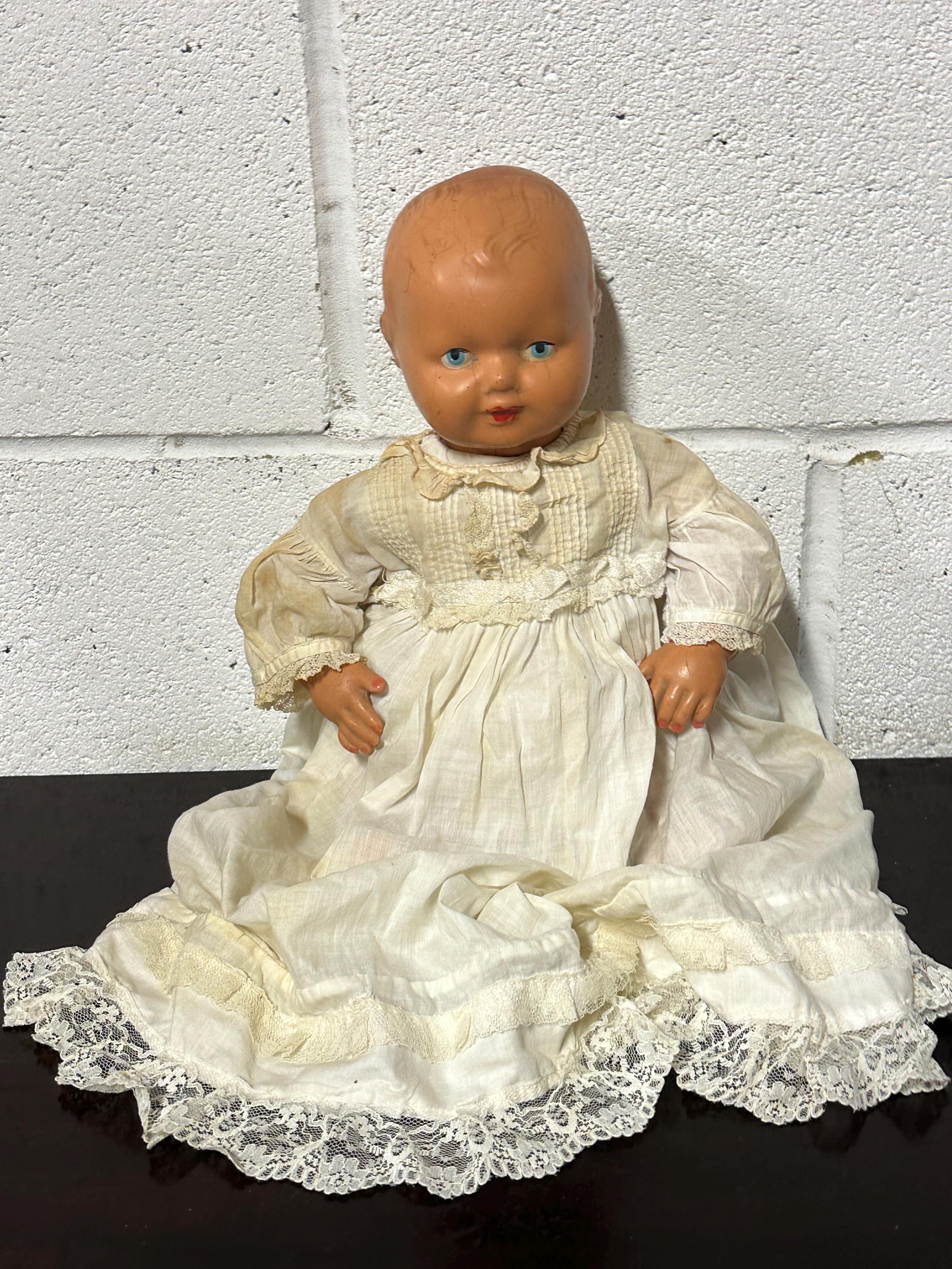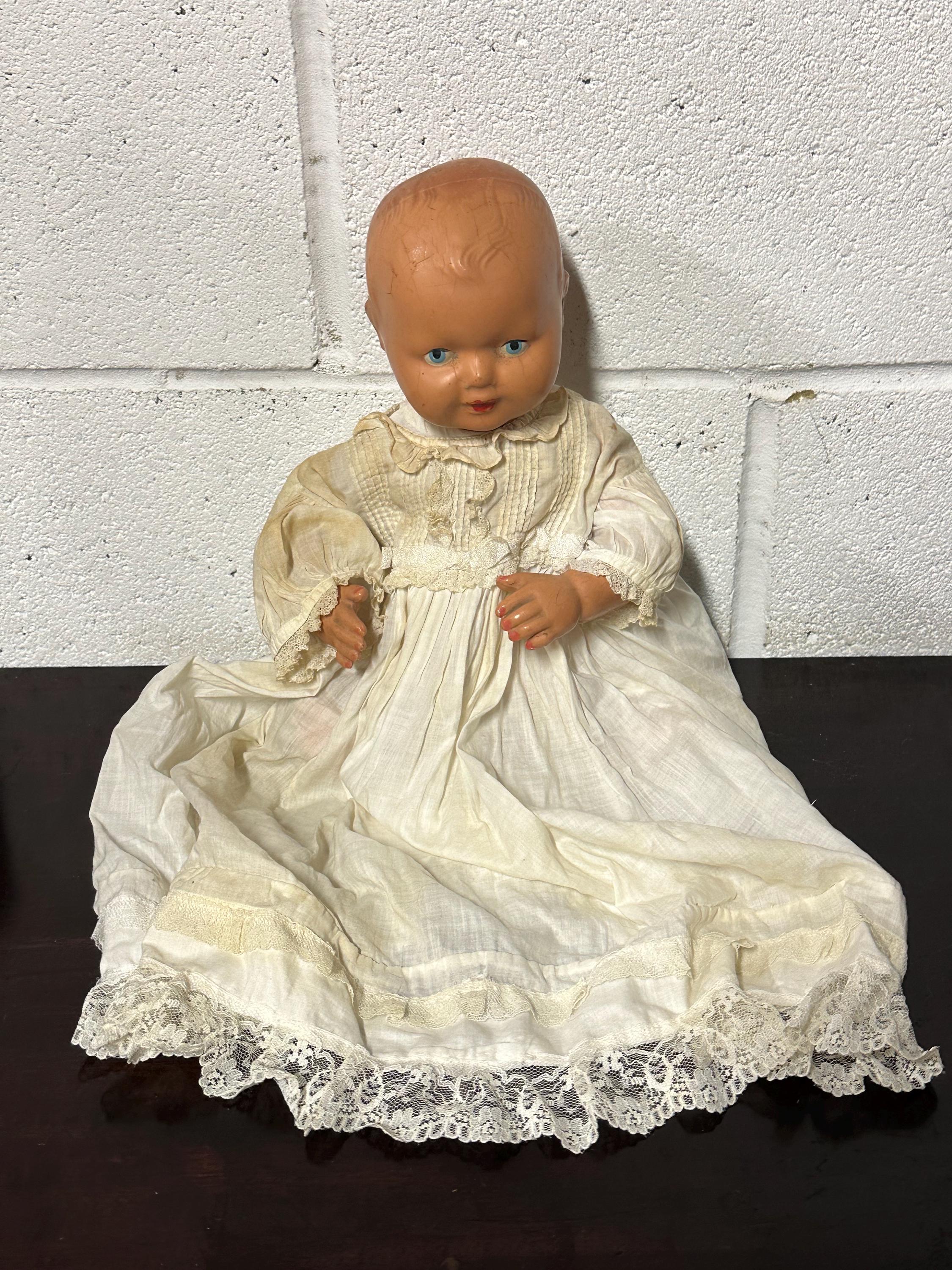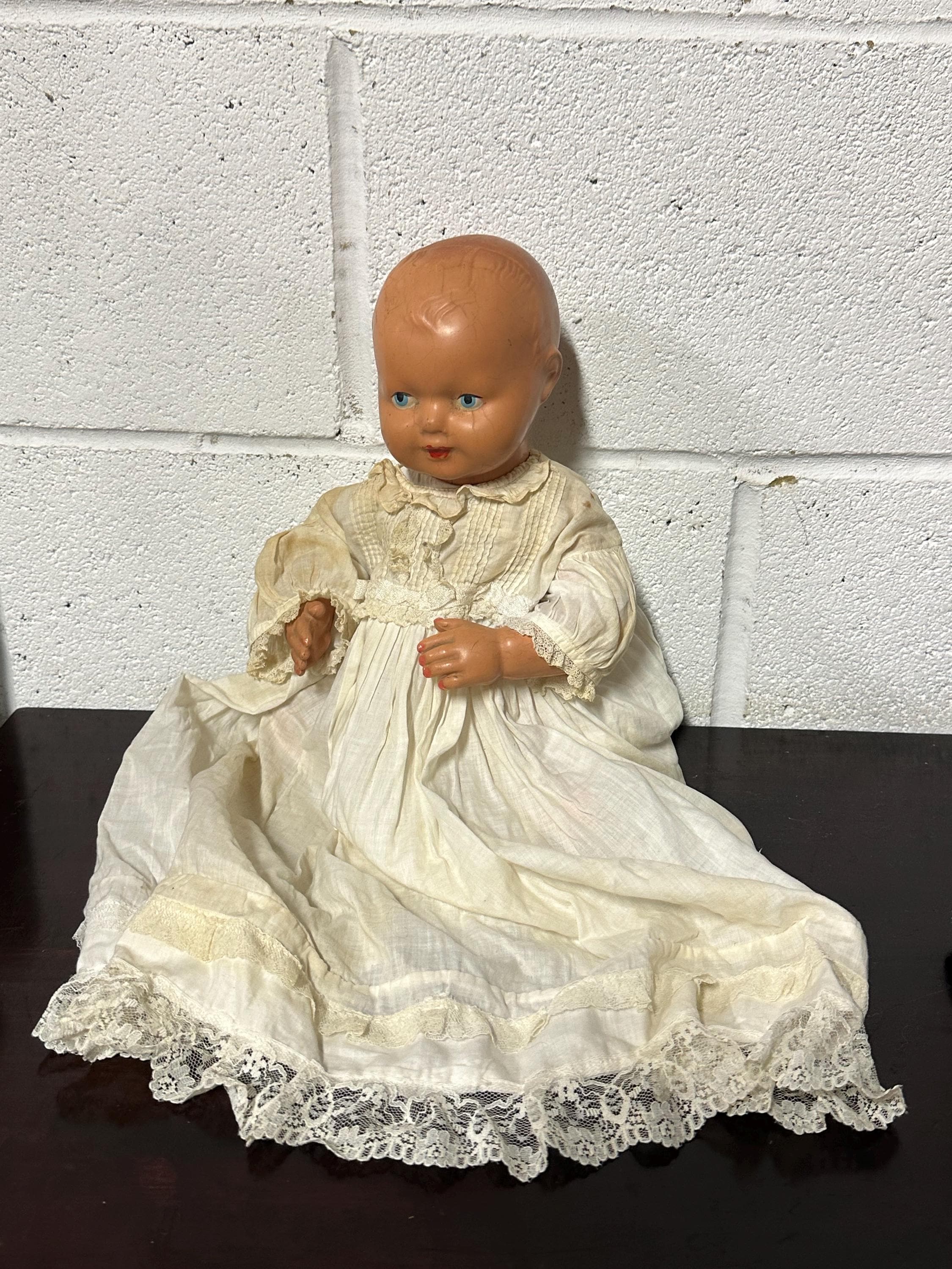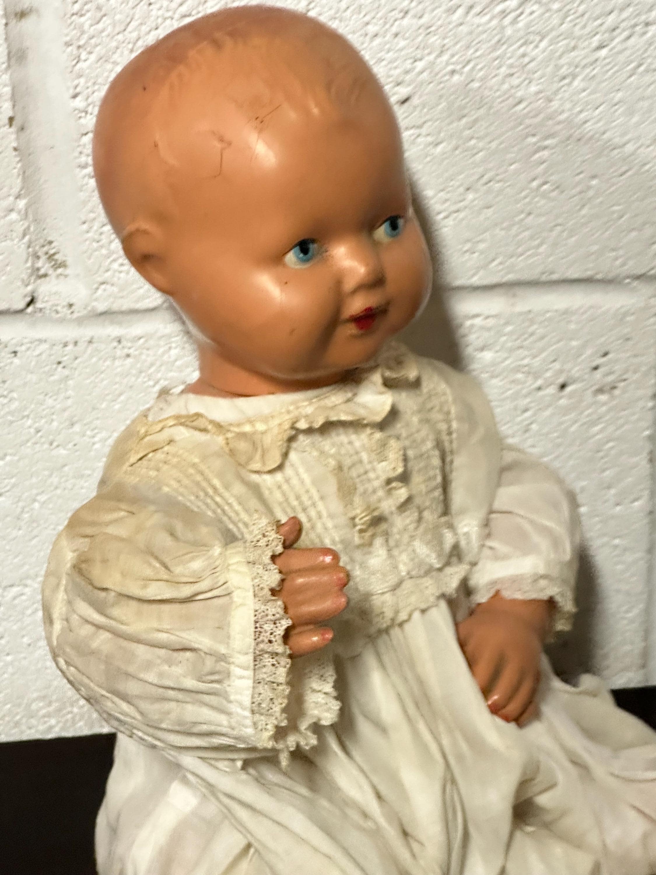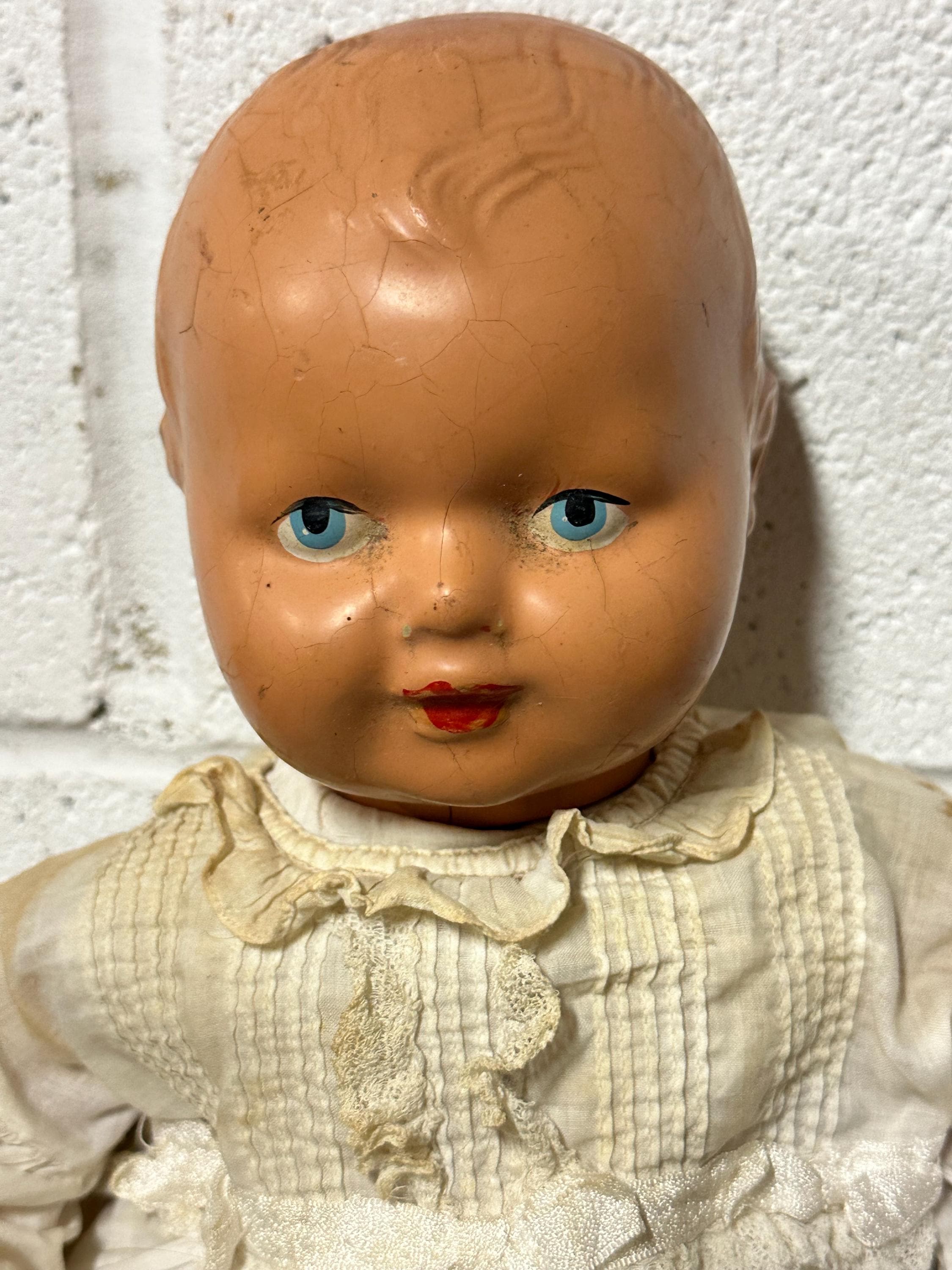 A charming vintage composition baby doll, dressed in a beautiful long antique christening gown with delicate lace and embroidered detail. The doll has painted features and a softly modelled face typical of early 20th-century design.