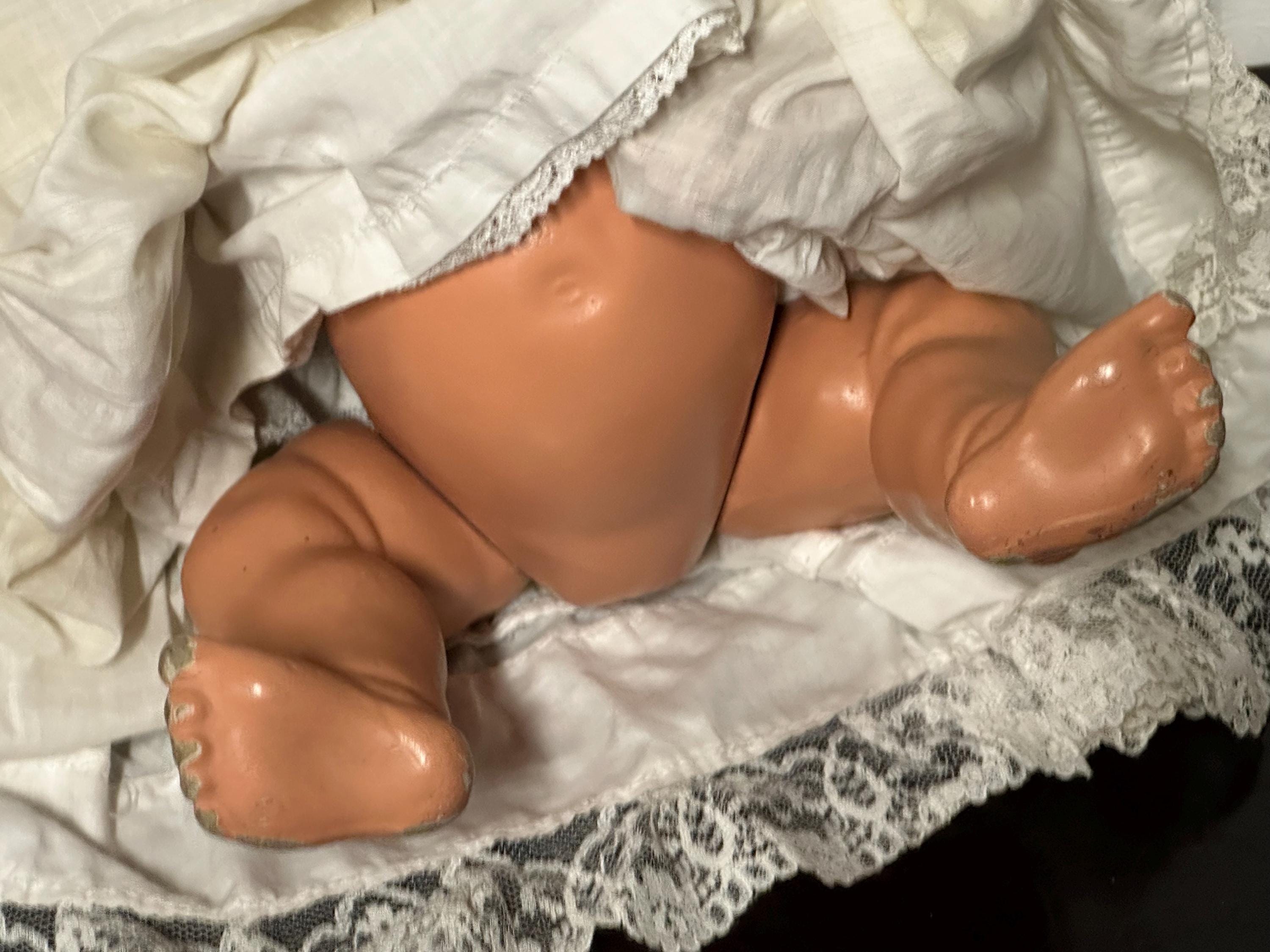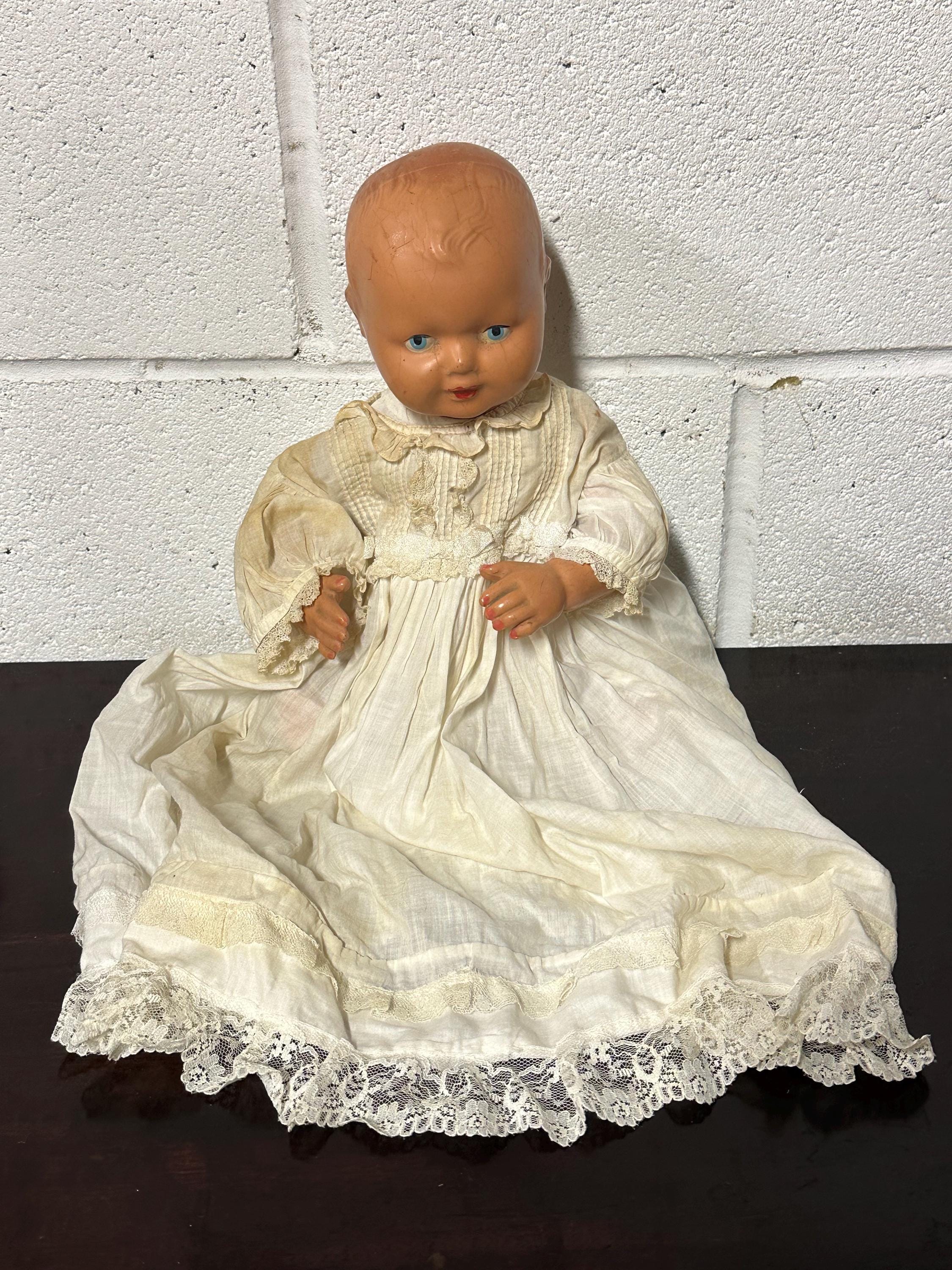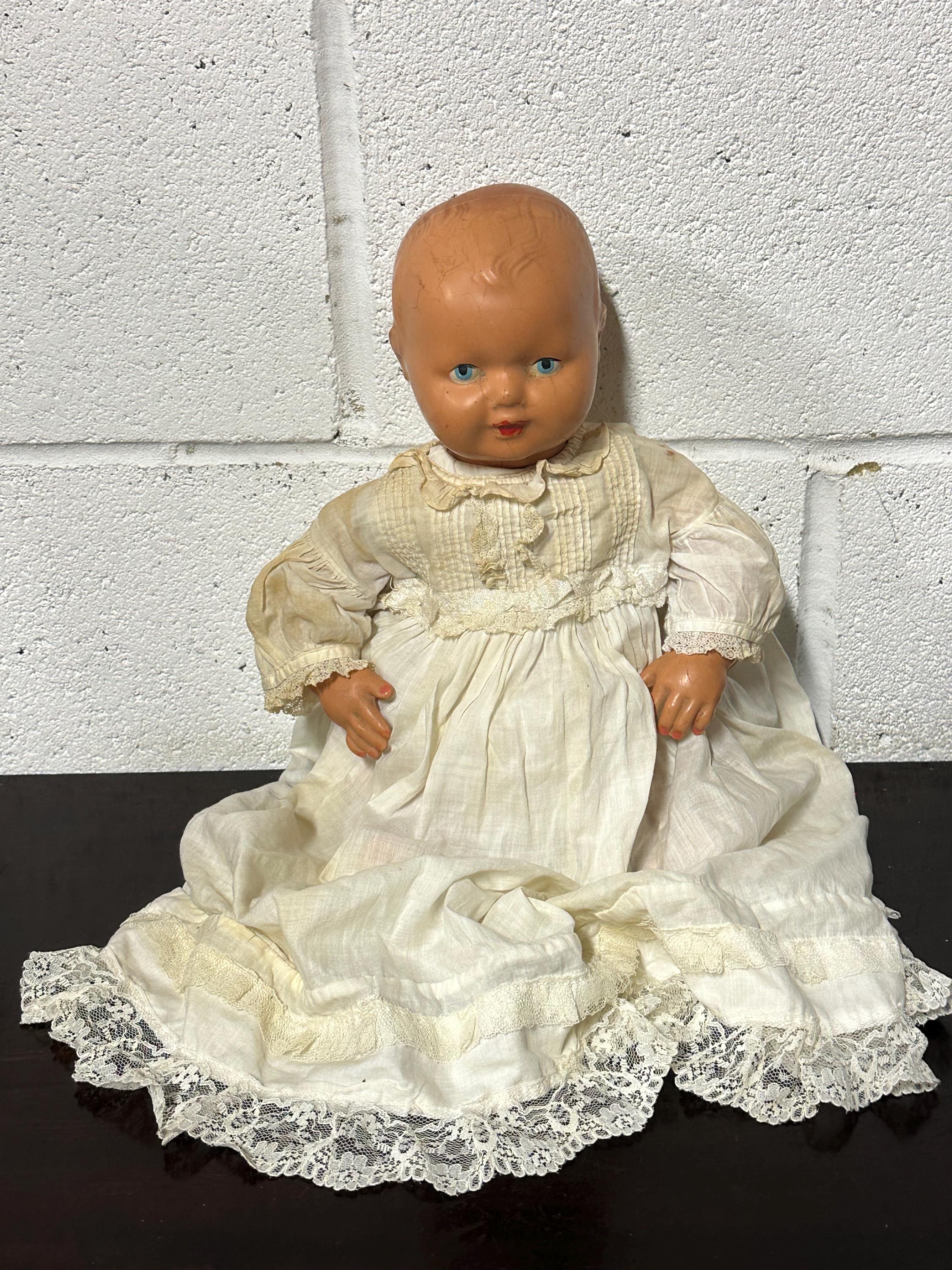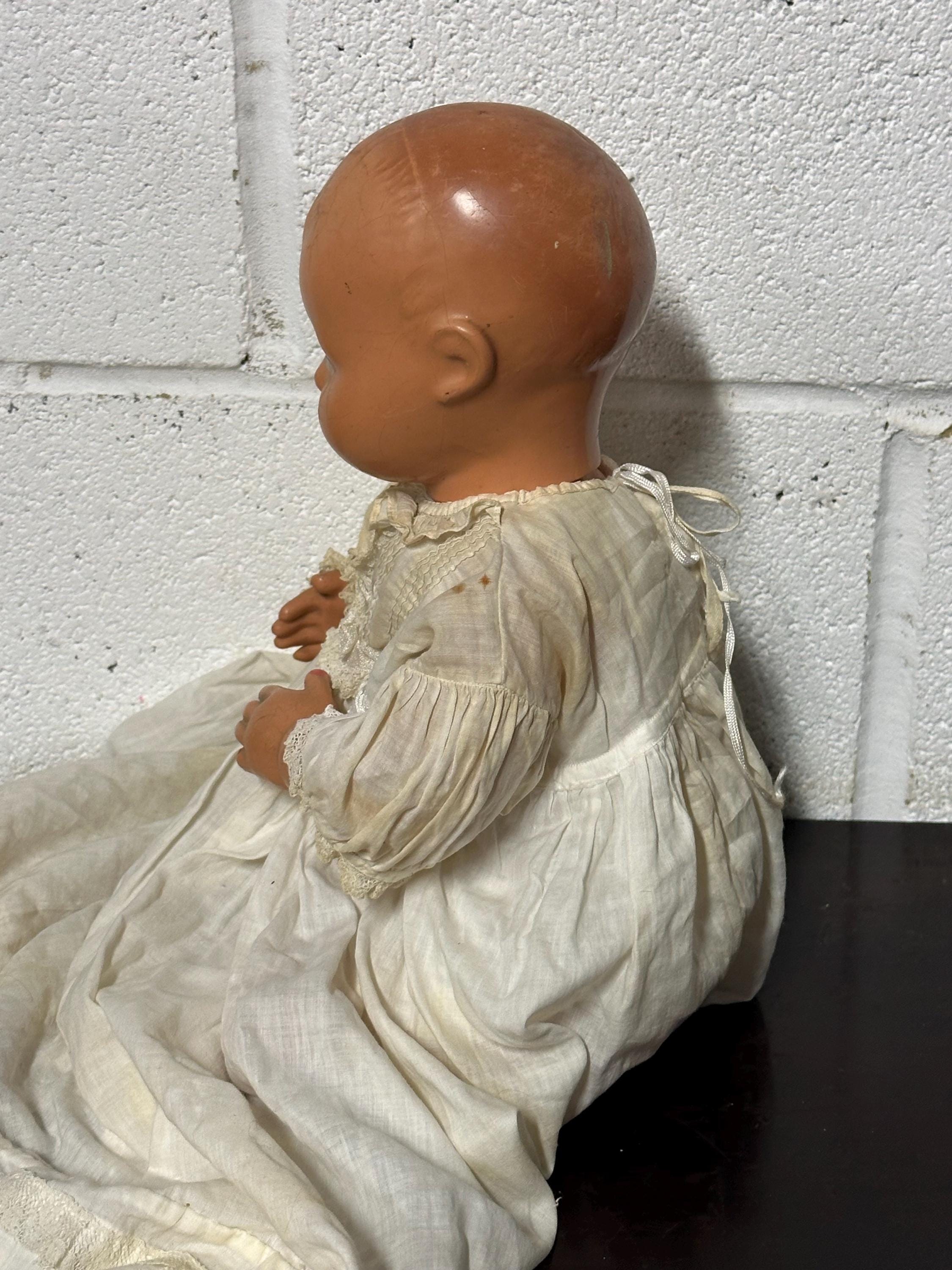 A charming vintage composition baby doll, dressed in a beautiful long antique christening gown with delicate lace and embroidered detail. The doll has painted features and a softly modelled face typical of early 20th-century design.