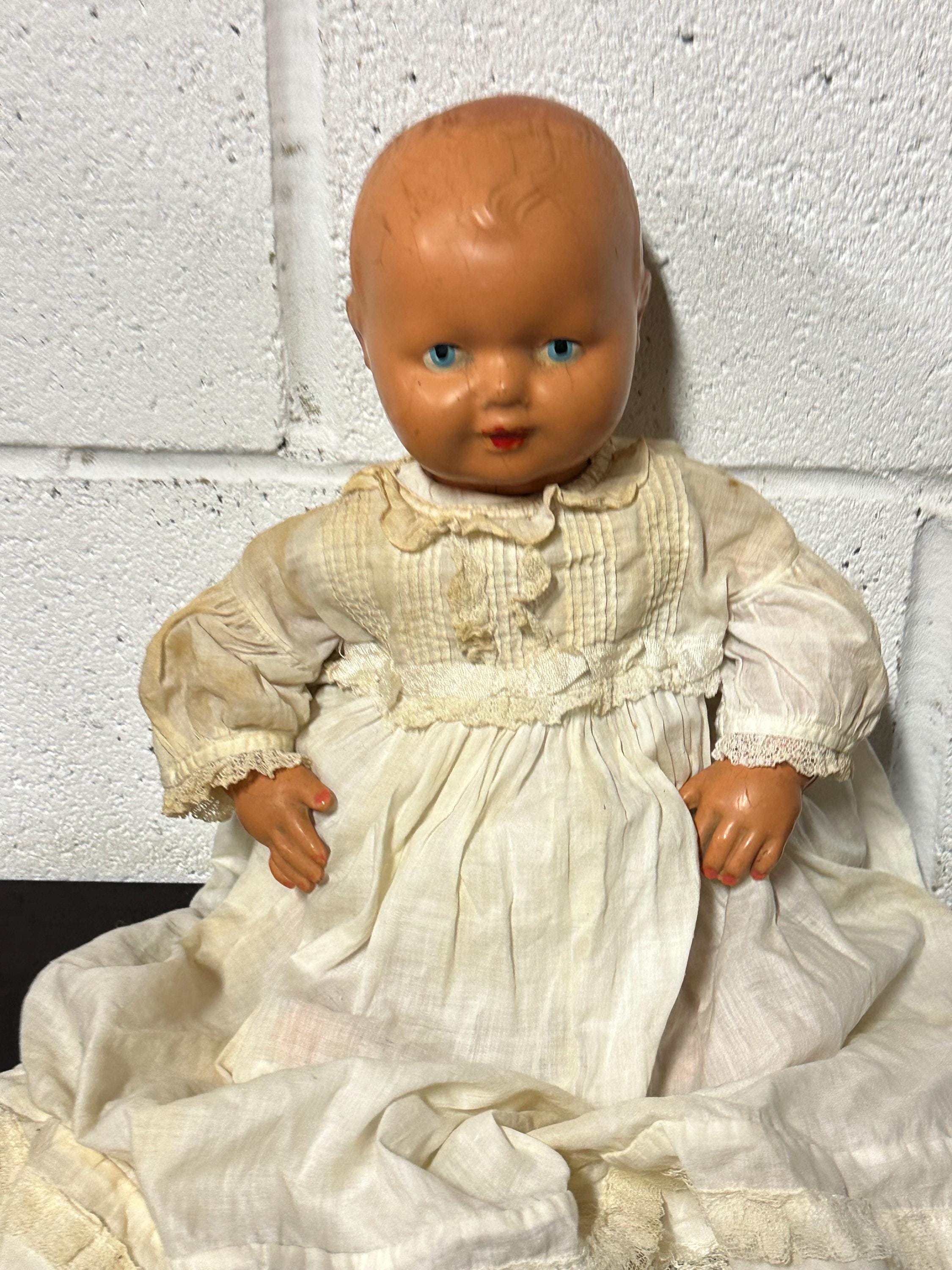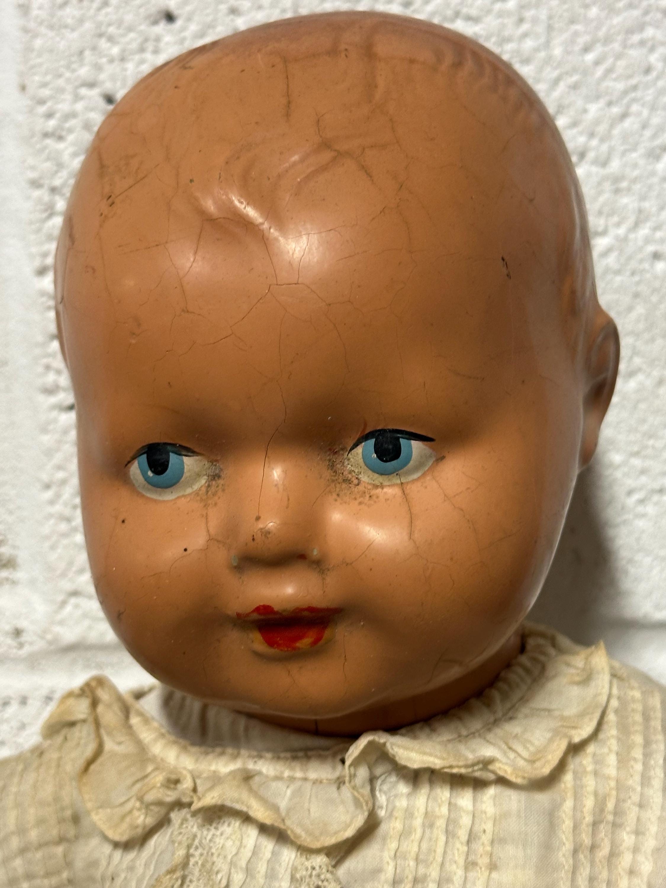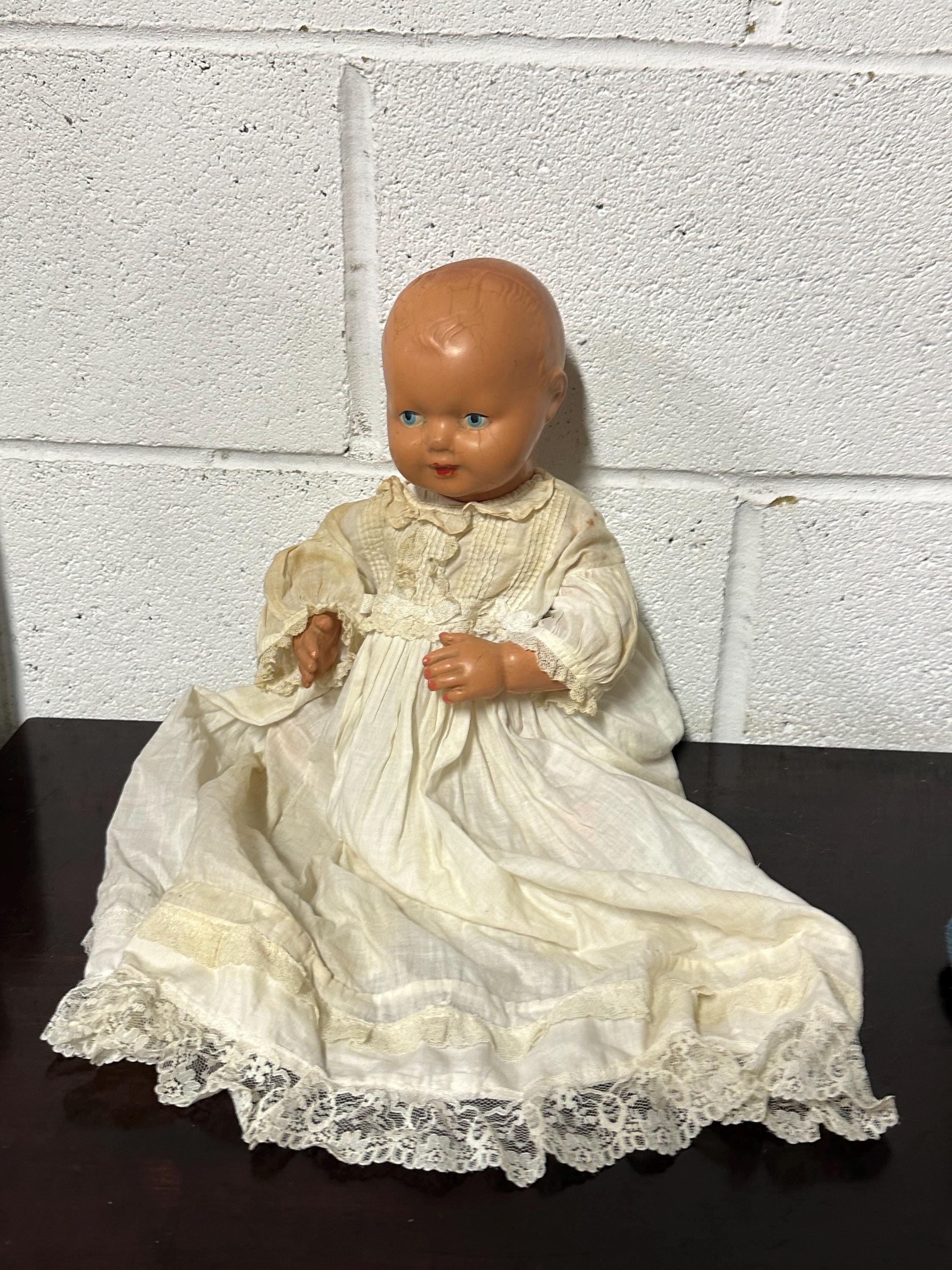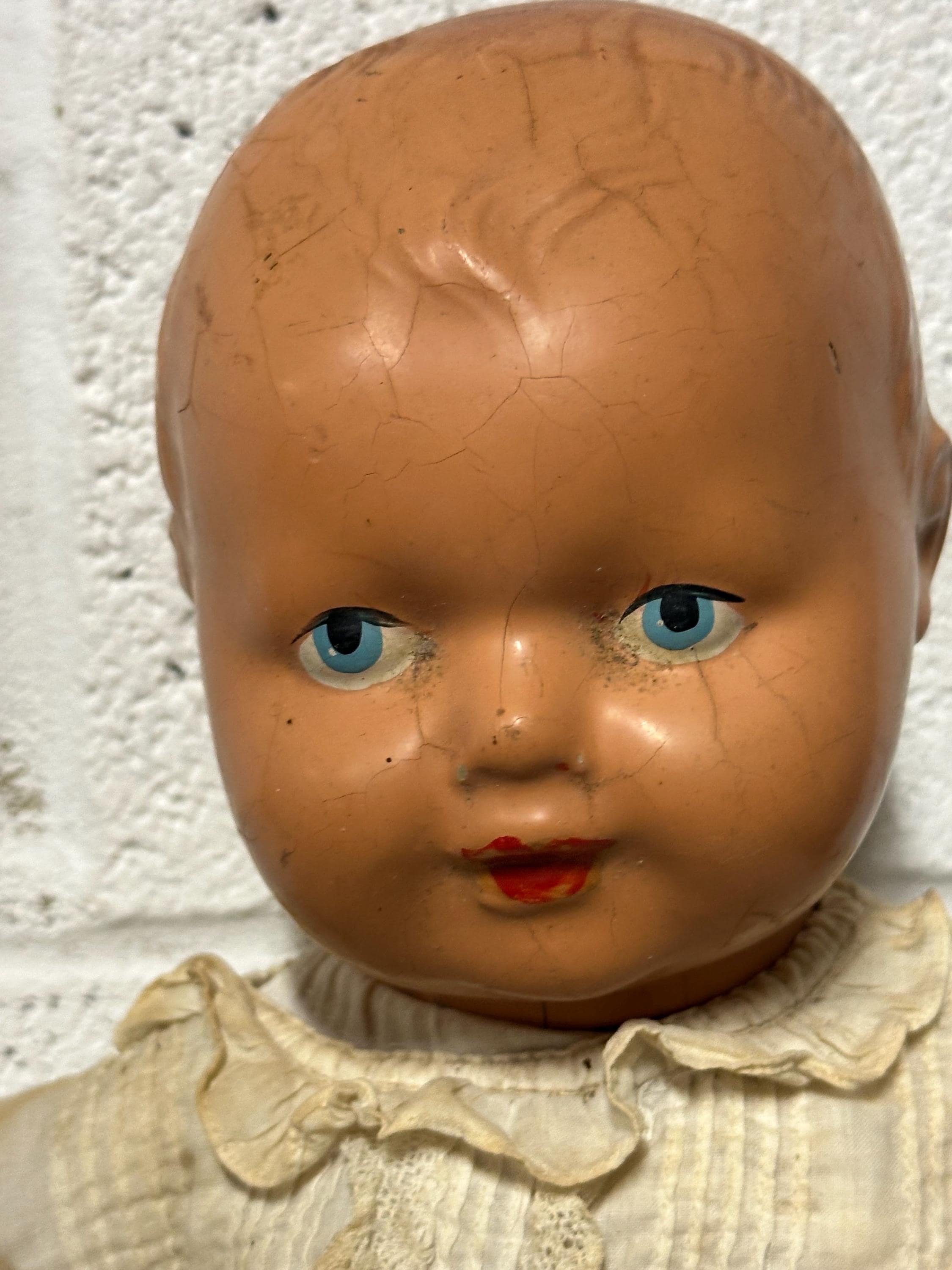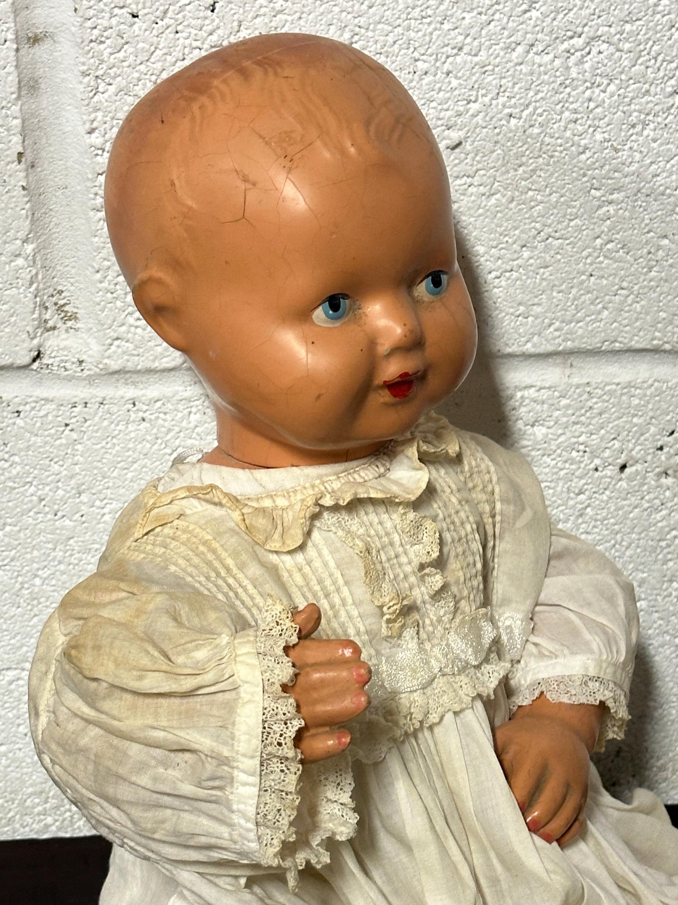 A charming vintage composition baby doll, dressed in a beautiful long antique christening gown with delicate lace and embroidered detail. The doll has painted features and a softly modelled face typical of early 20th-century design.