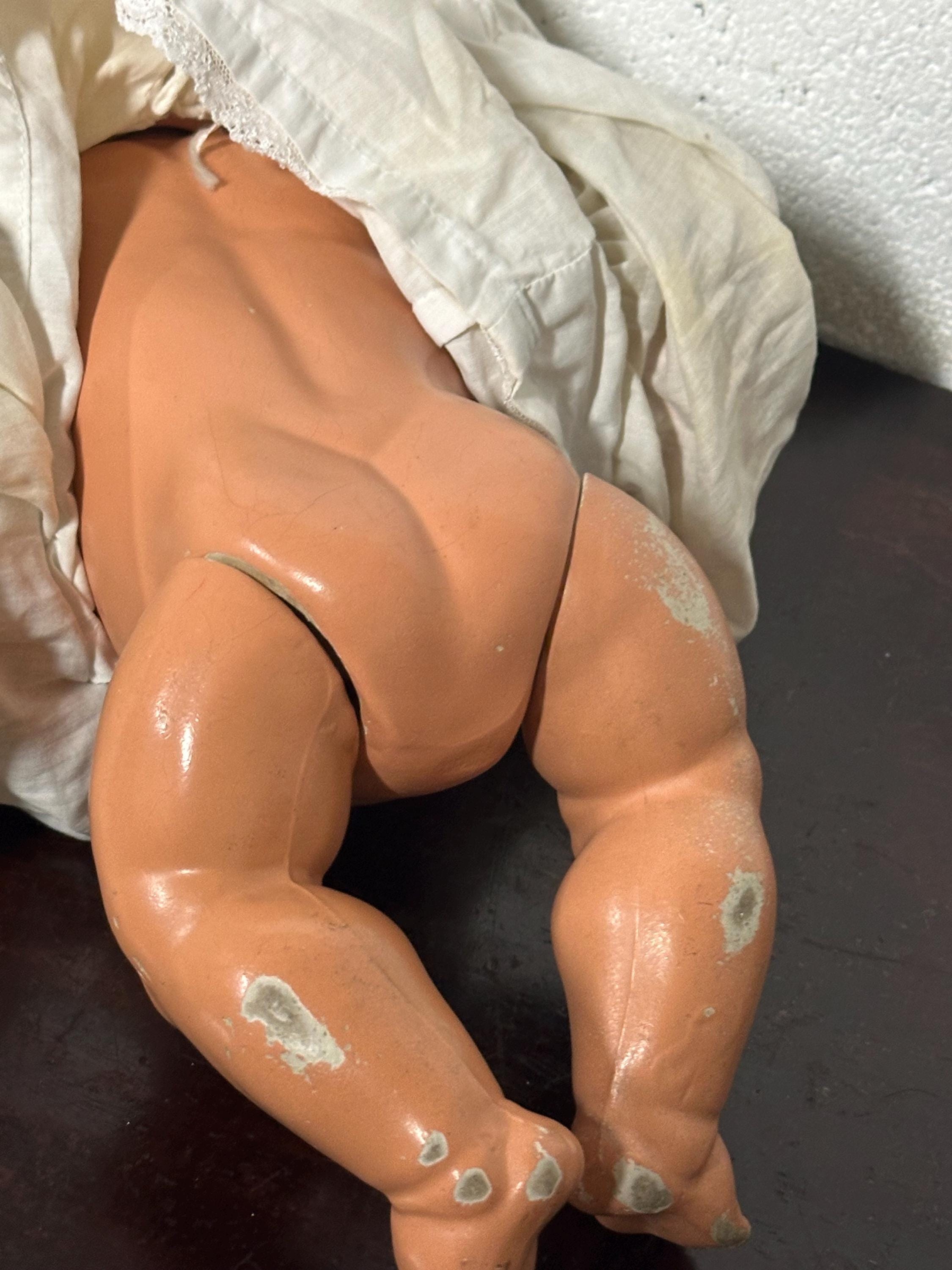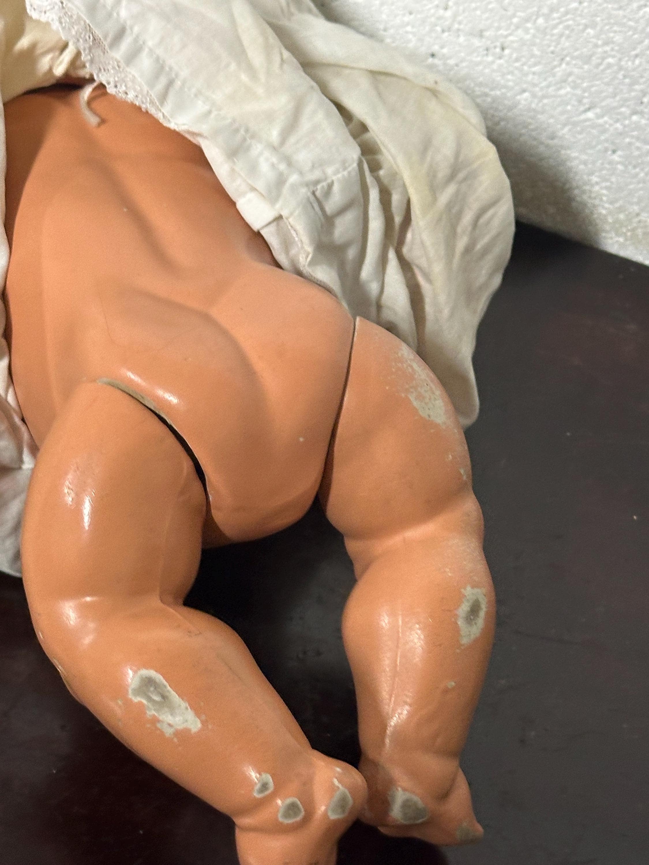 Condition: The doll shows signs of age and play, with some wear and surface marks to the head and legs and clothing consistent with age. No major damage visible. Please see all photos provided