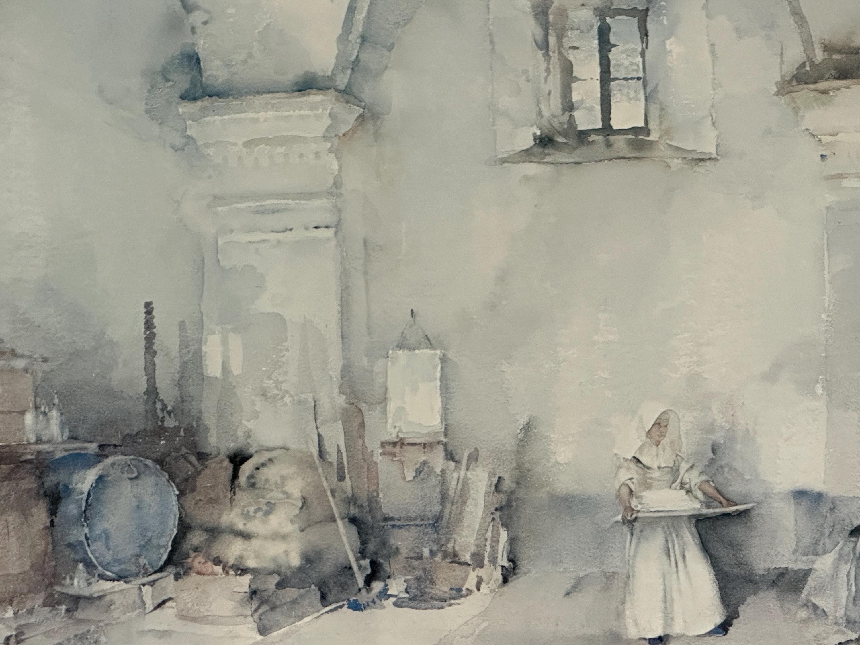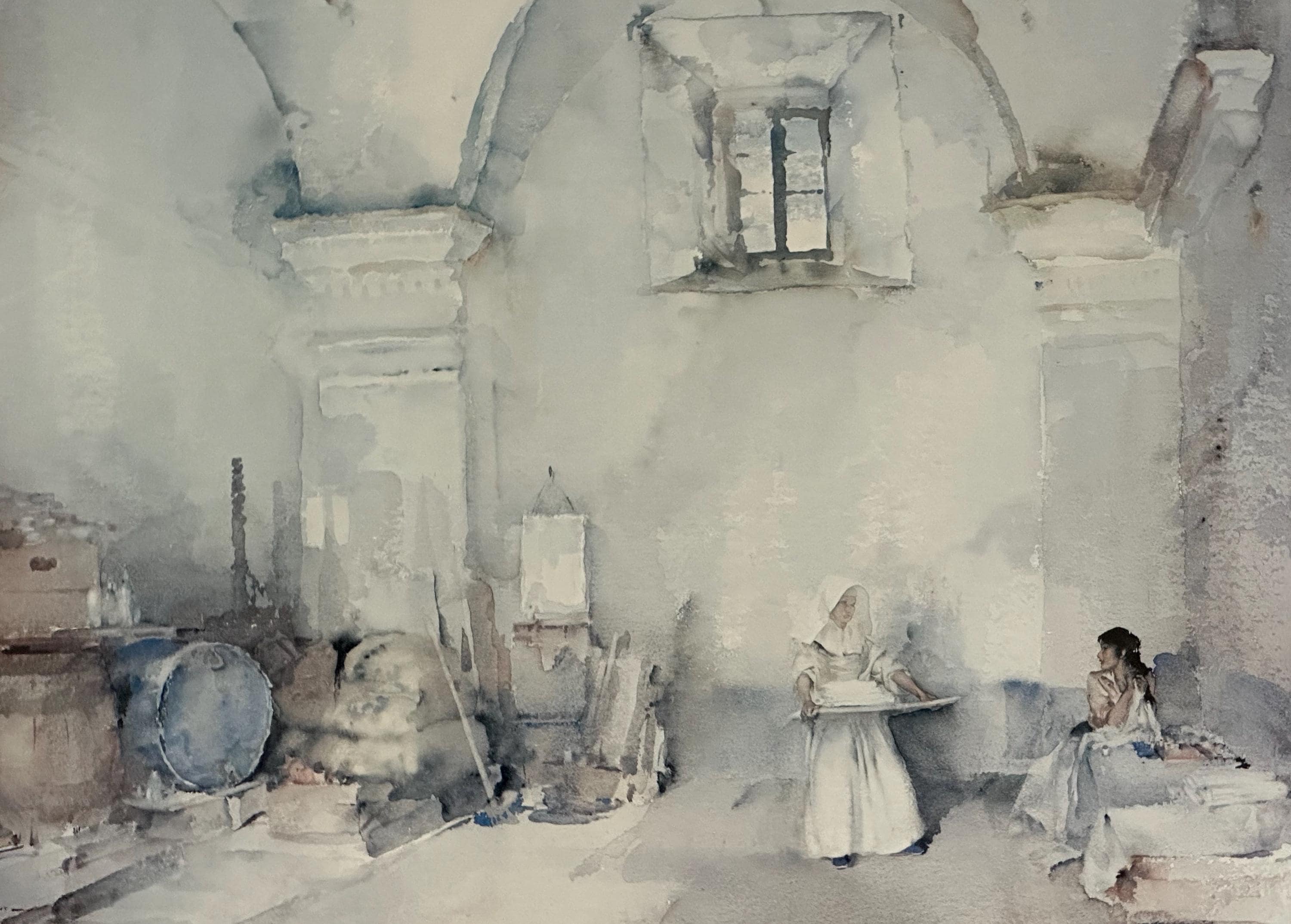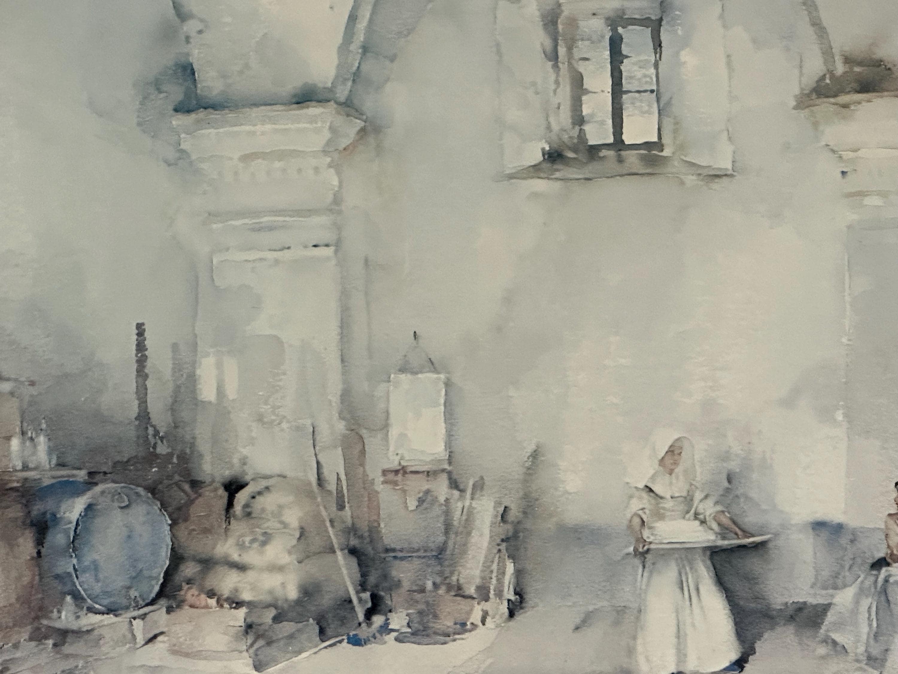 This charming scene depicts a quiet interior in Sospel, France, with Flint’s trademark soft, flowing washes and delicate figure study, capturing light, atmosphere and old-world serenity. A highly collected subject by one of the most admired watercolourists of the 20th century.
