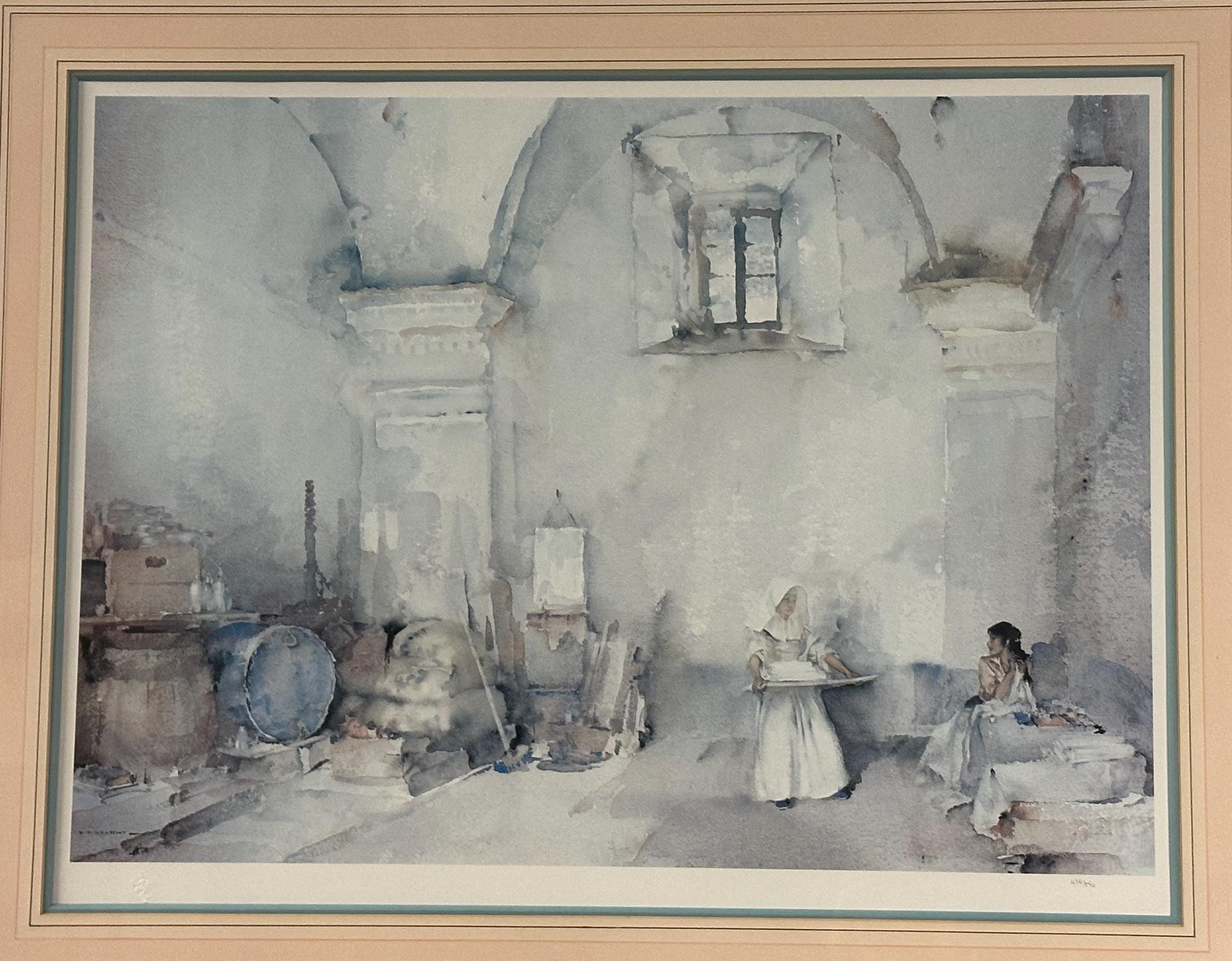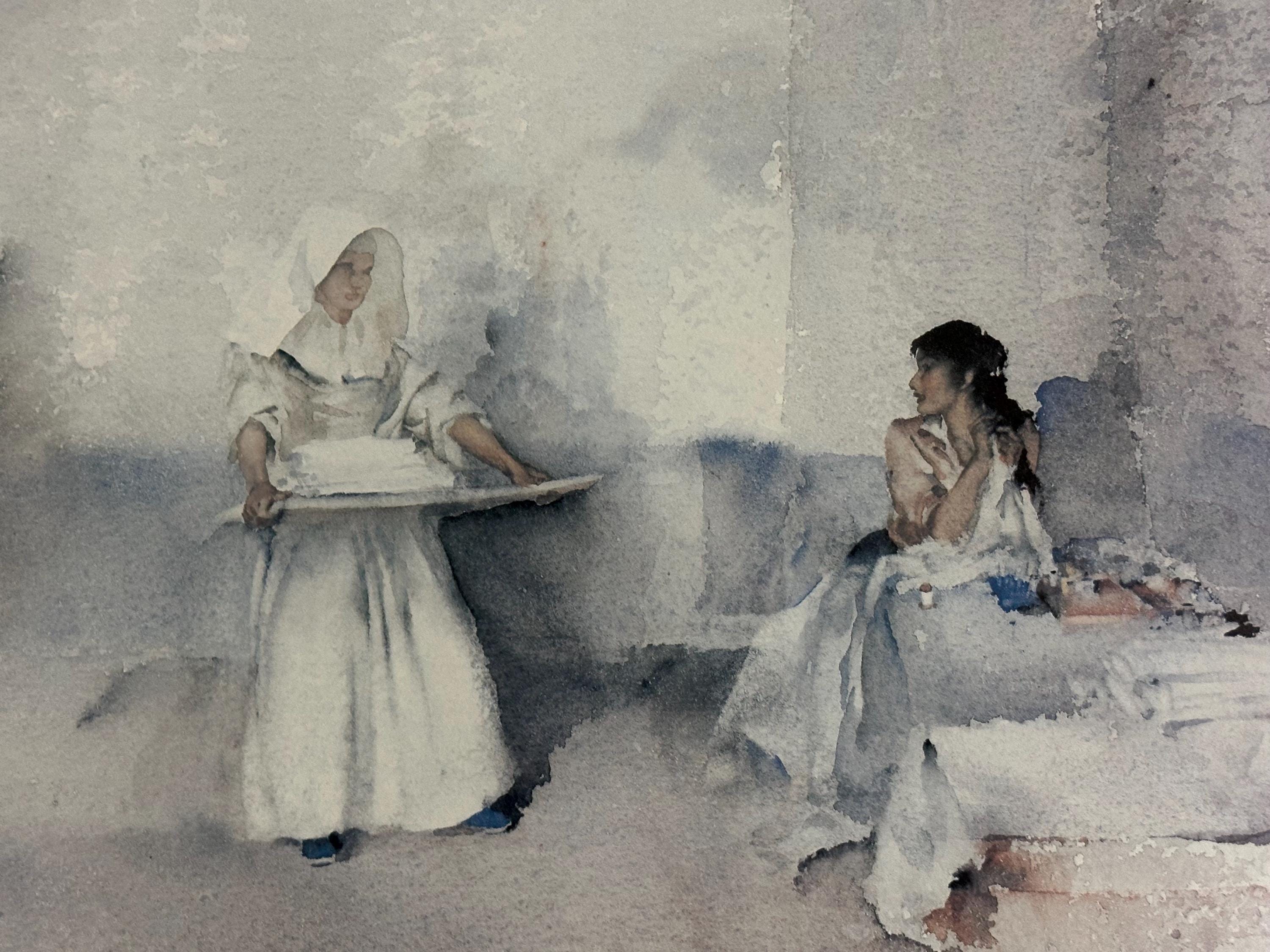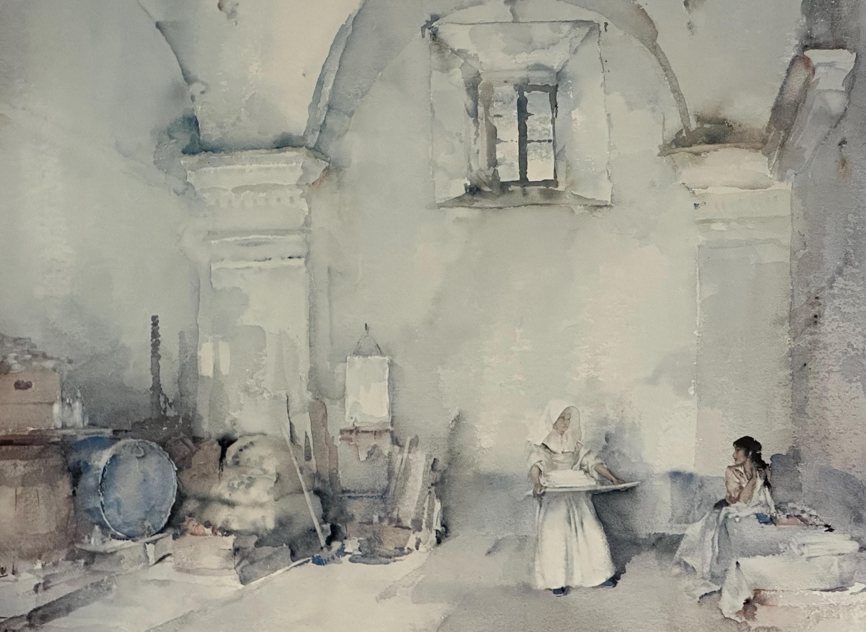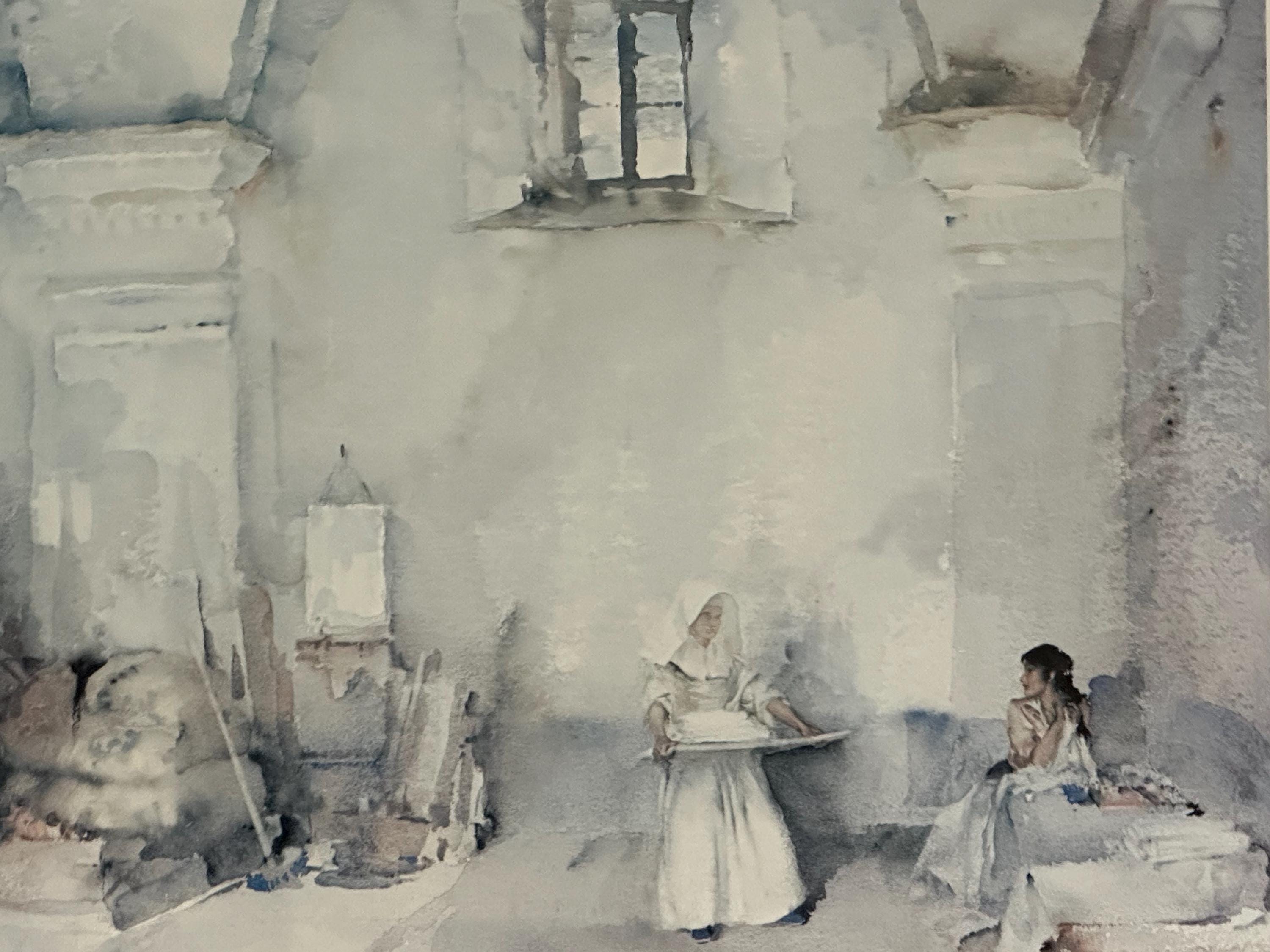 This charming scene depicts a quiet interior in Sospel, France, with Flint’s trademark soft, flowing washes and delicate figure study, capturing light, atmosphere and old-world serenity. A highly collected subject by one of the most admired watercolourists of the 20th century.