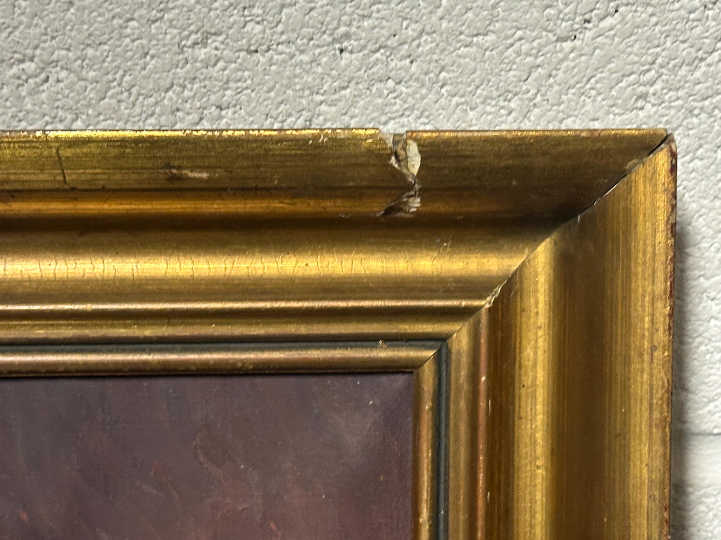 This is an original piece of artwork mounted in a gilt unglazed frame with label verso and the frame measures approx 42 x 27cm and has one bit of loss as shown in the last photo.