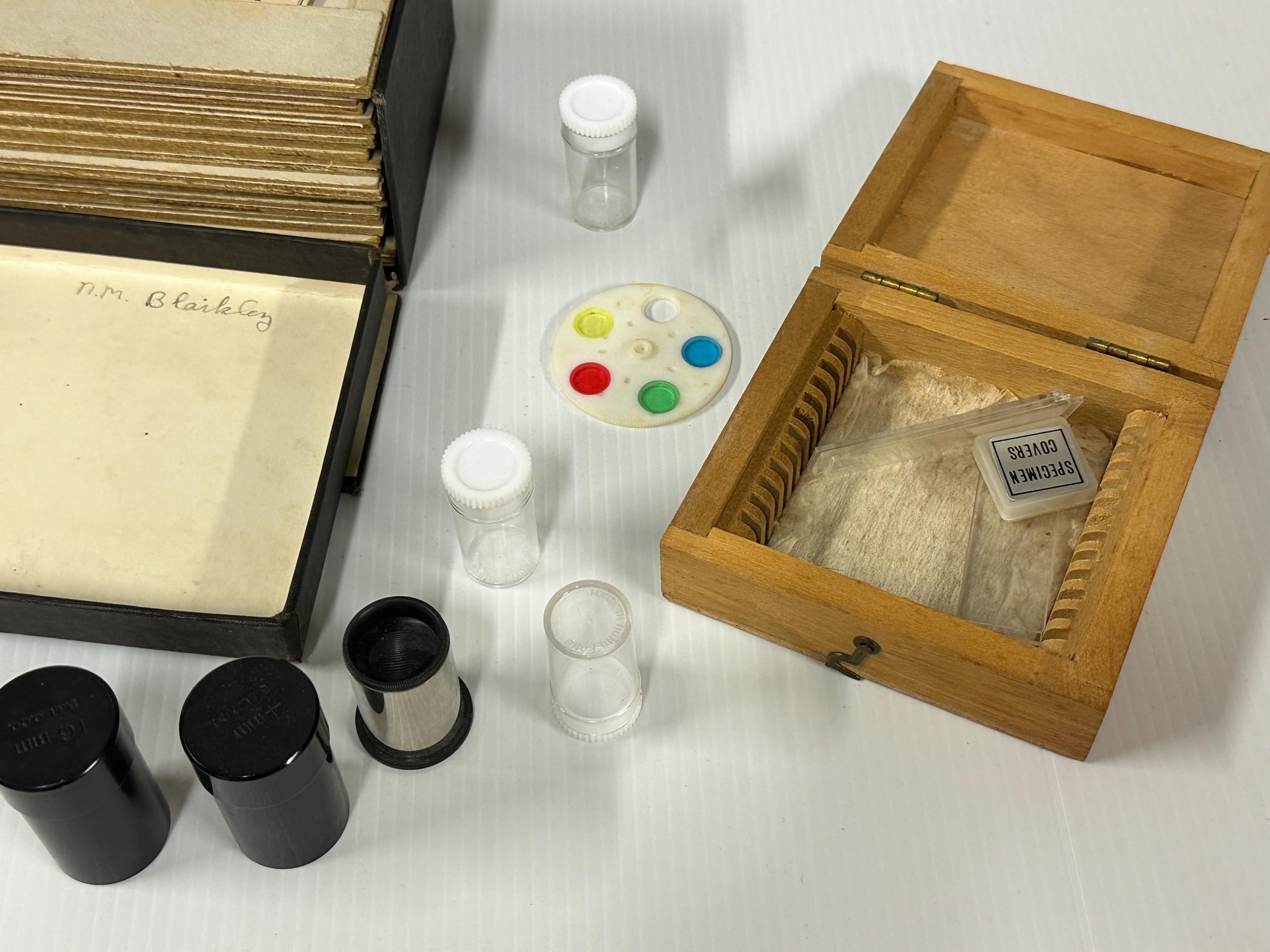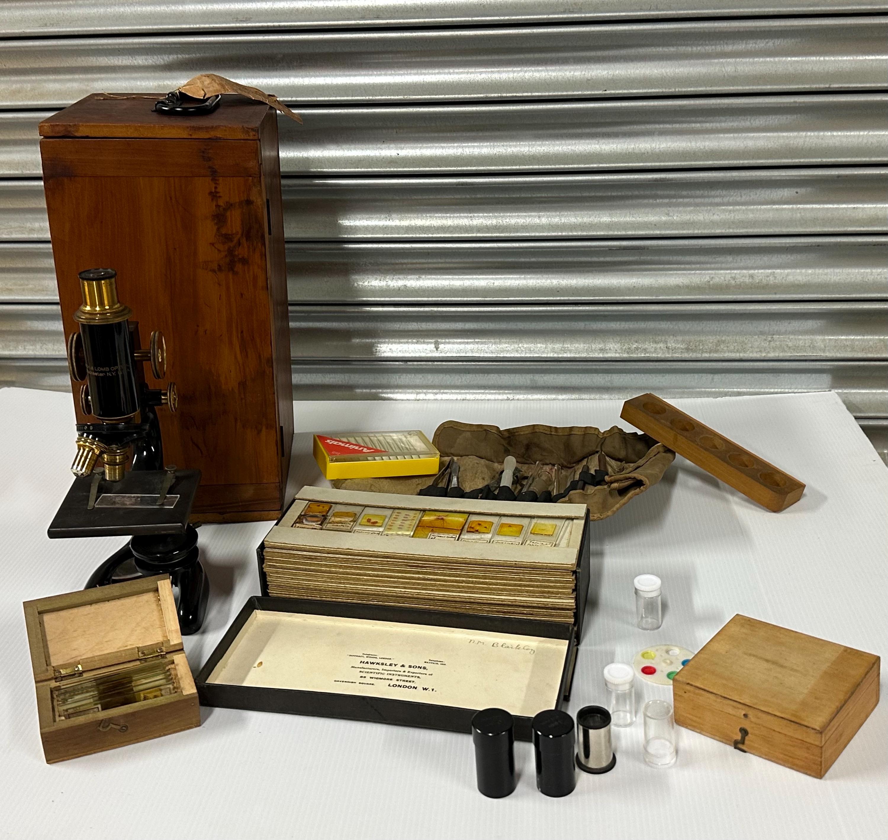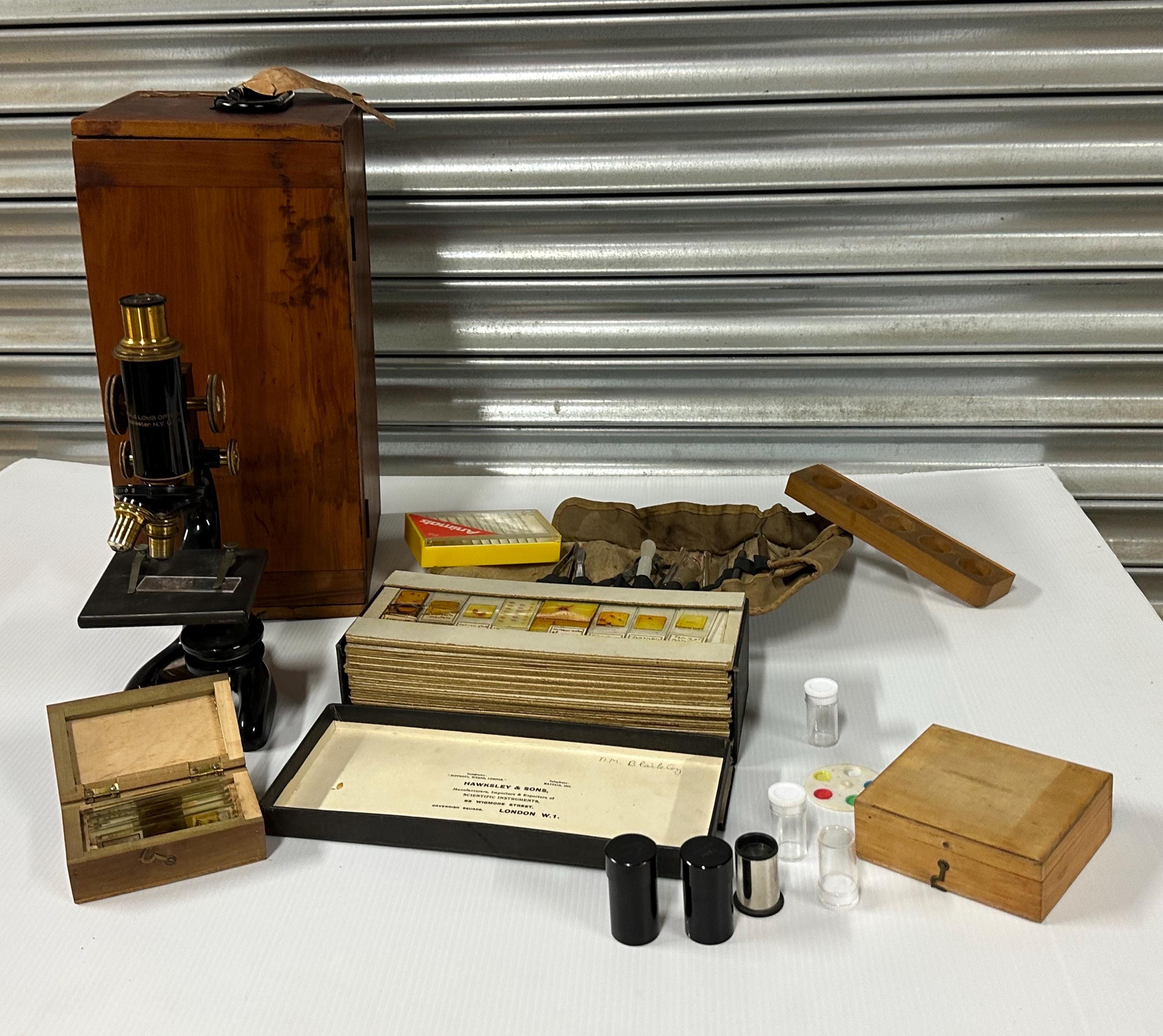 A fantastic opportunity to acquire a vintage Bausch & Lomb microscope complete with its original fitted wooden case and a fascinating collection of 70+ antique prepared specimen slides.