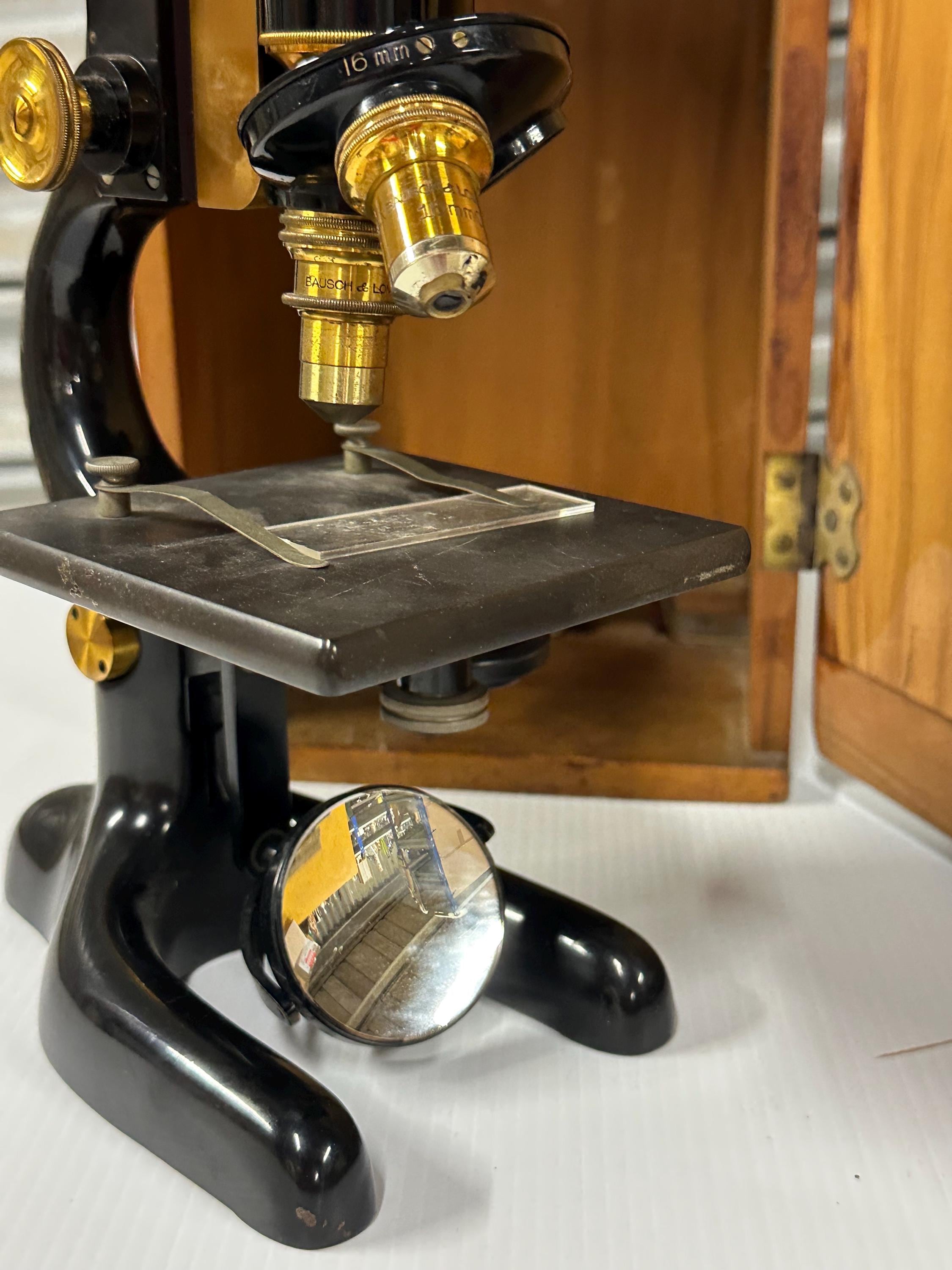 Vintage Bausch & Lomb Brass & Black Microscope in Wooden Case + 70+ Prepared Slides