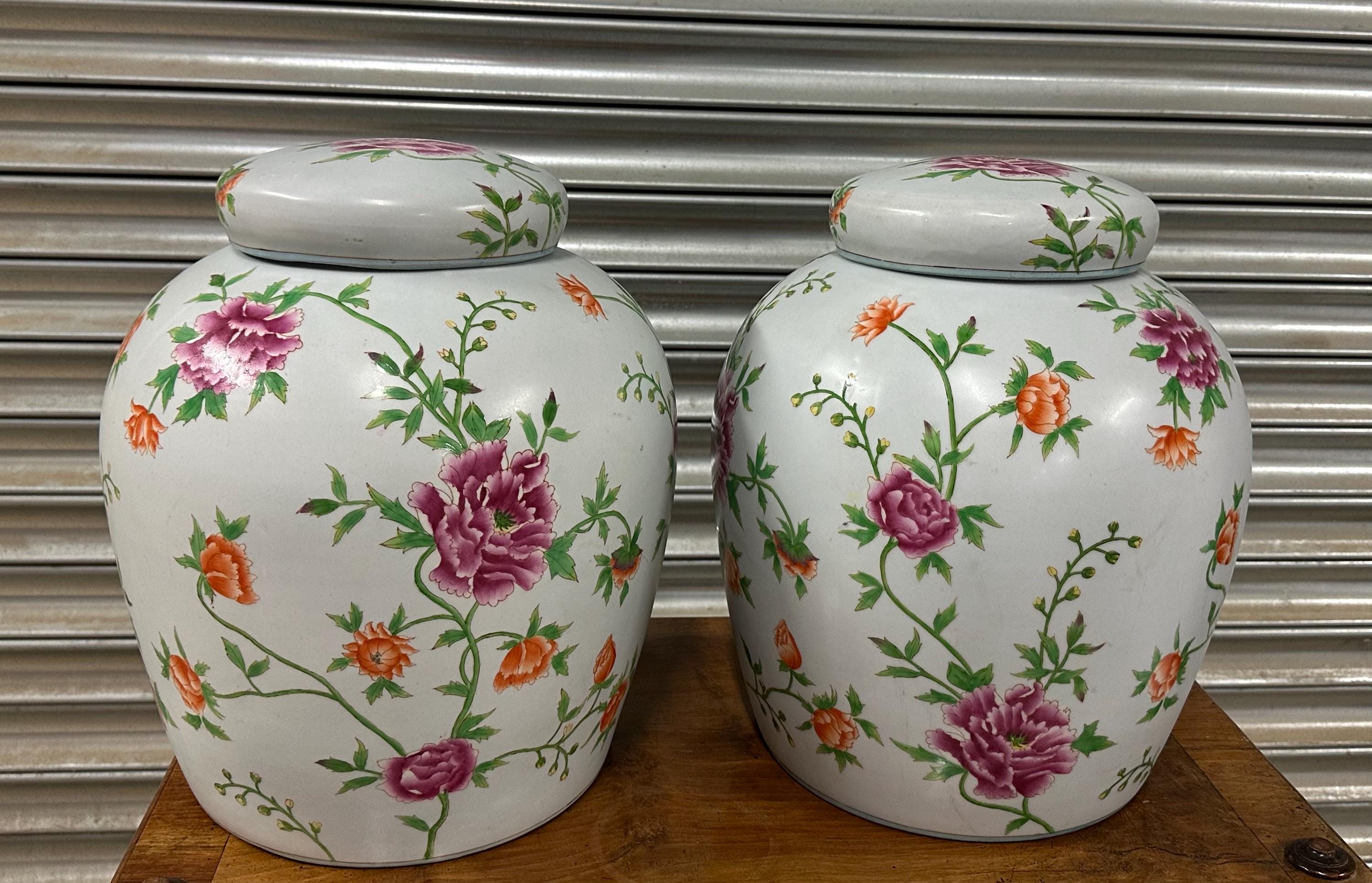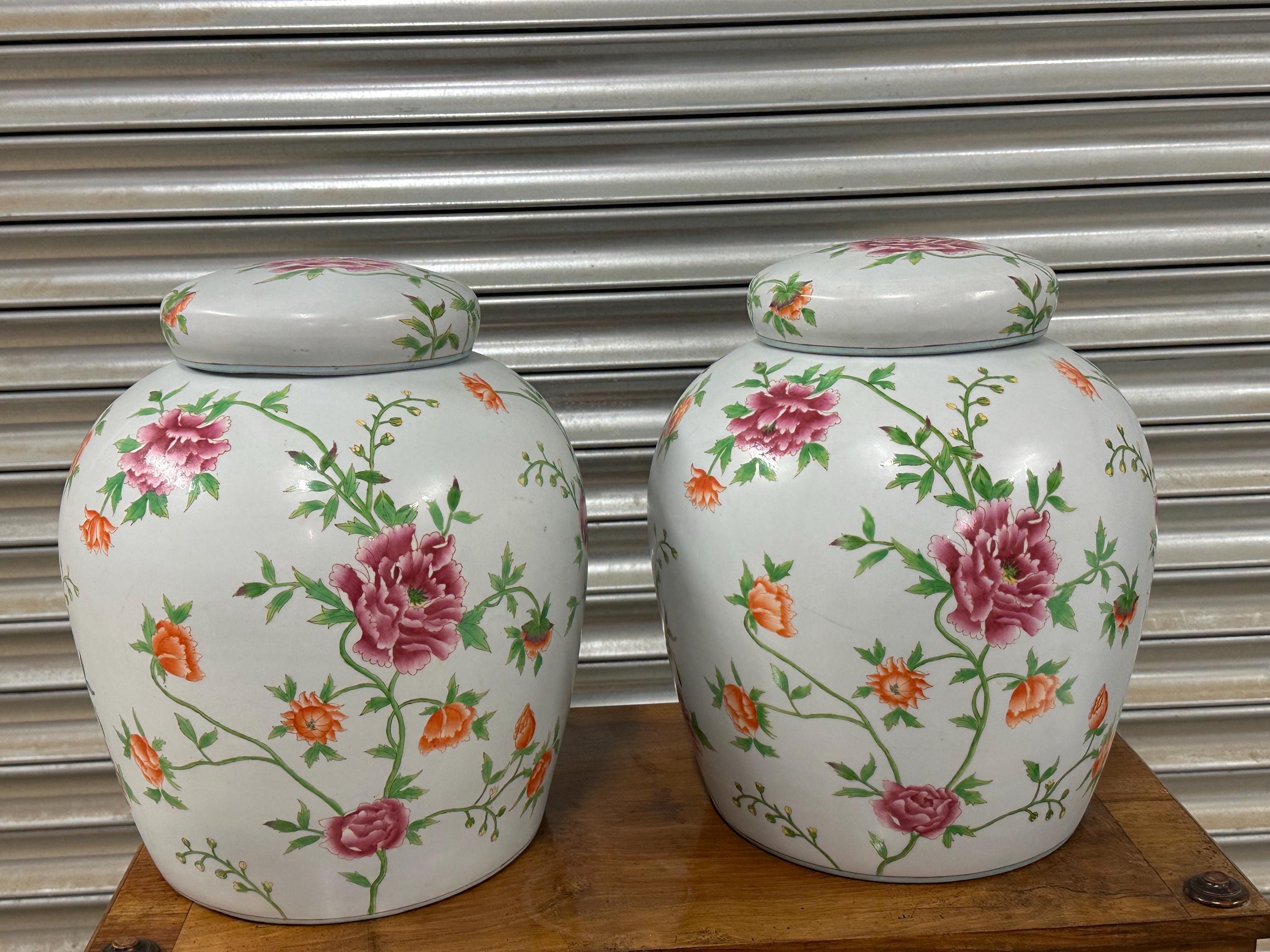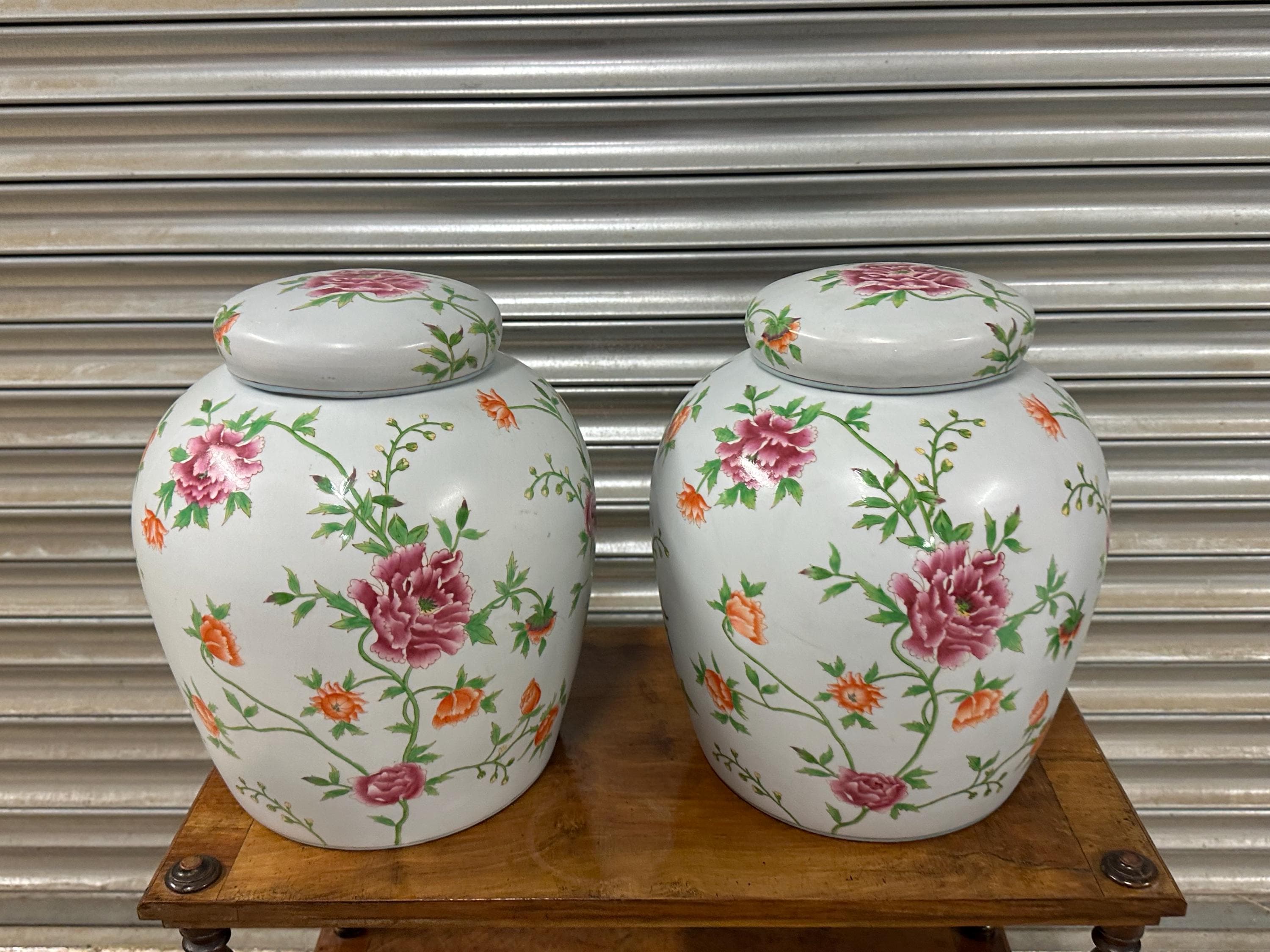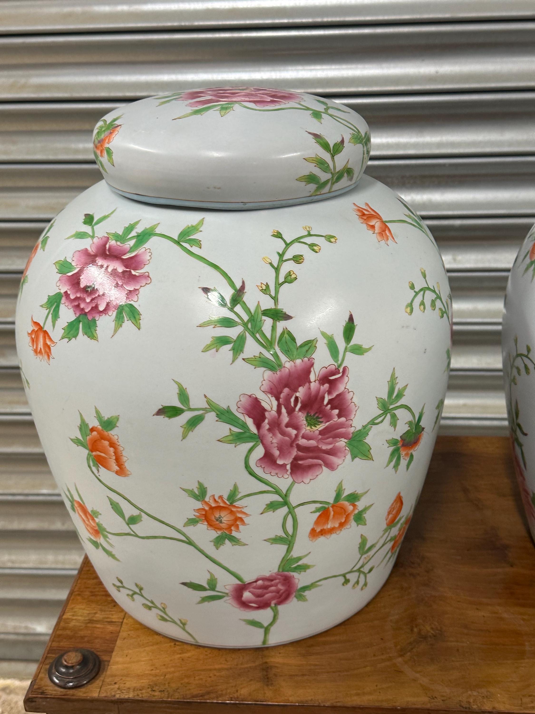 A beautiful matching pair of large lidded ginger jars featuring an elegant hand-painted floral pattern in vibrant shades of pink, orange and green against a white ground. Each jar is decorated with abundant blossoming flowers and leafy vines, giving them a timeless and classic look perfect for a range of interiors – from traditional to modern spaces.