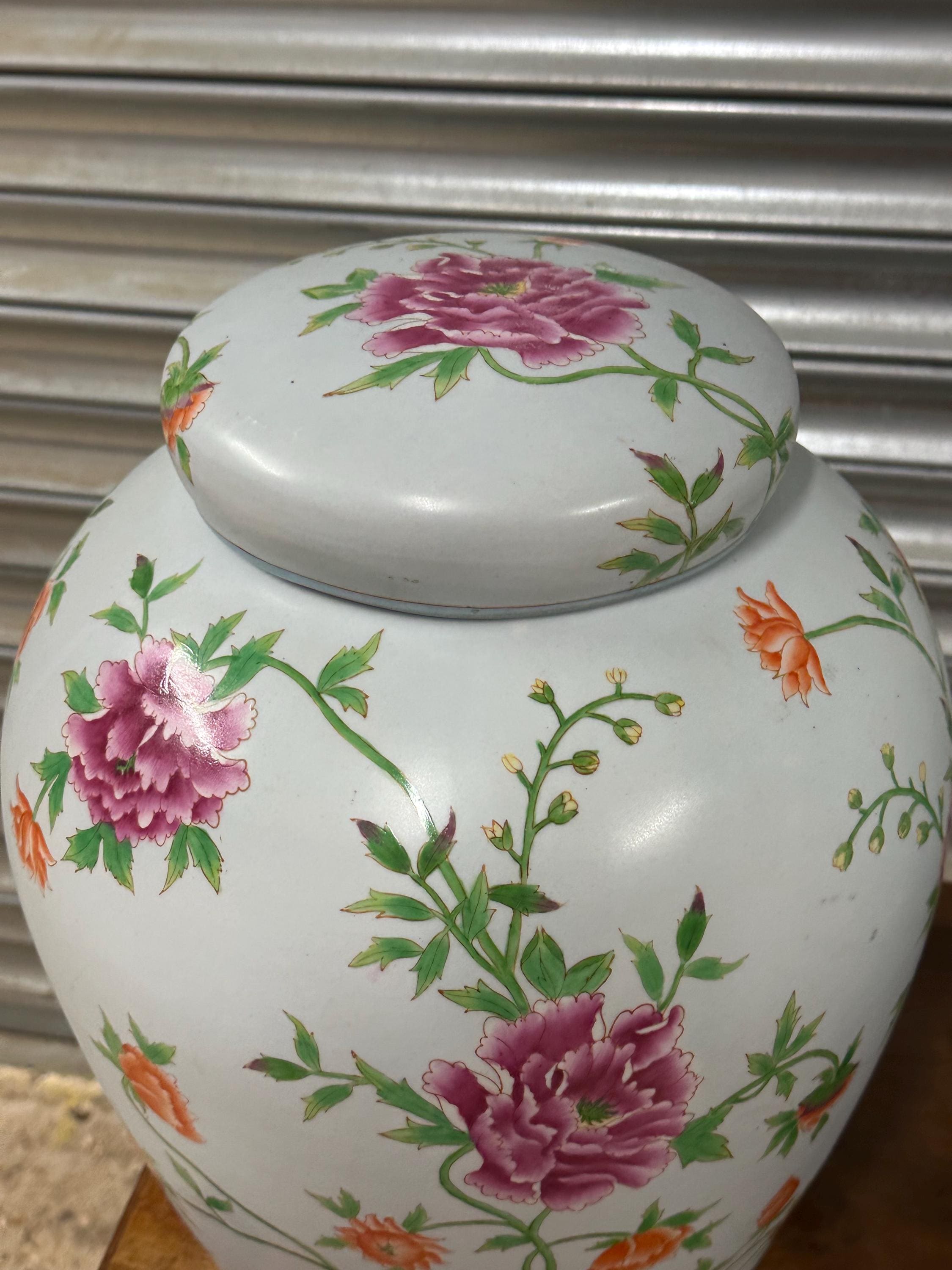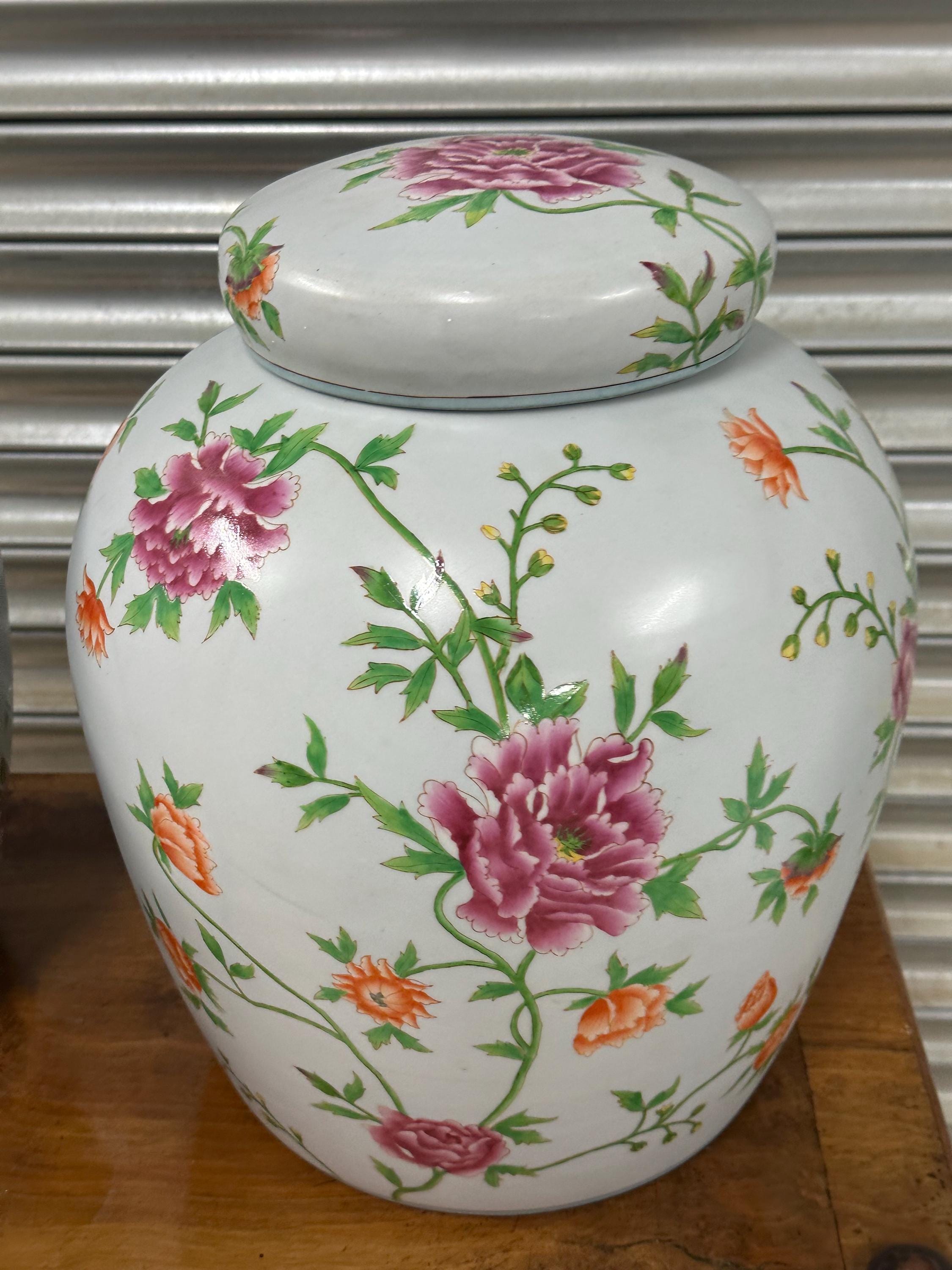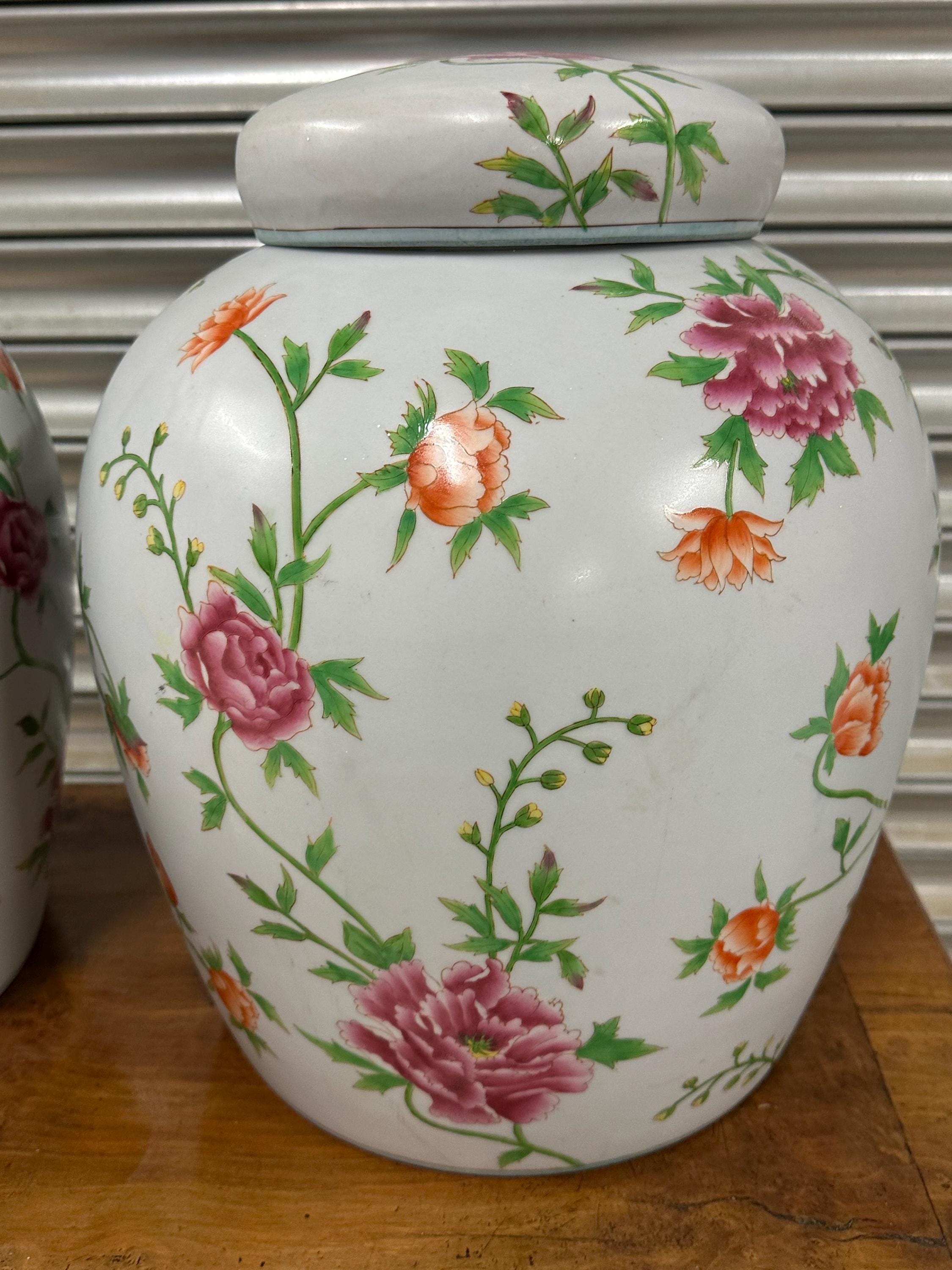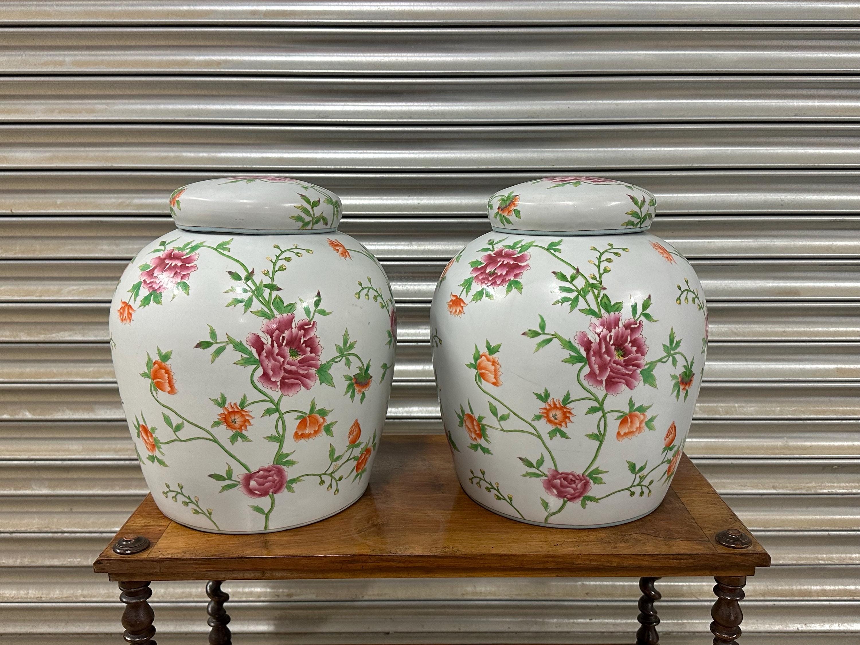 A beautiful matching pair of large lidded ginger jars featuring an elegant hand-painted floral pattern in vibrant shades of pink, orange and green against a white ground. Each jar is decorated with abundant blossoming flowers and leafy vines, giving them a timeless and classic look perfect for a range of interiors – from traditional to modern spaces.