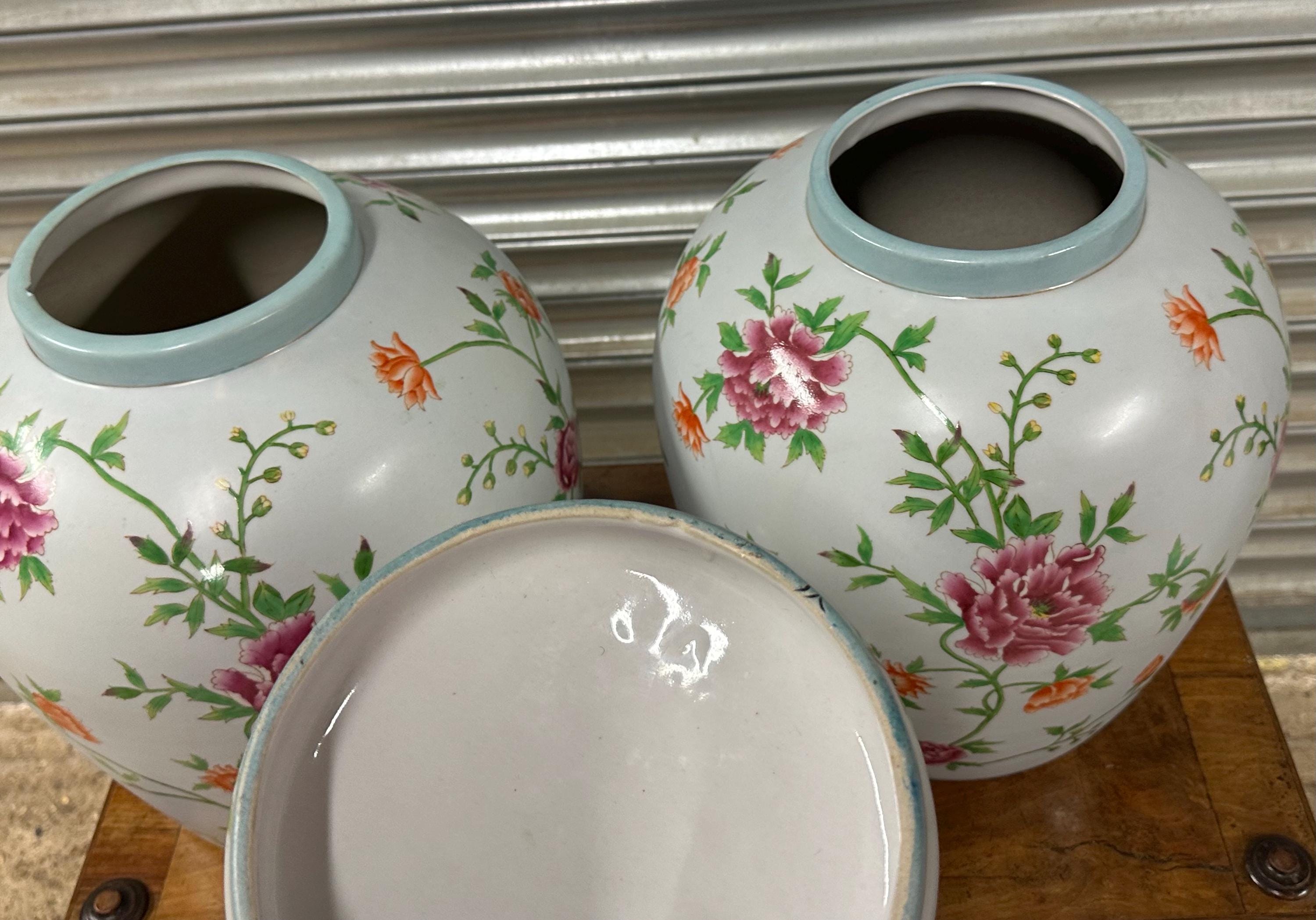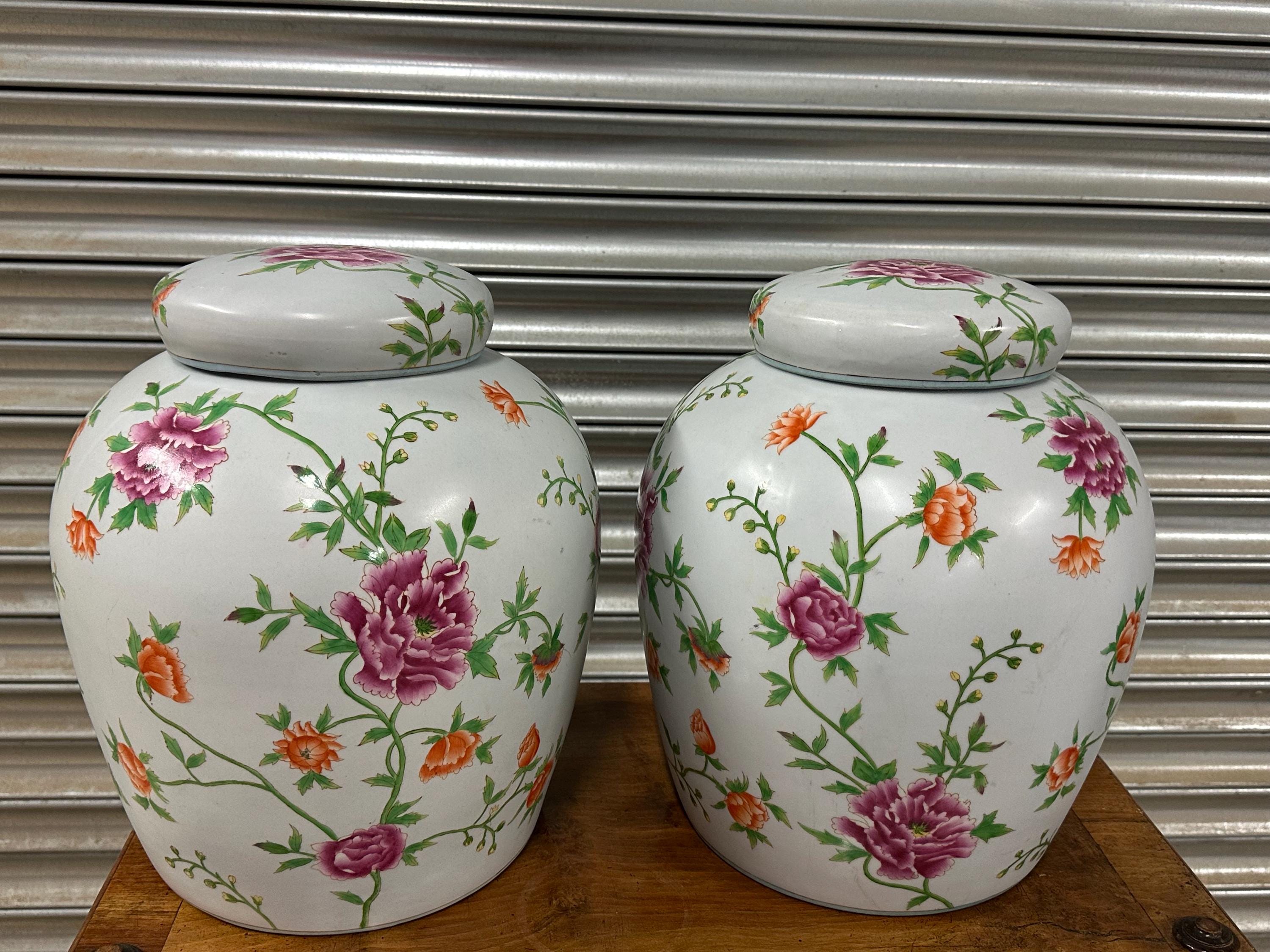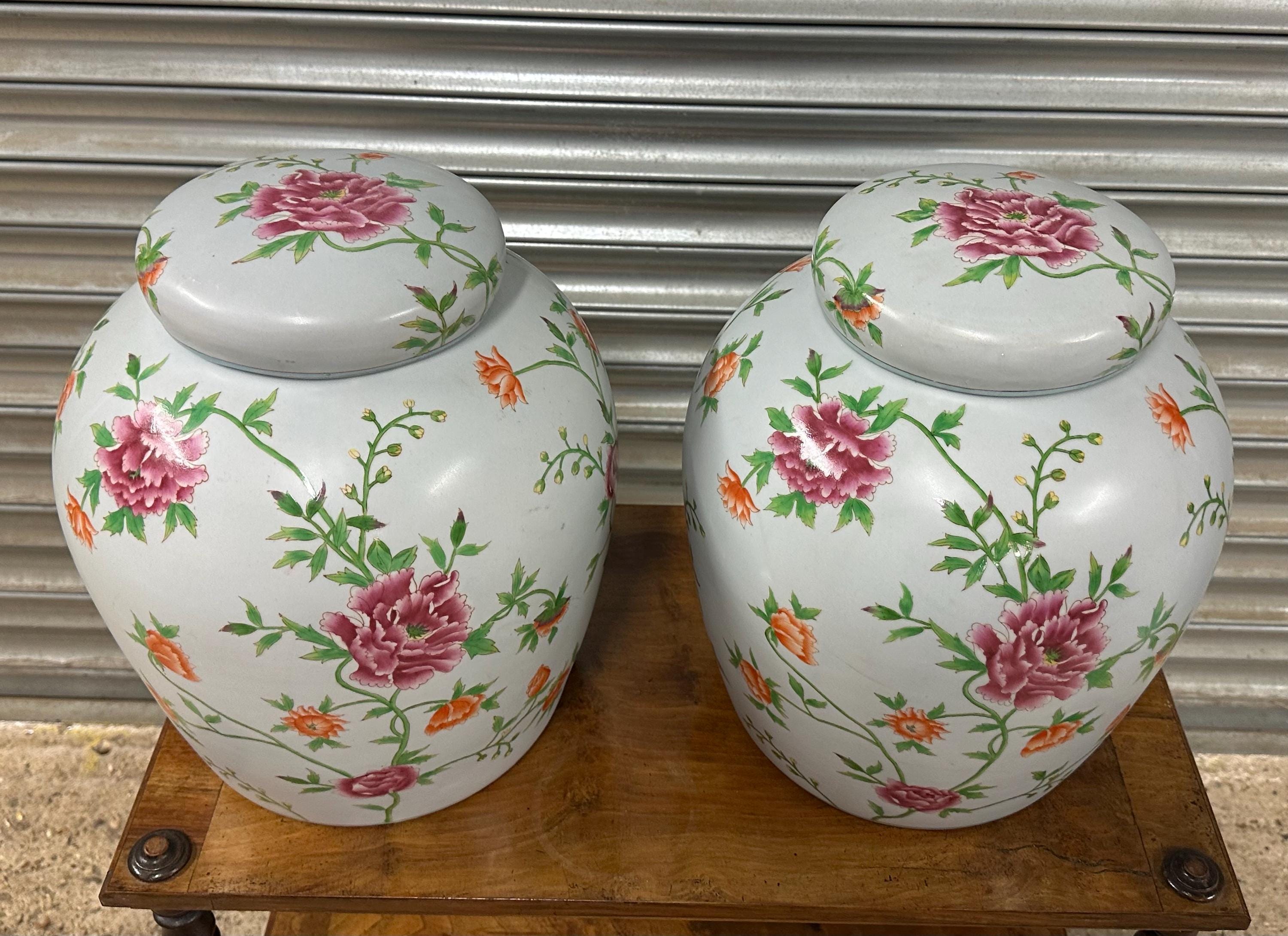 Very Large Pair of Decorative Lidded Ginger Jars – Hand-Painted Floral Design