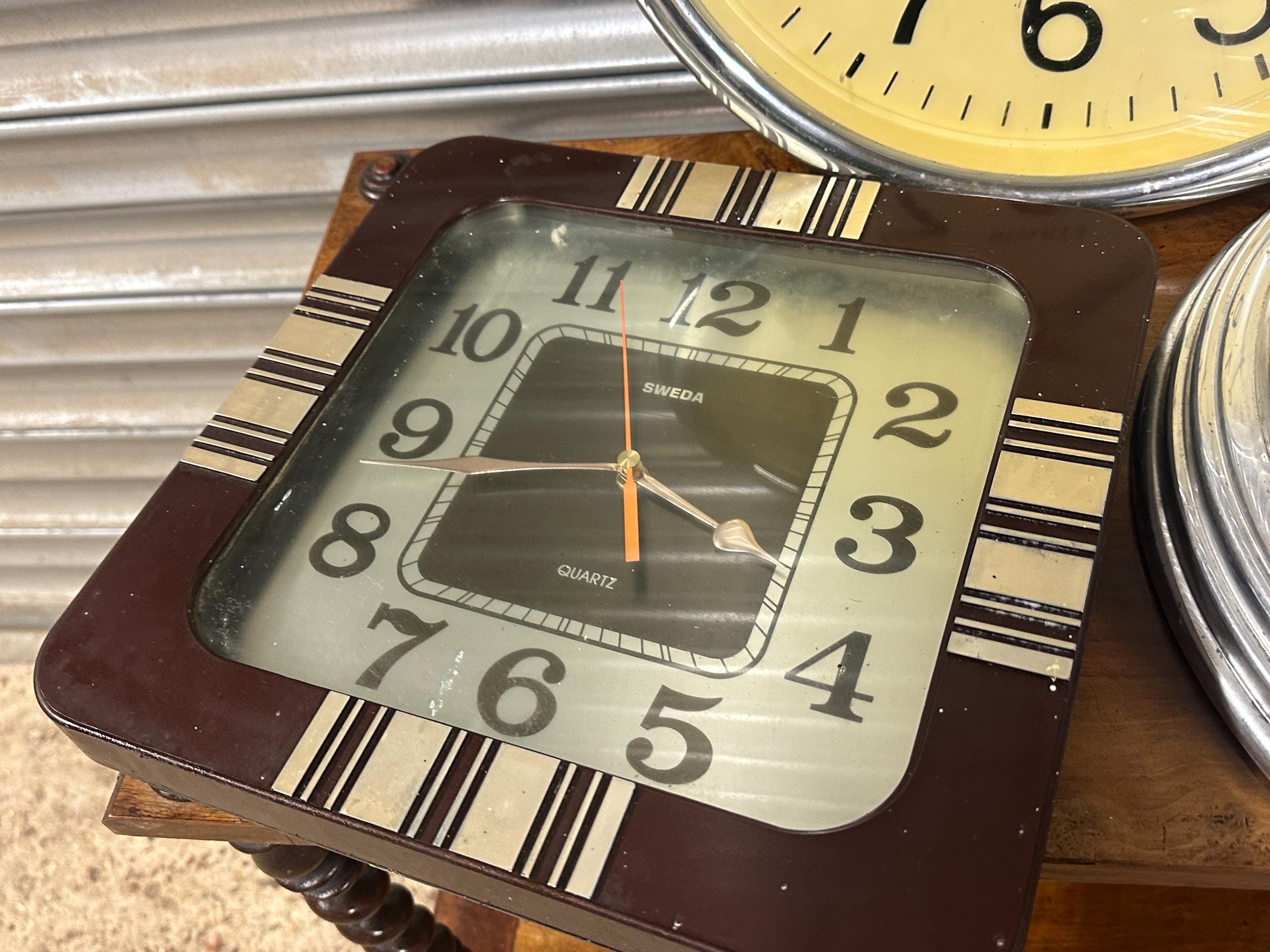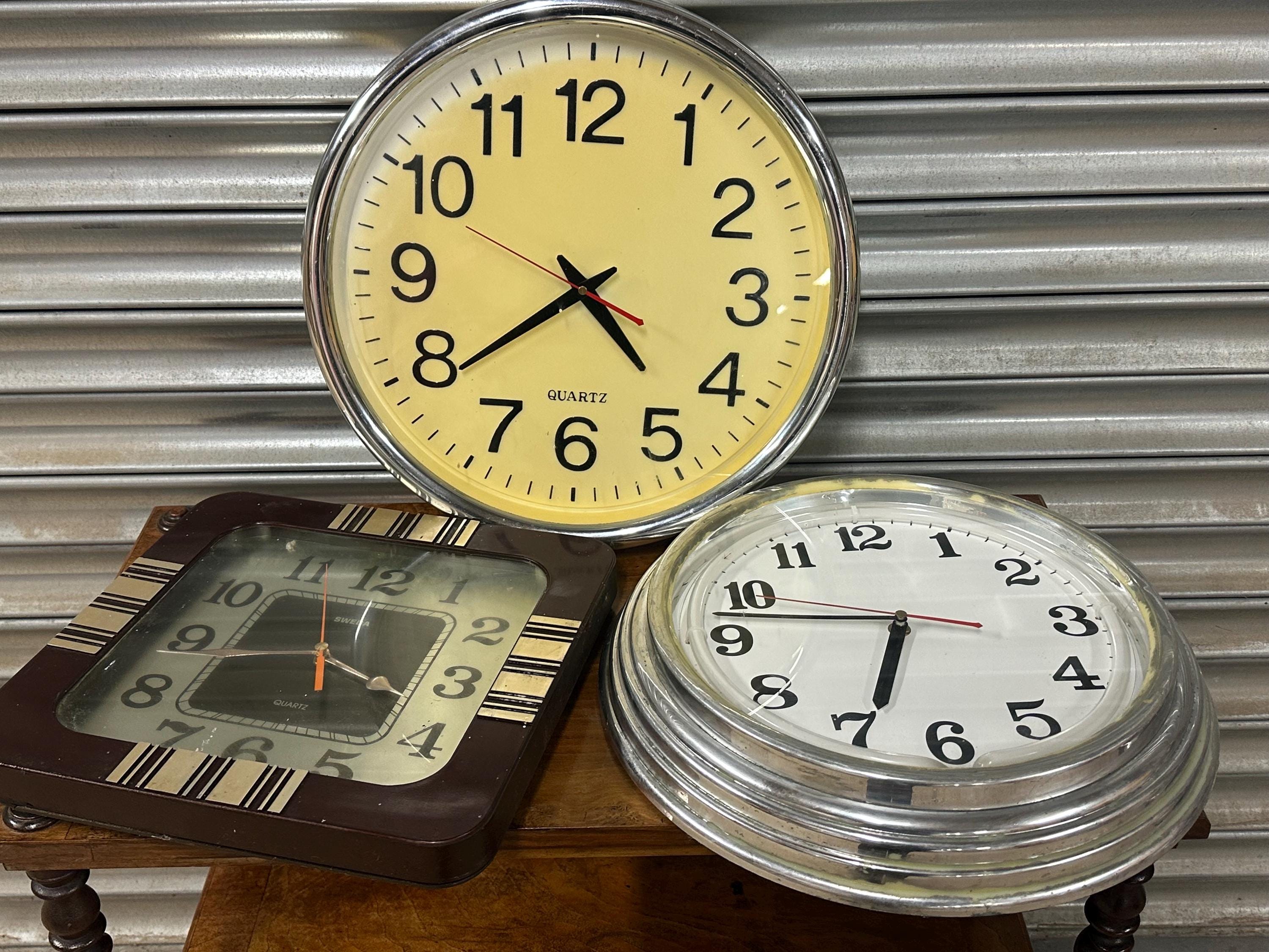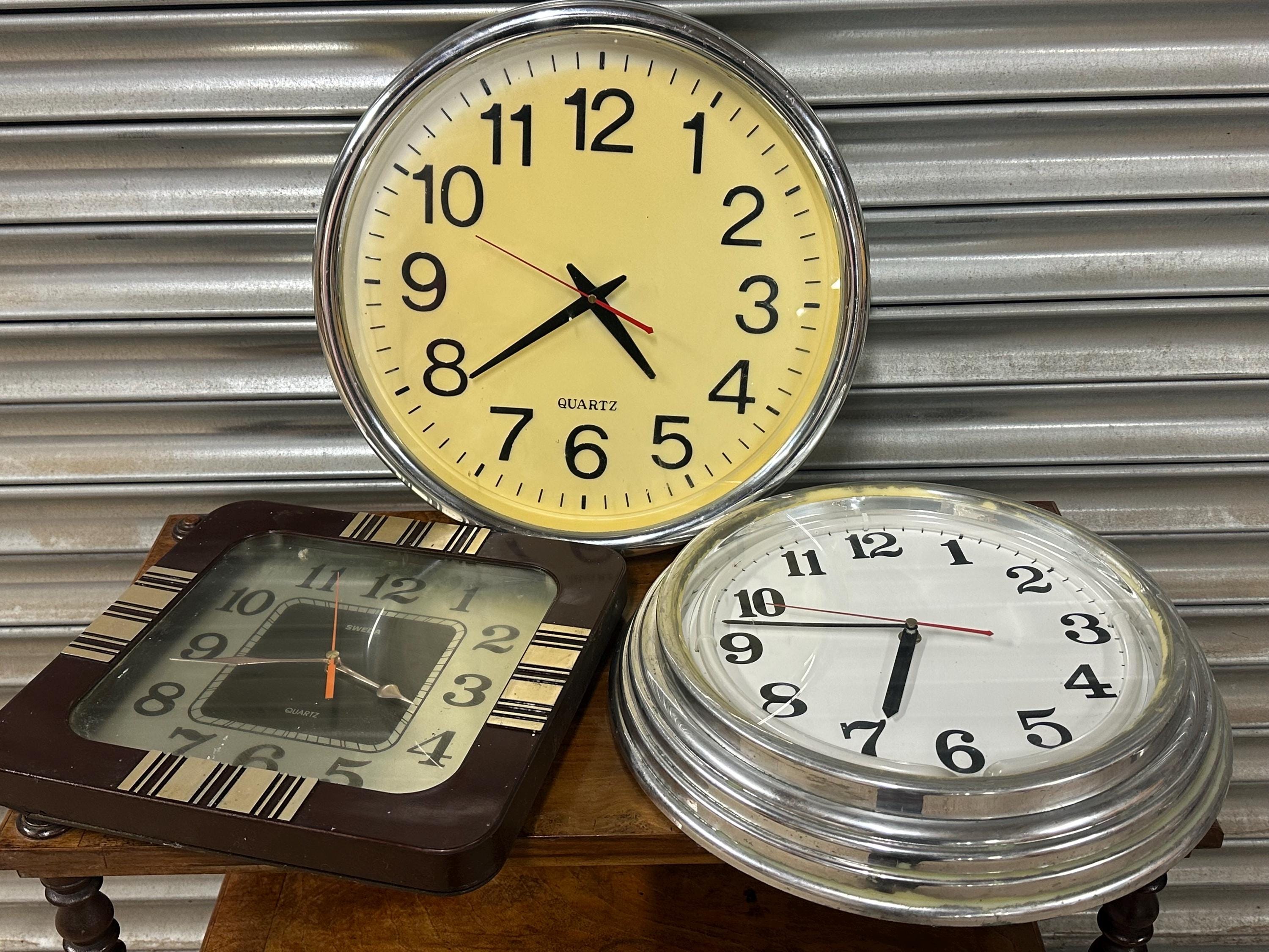 A mixed lot of three vintage wall clocks, ideal for restoration, repurposing, or vintage interior display. Great decorative pieces with classic retro and industrial styling – perfect for collectors, set designers, cafés, shops or anyone who loves vintage timepieces.