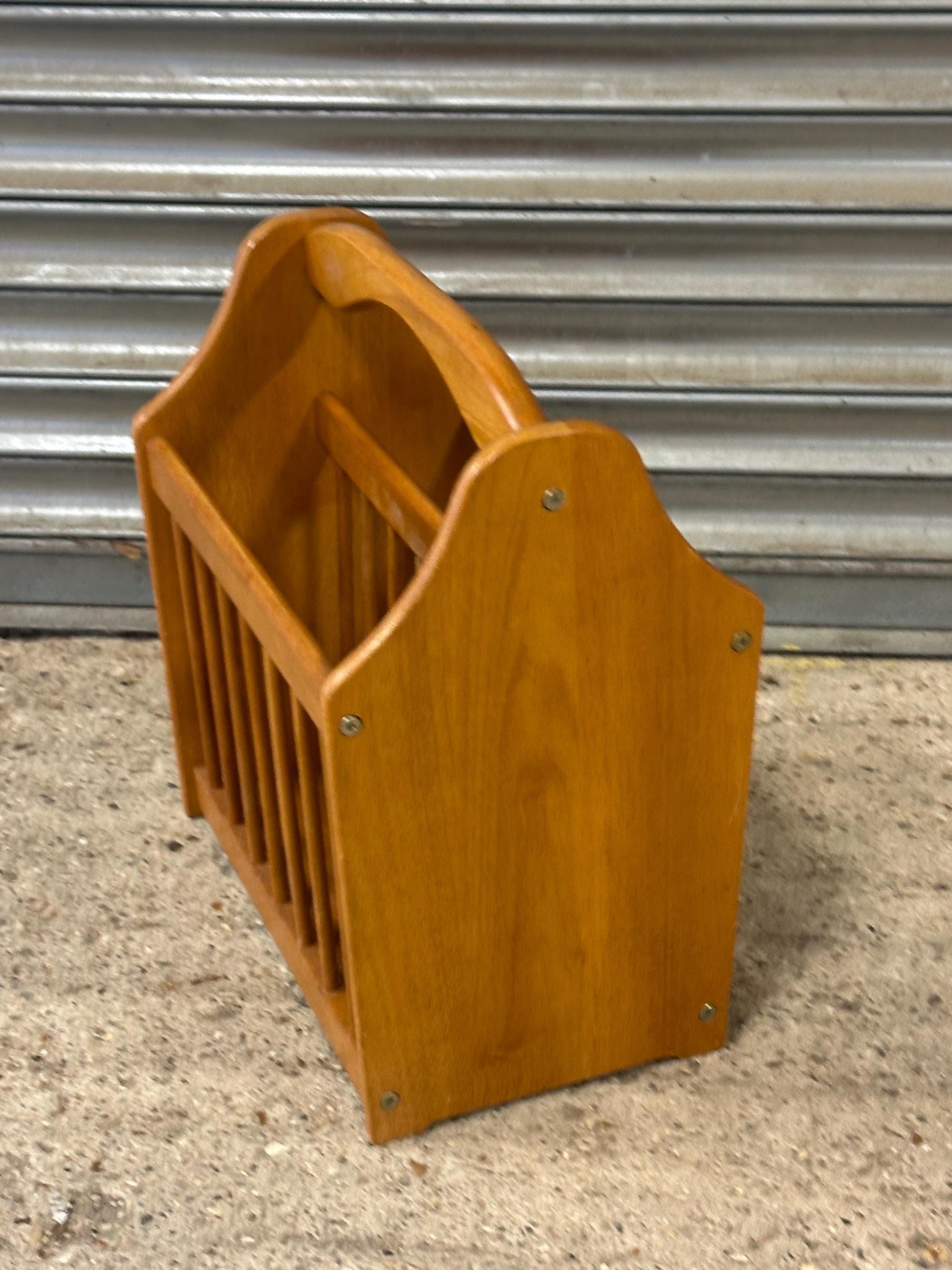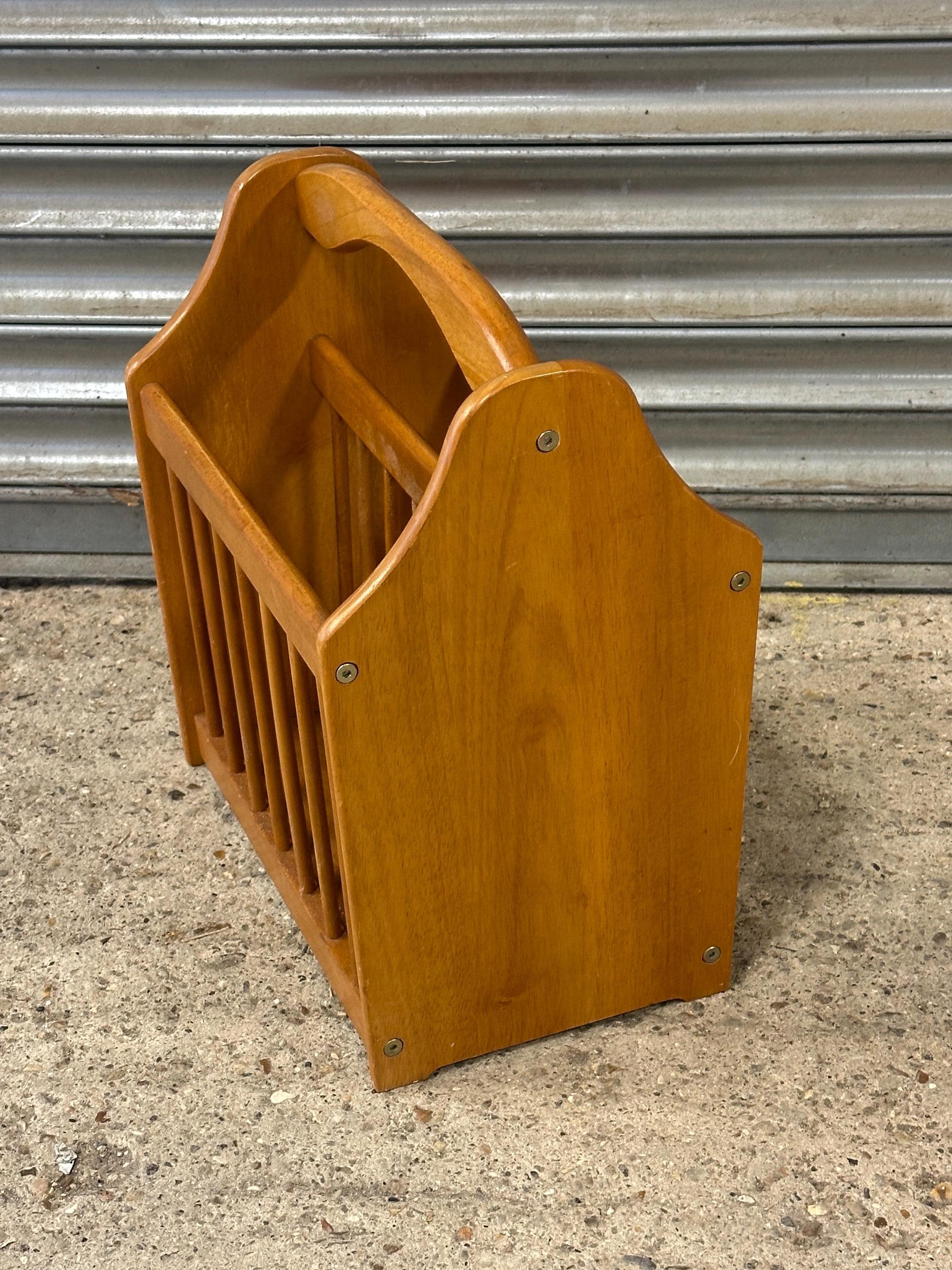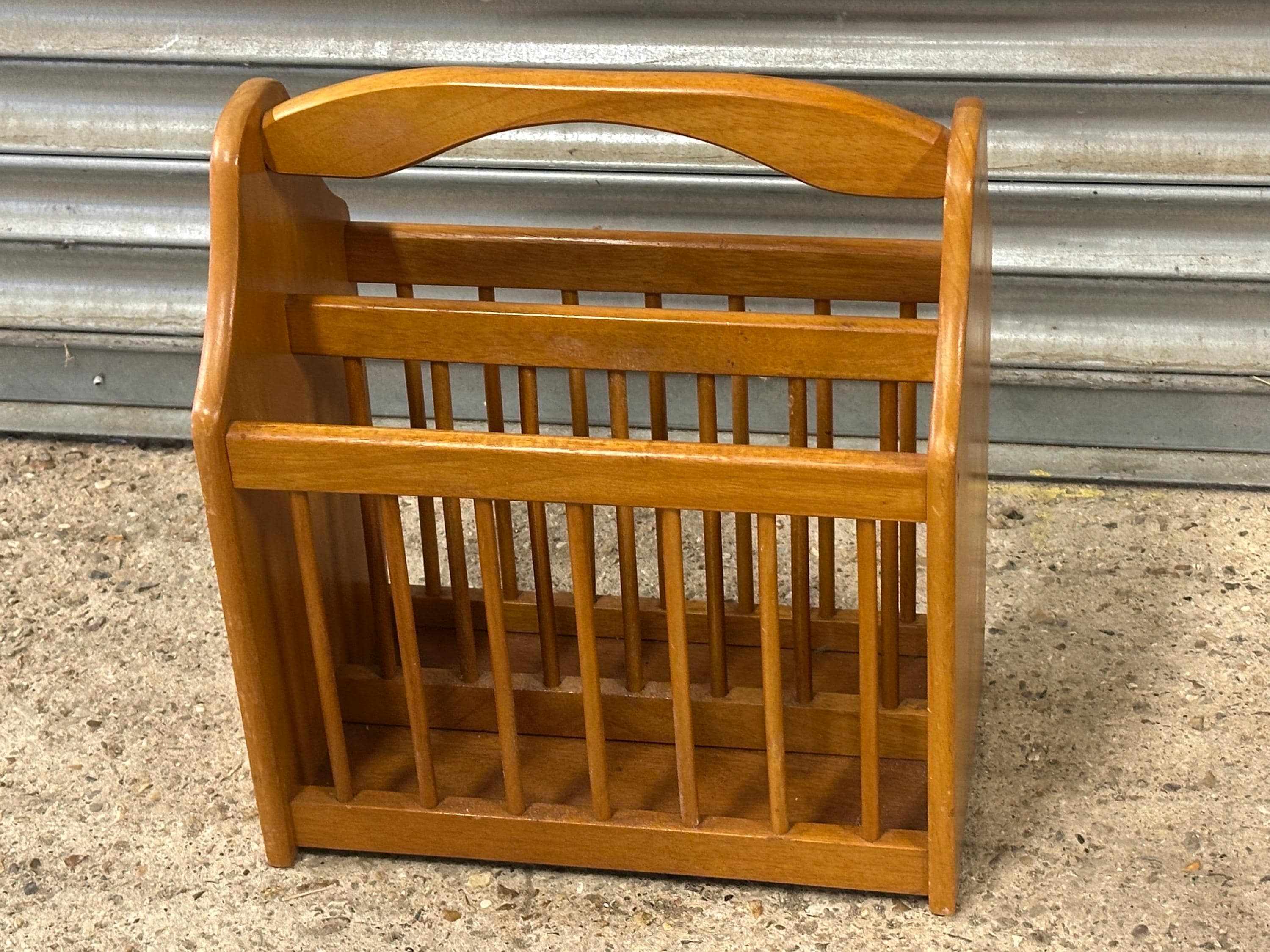 A charming vintage solid-wood magazine rack, perfect for storing newspapers, magazines, books, vinyl records or throws. Beautifully crafted with a warm wood tone finish, turned spindle dividers and a curved carry handle for easy movement. A lovely functional piece that adds character to any home – ideal for a country cottage, mid-century, farmhouse or traditional interior.