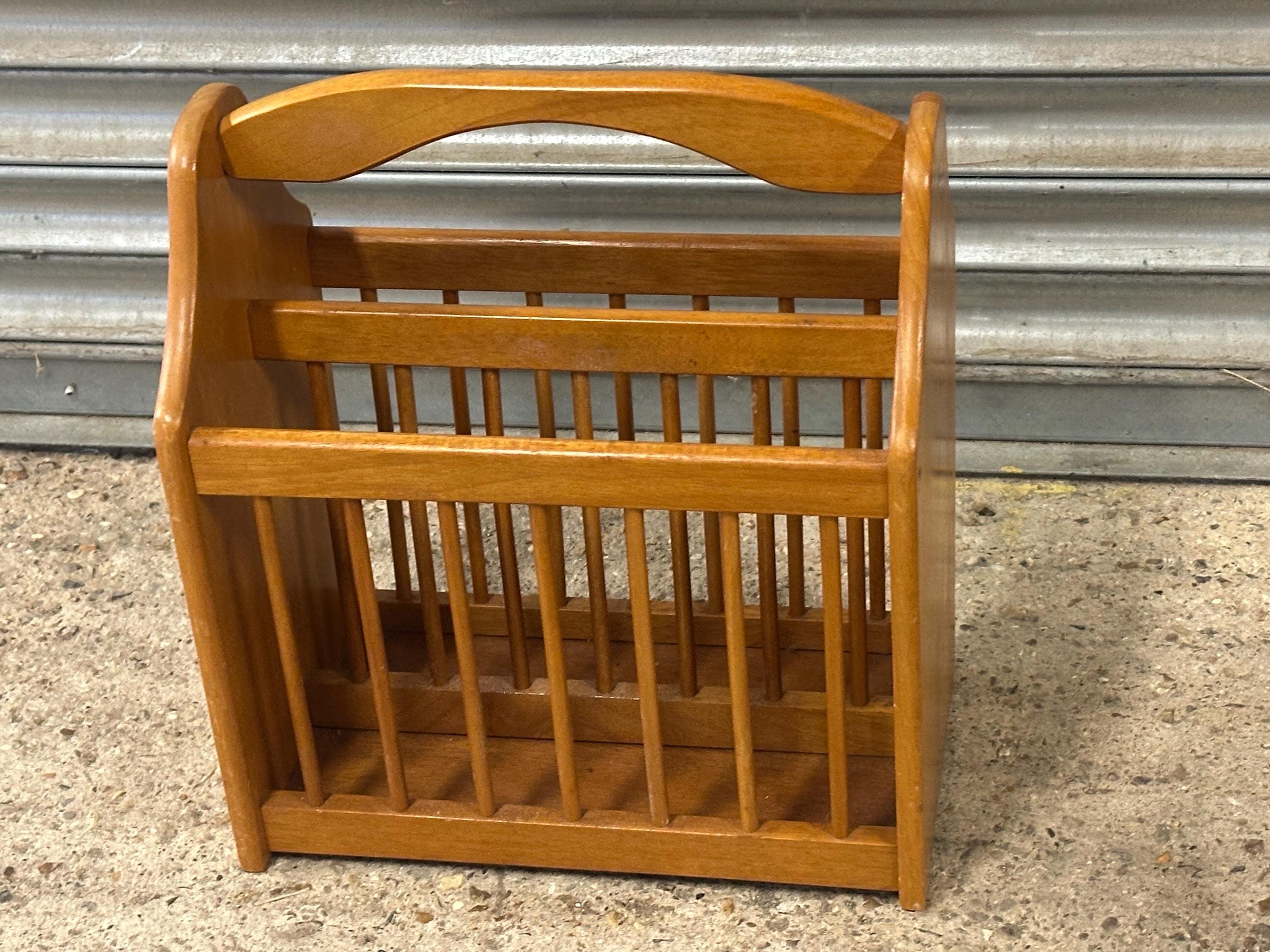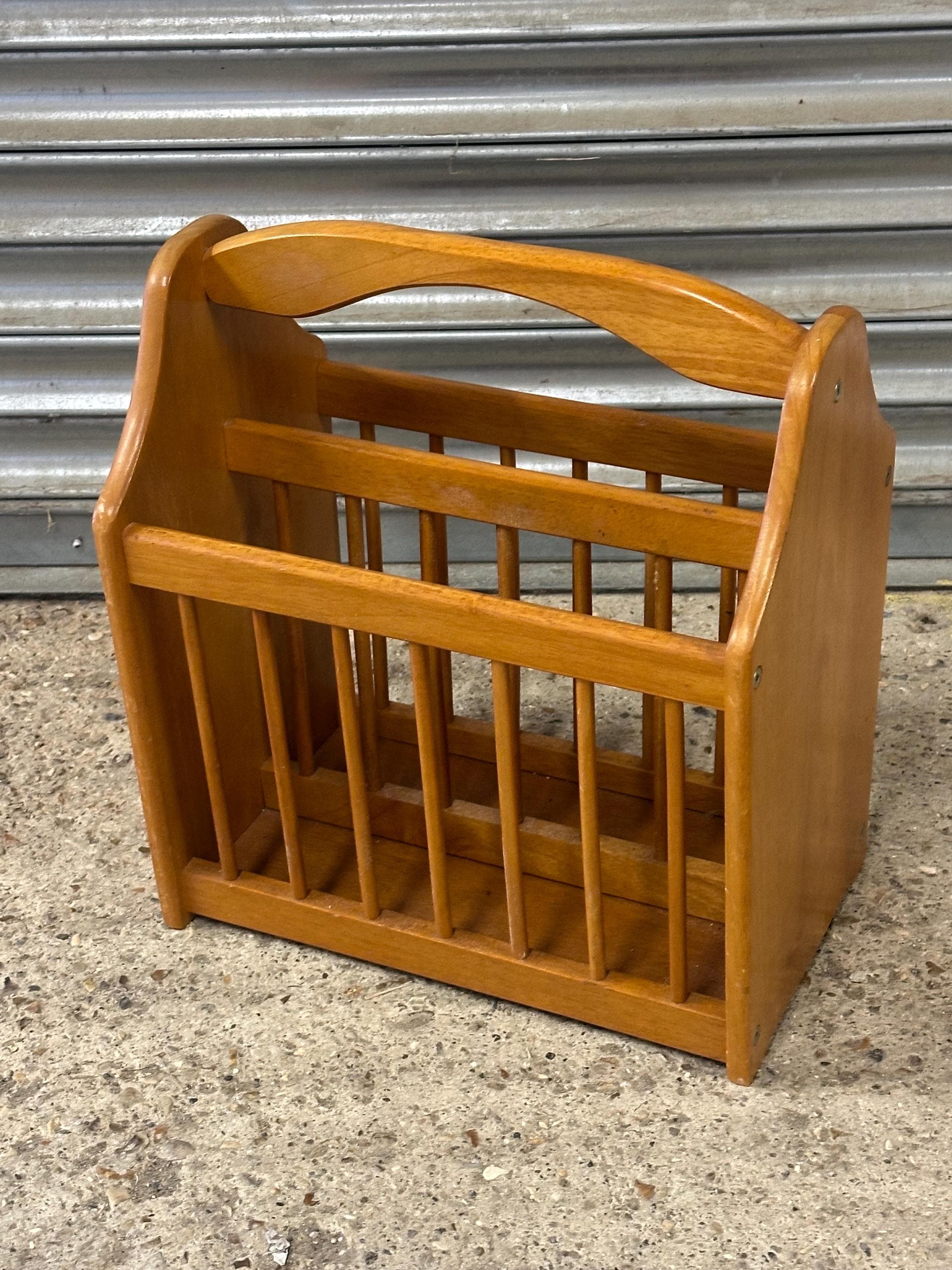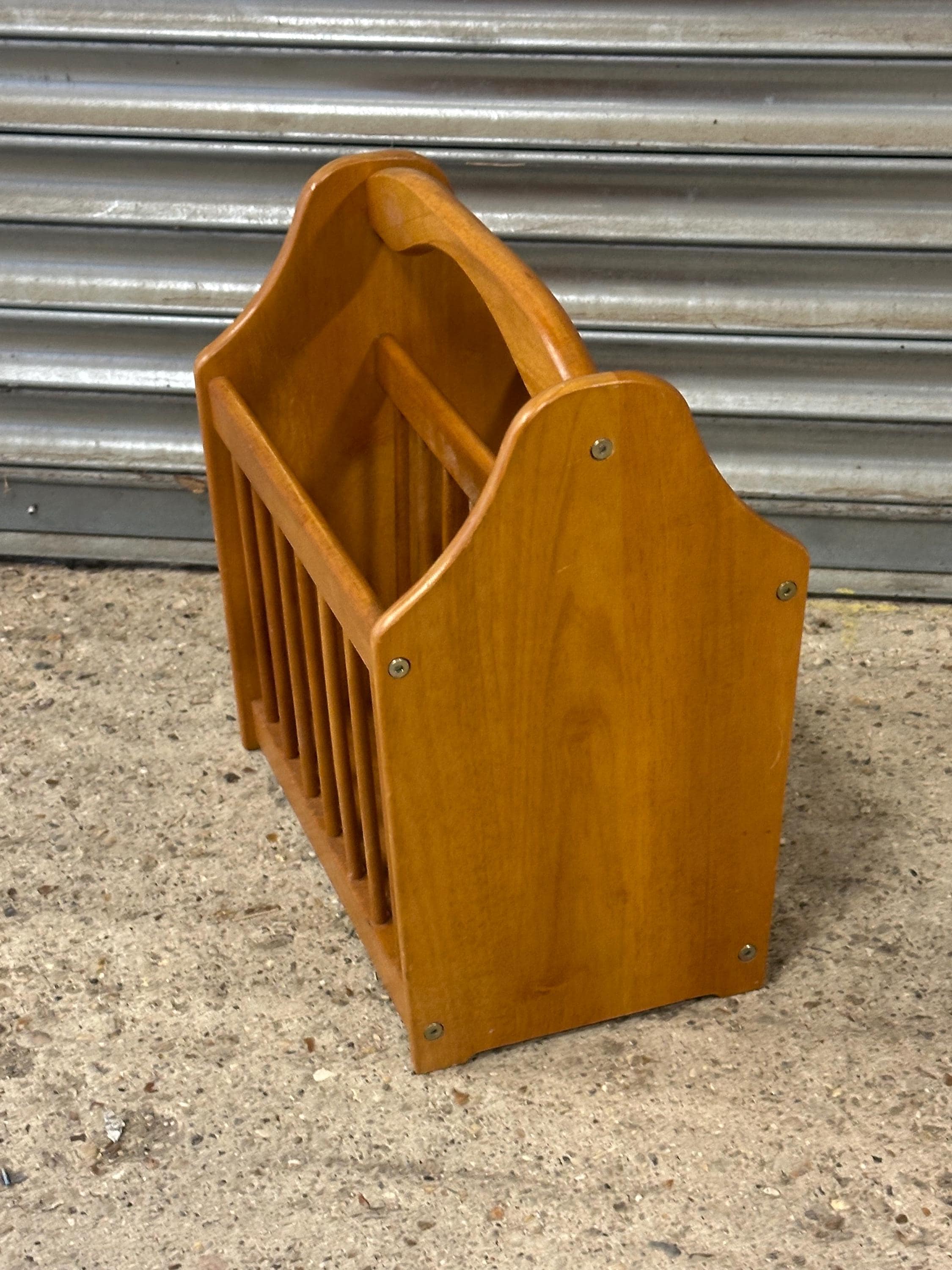 A charming vintage solid-wood magazine rack, perfect for storing newspapers, magazines, books, vinyl records or throws. Beautifully crafted with a warm wood tone finish, turned spindle dividers and a curved carry handle for easy movement. A lovely functional piece that adds character to any home – ideal for a country cottage, mid-century, farmhouse or traditional interior.