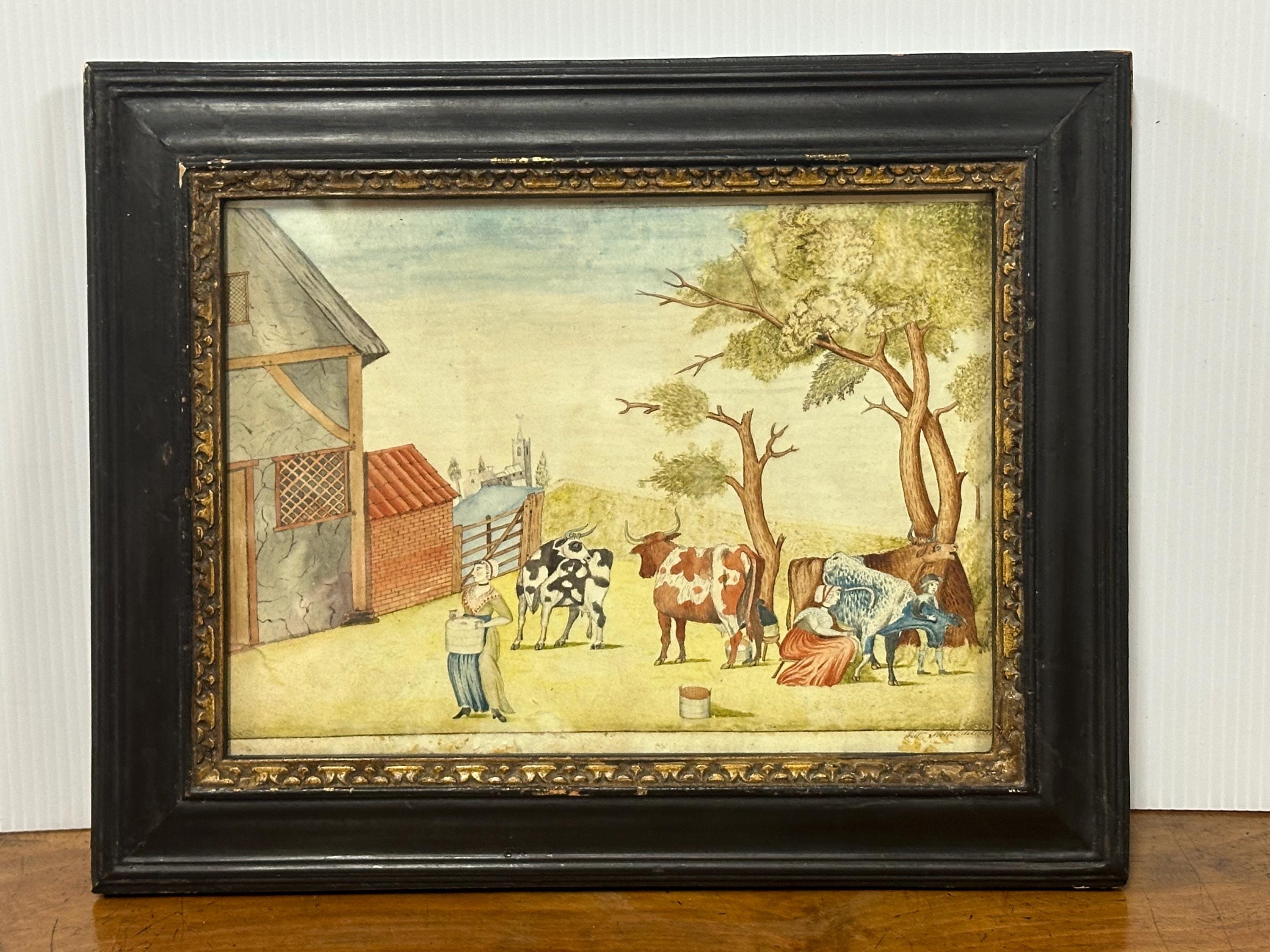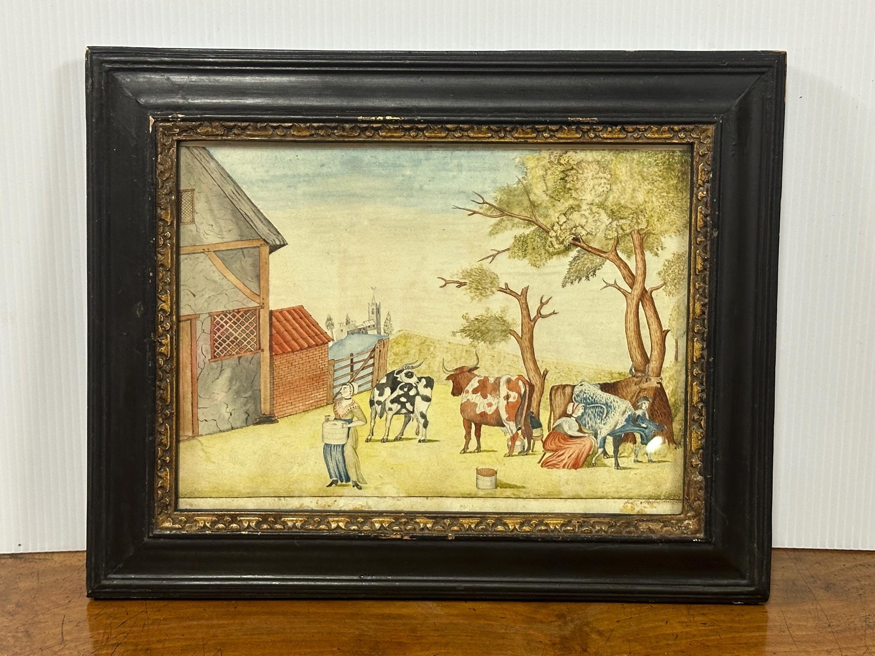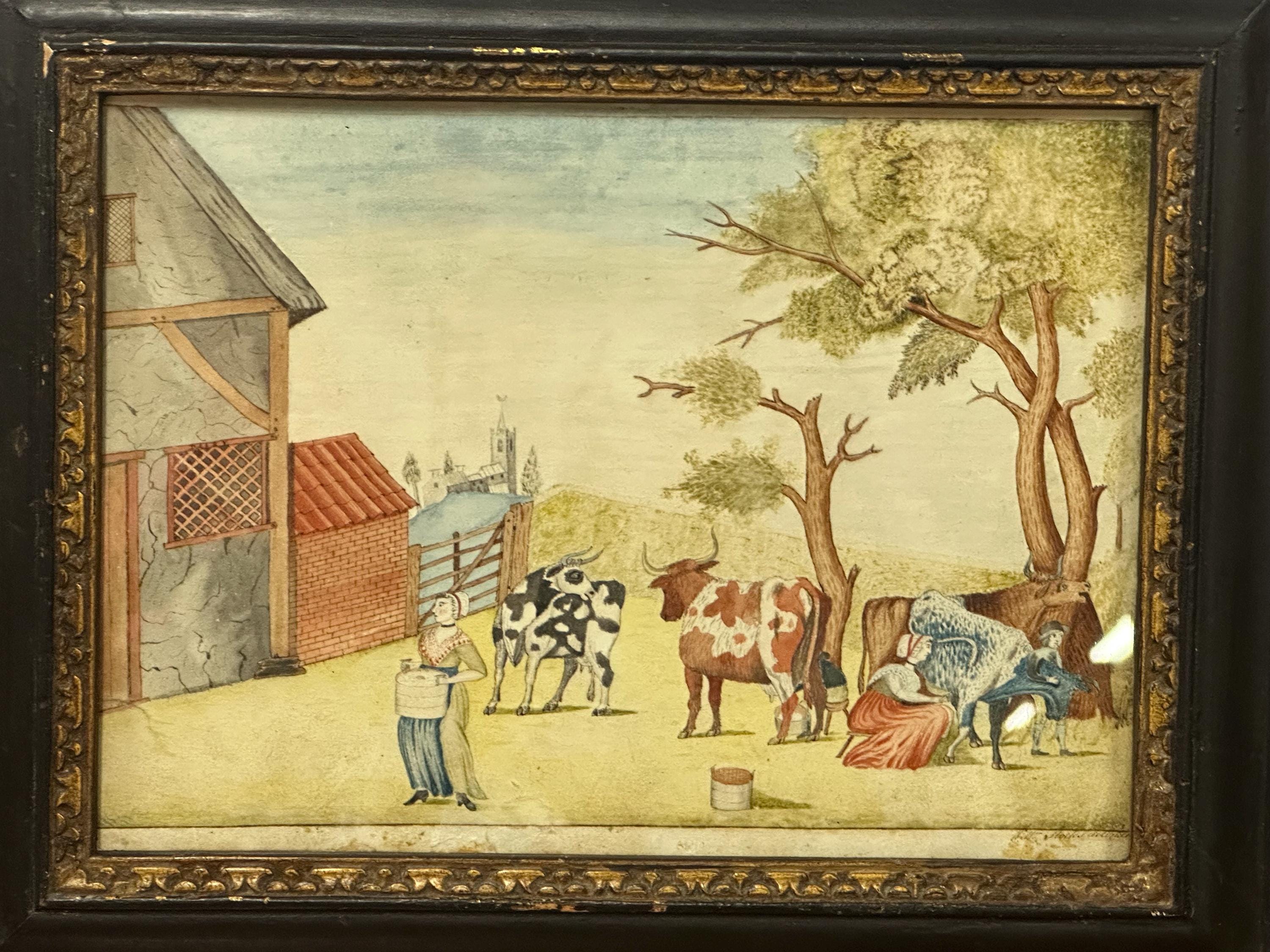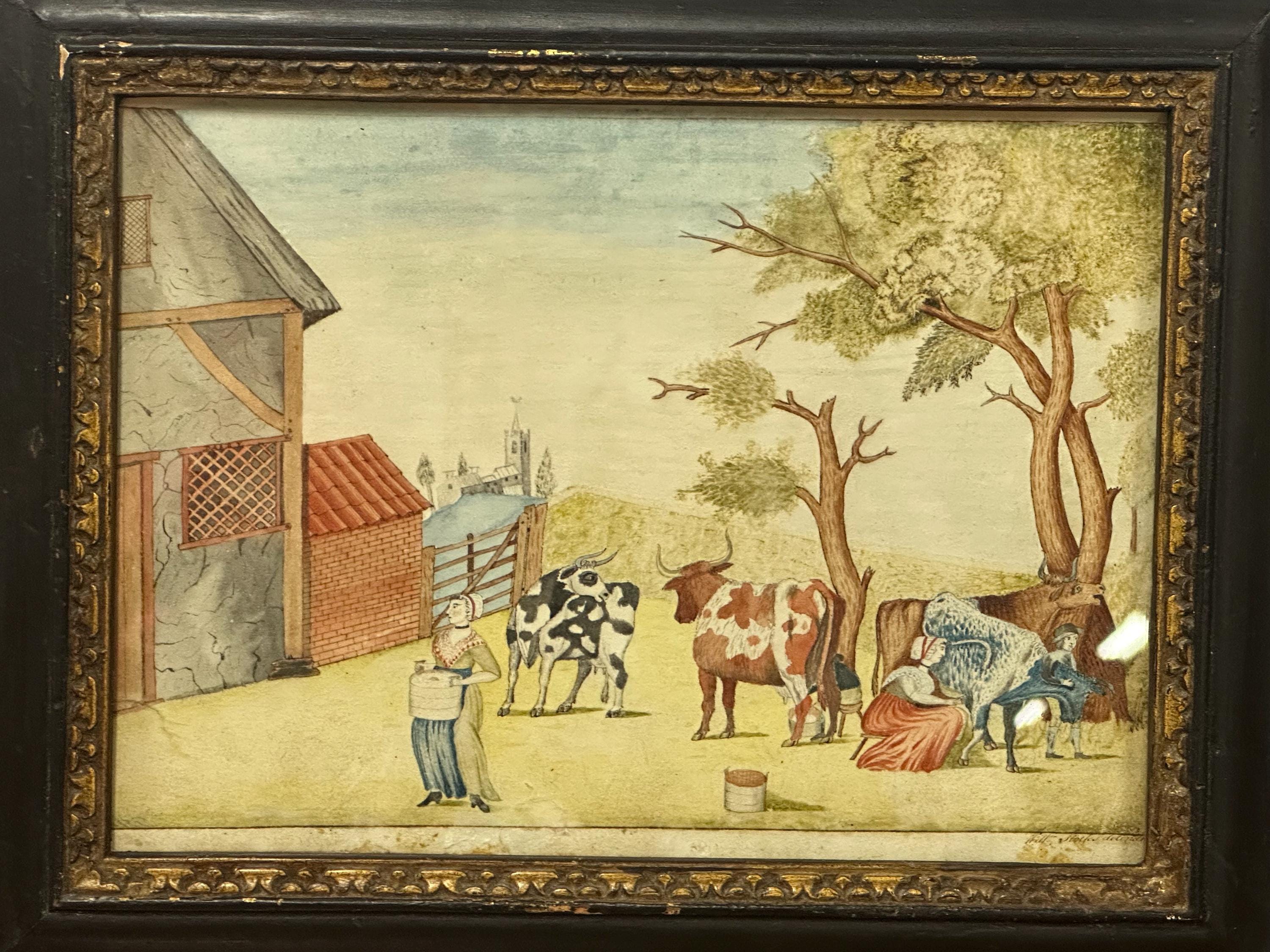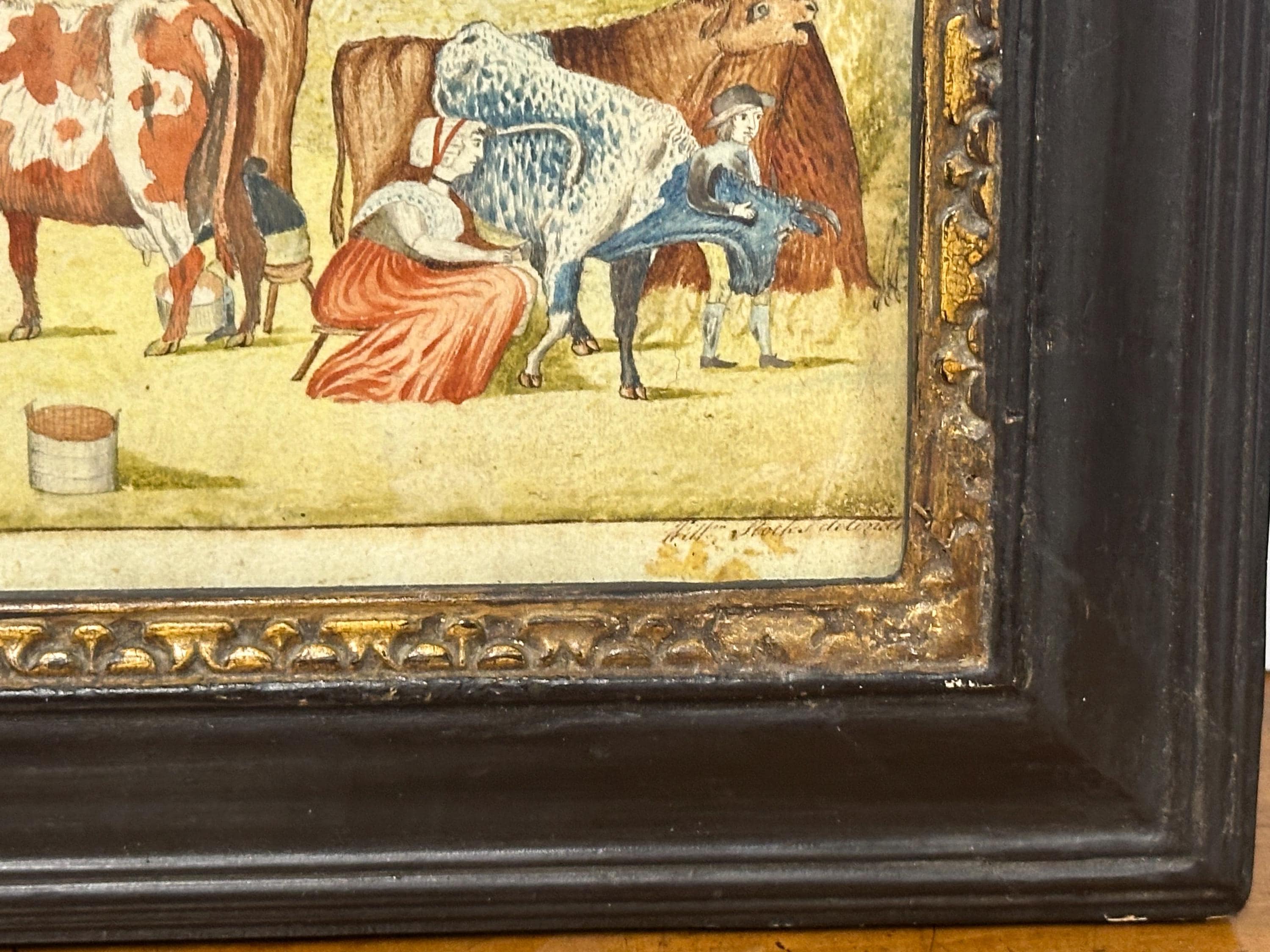 A farmyard scene with cows and milkmaids signed 'William Stocks' in margin Iower right.