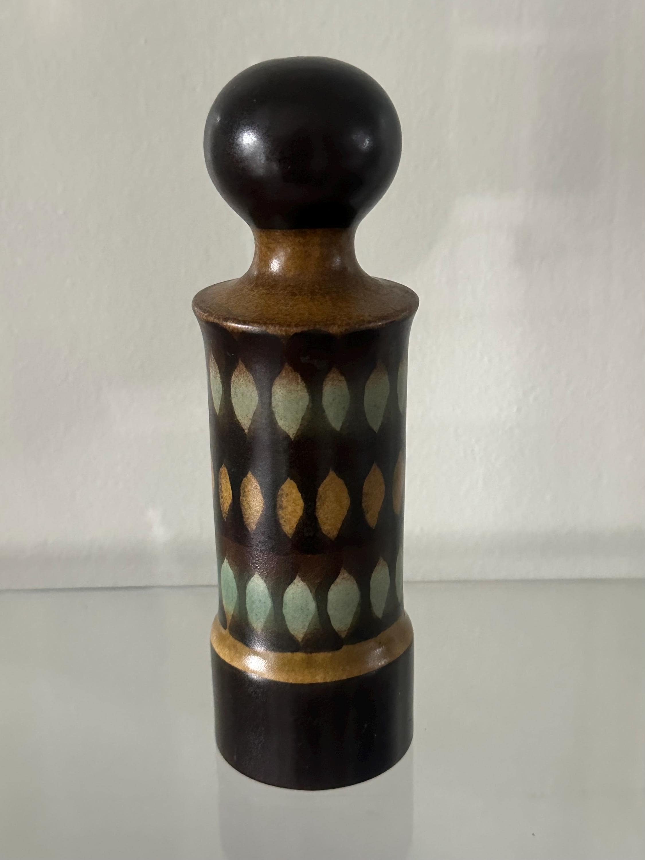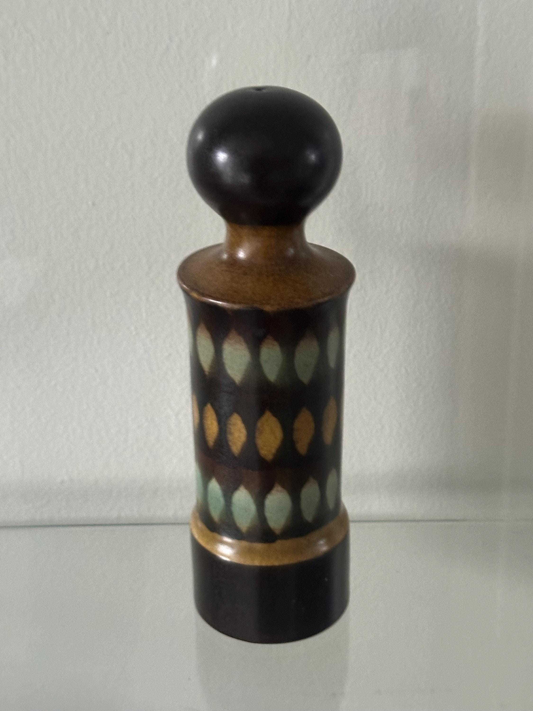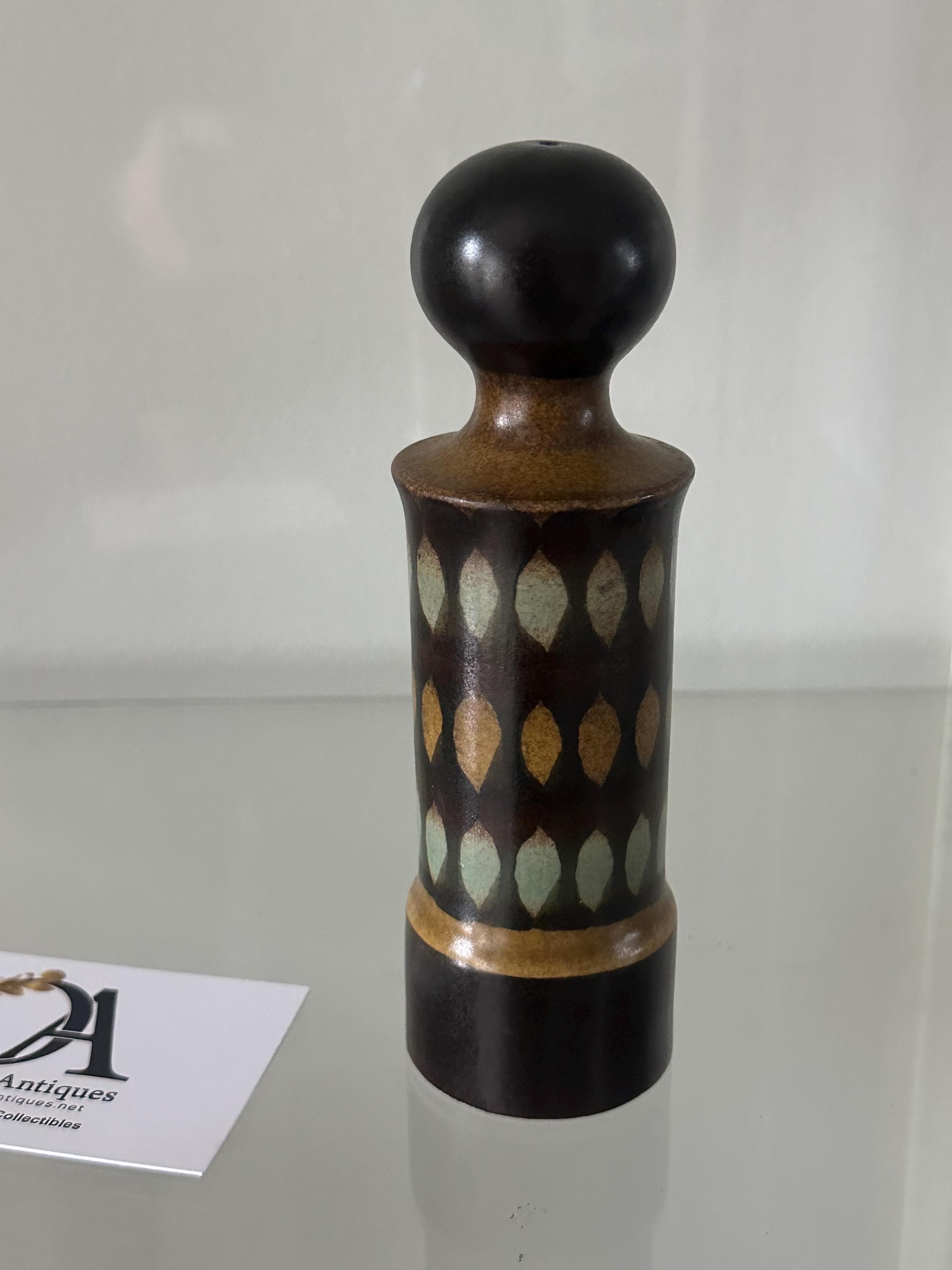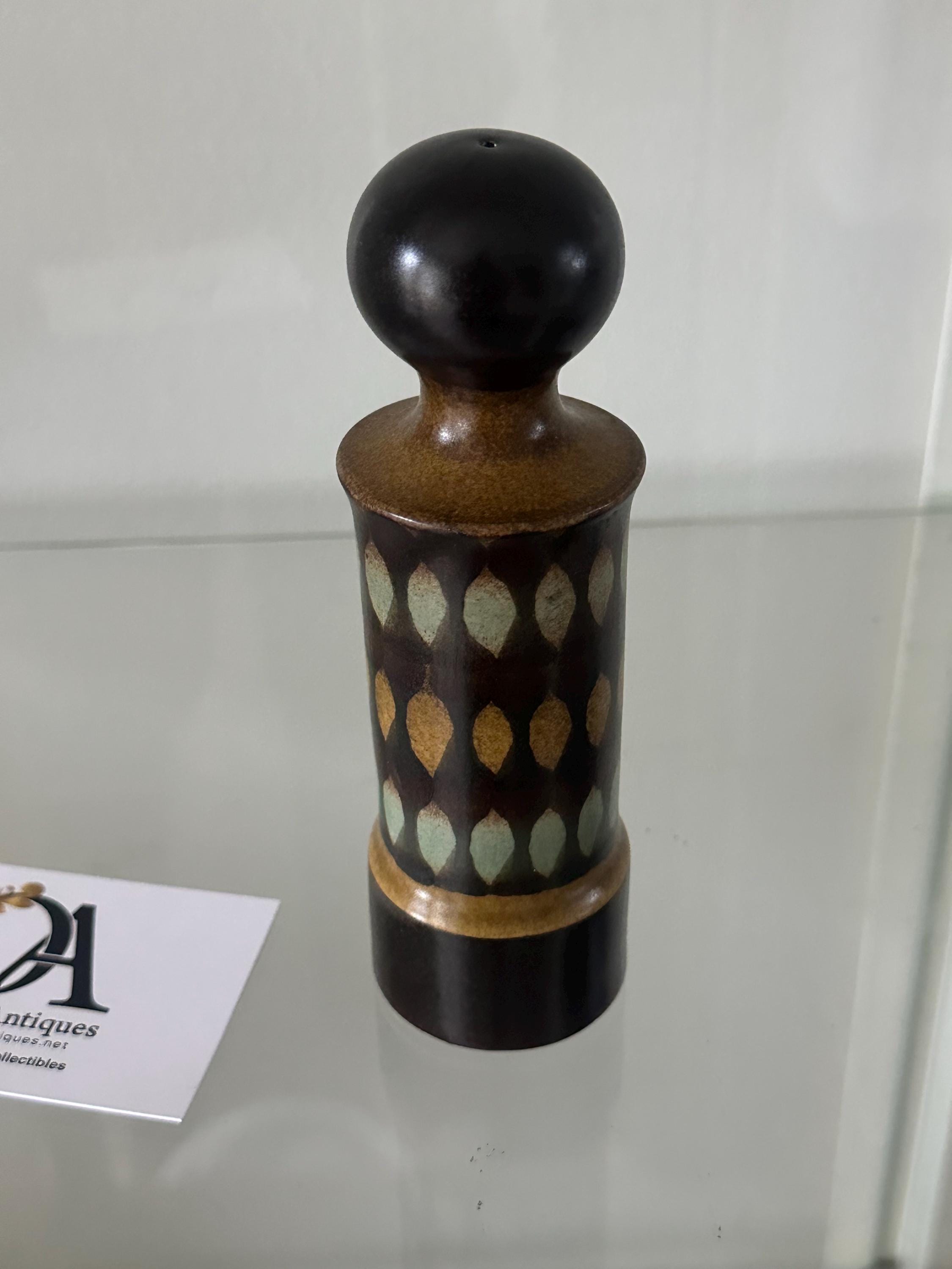 A striking and collectible vintage Goebel Oeslauer “Wallis” salt shaker, made in West Germany during the mid-century modern period. This beautifully shaped ceramic shaker features a tall sculptural form with a rounded knob top and a distinctive geometric leaf-pattern design in shades of mustard, olive green, and dark brown glaze.