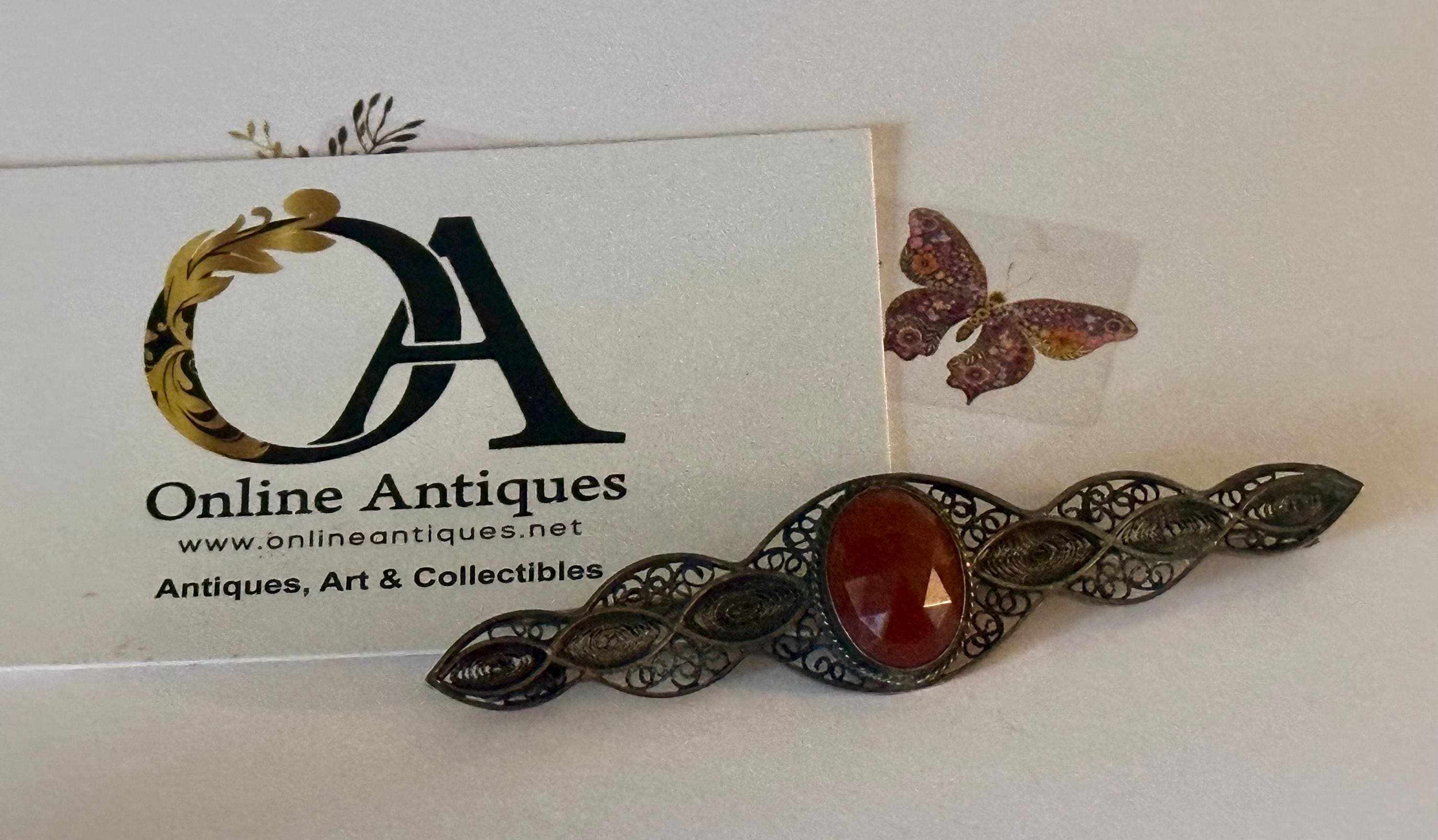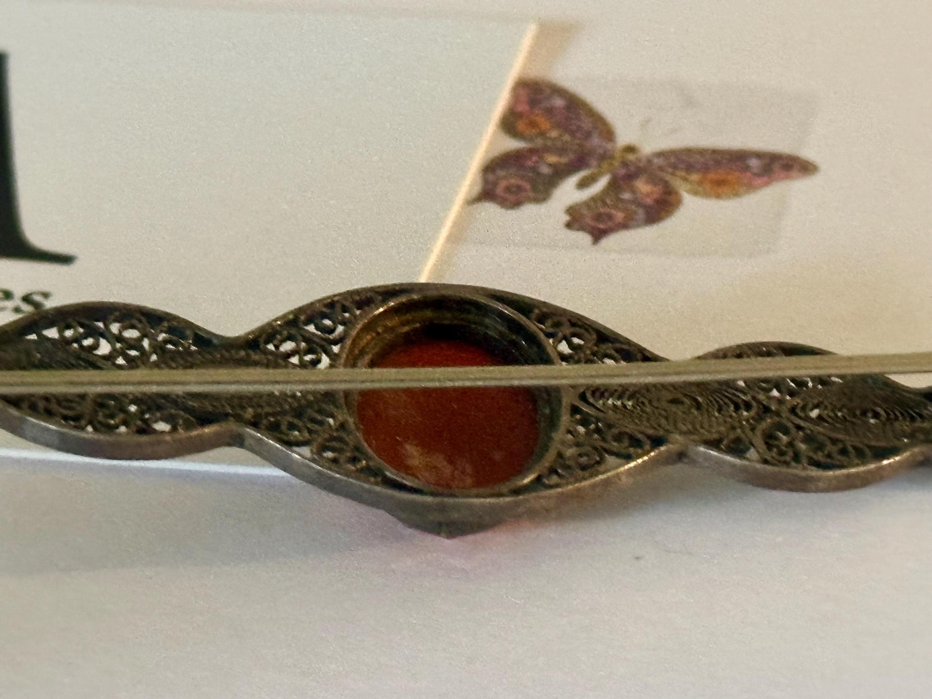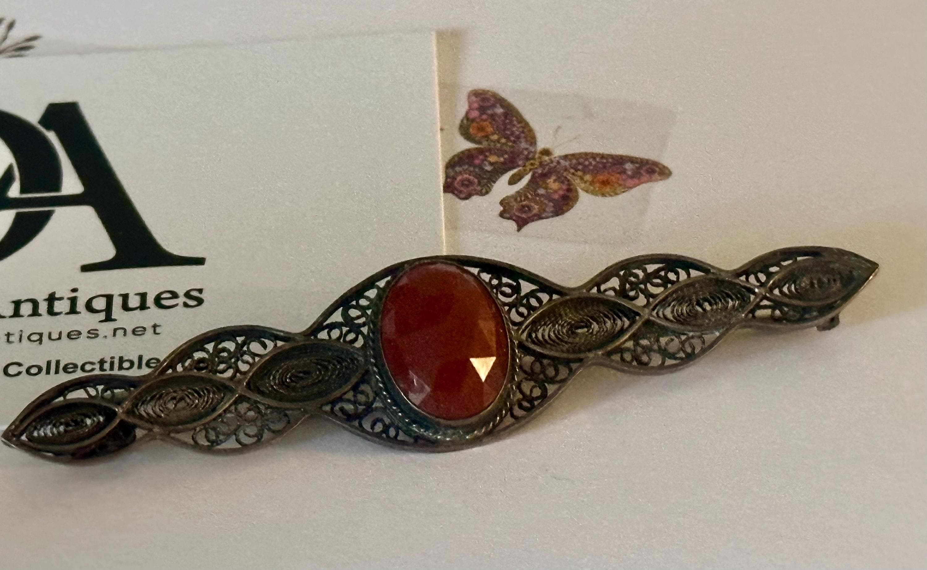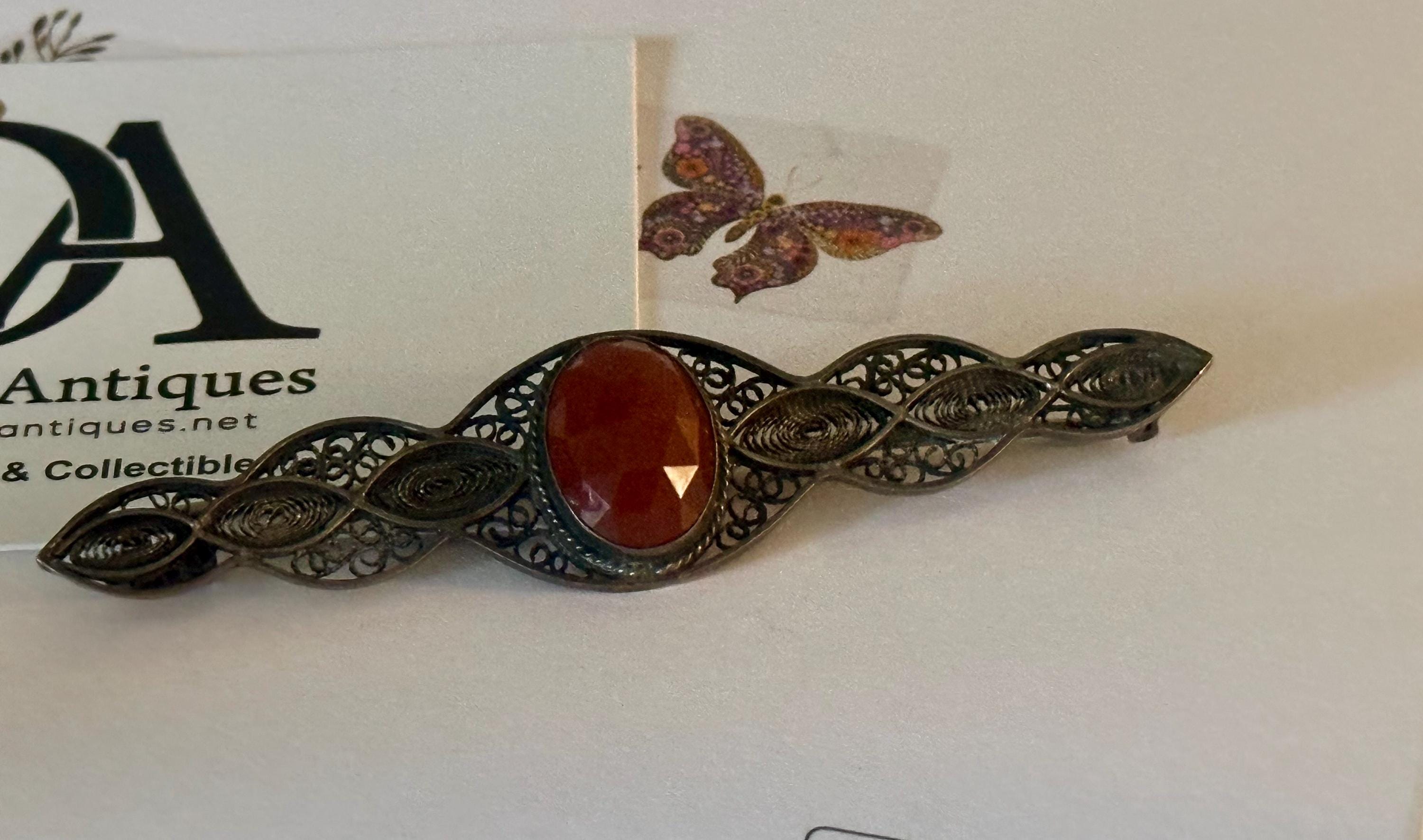 Antique White Metal Filigree Bar Booch With An Oval Carnelian Coloured Stone