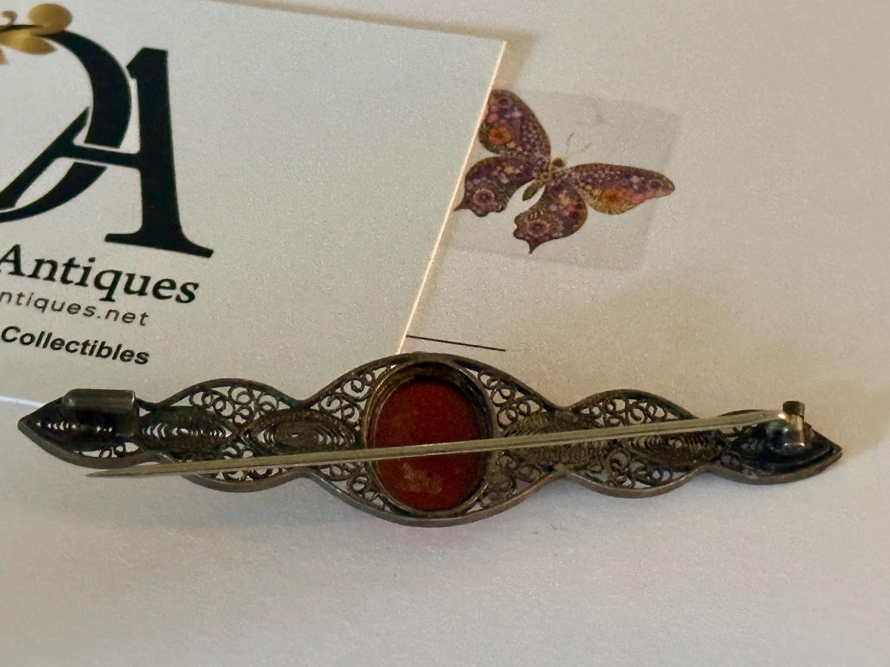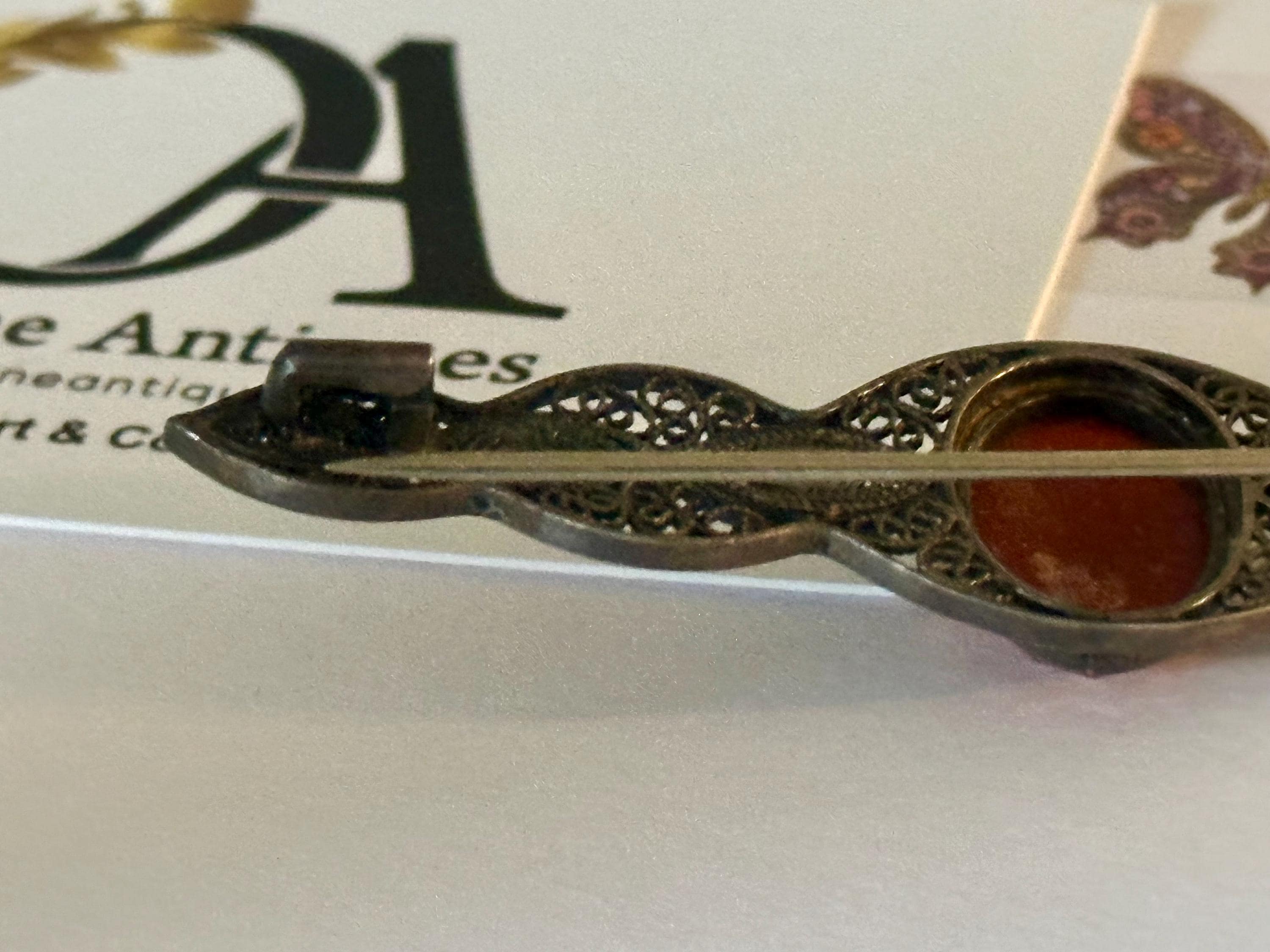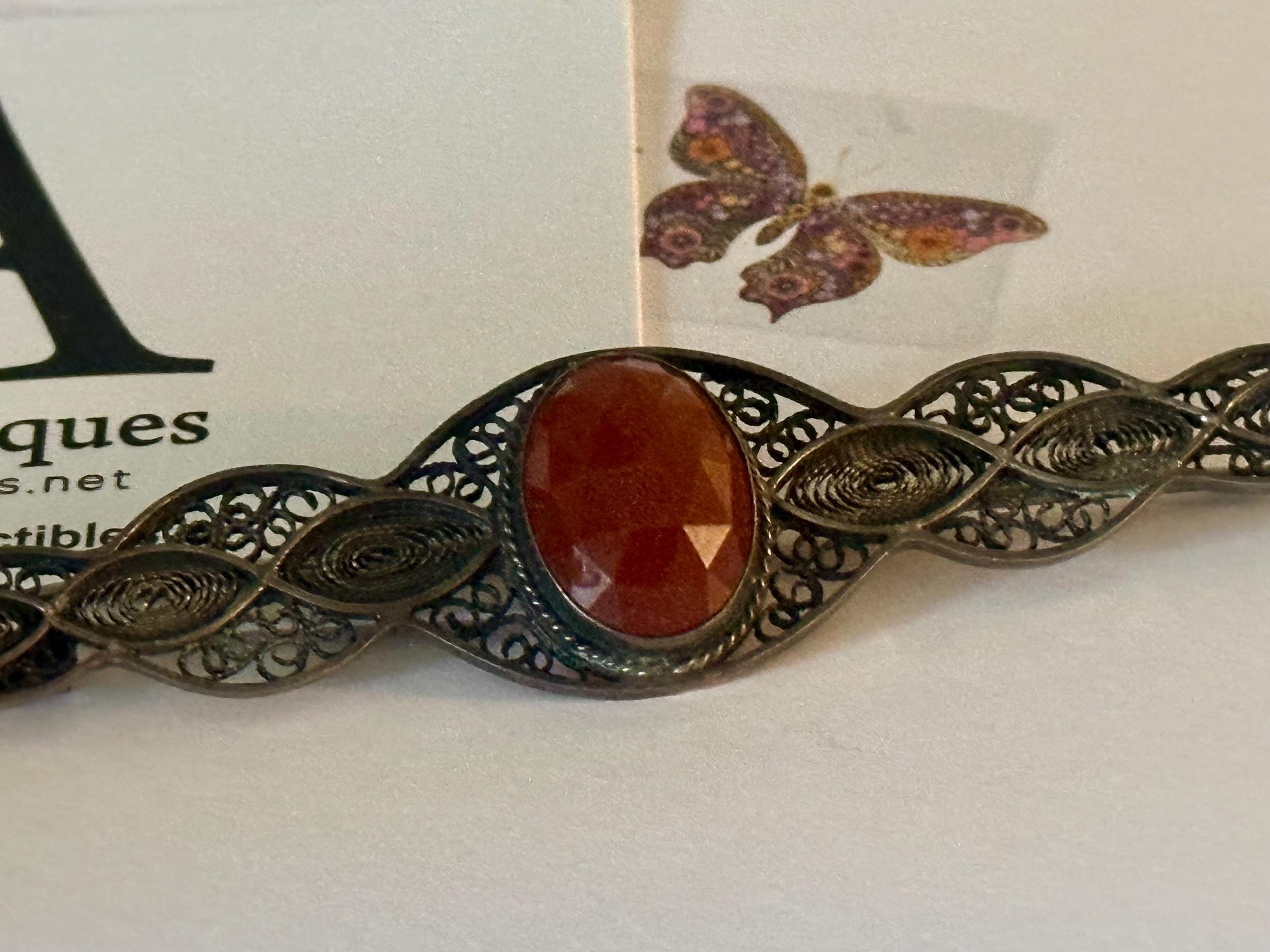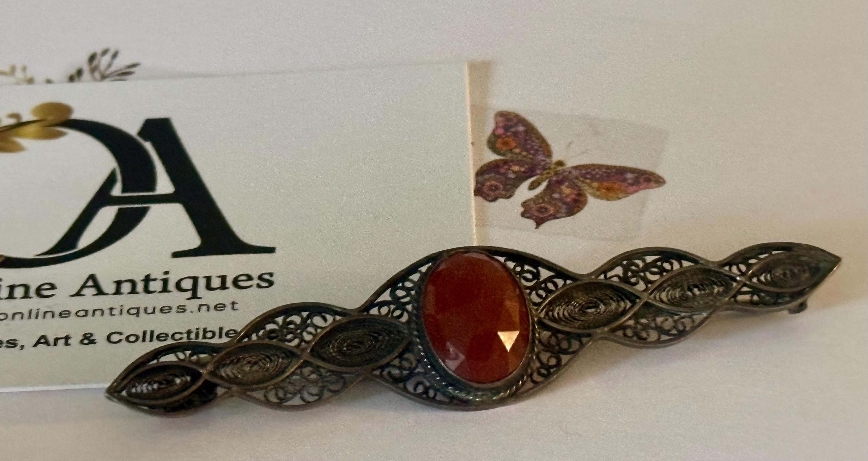 Antique White Metal Filigree Bar Booch With An Oval Carnelian Coloured Stone