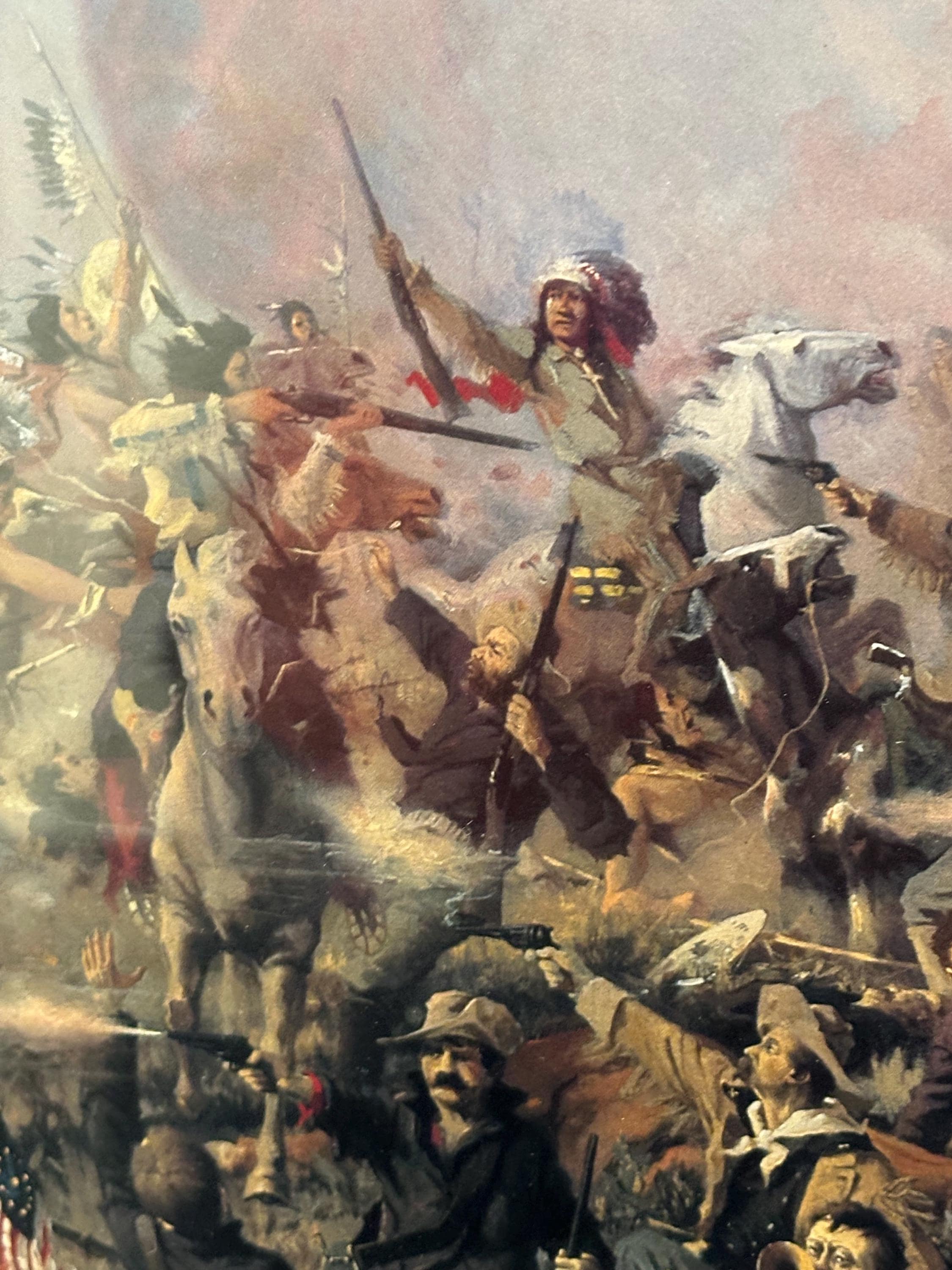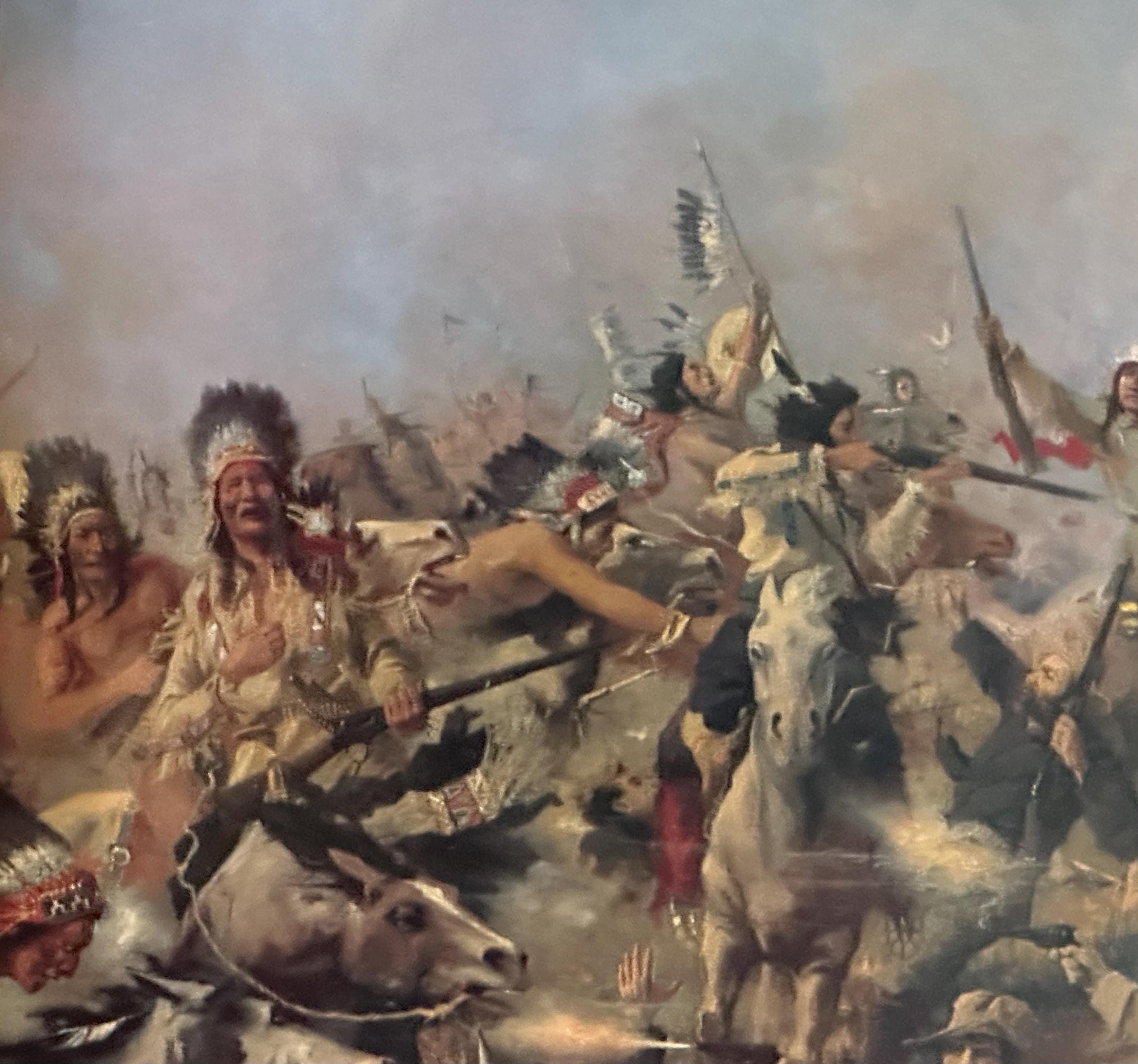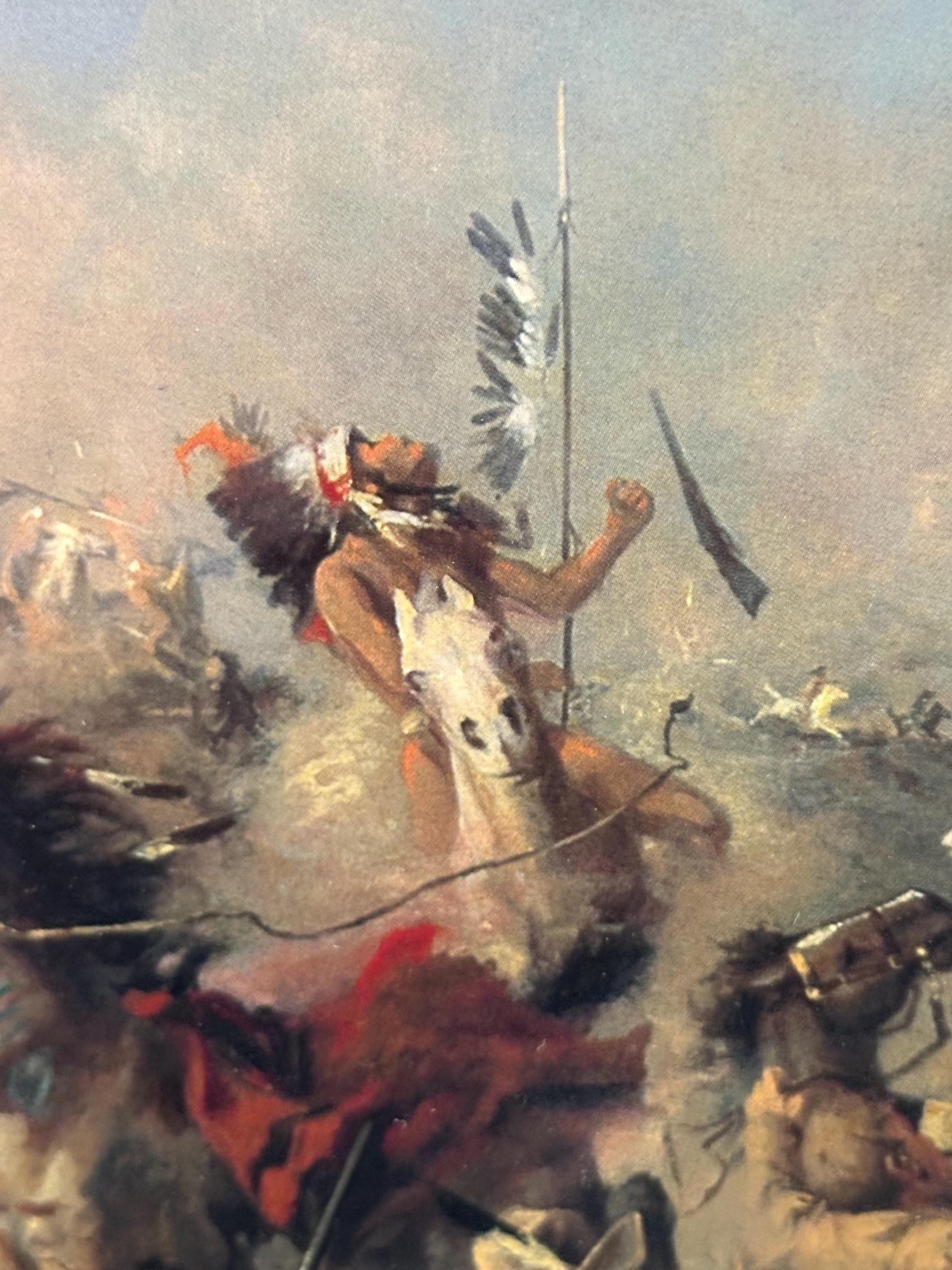 The scene is packed with action—cavalry soldiers, Native American warriors, raised flags, smoke, horses, and the chaos of battle—making it a captivating and powerful display piece.
