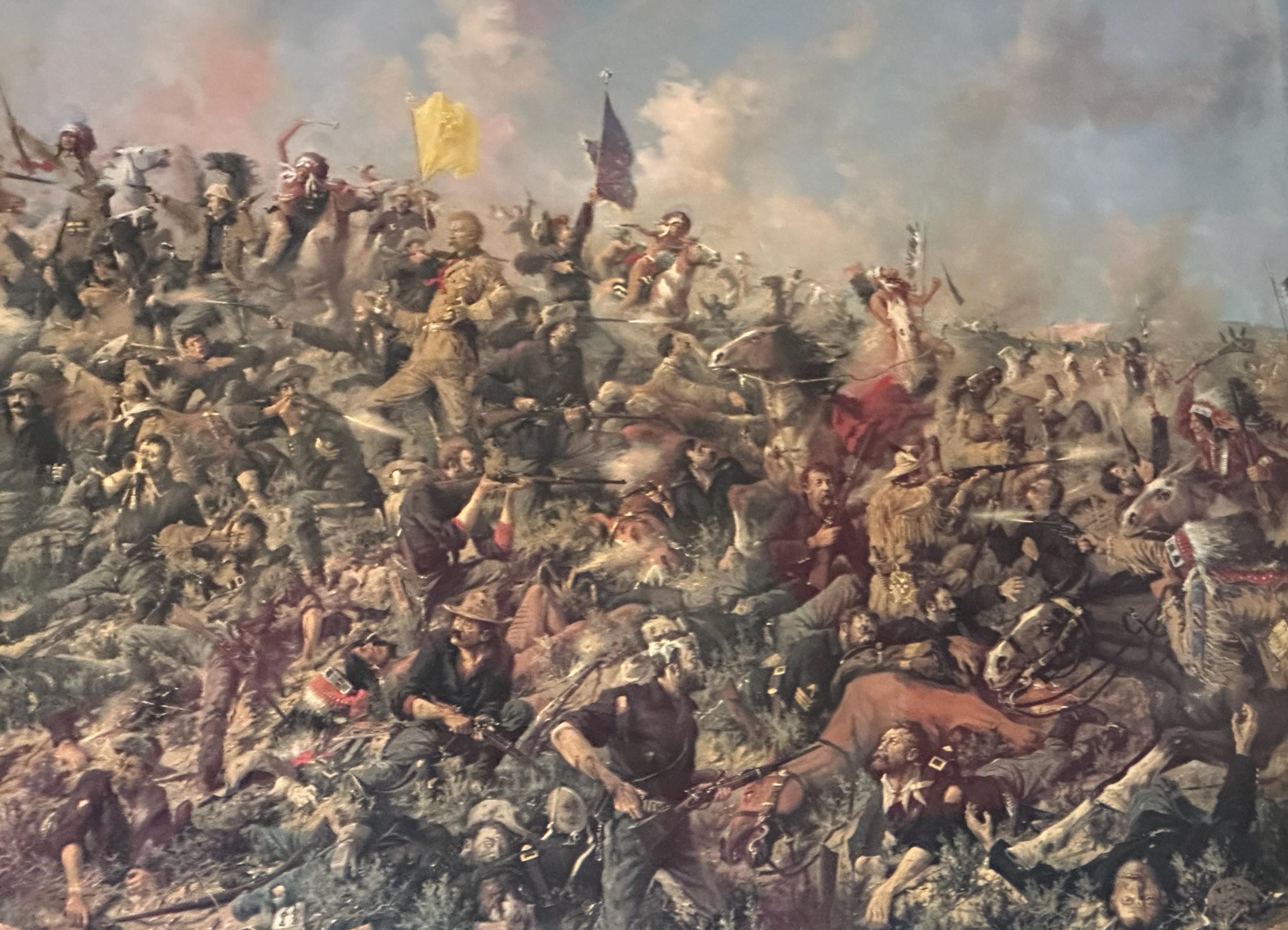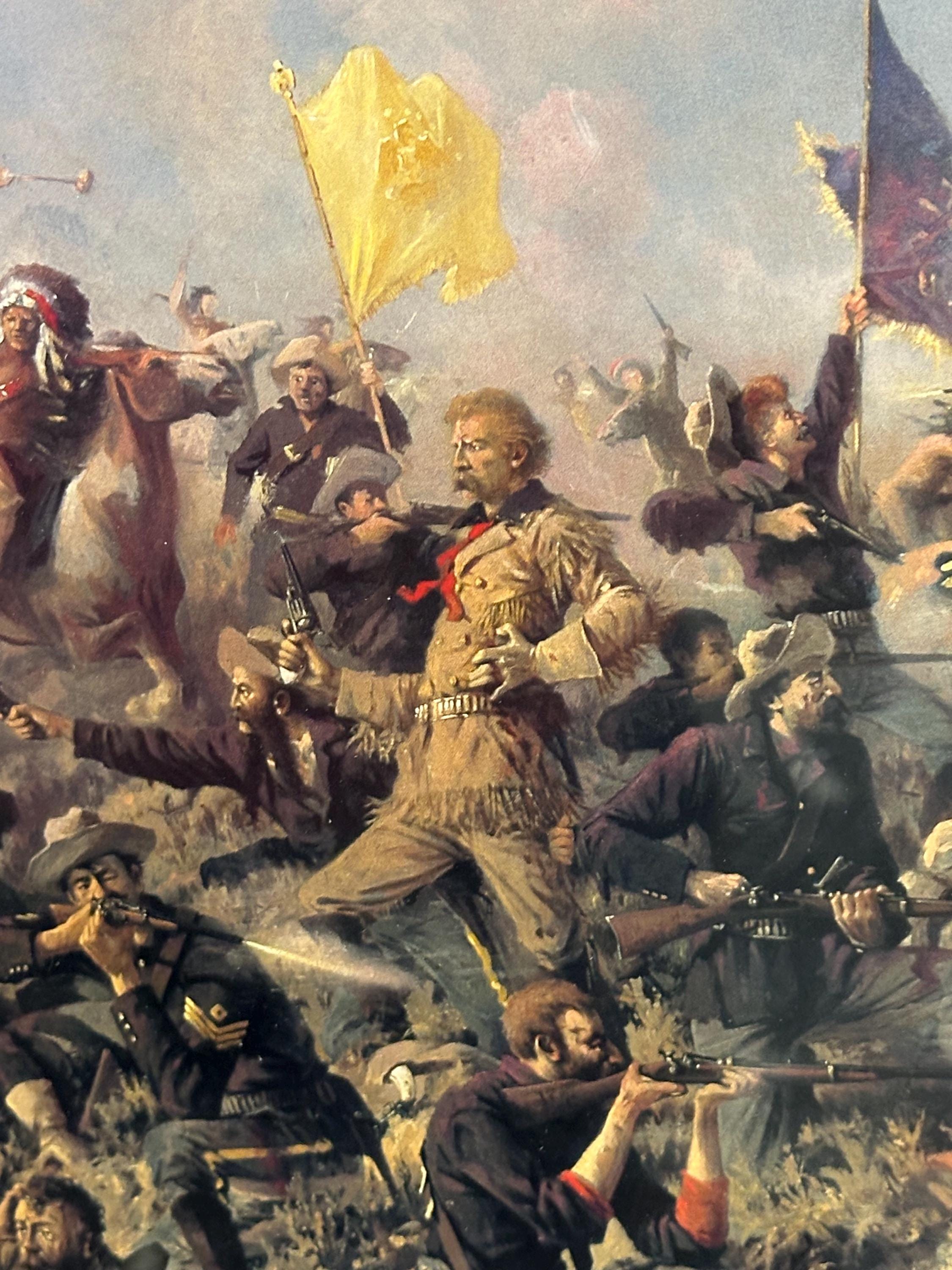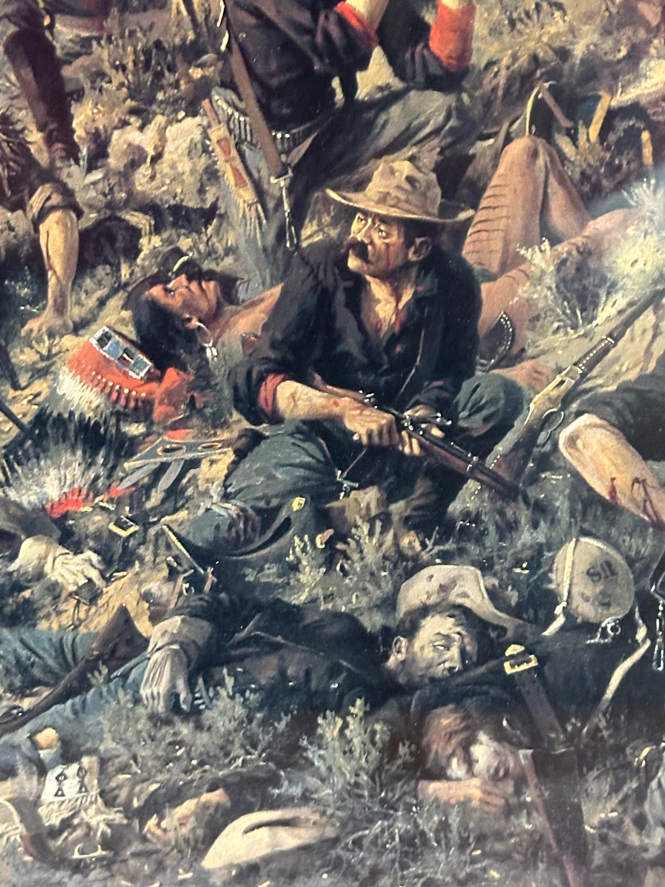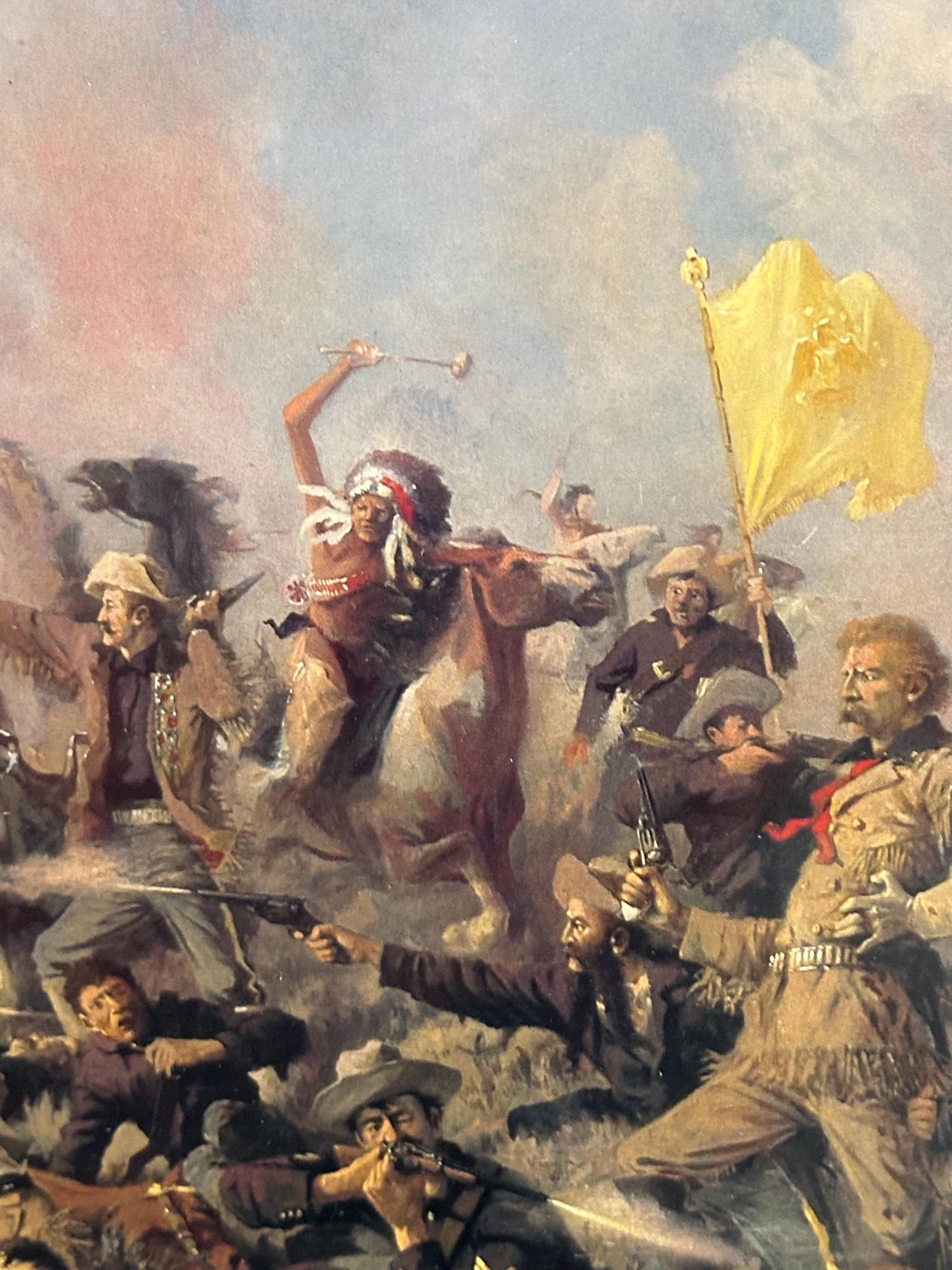The scene is packed with action—cavalry soldiers, Native American warriors, raised flags, smoke, horses, and the chaos of battle—making it a captivating and powerful display piece.